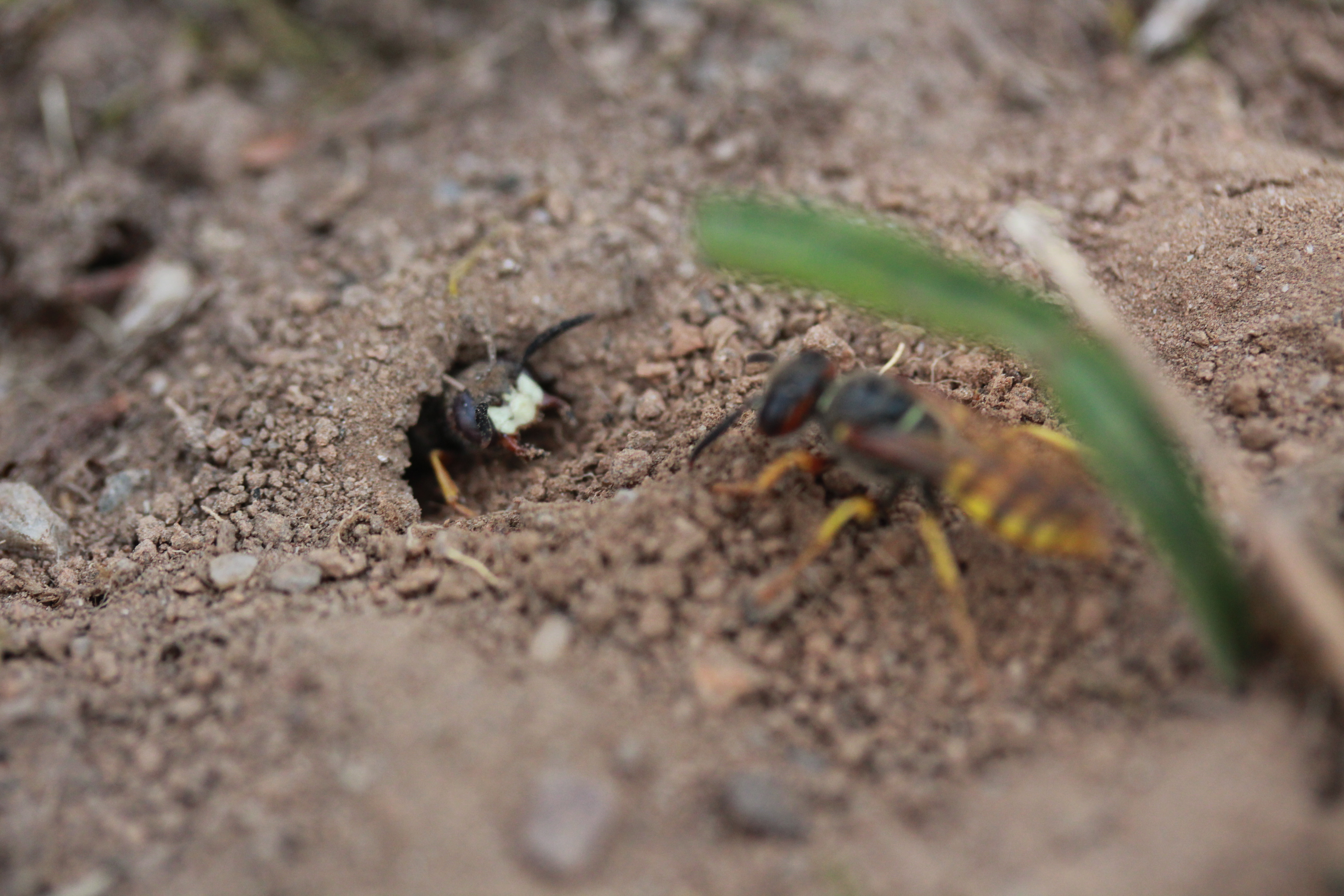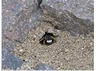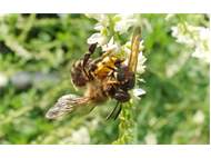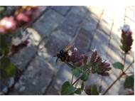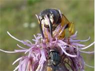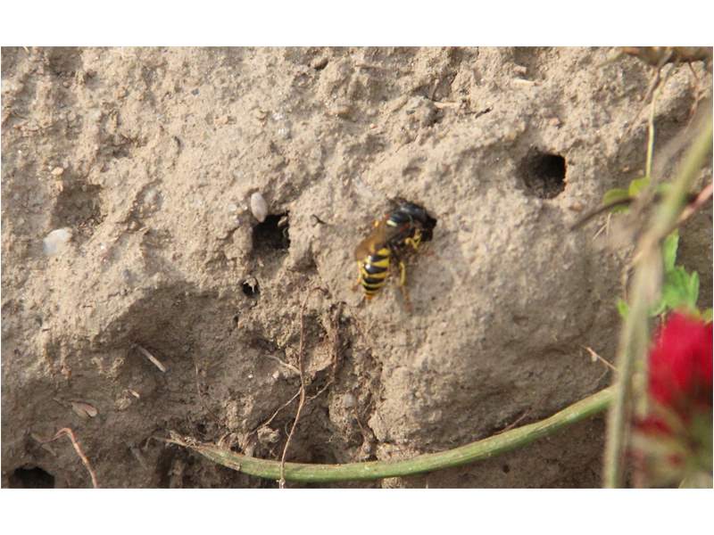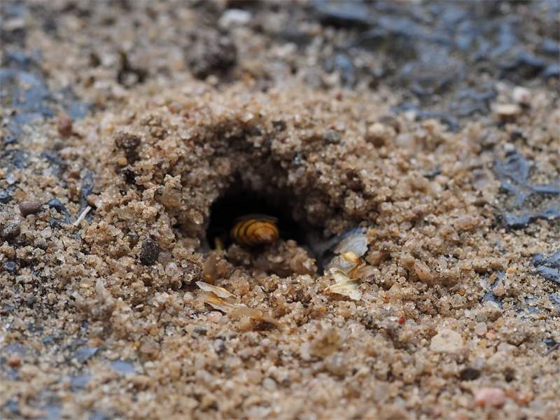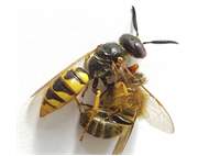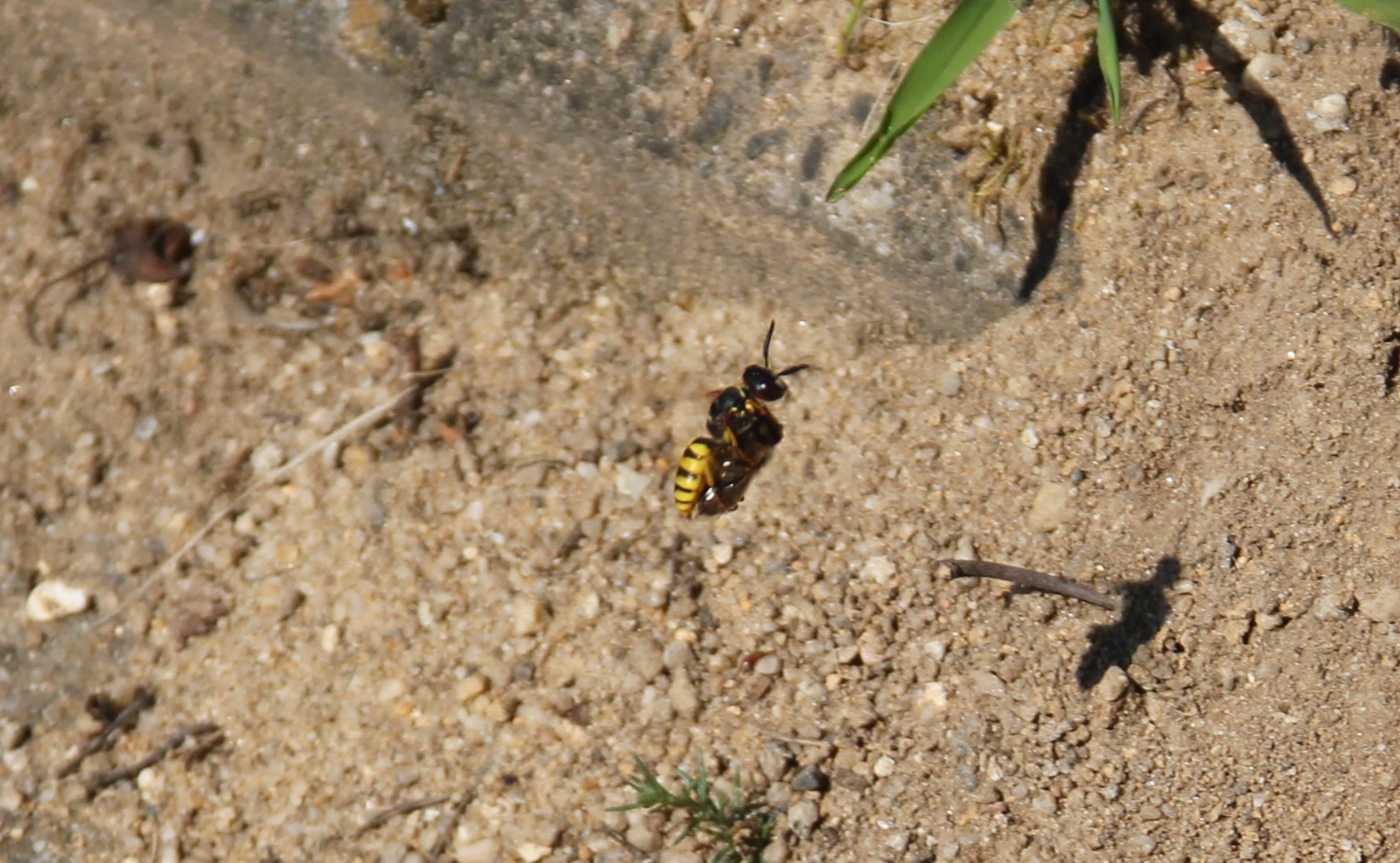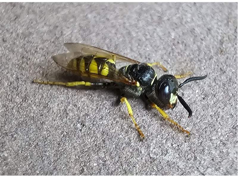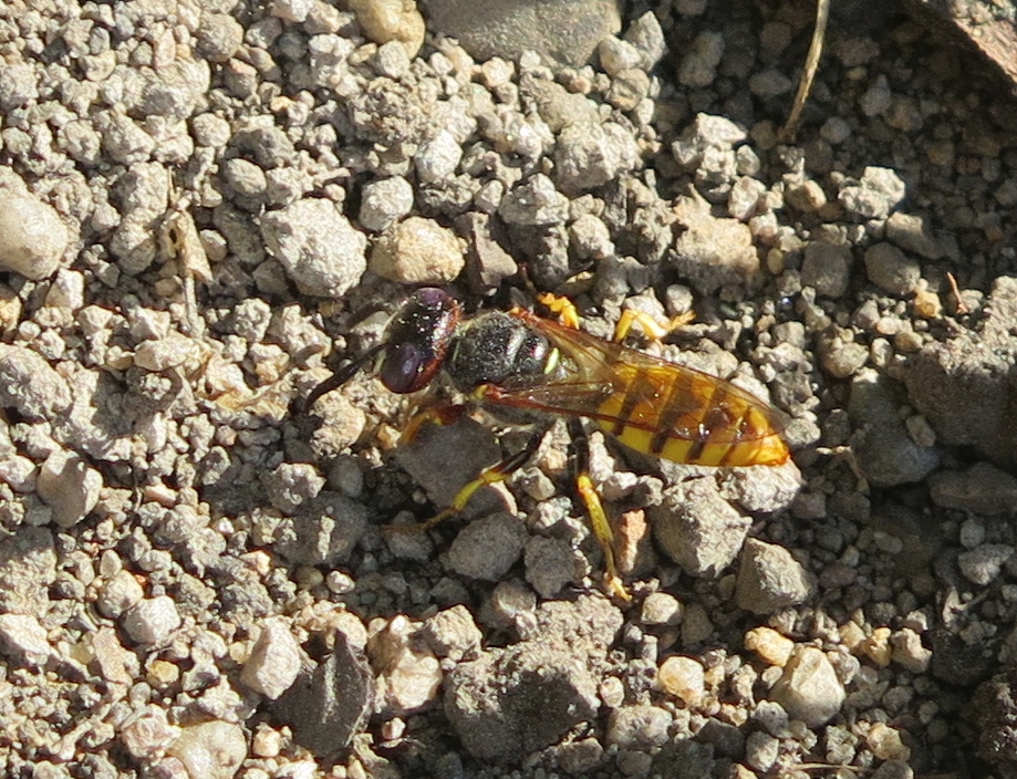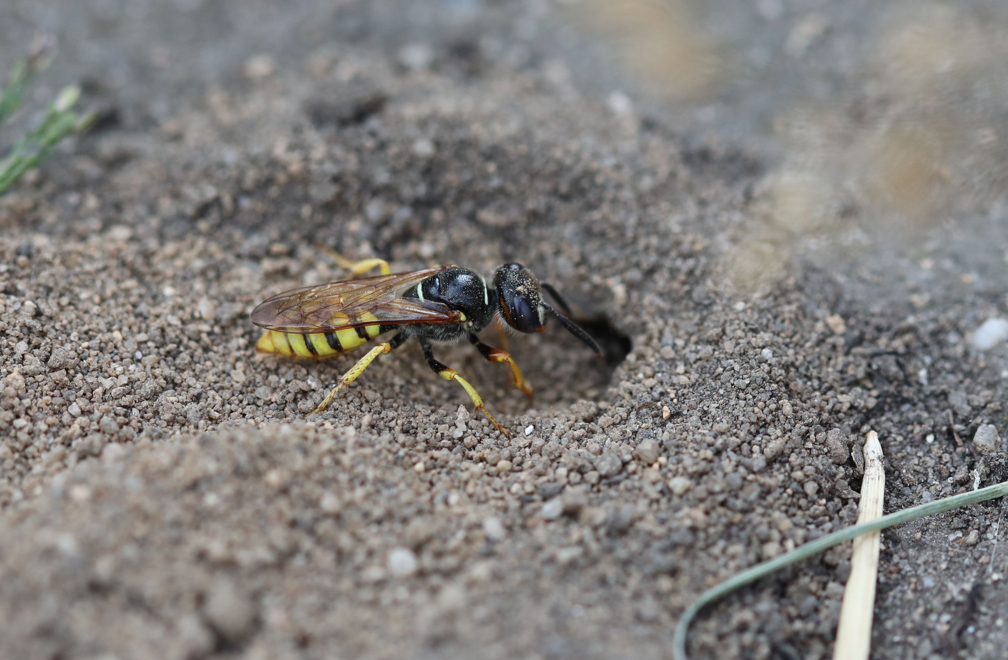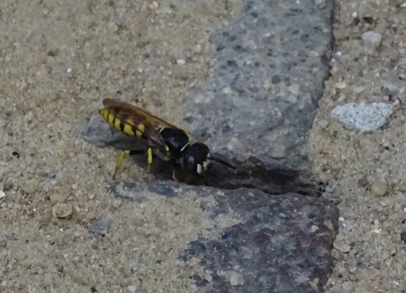 Bienenwolf, Weibchen beim Nestbau auf einem Gehweg, daneben liegt eine tote Honigbiene, Leipzig, Ortsteil Reudnitz-Thonberg, Juli 2009 (© Victor Weiler)( Bild vergrößern)