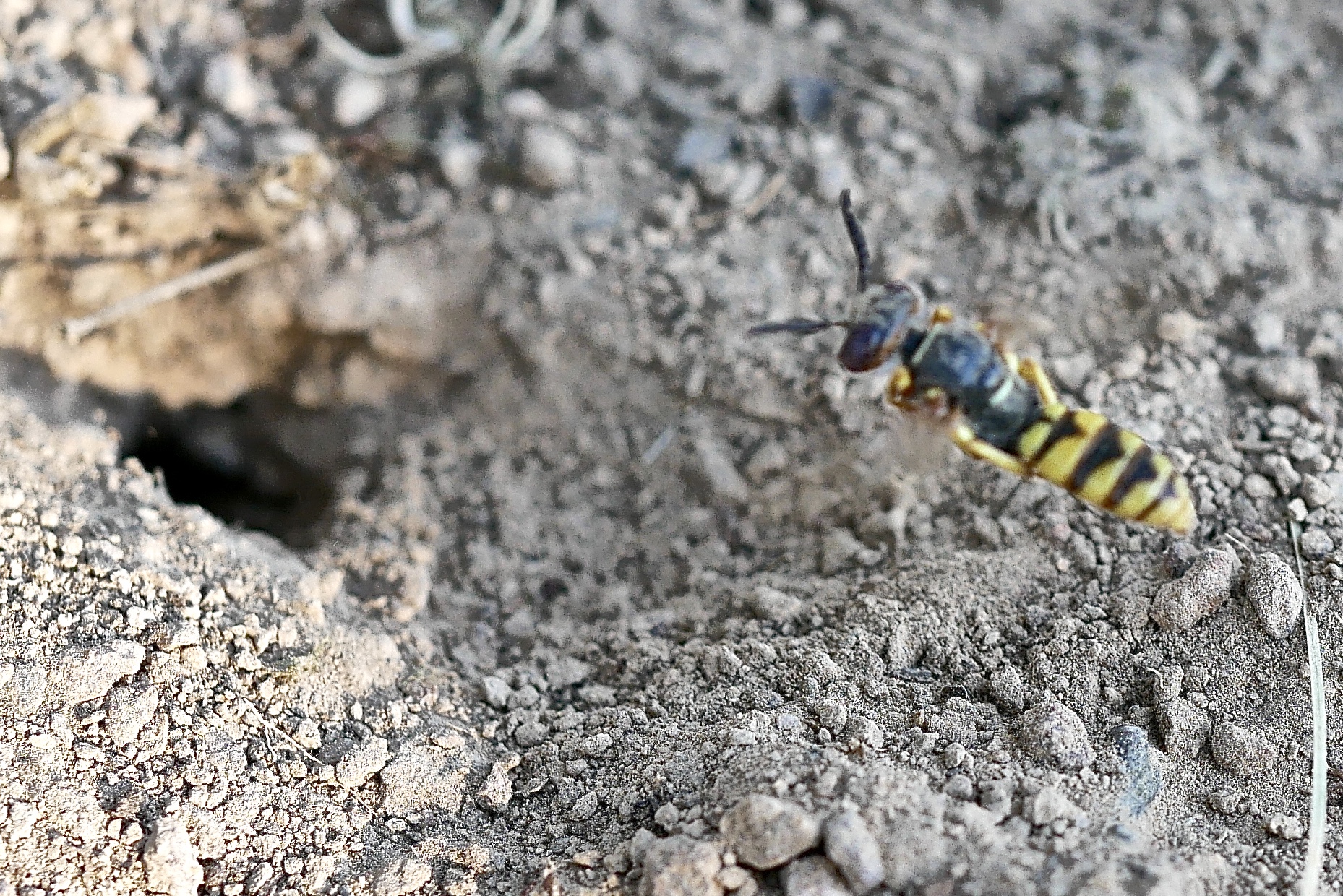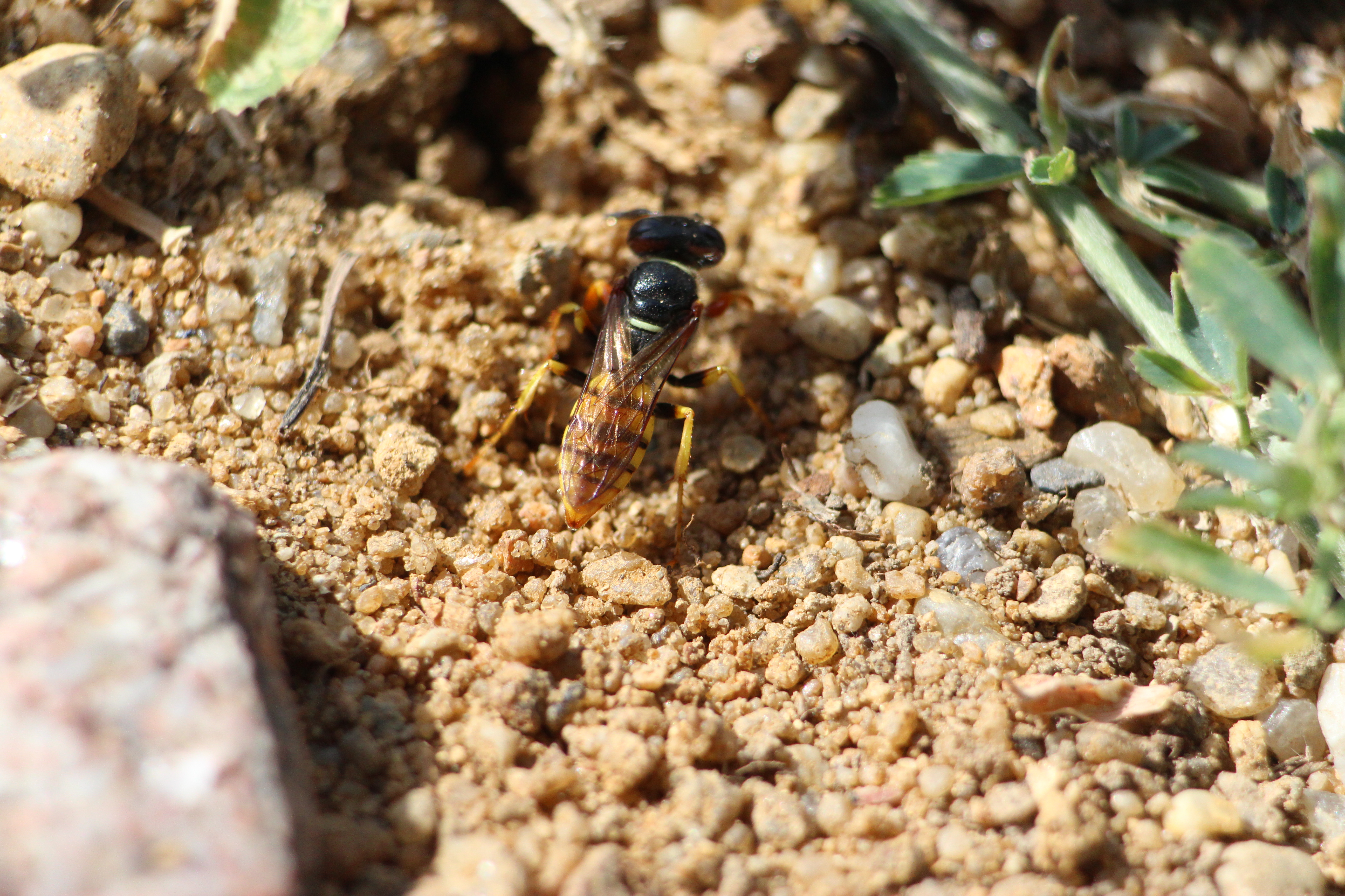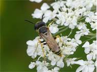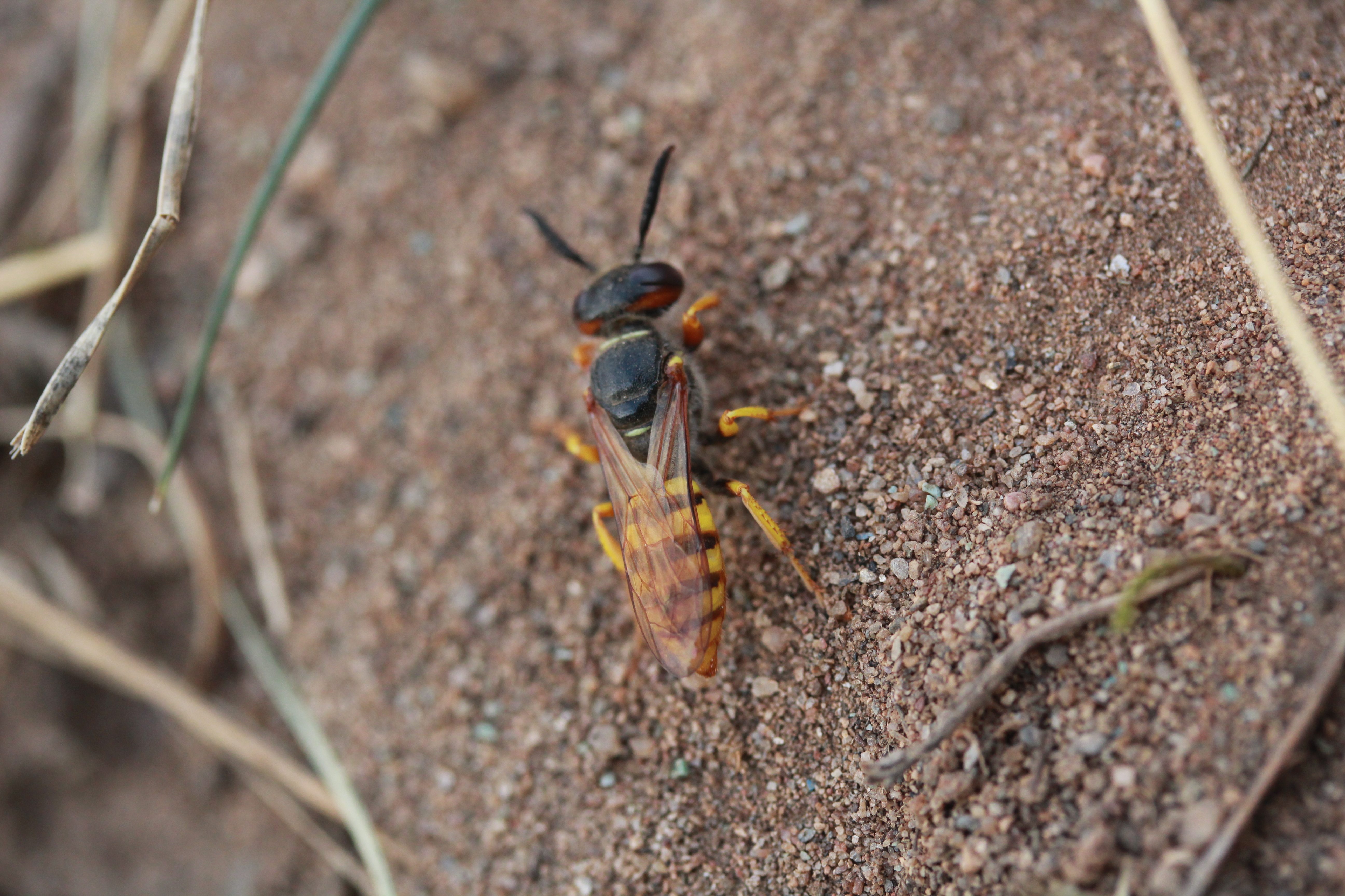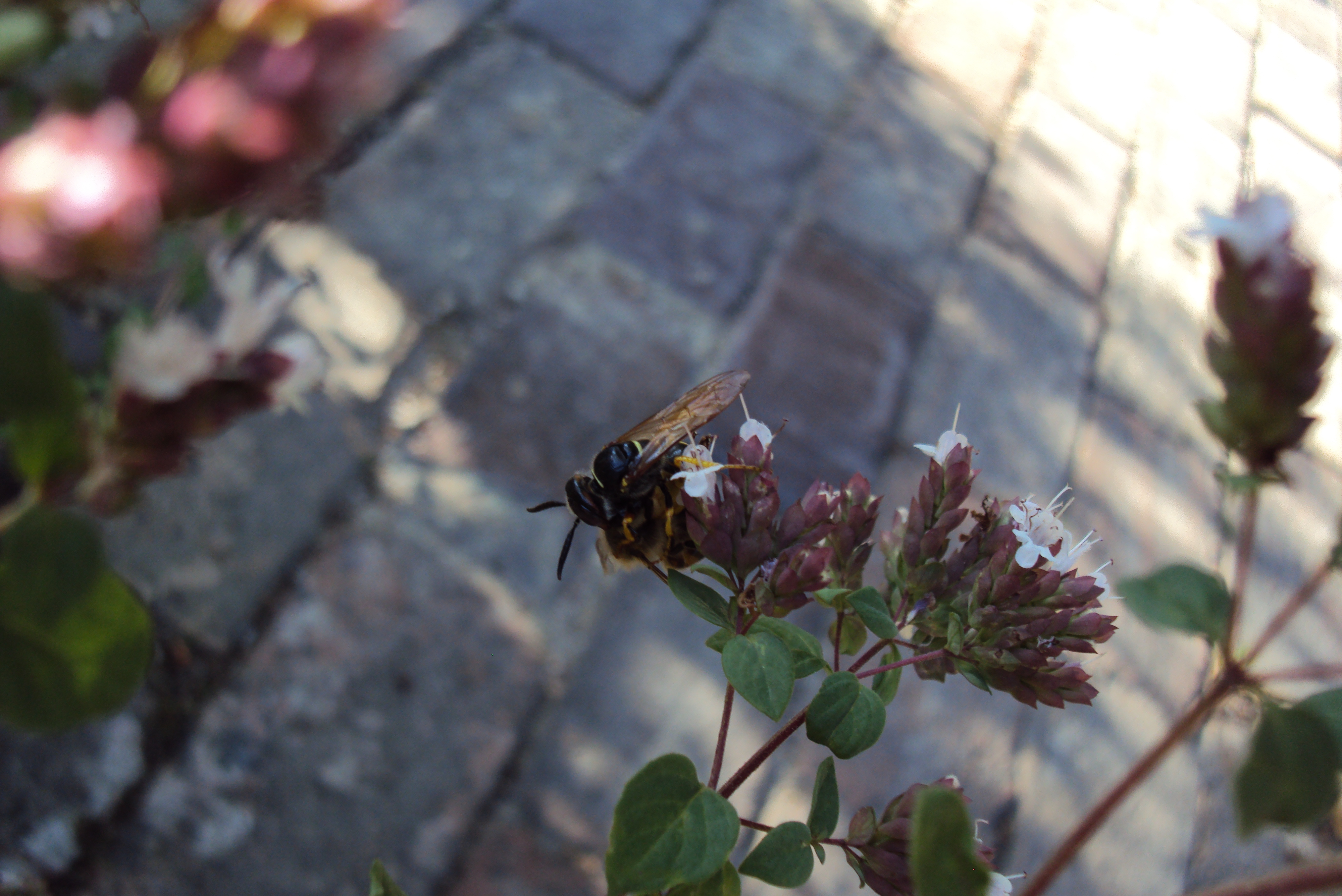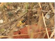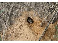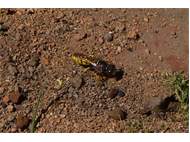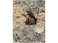 Bienenwolf, Weibchen beim Nestbau auf einem Gehweg, daneben liegt eine tote Honigbiene, Leipzig, Ortsteil Reudnitz-Thonberg, Juli 2009 (© Victor Weiler)( Bild vergrößern)