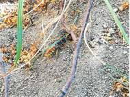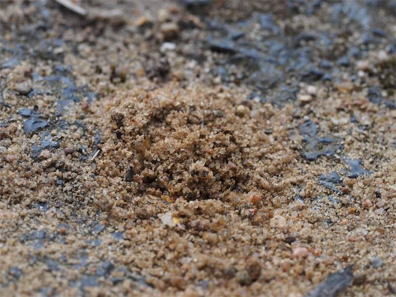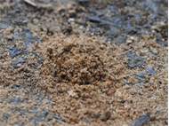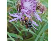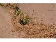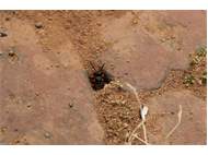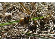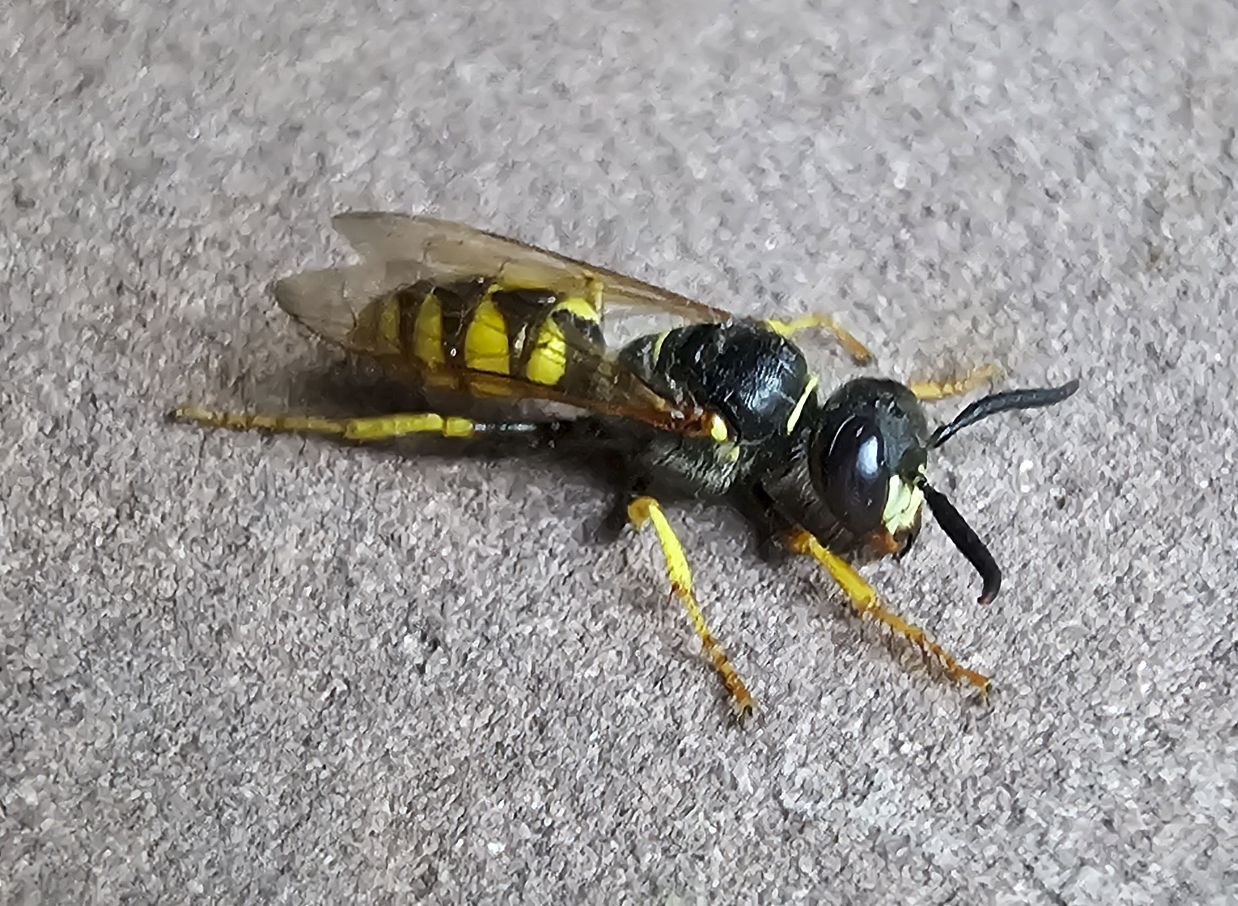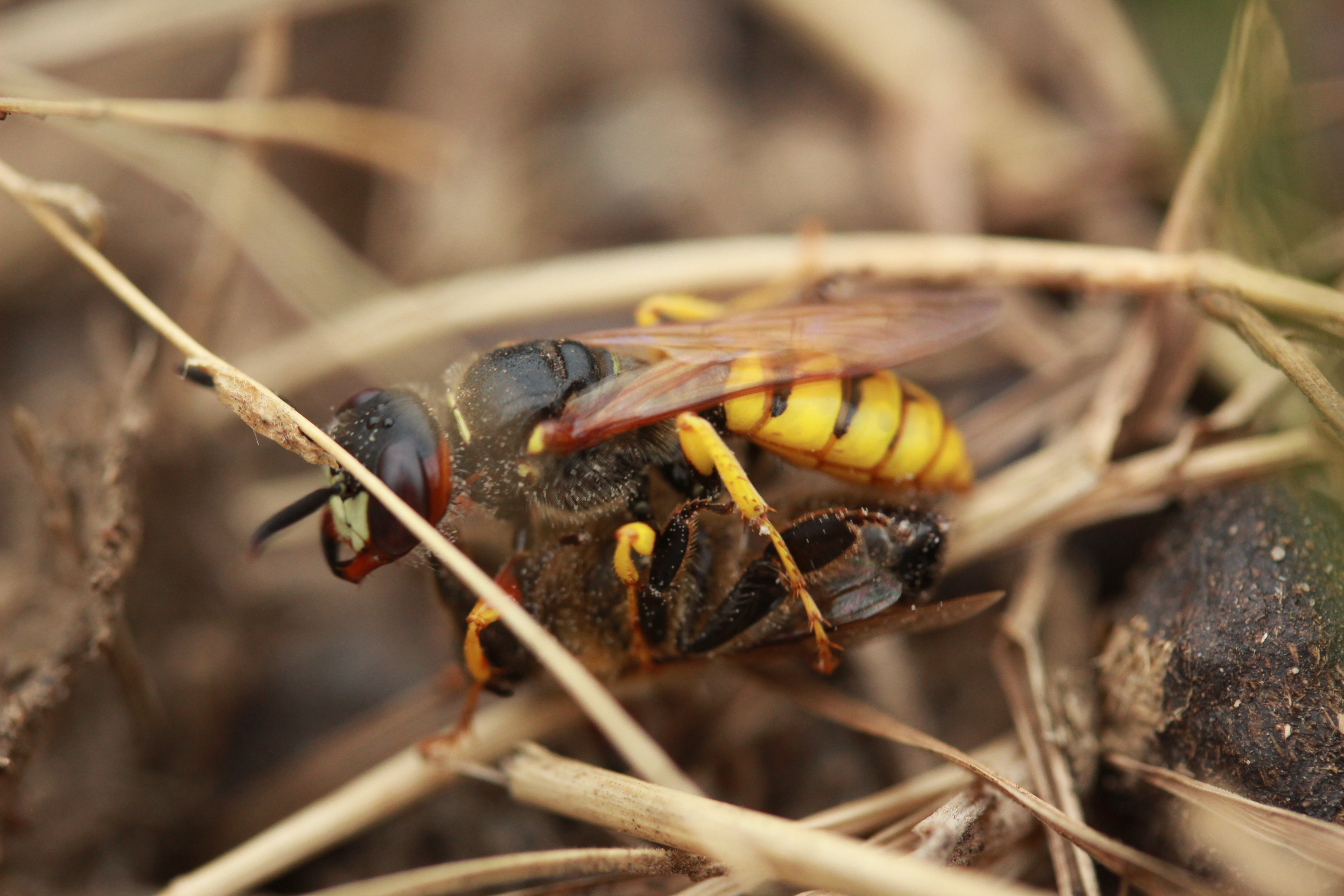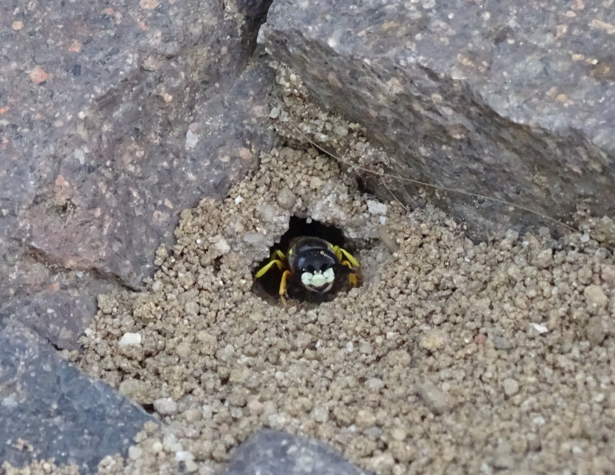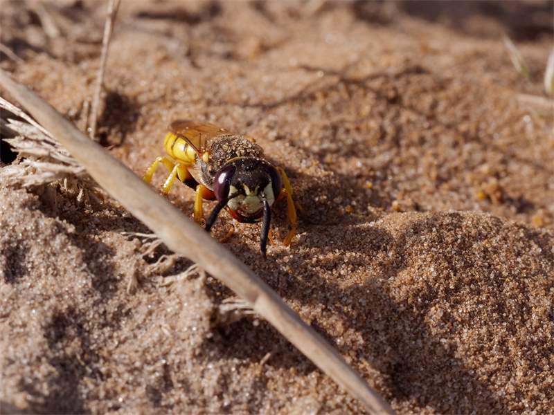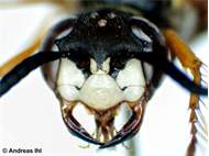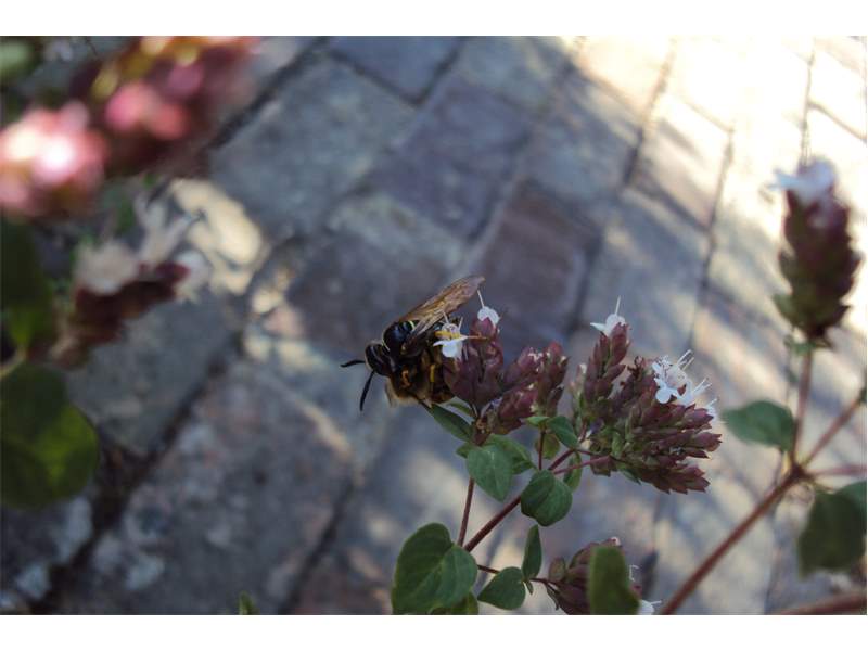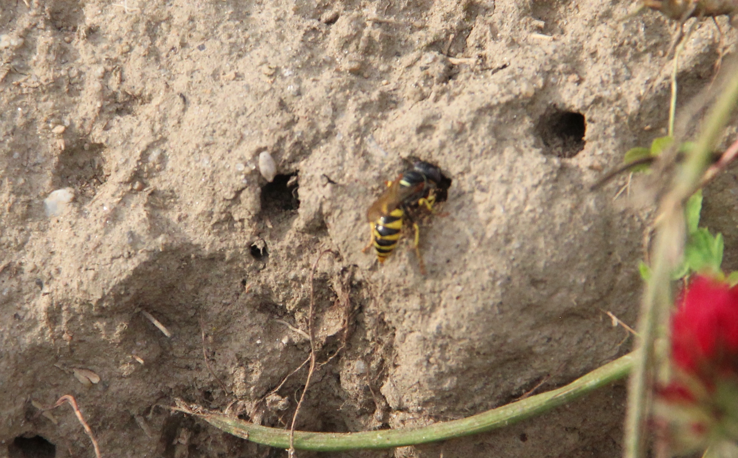 Bienenwolf, Weibchen beim Nestbau auf einem Gehweg, daneben liegt eine tote Honigbiene, Leipzig, Ortsteil Reudnitz-Thonberg, Juli 2009 (© Victor Weiler)( Bild vergrößern)