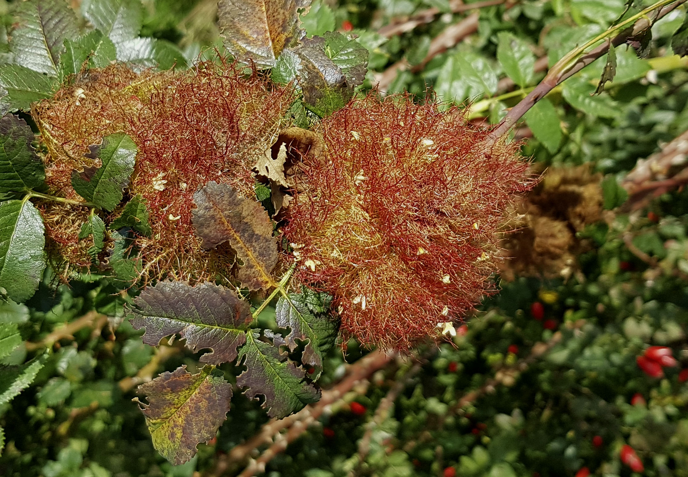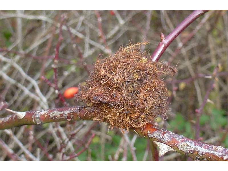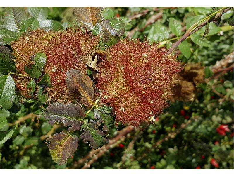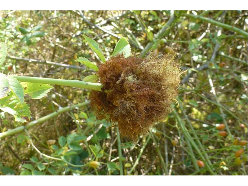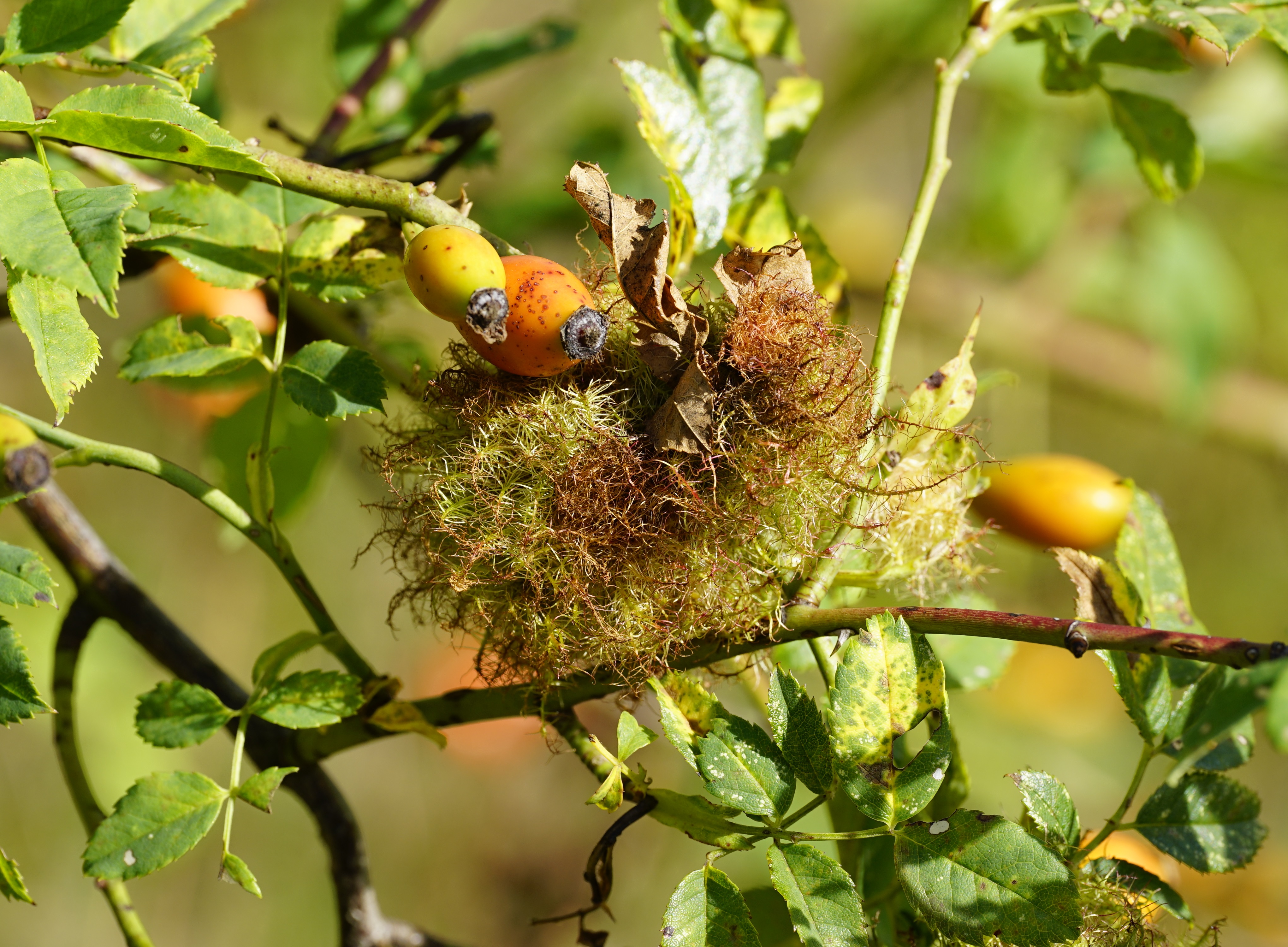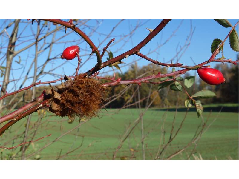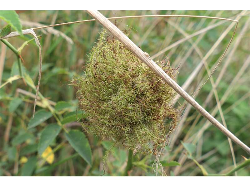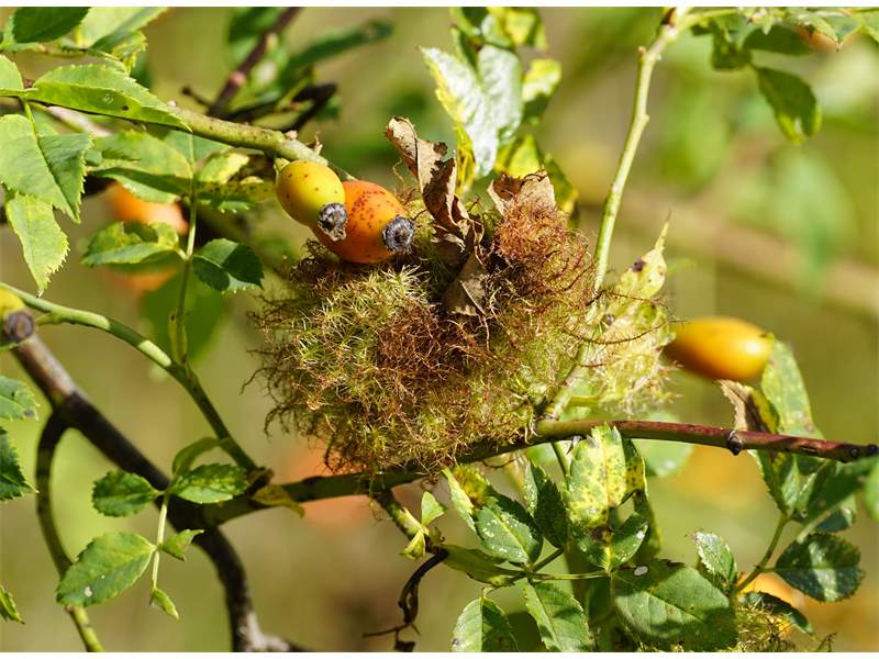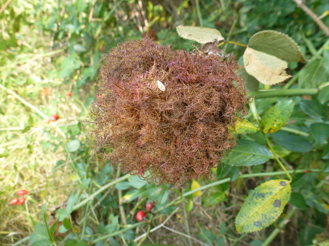 Rosengallwespe verursachte Wuchergebilde an überhängenden Trieben wilder Hecken- oder Hundsrose (Rosa canina) fotografiert 02. Oktober 2022 bei 04509 Kupsal (Nordsachsen)