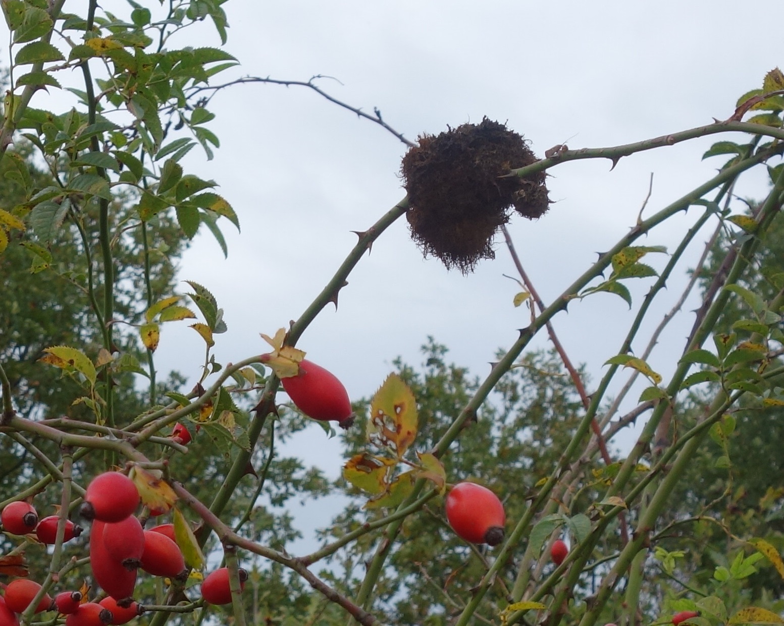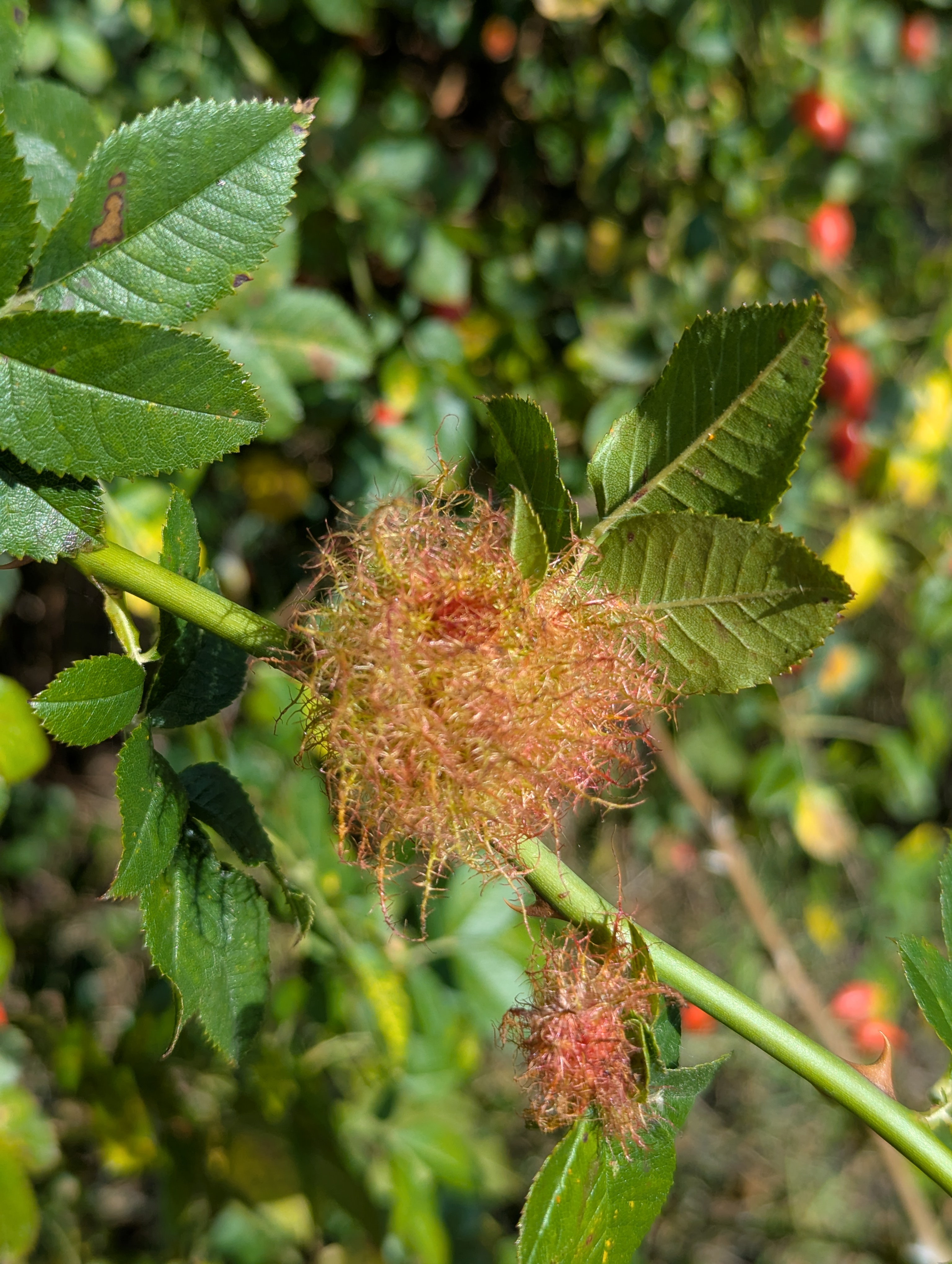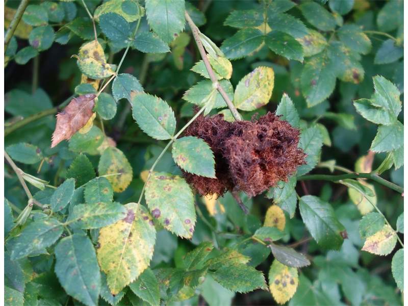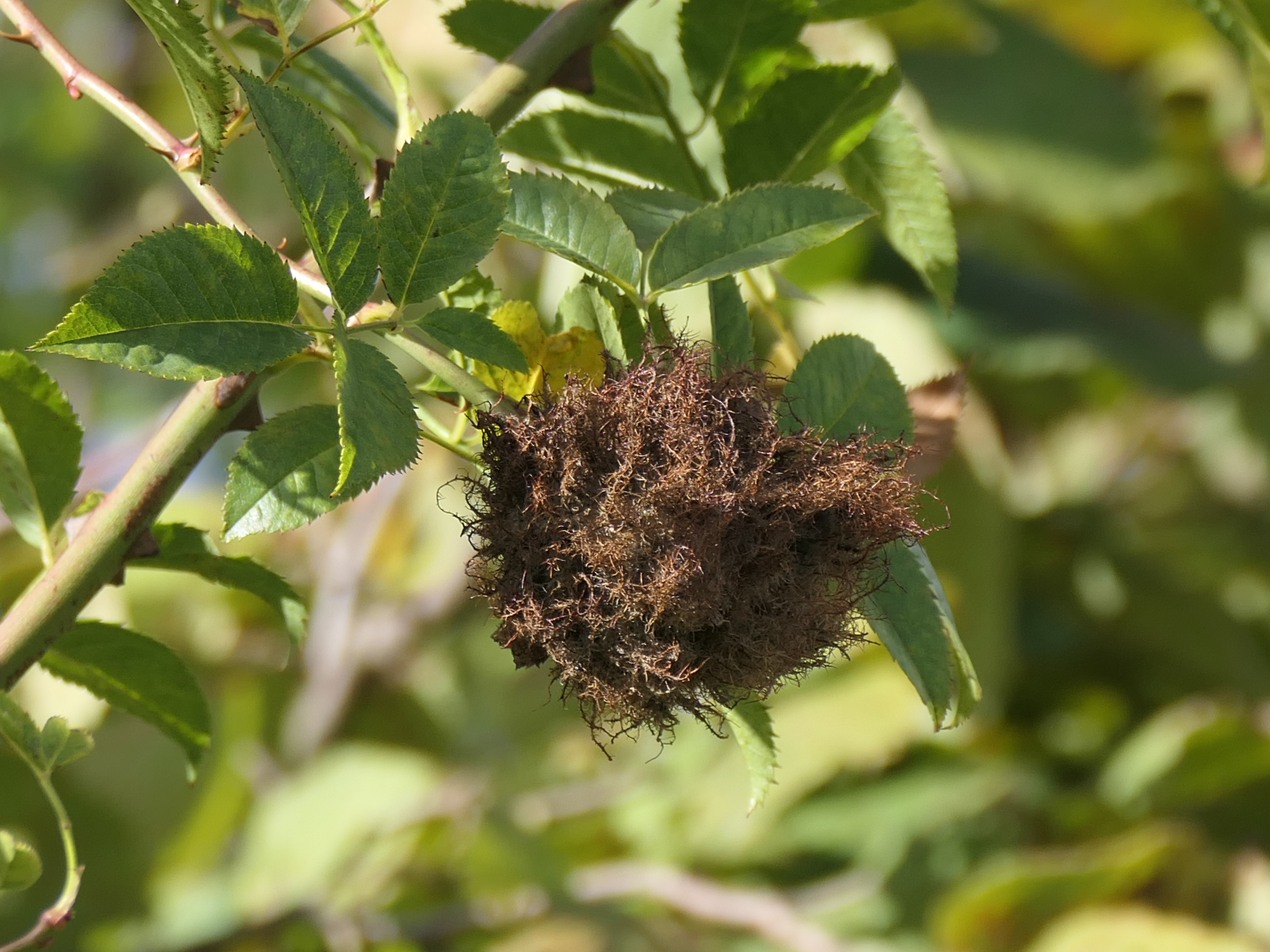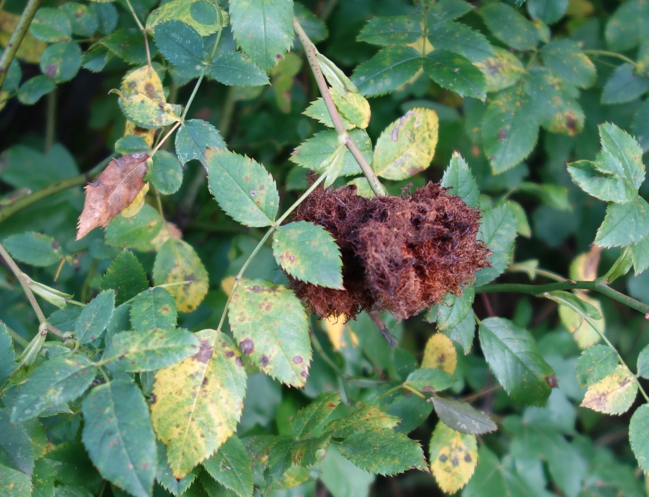 Rosengallwespe verursachte Wuchergebilde an überhängenden Trieben wilder Hecken- oder Hundsrose (Rosa canina) fotografiert 02. Oktober 2022 bei 04509 Kupsal (Nordsachsen)