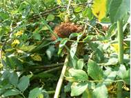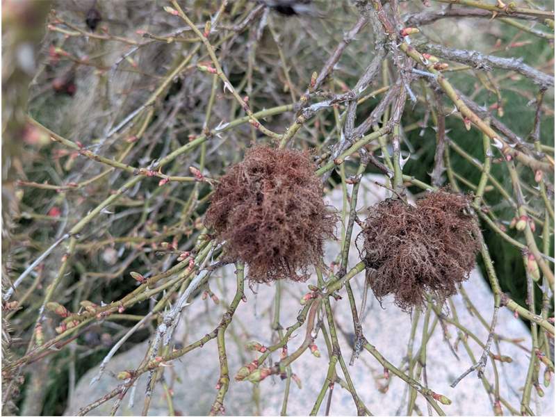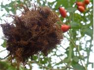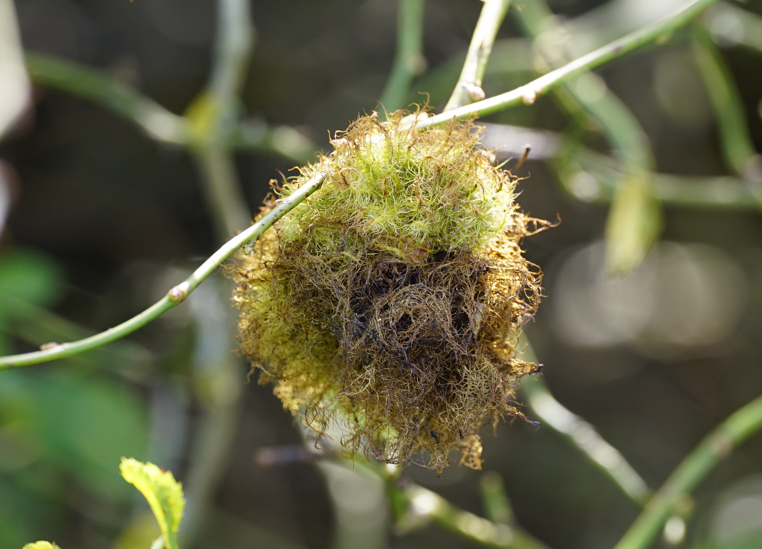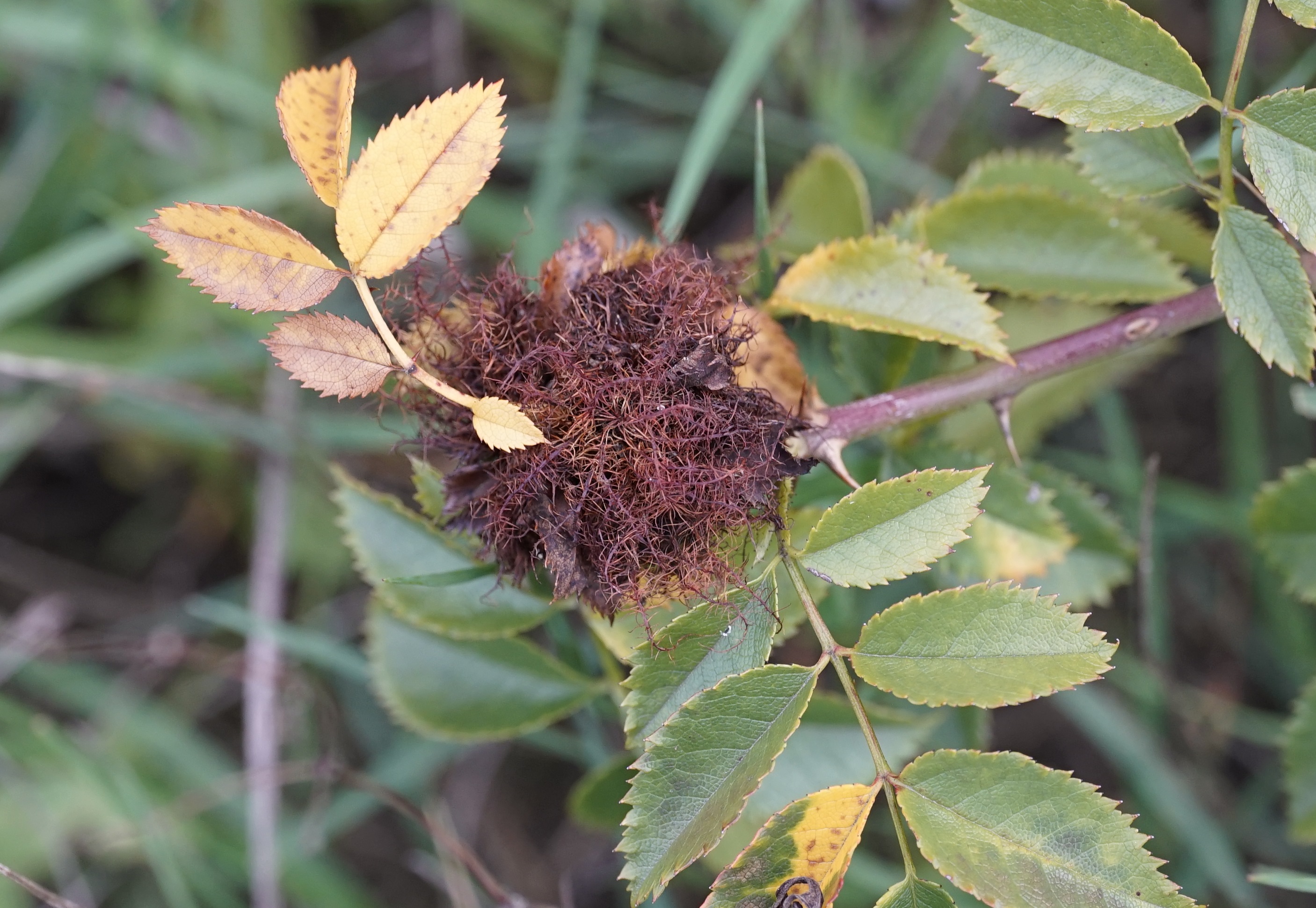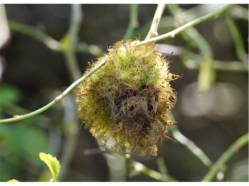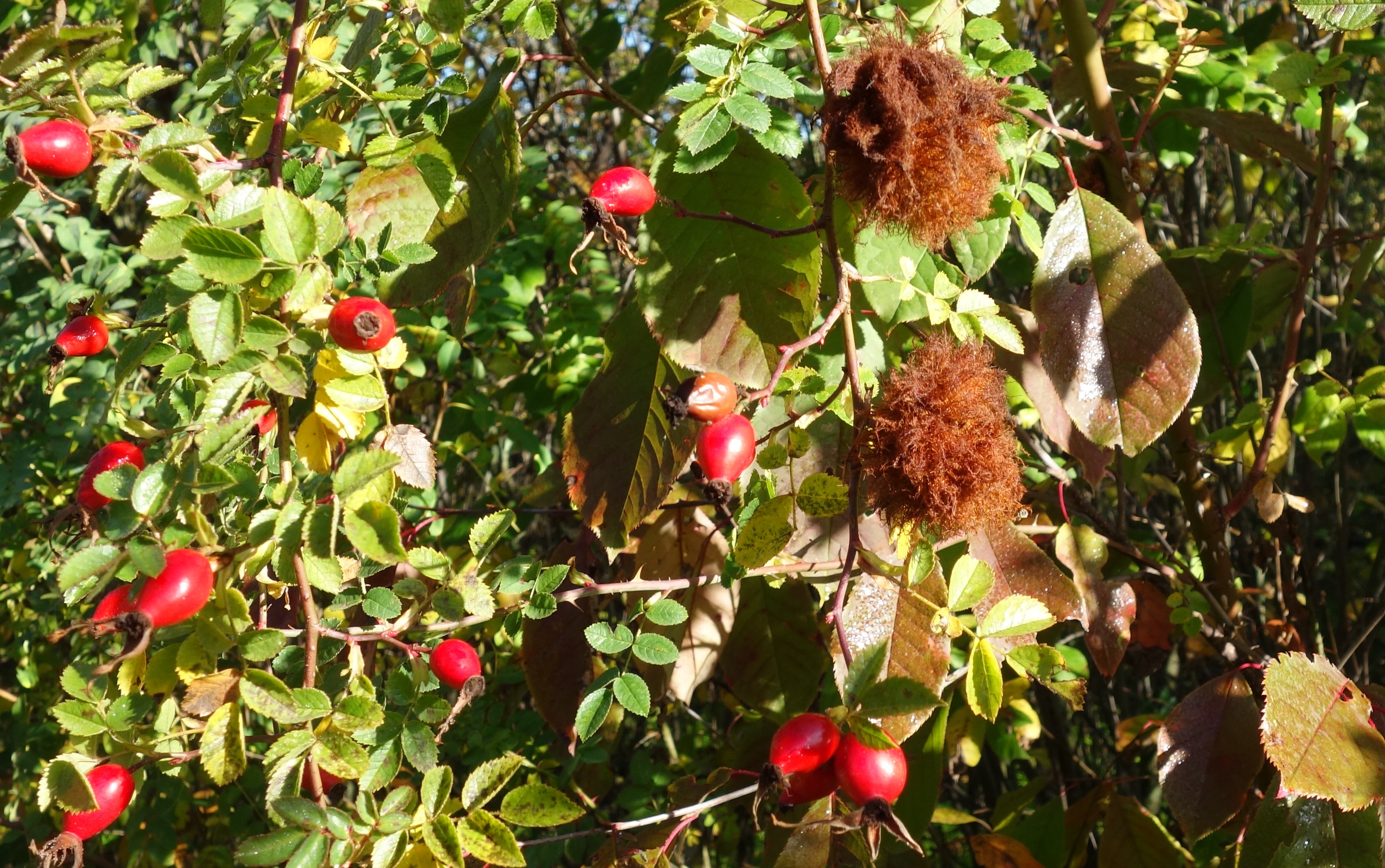 Rosengallwespe verursachte Wuchergebilde an überhängenden Trieben wilder Hecken- oder Hundsrose (Rosa canina) fotografiert 02. Oktober 2022 bei 04509 Kupsal (Nordsachsen)