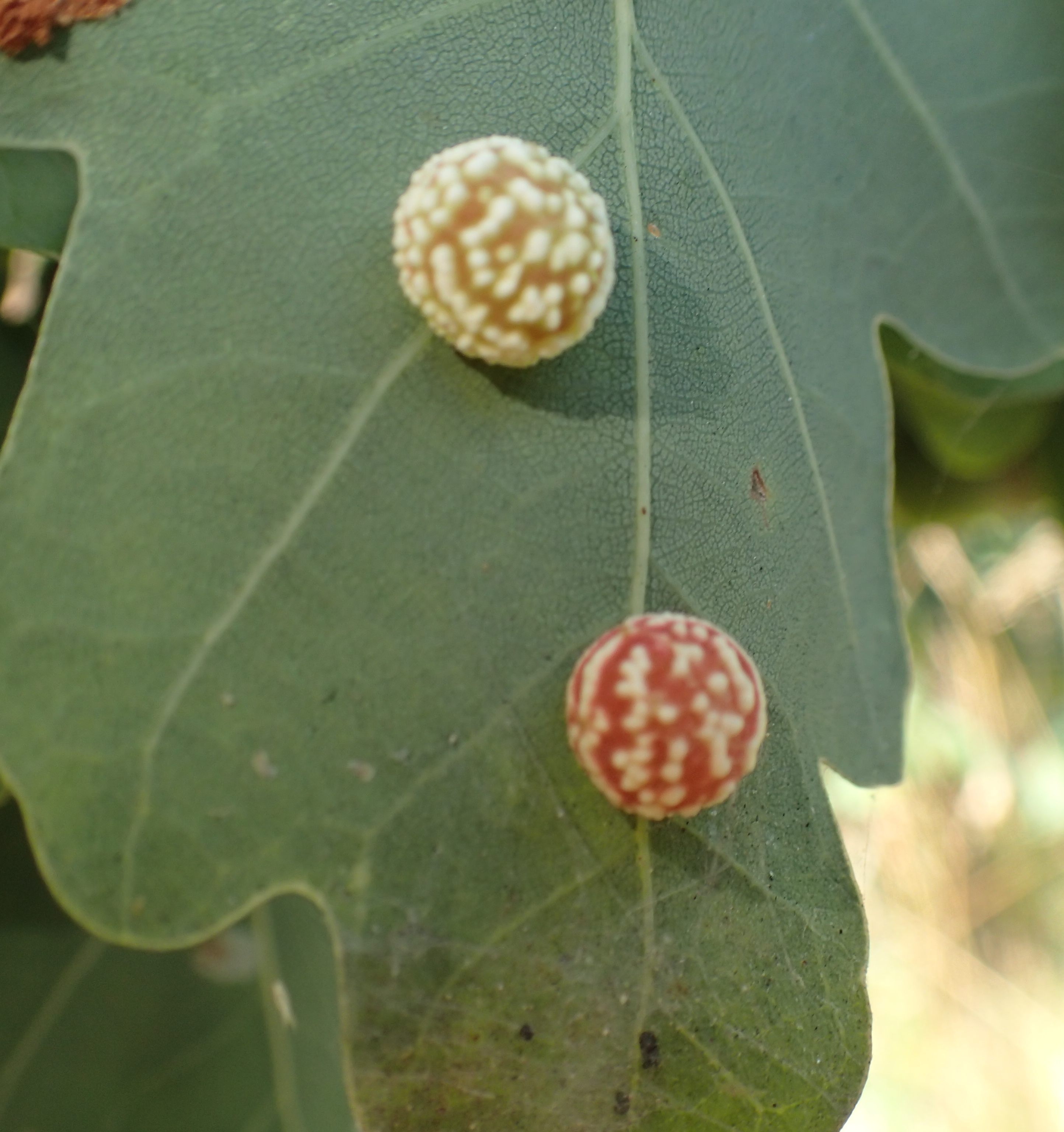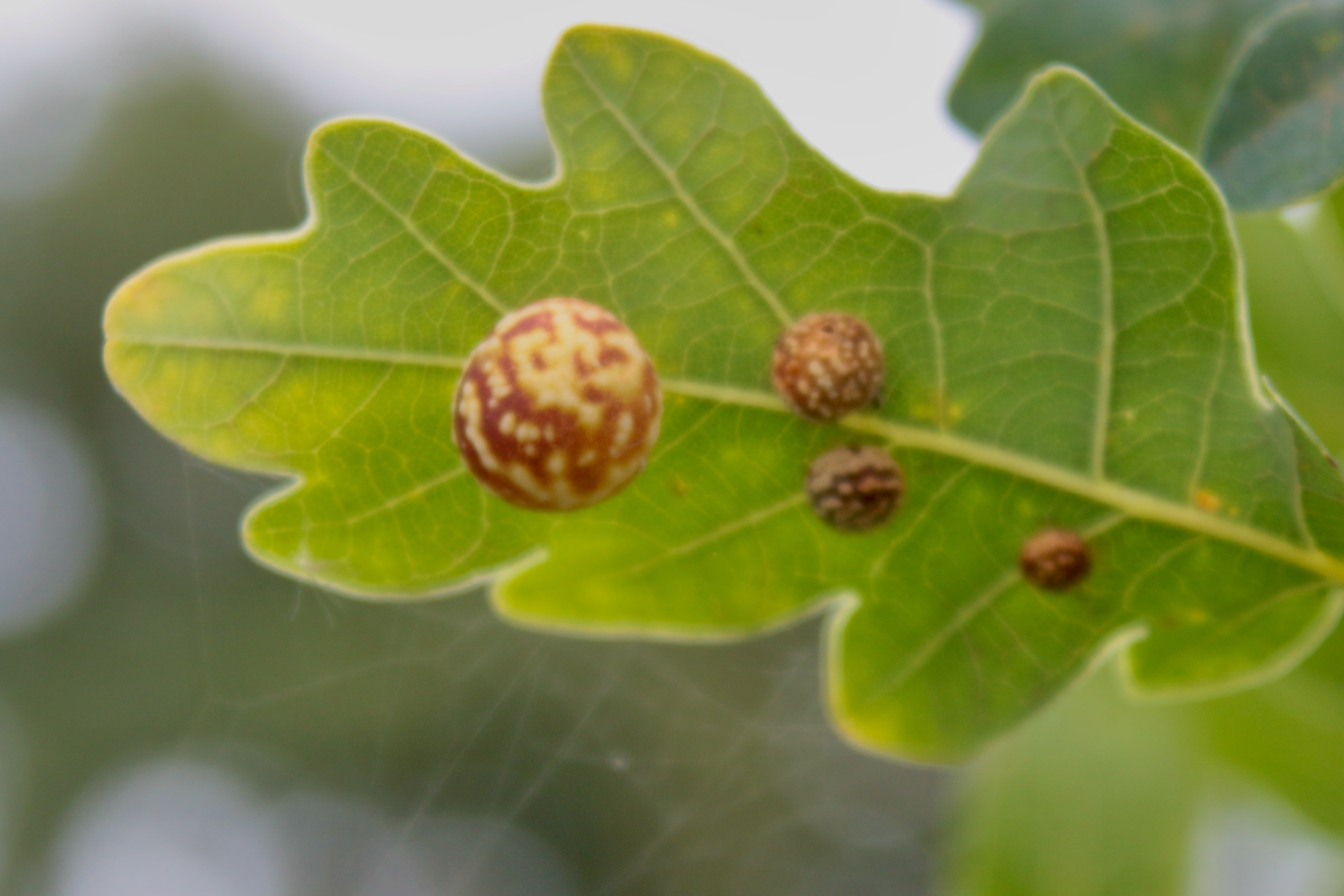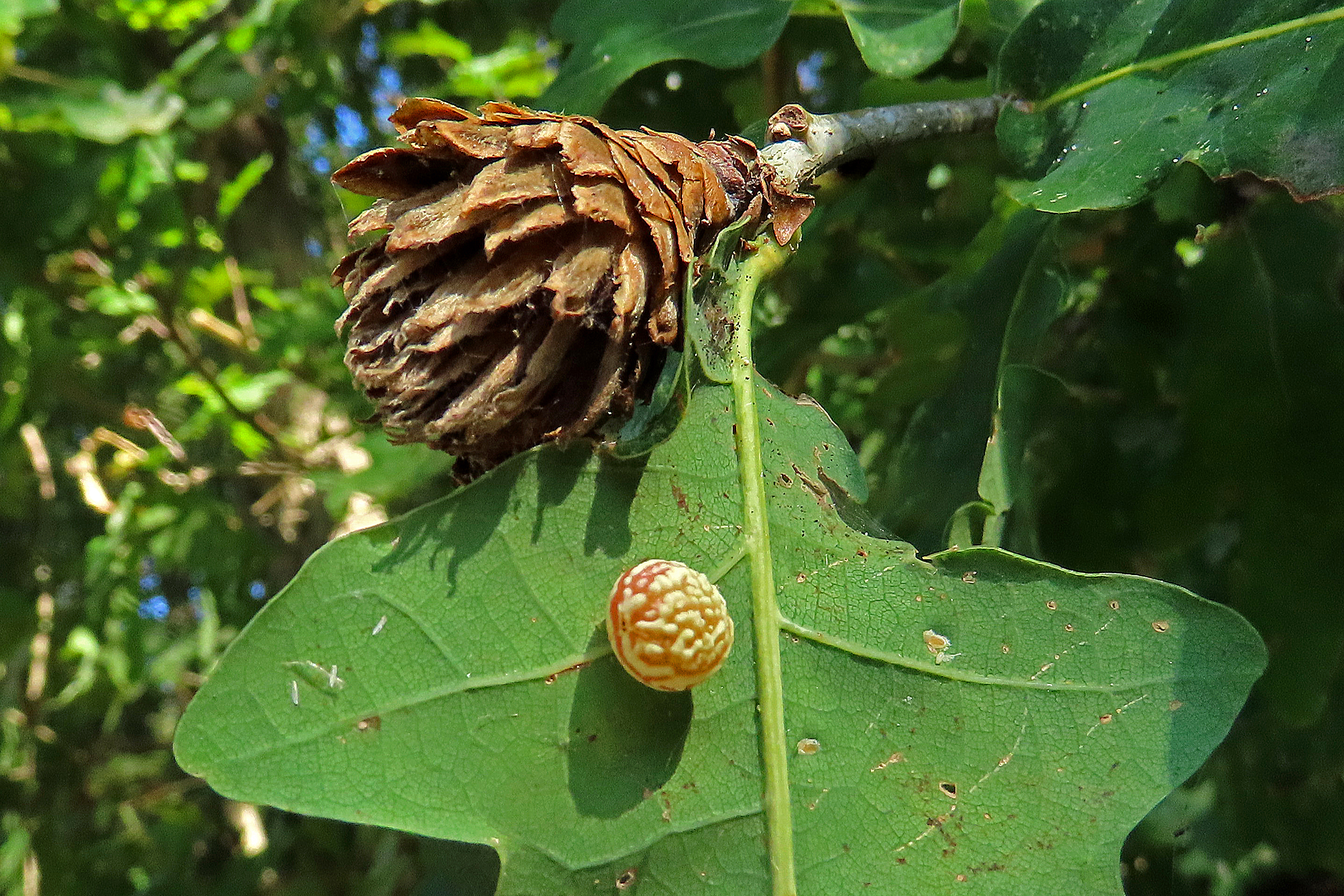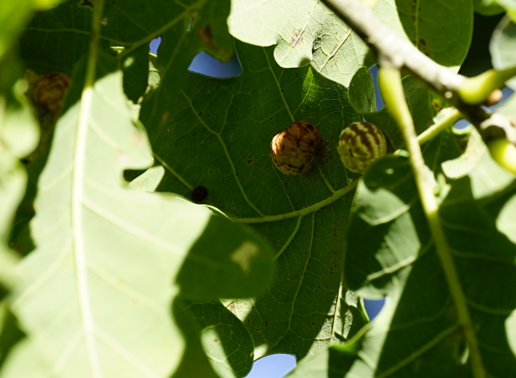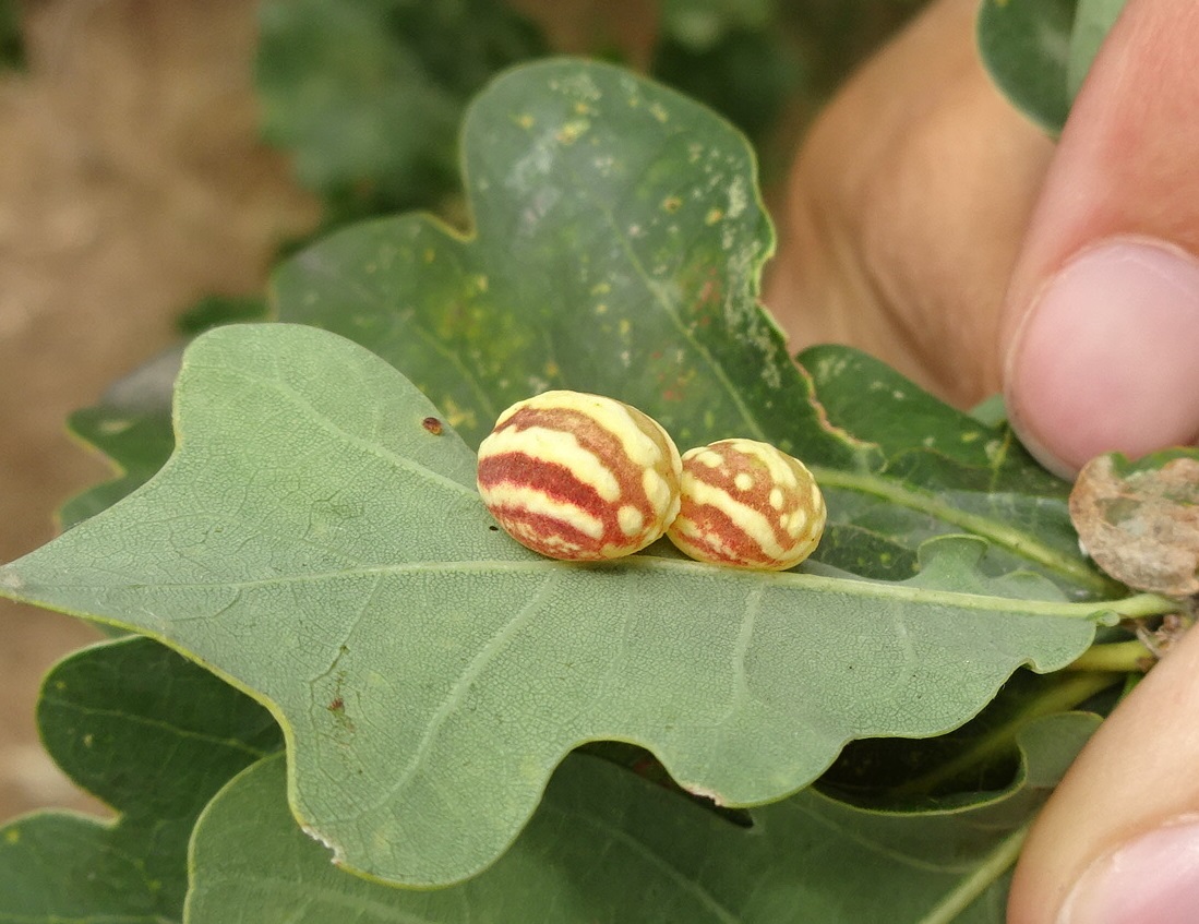 Gallen der Gestreiften Eichengallwespe (Cynips longiventris (Hartig, 1840)), bei Taubenheim, August 2016.