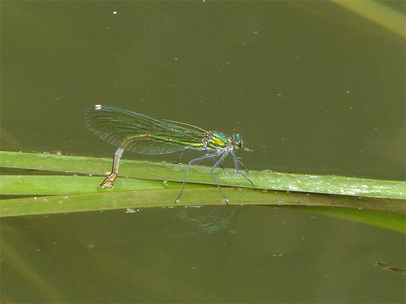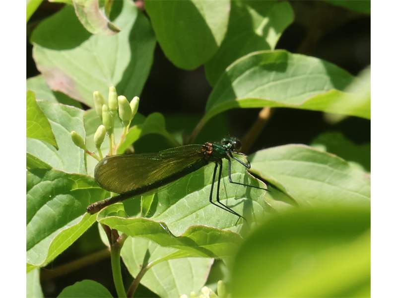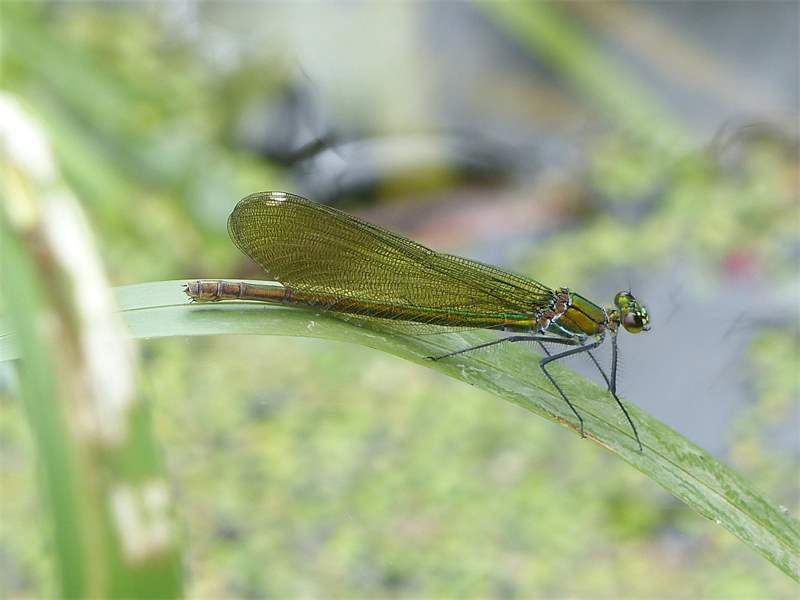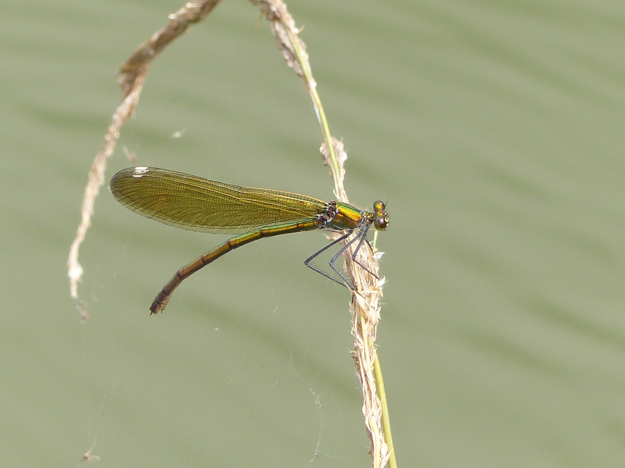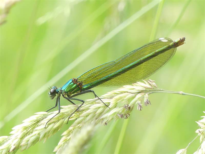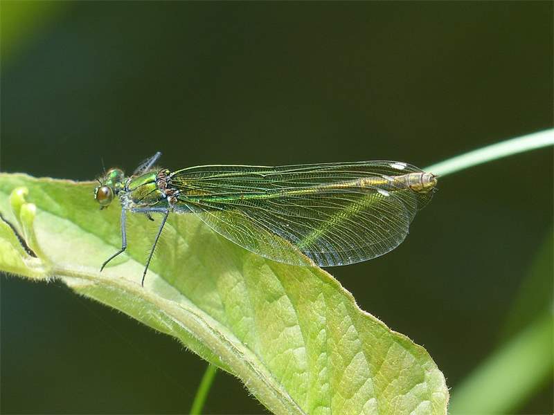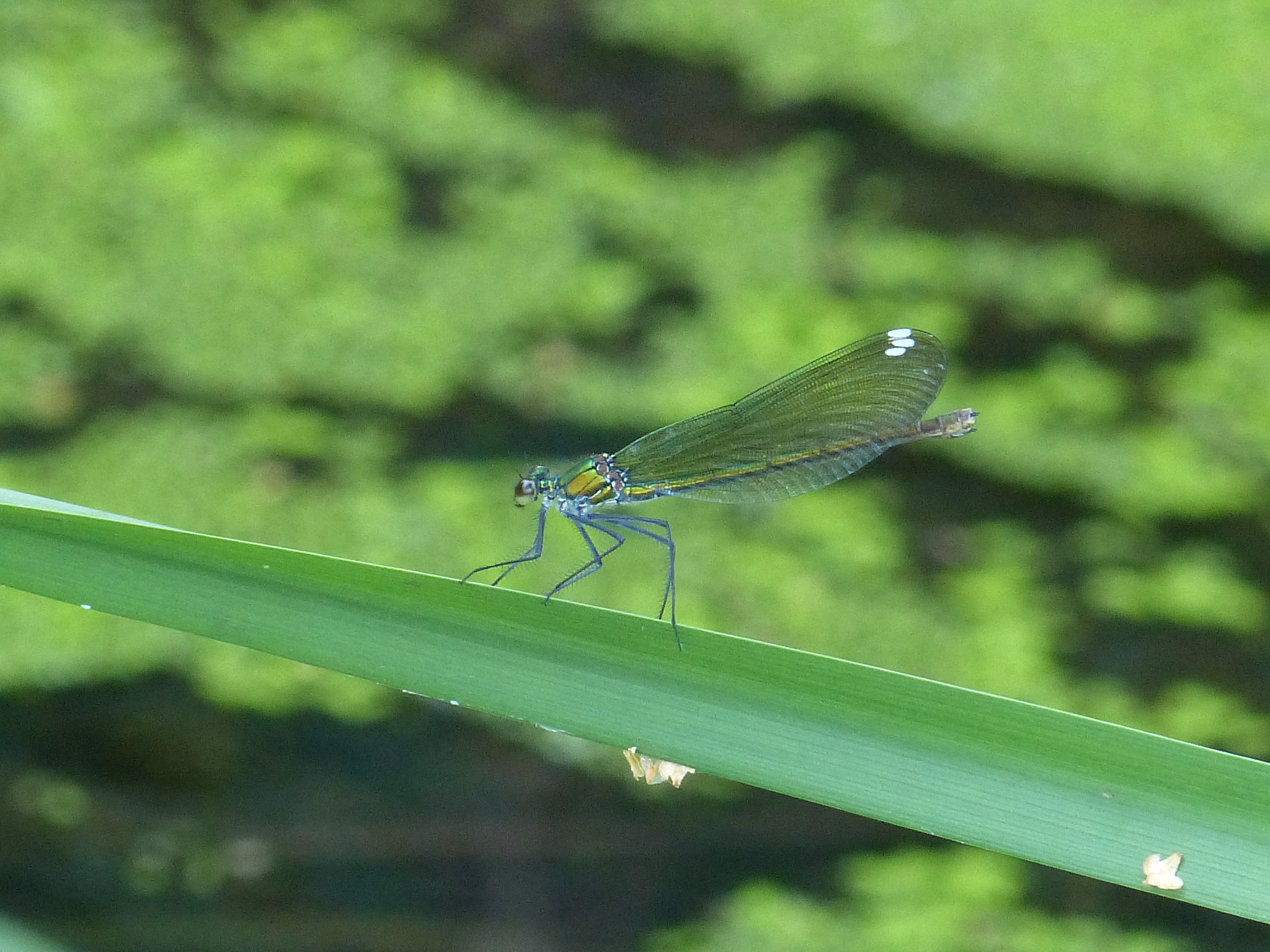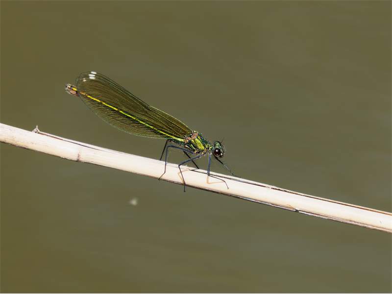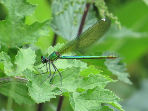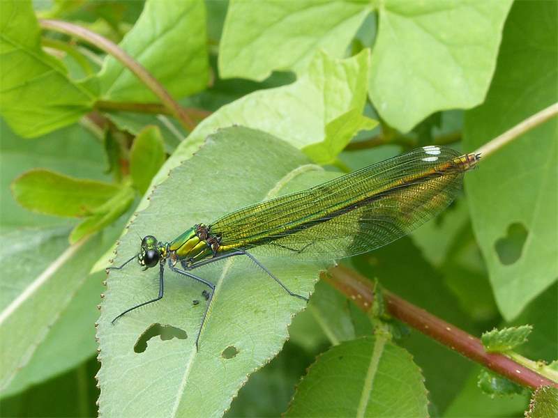 Gebänderte Prachtlibelle (Calopteryx splendens (Harris, 1782)), Weibchen, kenntlich an den grünlichen Flügeln und dem weißen Flügelmal. Neumühle Skassa bei Großenhain, Juni 2013.