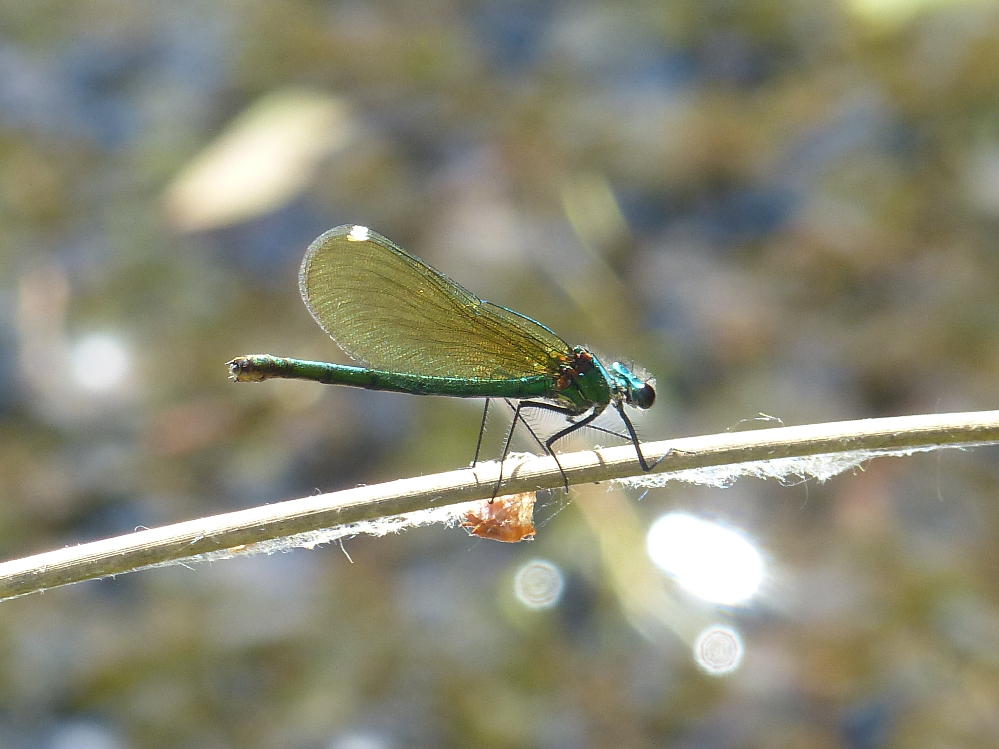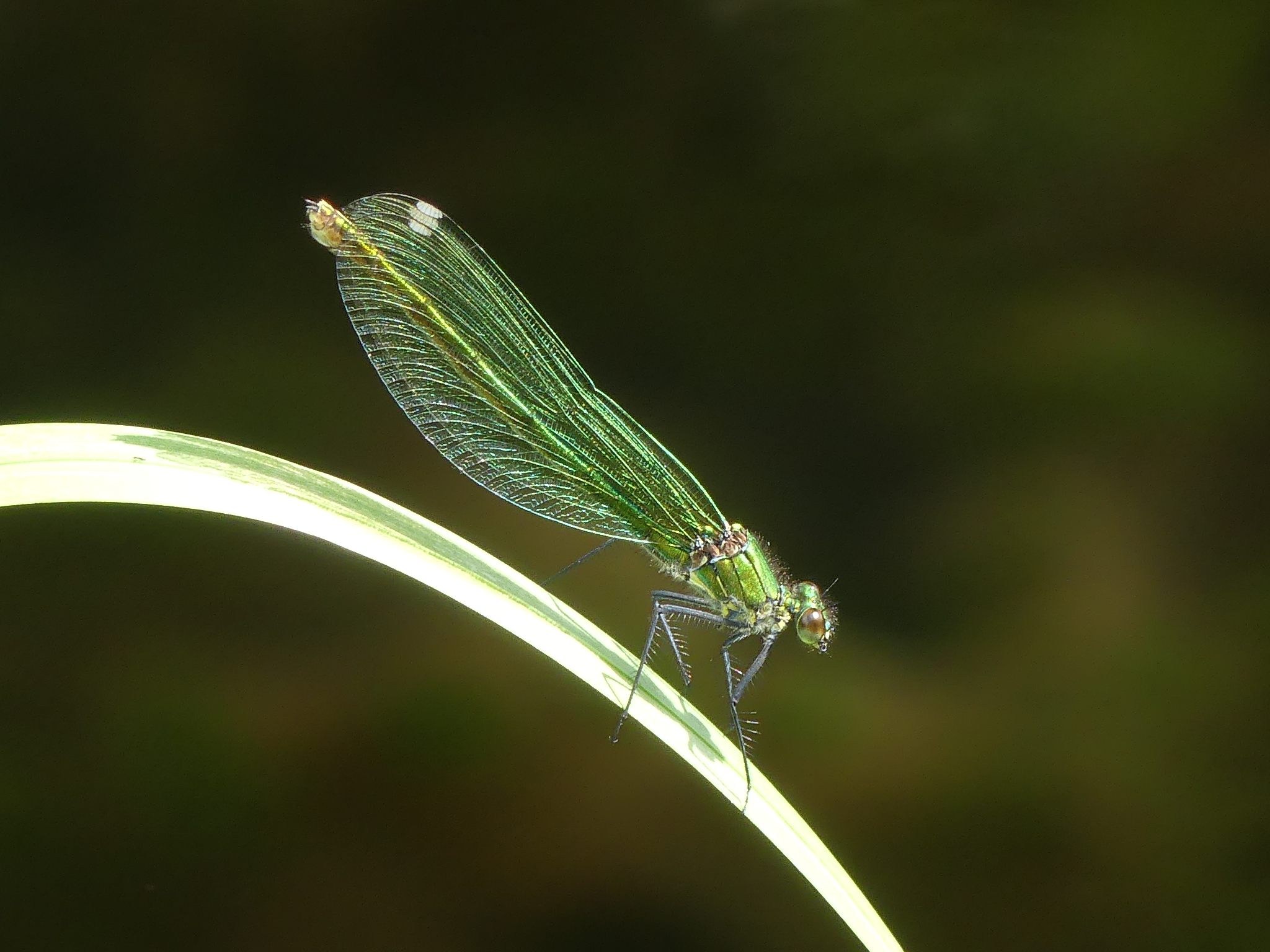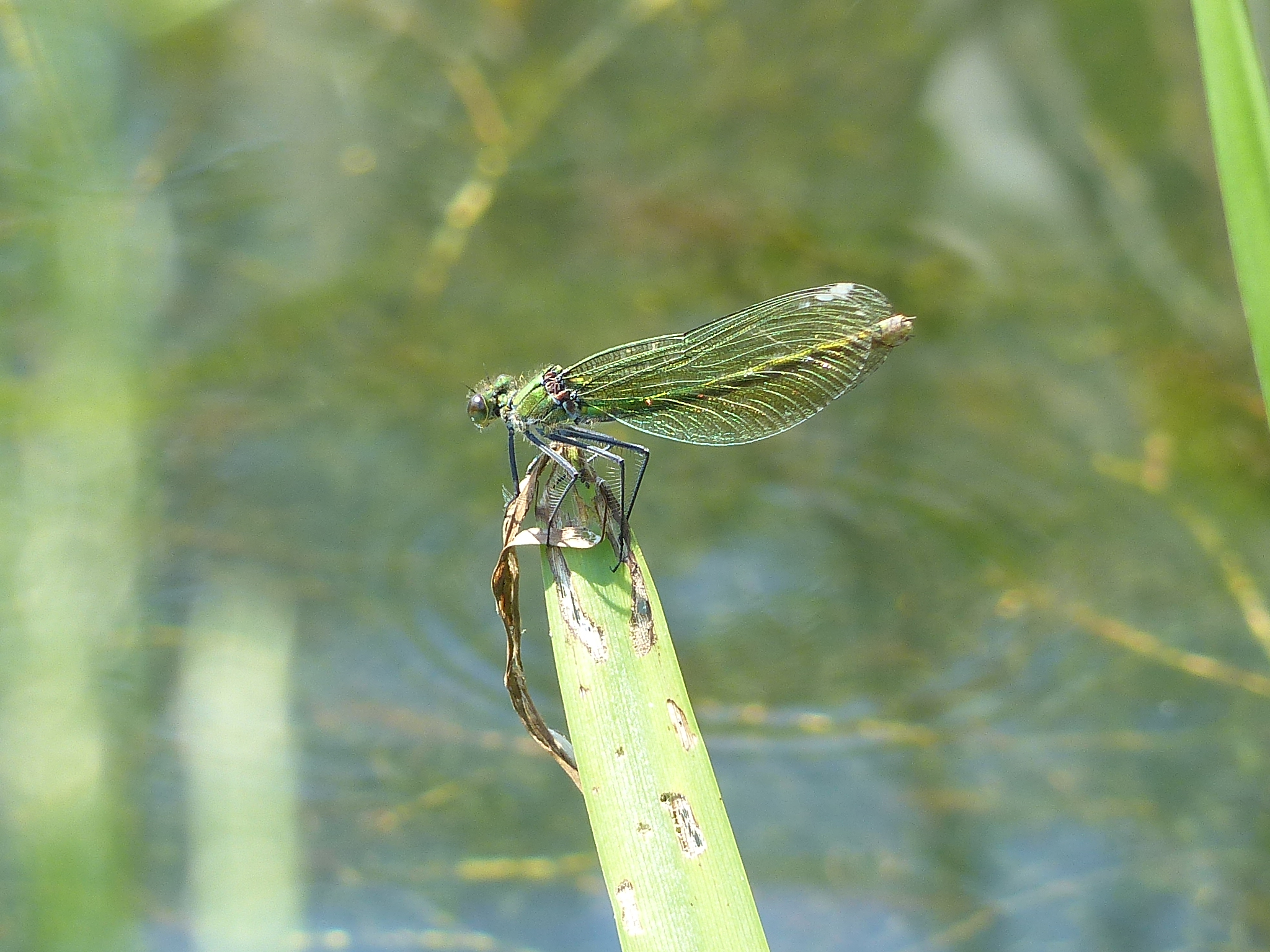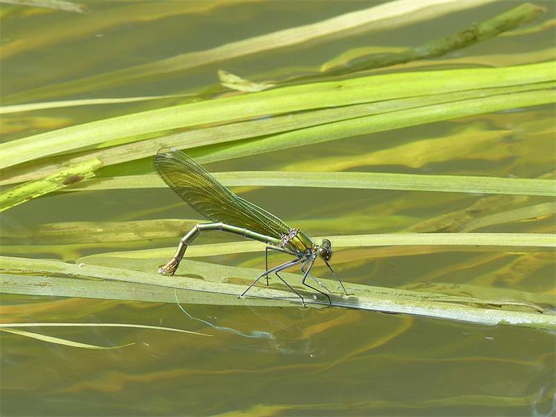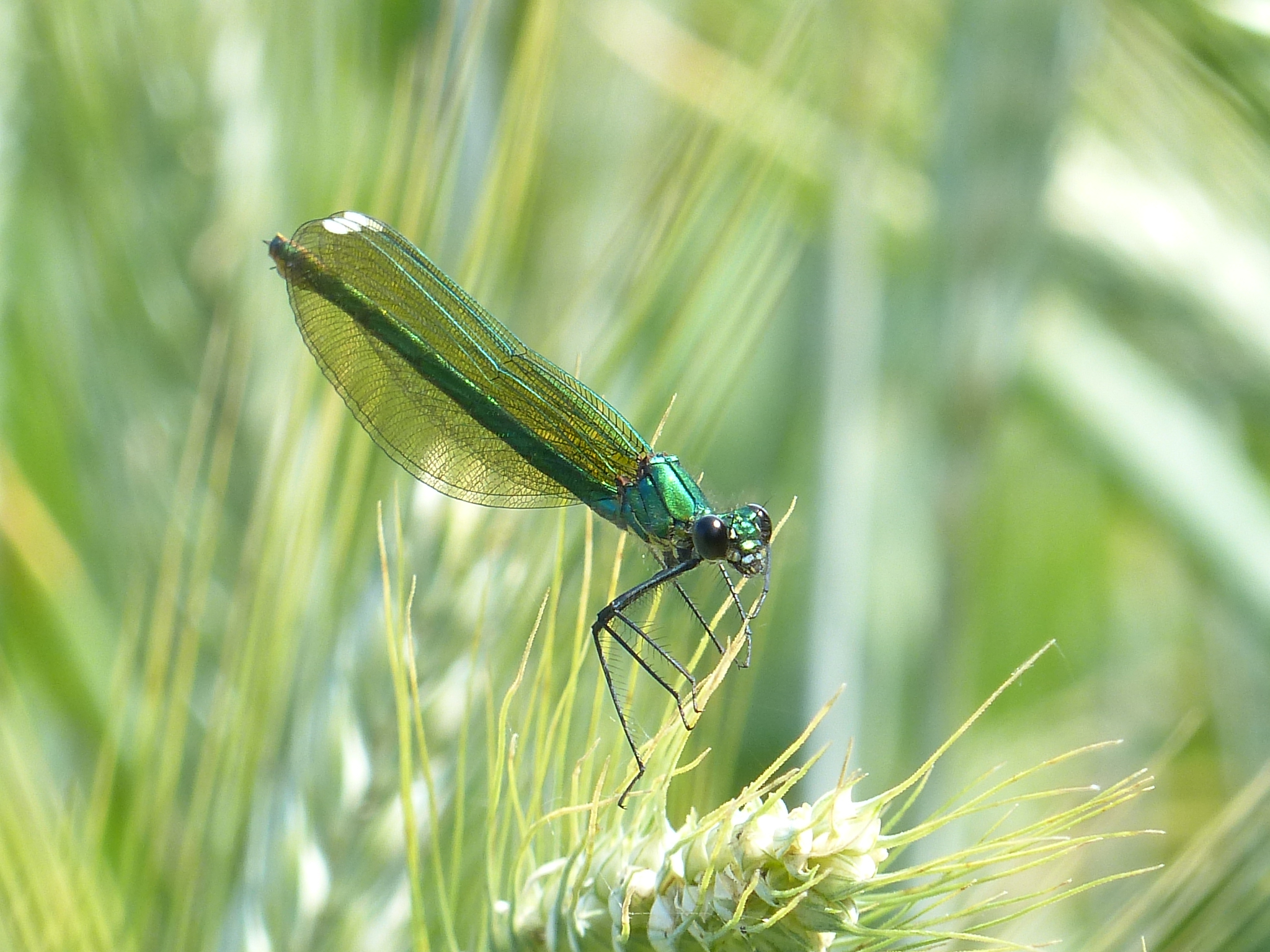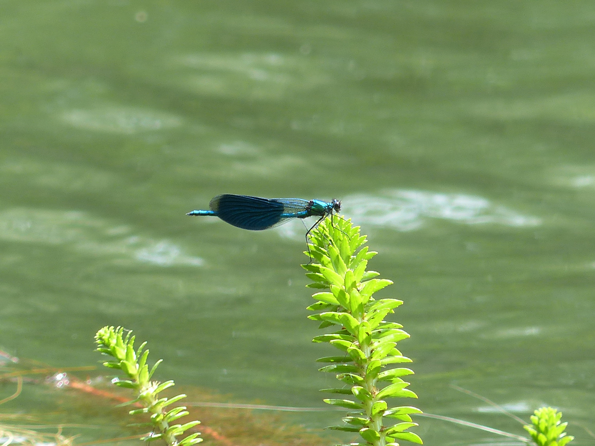 Gebänderte Prachtlibelle (Calopteryx splendens (Harris, 1782)), Weibchen, kenntlich an den grünlichen Flügeln und dem weißen Flügelmal. Neumühle Skassa bei Großenhain, Juni 2013.