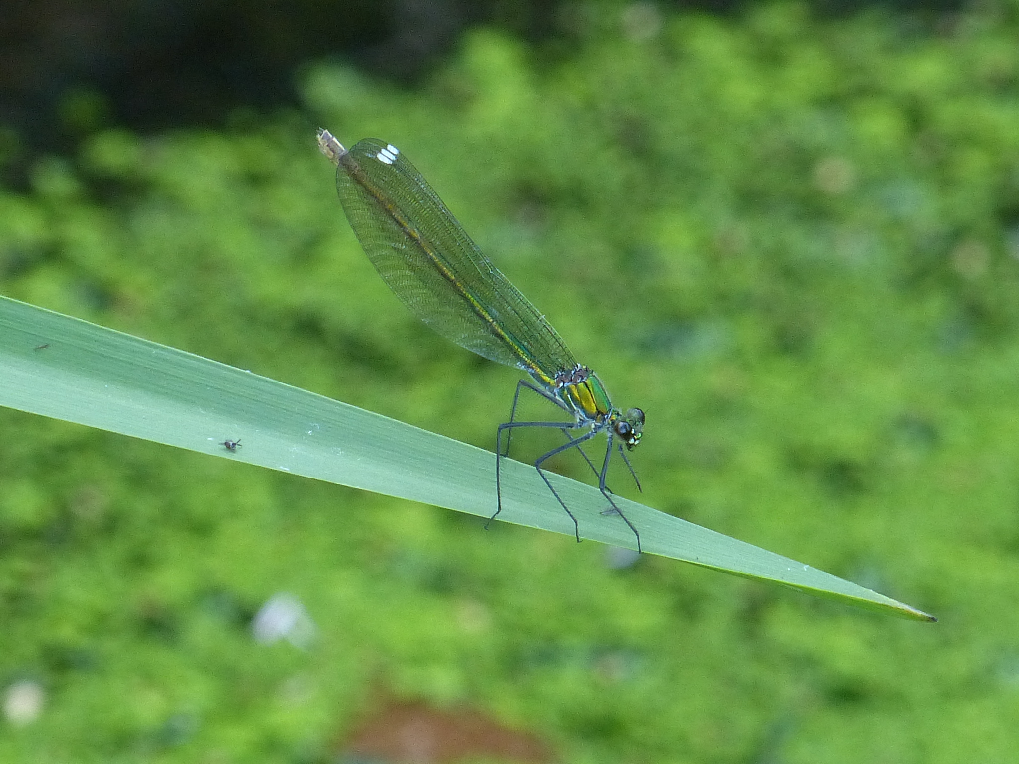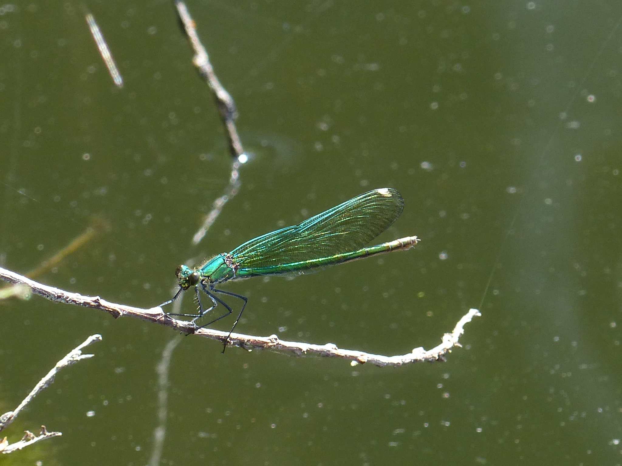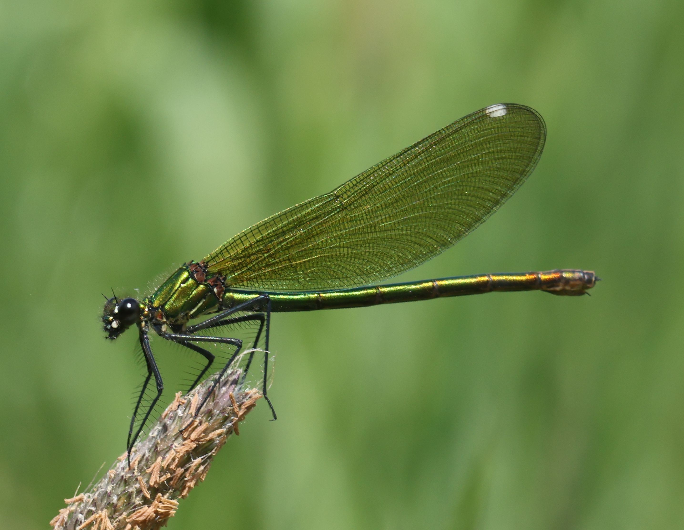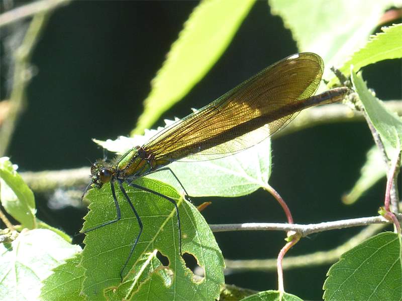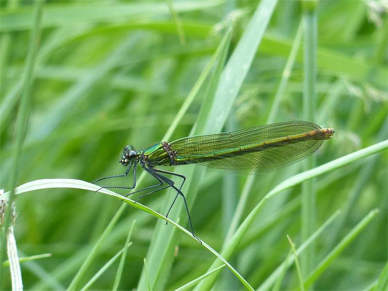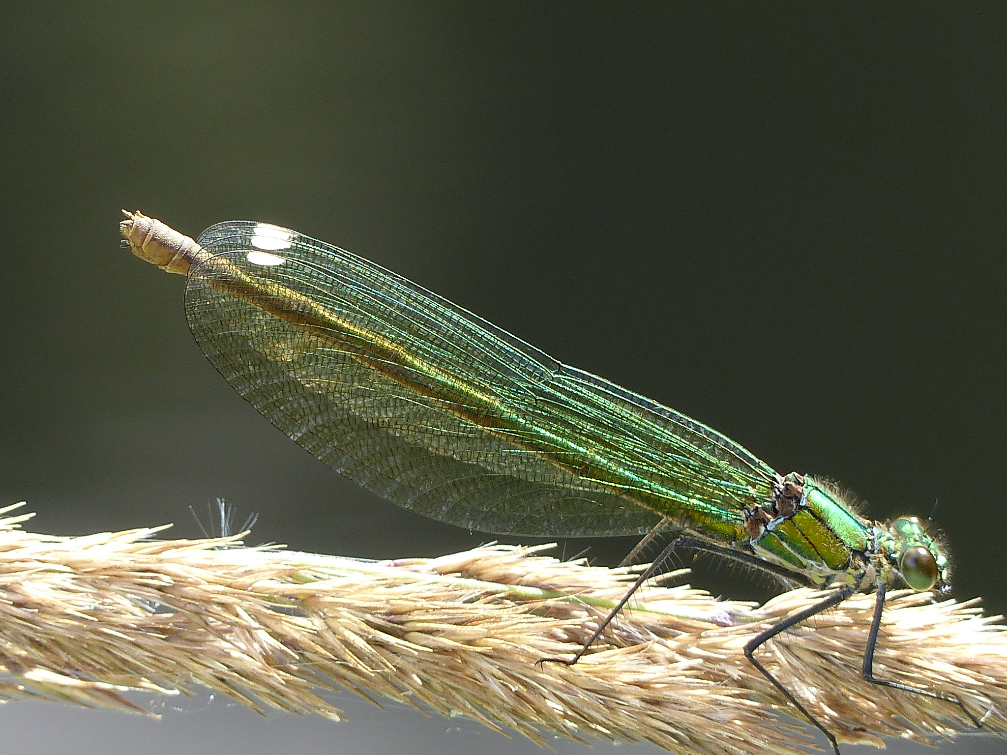 Gebänderte Prachtlibelle (Calopteryx splendens (Harris, 1782)), Weibchen, kenntlich an den grünlichen Flügeln und dem weißen Flügelmal. Neumühle Skassa bei Großenhain, Juni 2013.