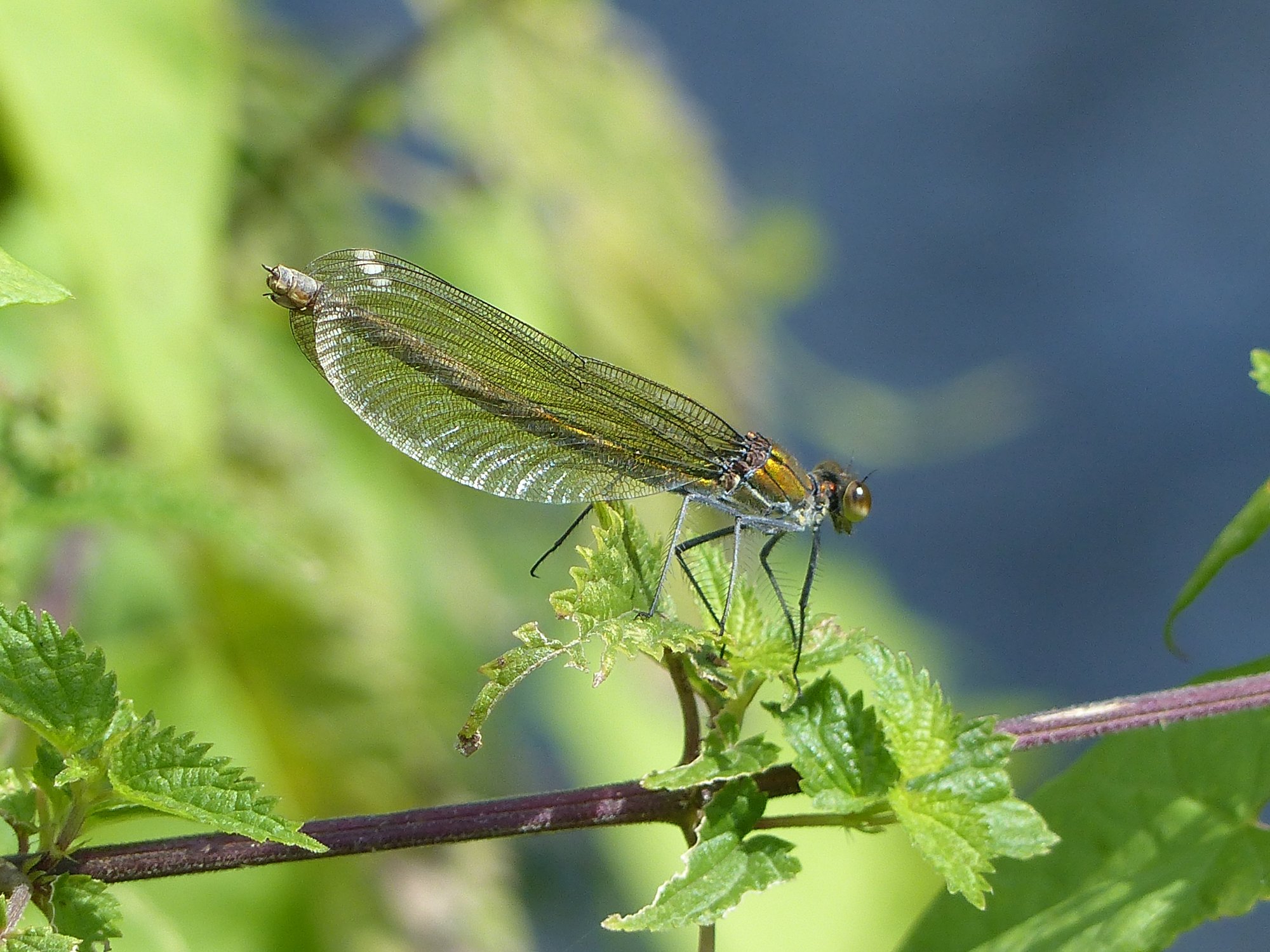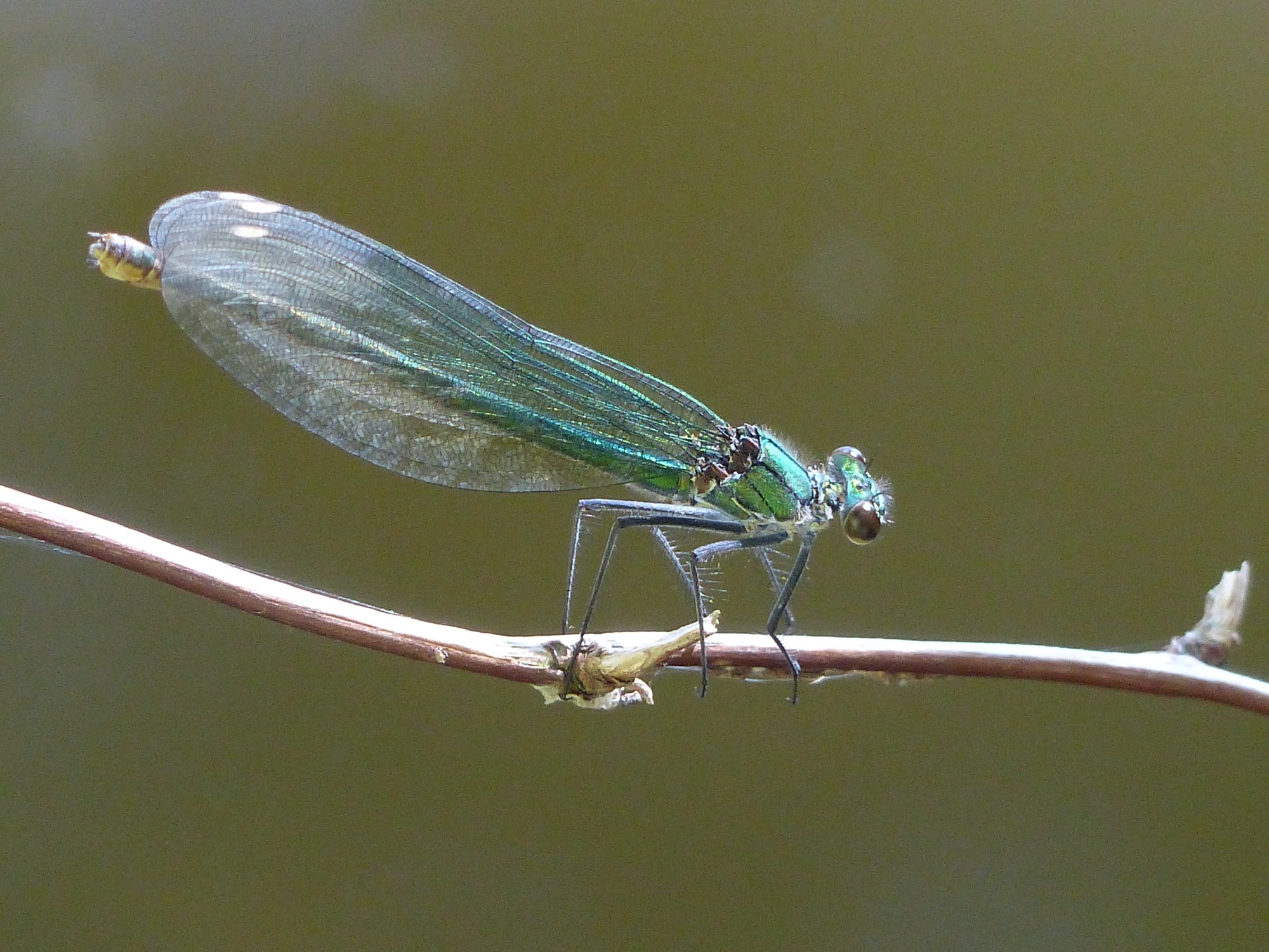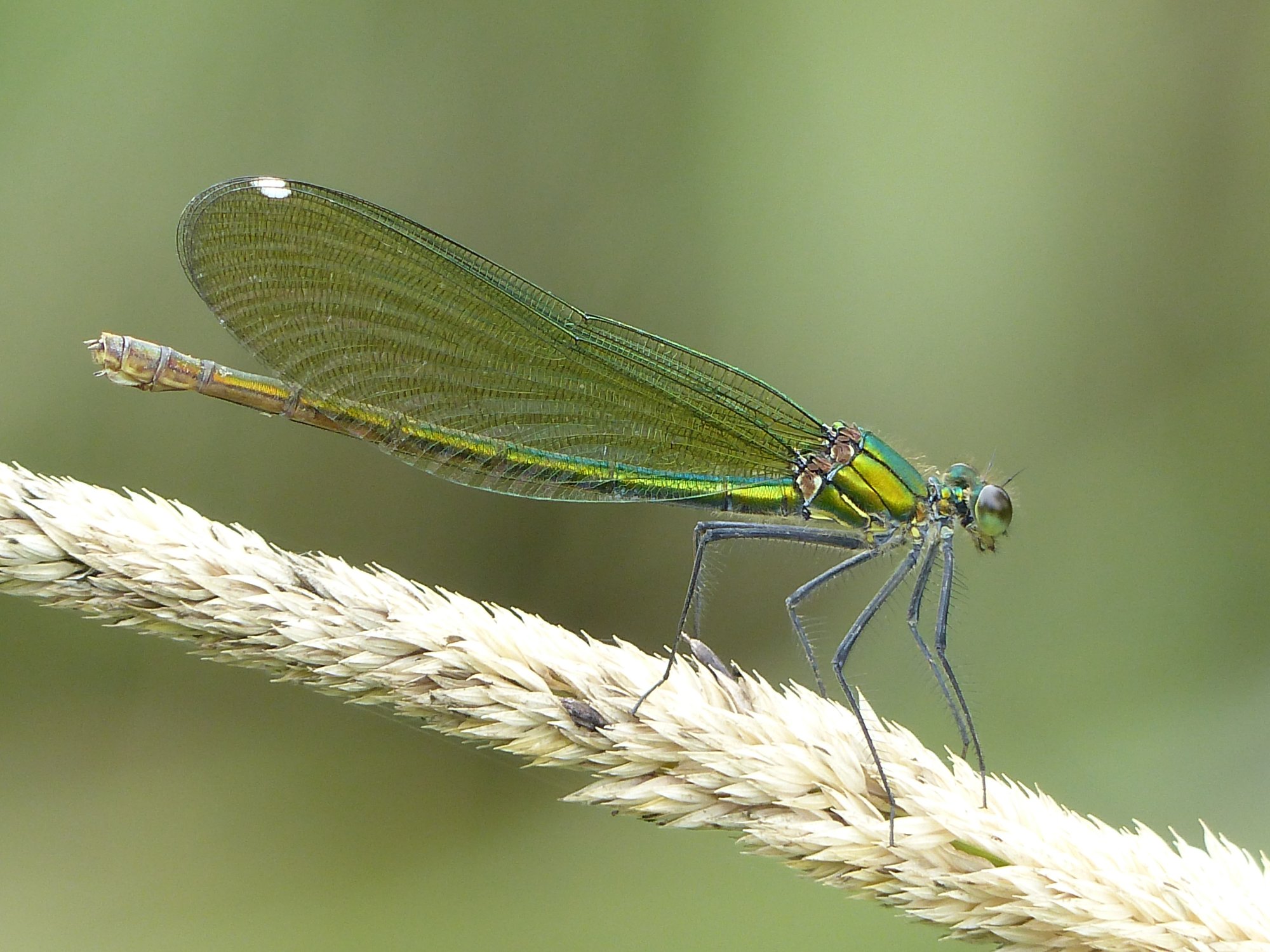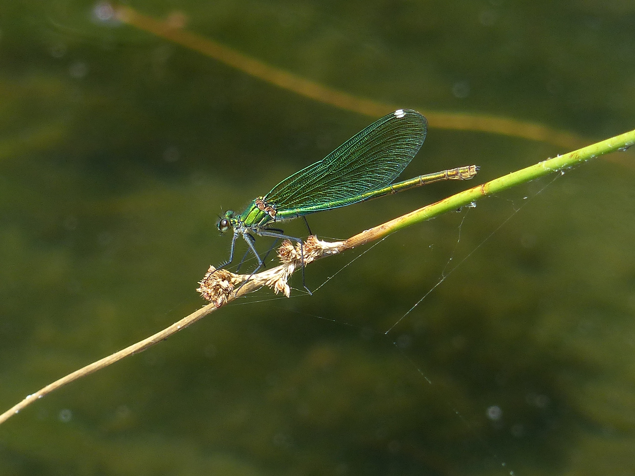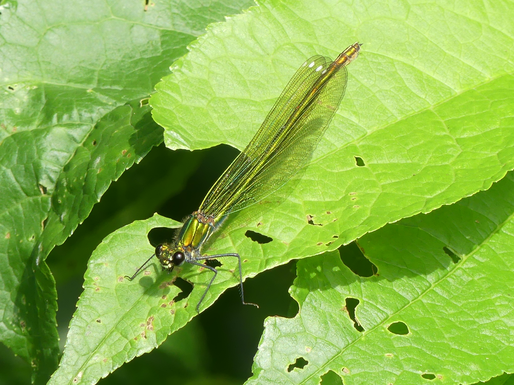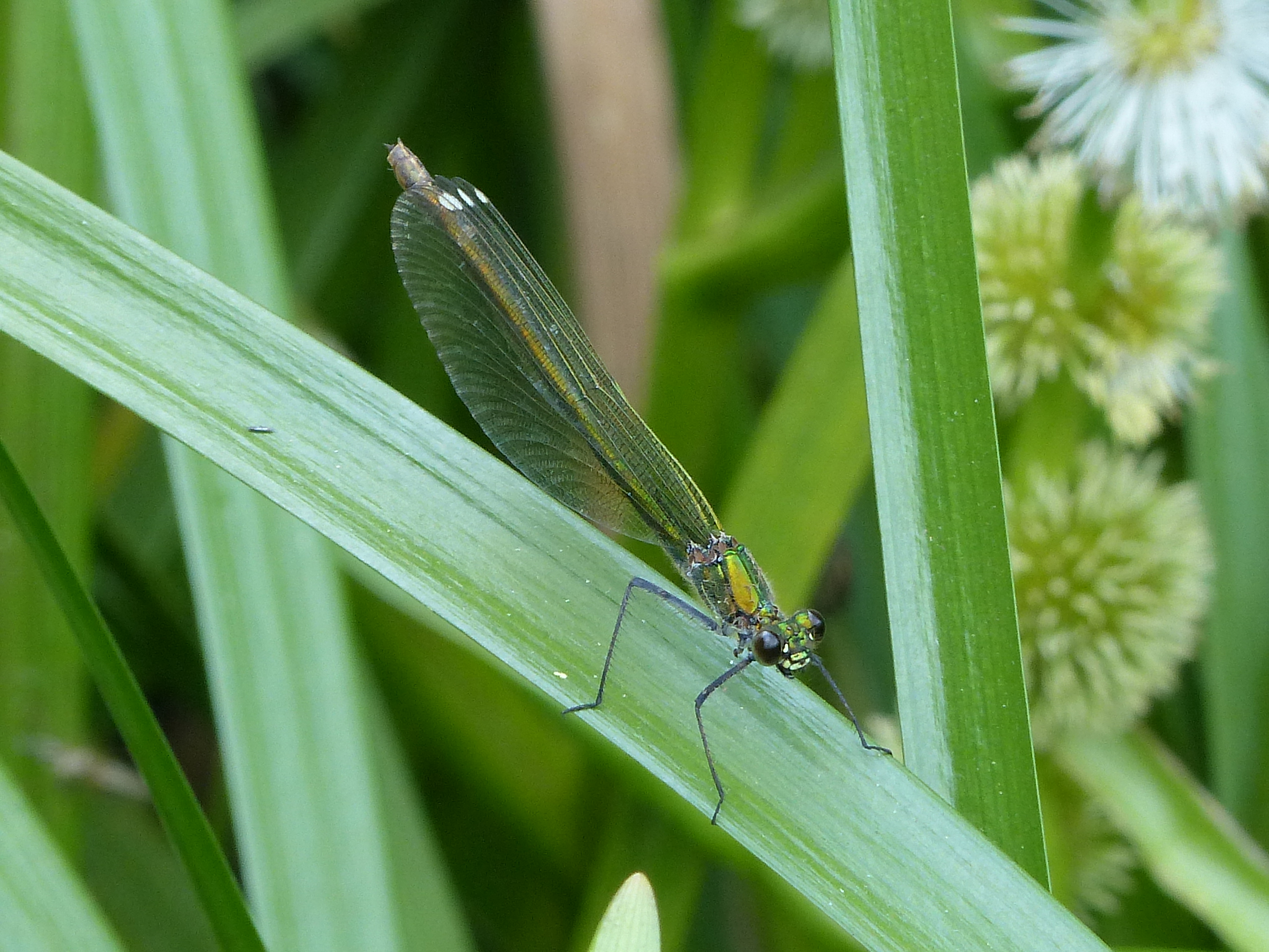 Gebänderte Prachtlibelle (Calopteryx splendens (Harris, 1782)), Weibchen, kenntlich an den grünlichen Flügeln und dem weißen Flügelmal. Neumühle Skassa bei Großenhain, Juni 2013.