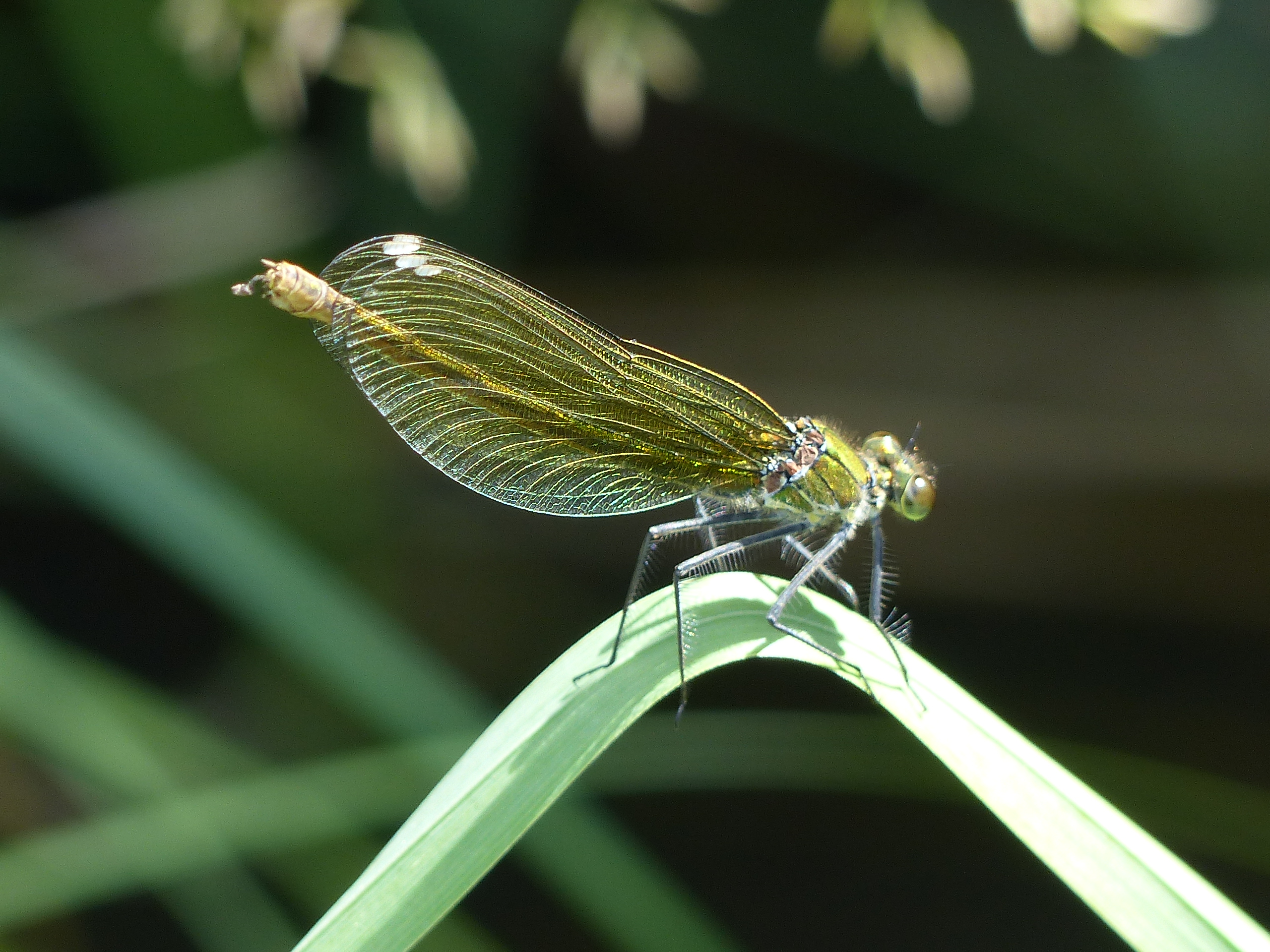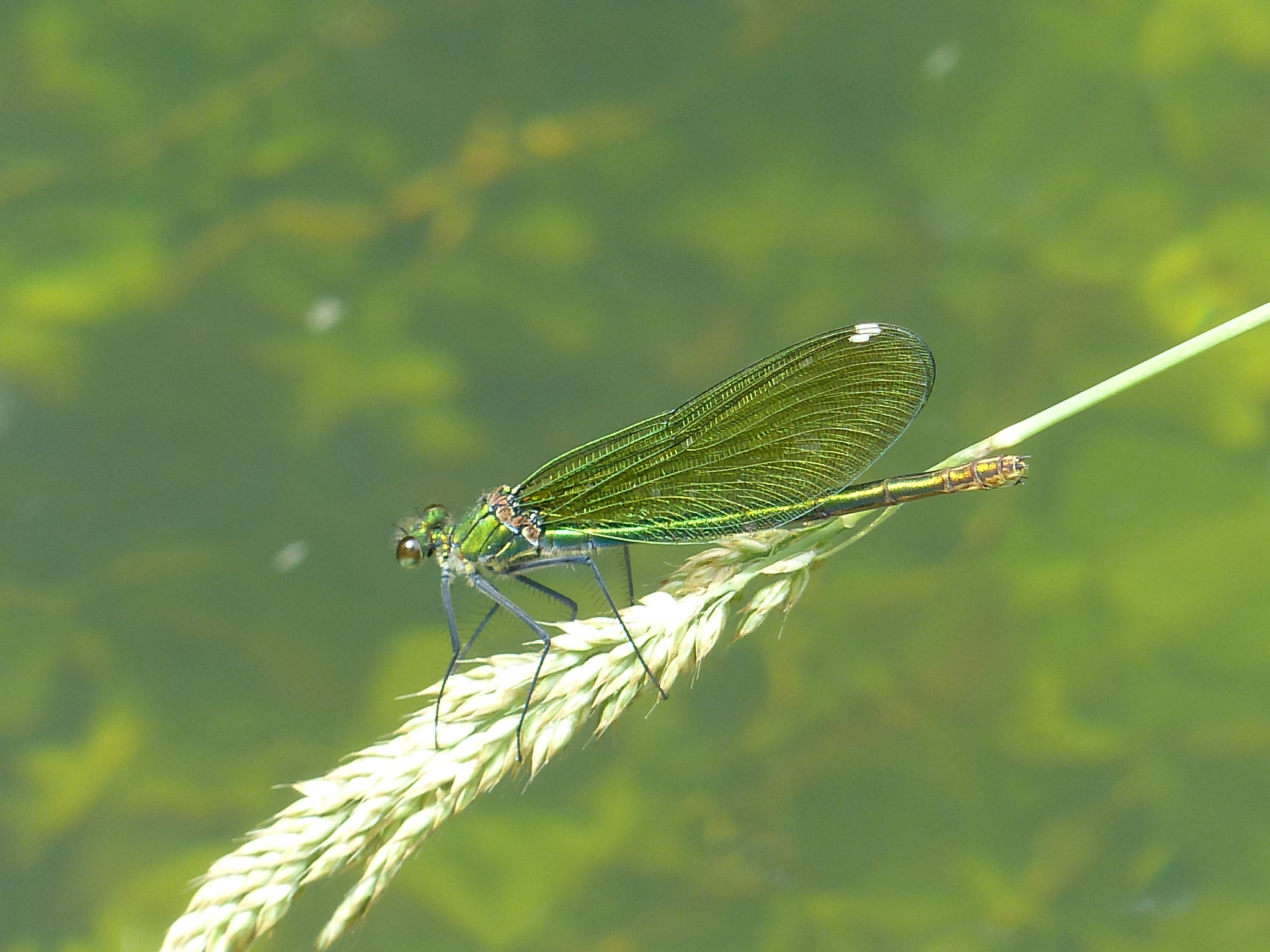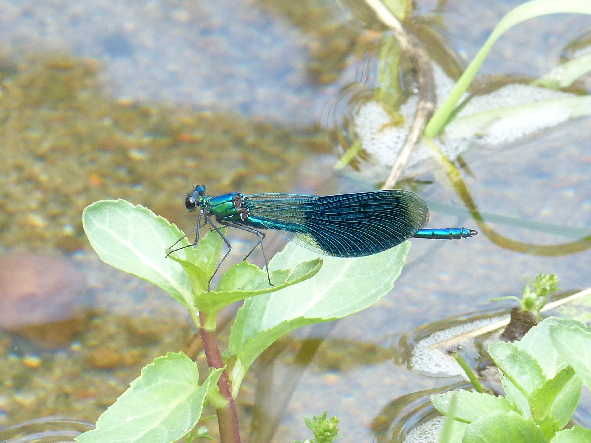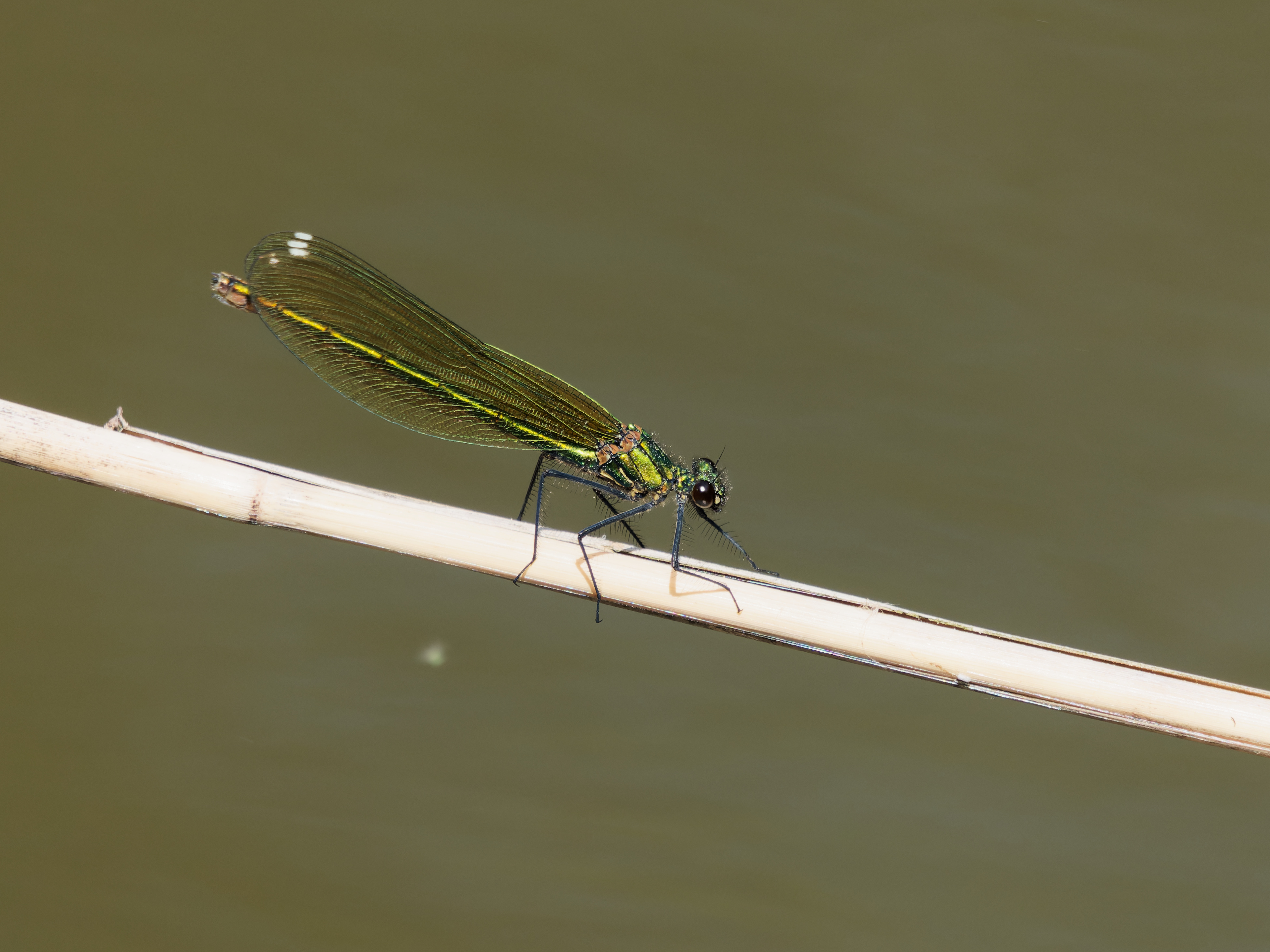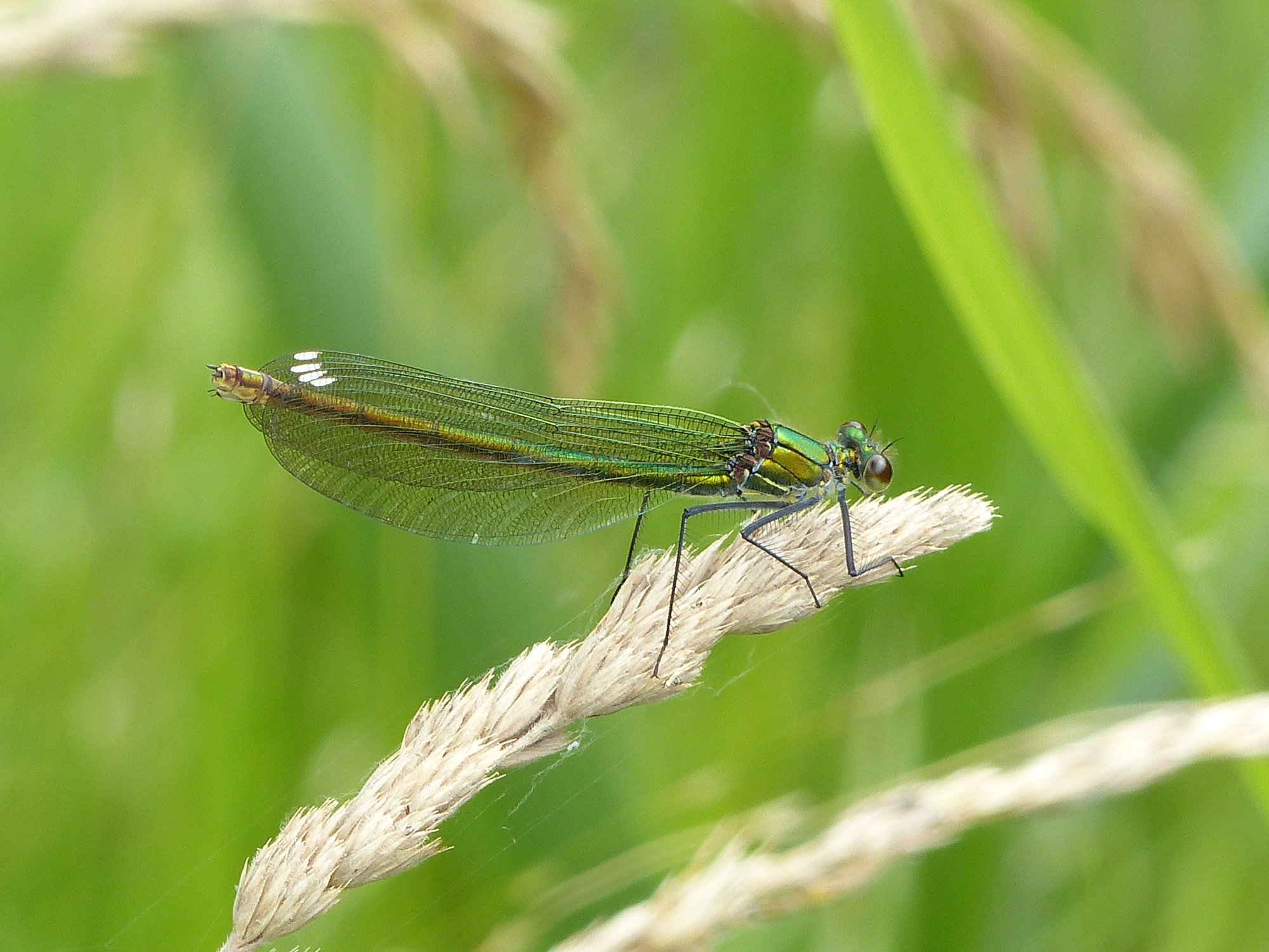 Gebänderte Prachtlibelle (Calopteryx splendens (Harris, 1782)), Weibchen, kenntlich an den grünlichen Flügeln und dem weißen Flügelmal. Neumühle Skassa bei Großenhain, Juni 2013.