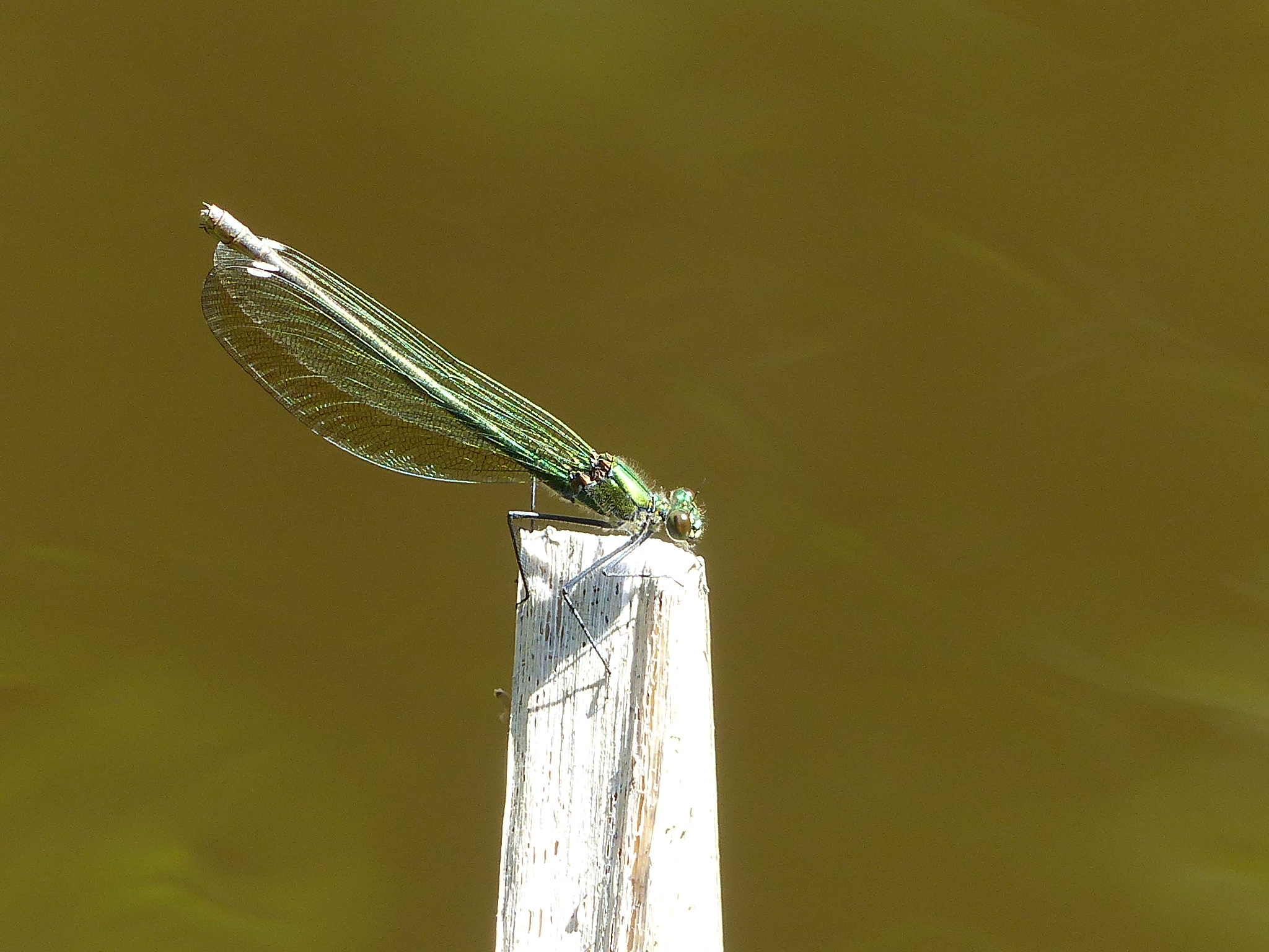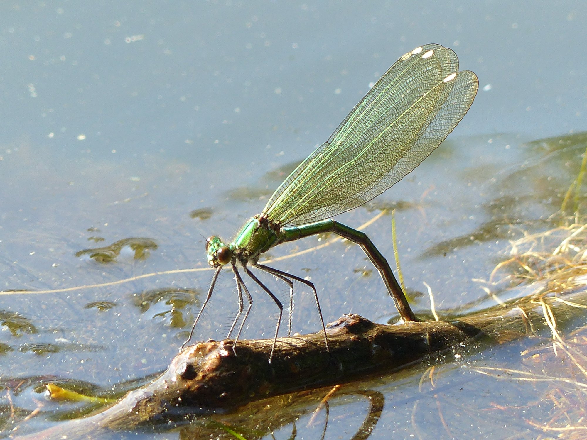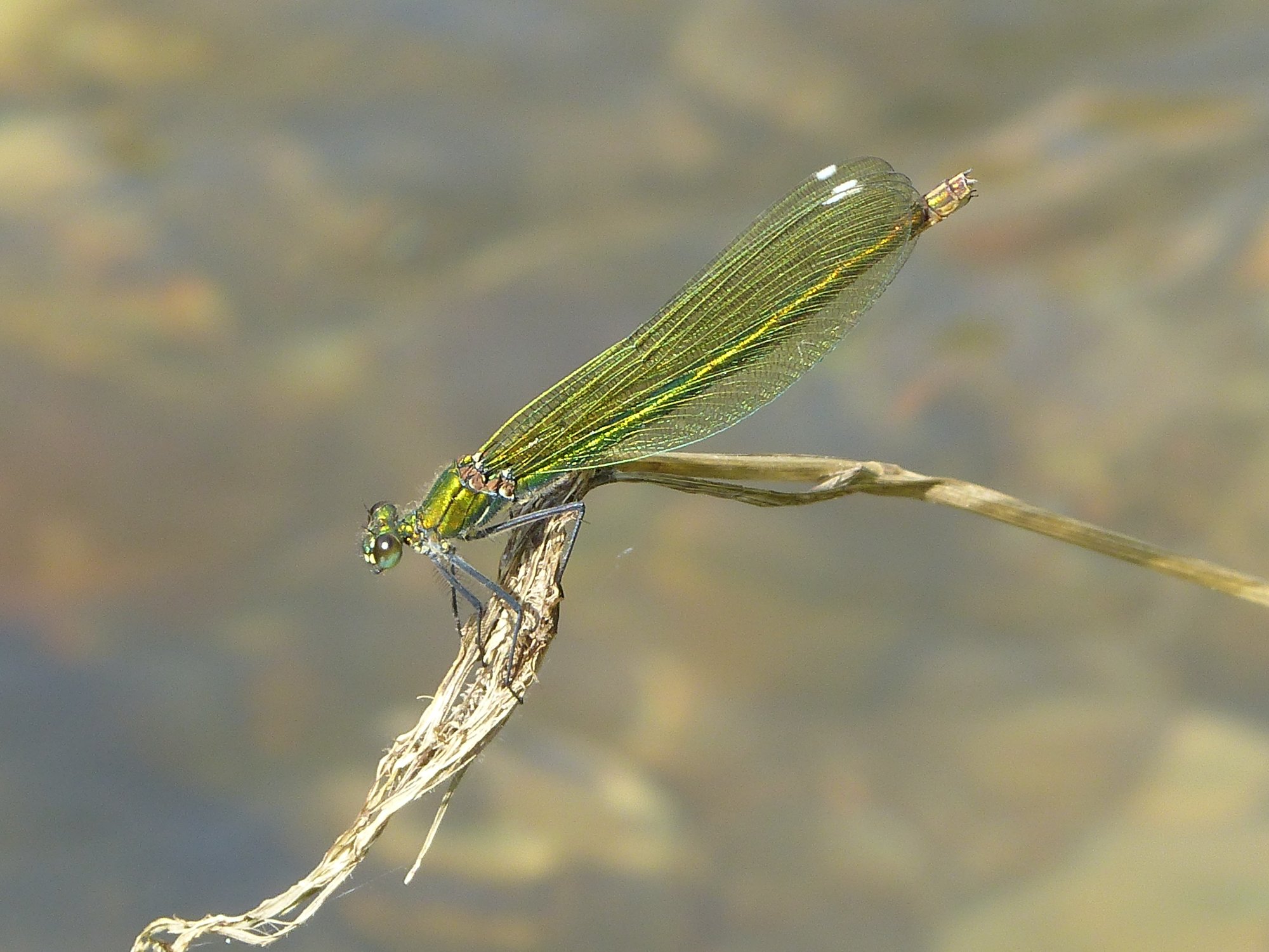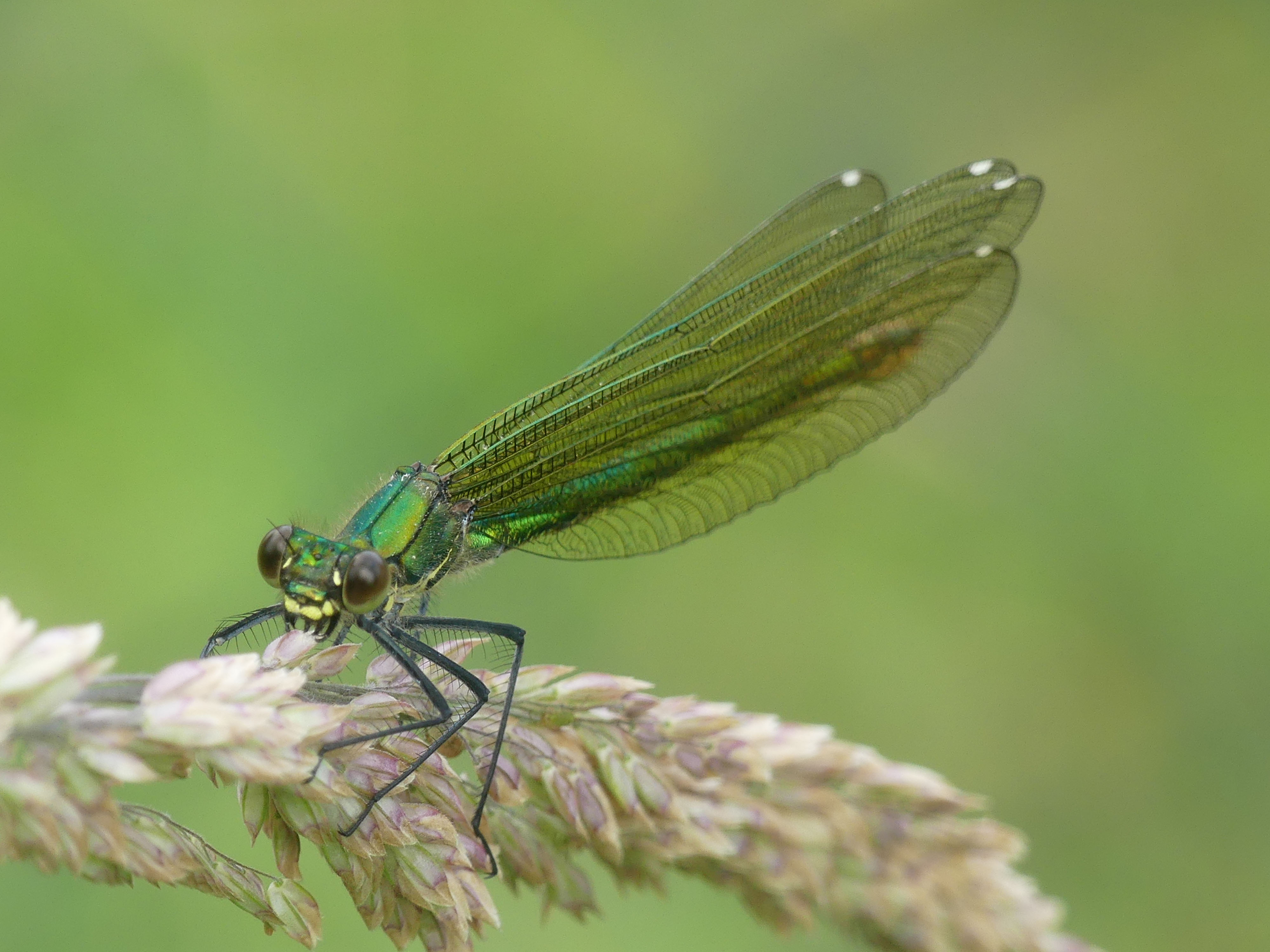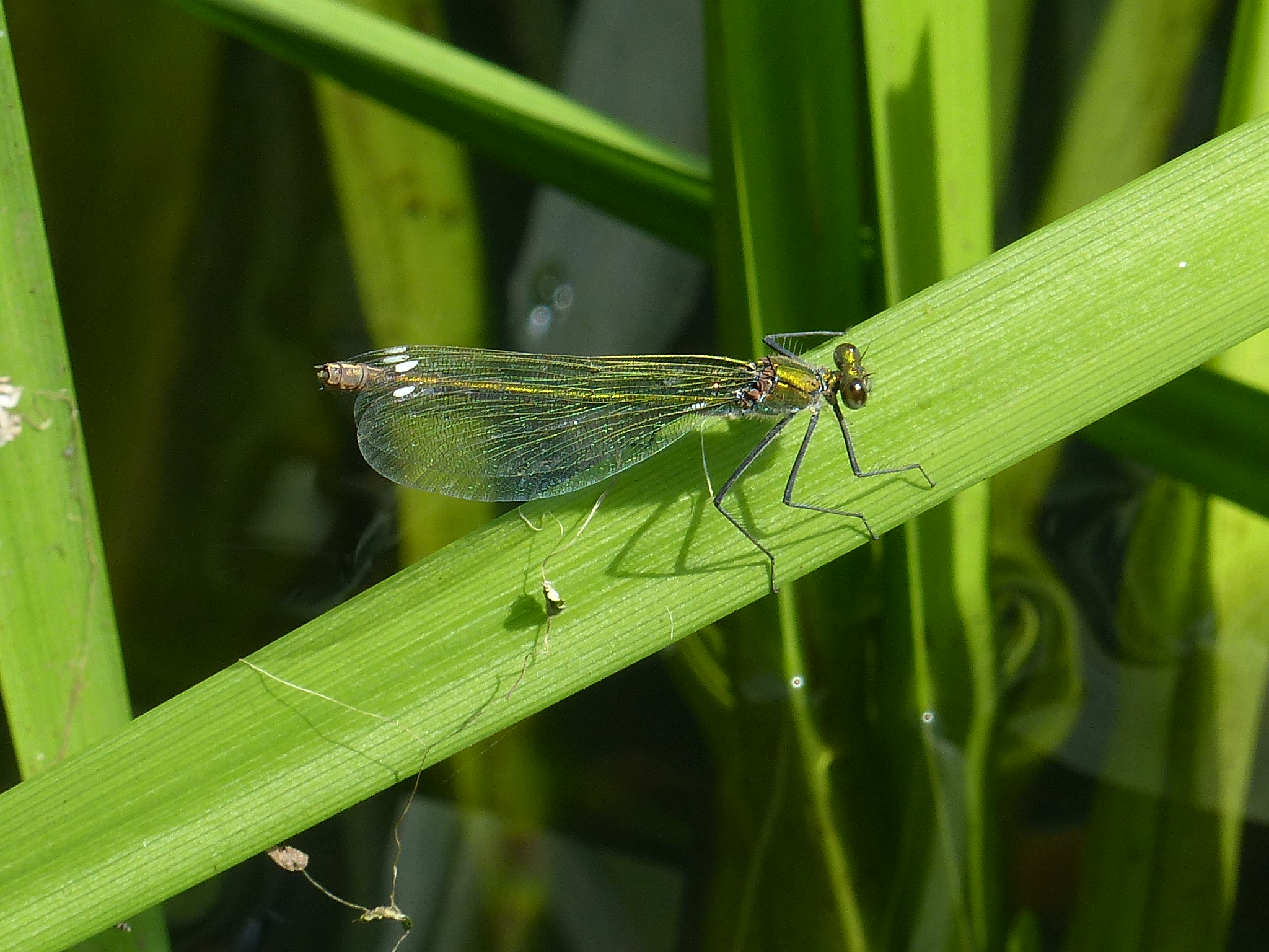 Gebänderte Prachtlibelle (Calopteryx splendens (Harris, 1782)), Weibchen, kenntlich an den grünlichen Flügeln und dem weißen Flügelmal. Neumühle Skassa bei Großenhain, Juni 2013.