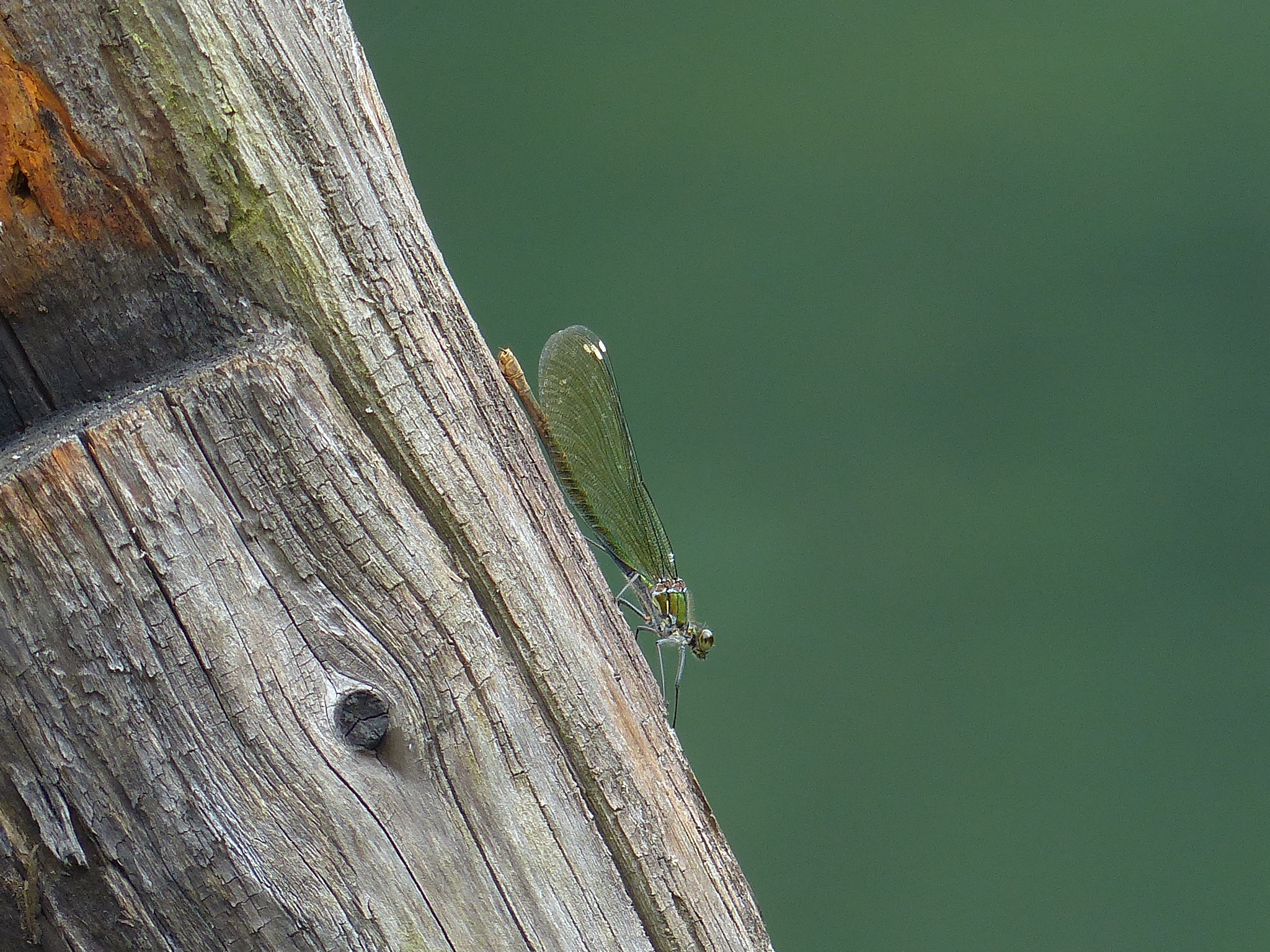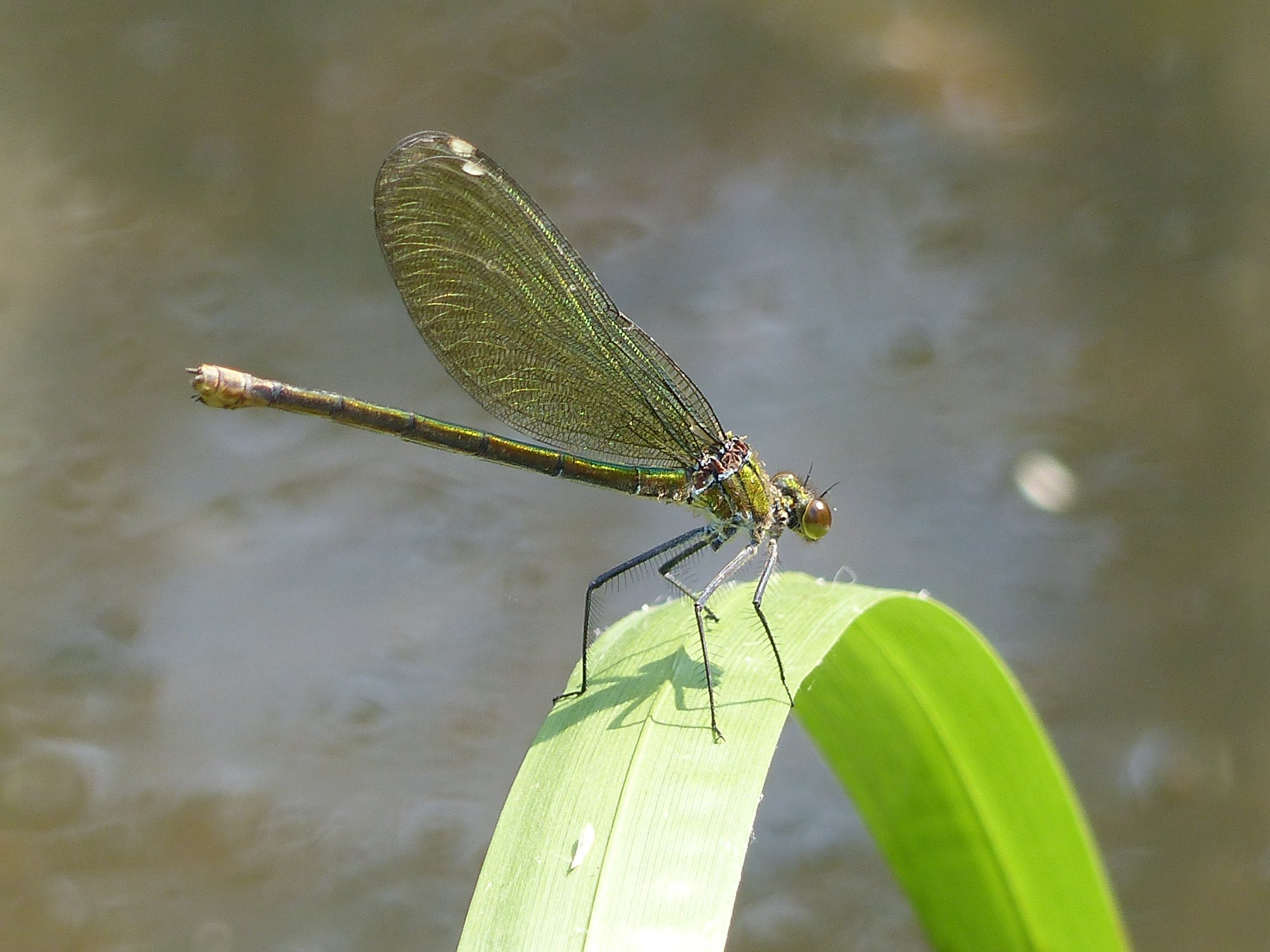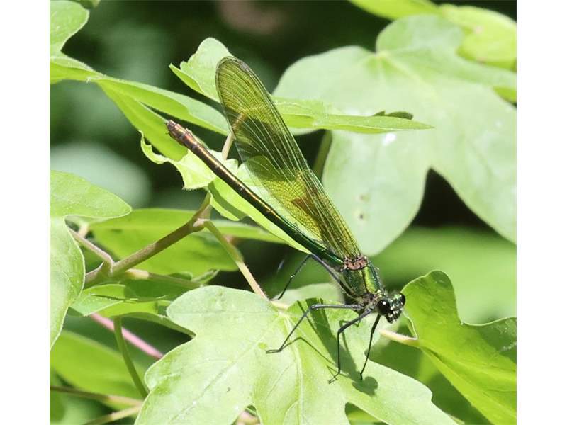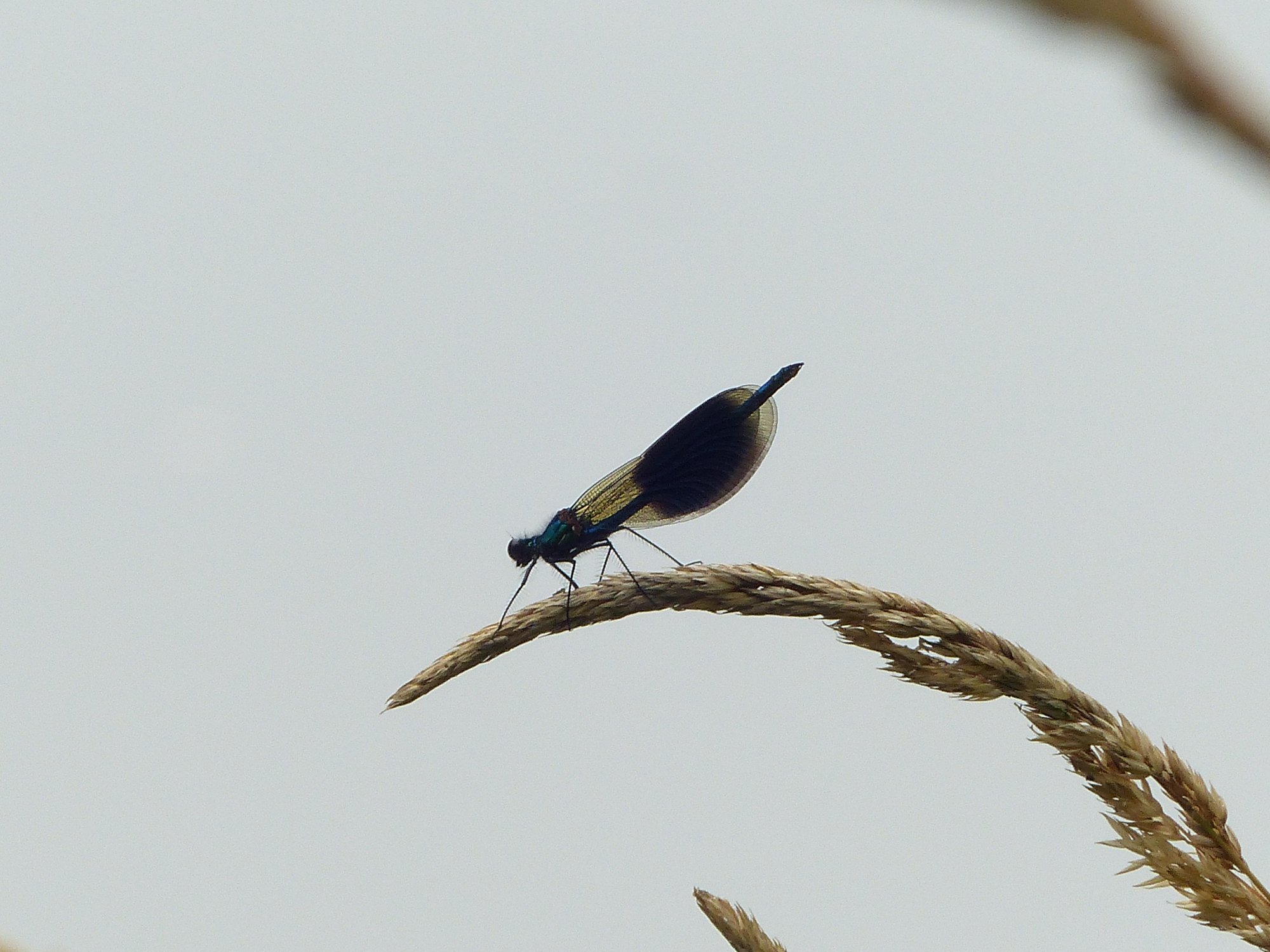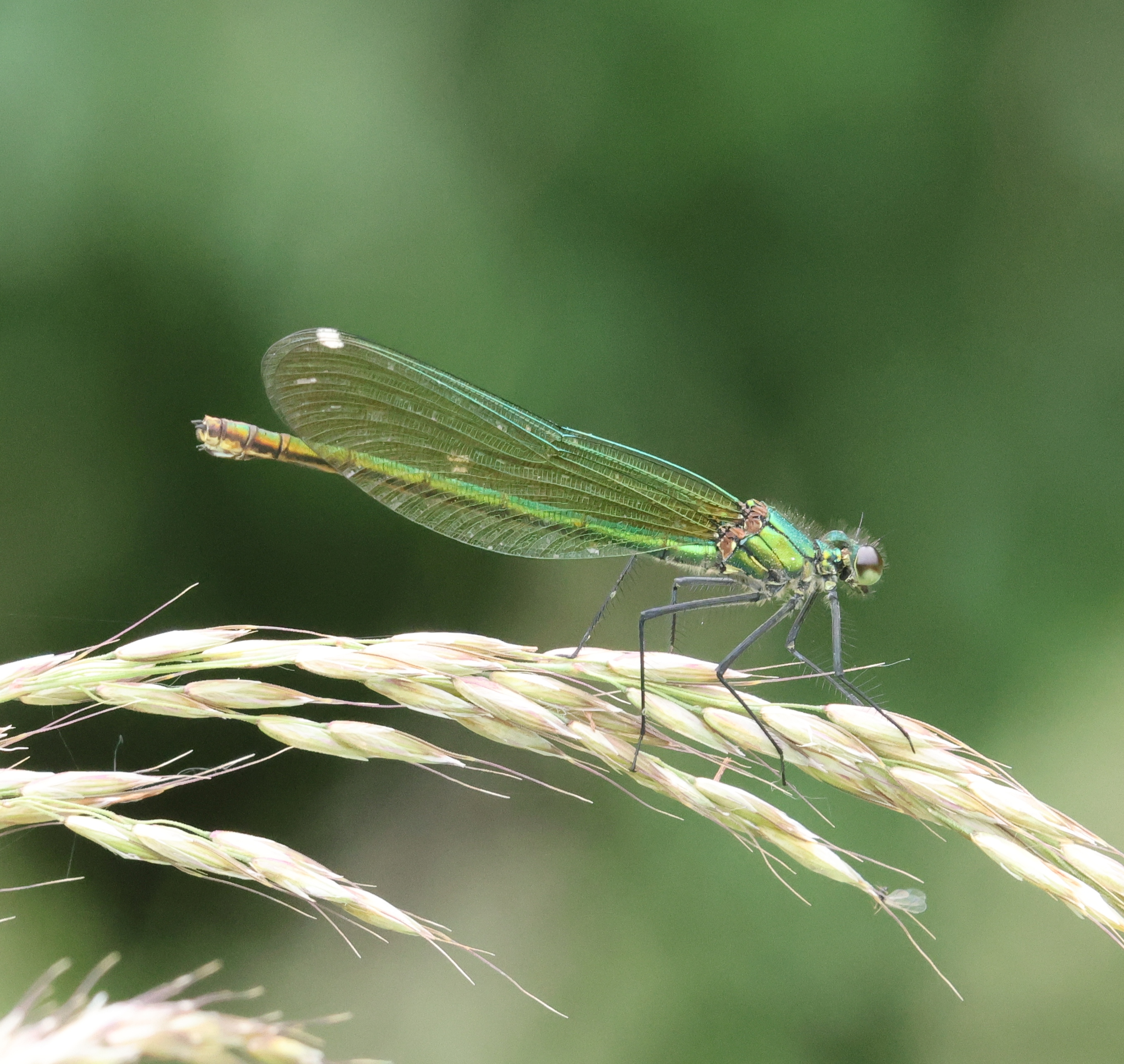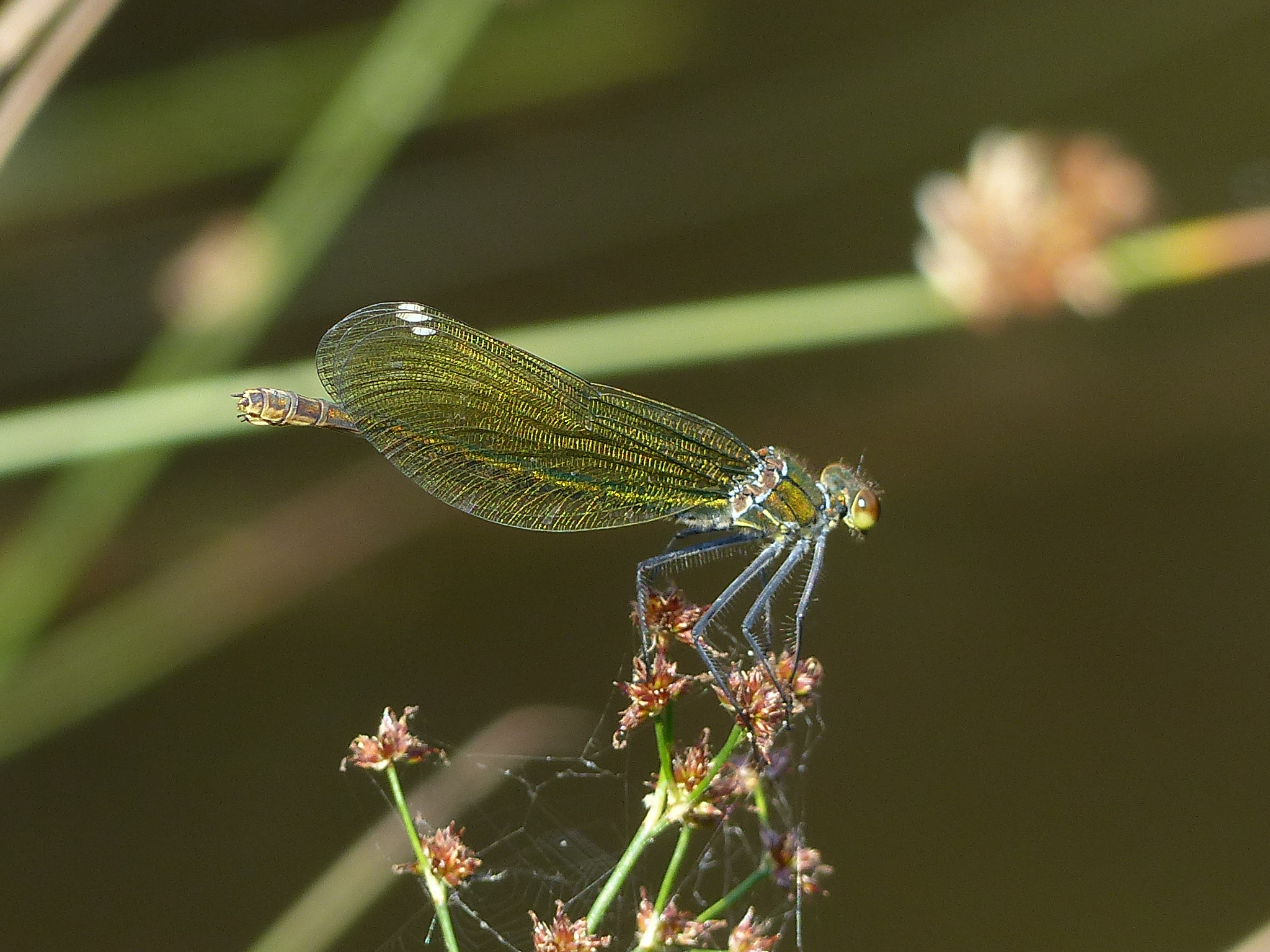 Gebänderte Prachtlibelle (Calopteryx splendens (Harris, 1782)), Weibchen, kenntlich an den grünlichen Flügeln und dem weißen Flügelmal. Neumühle Skassa bei Großenhain, Juni 2013.