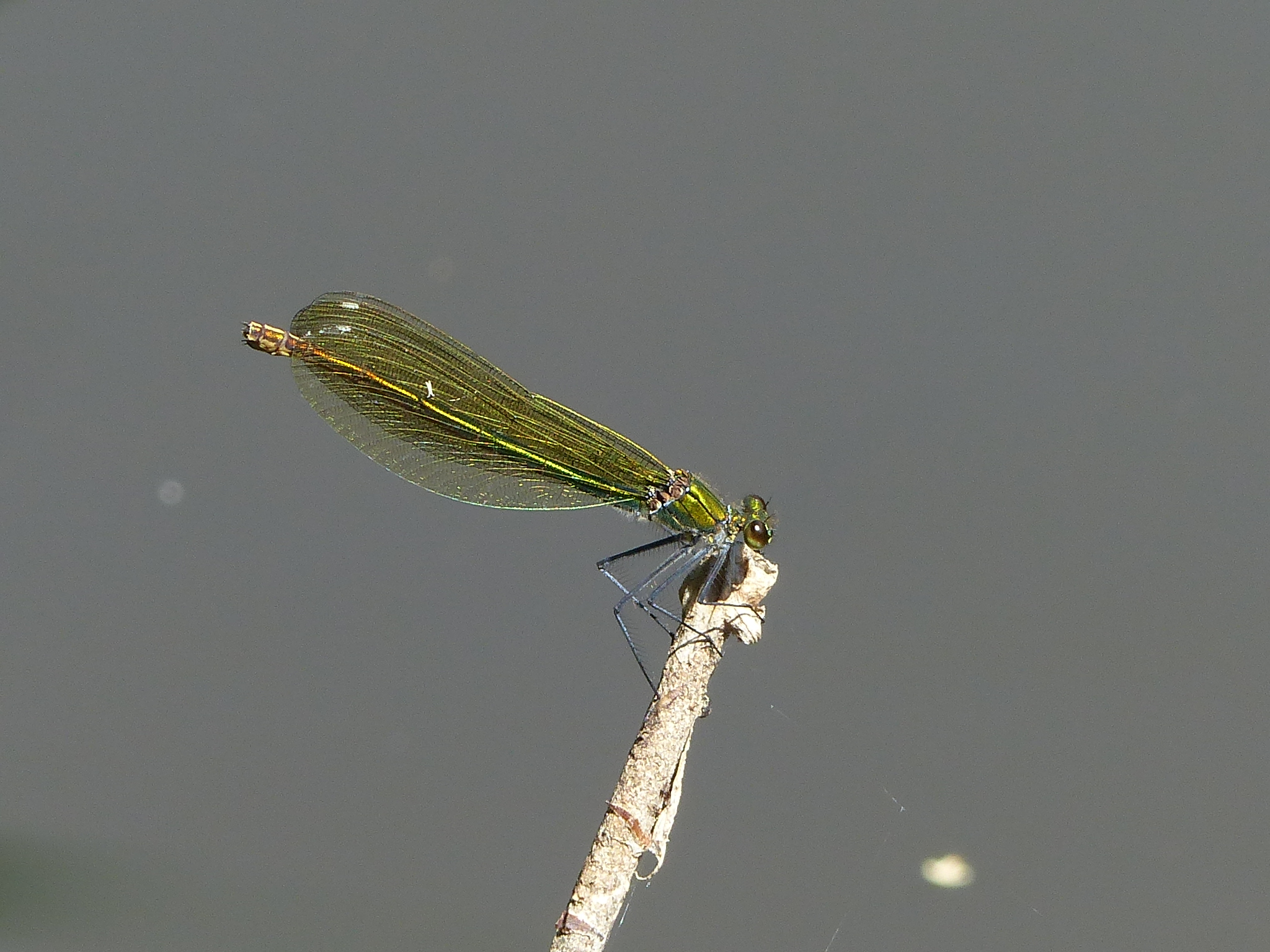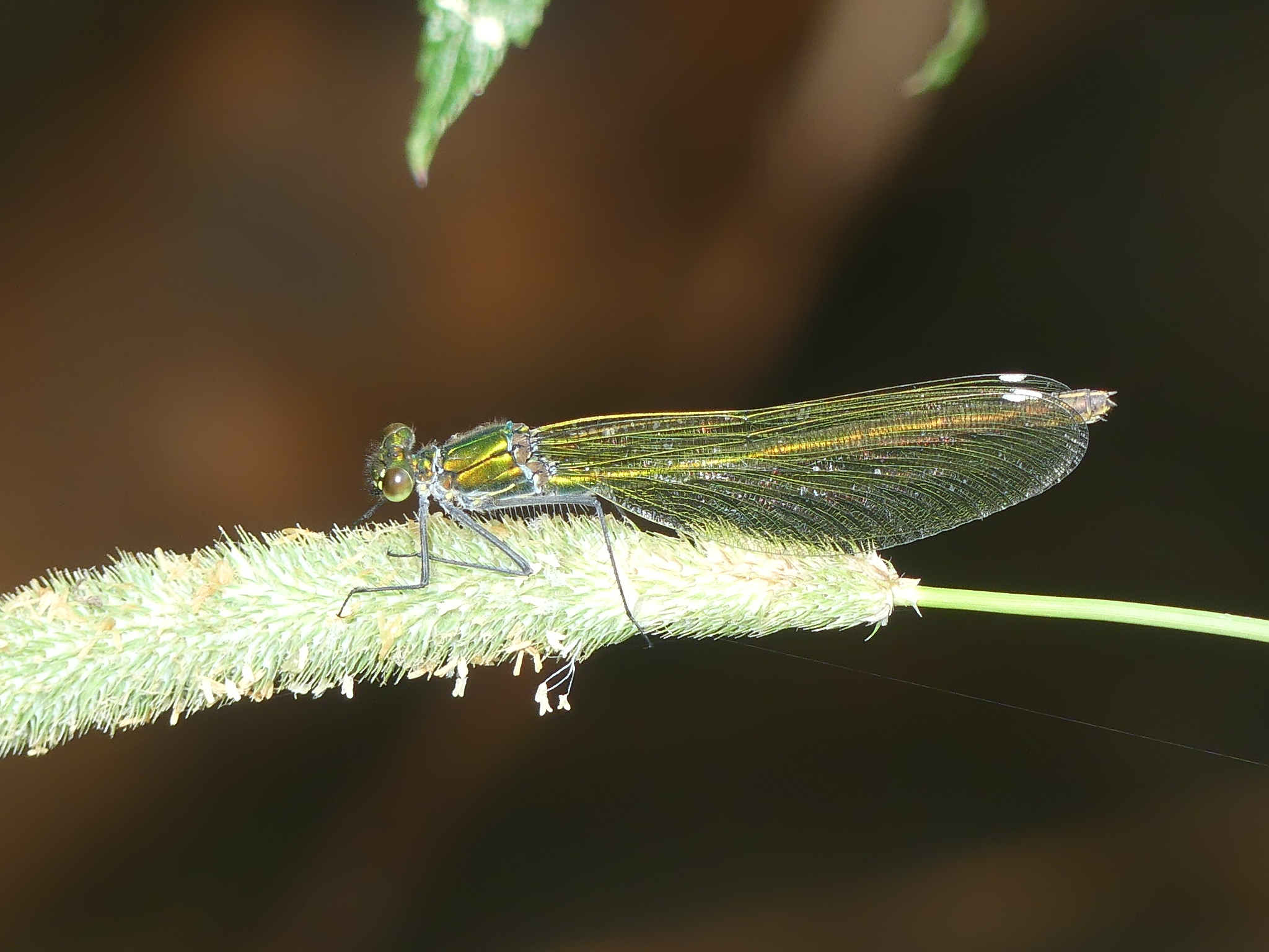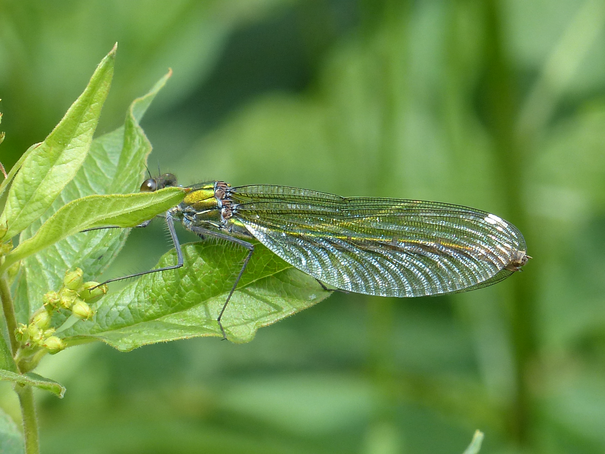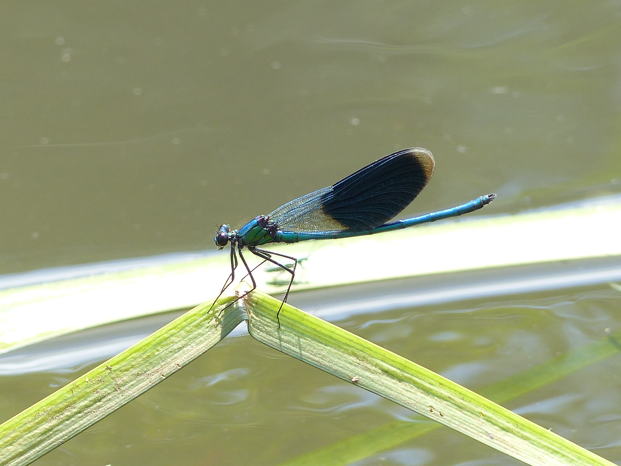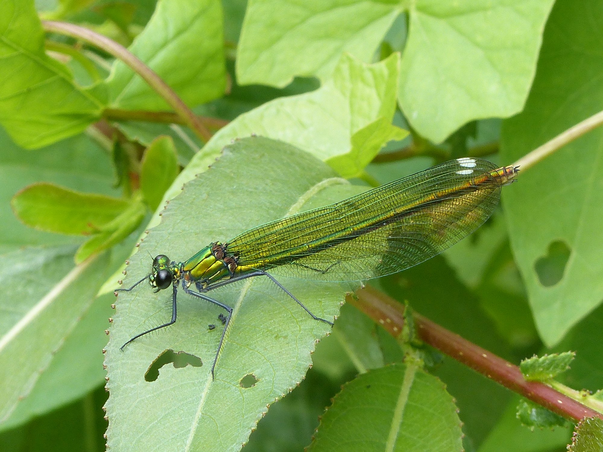 Gebänderte Prachtlibelle (Calopteryx splendens (Harris, 1782)), Weibchen, kenntlich an den grünlichen Flügeln und dem weißen Flügelmal. Neumühle Skassa bei Großenhain, Juni 2013.