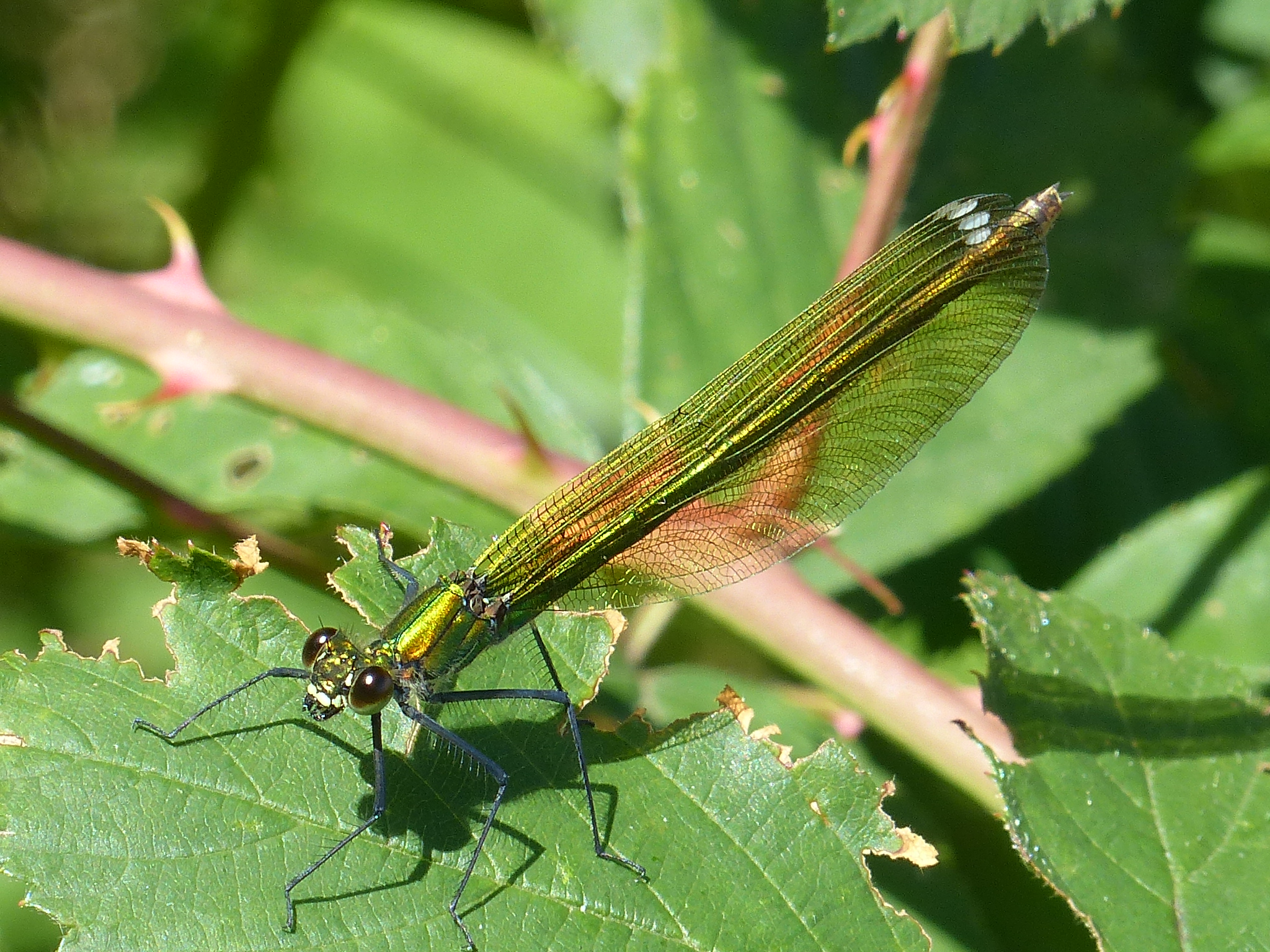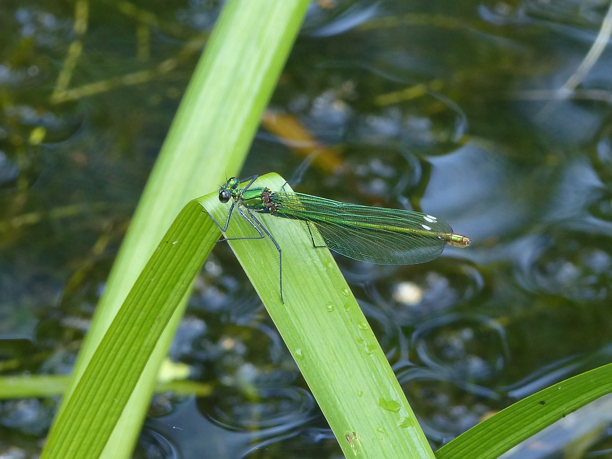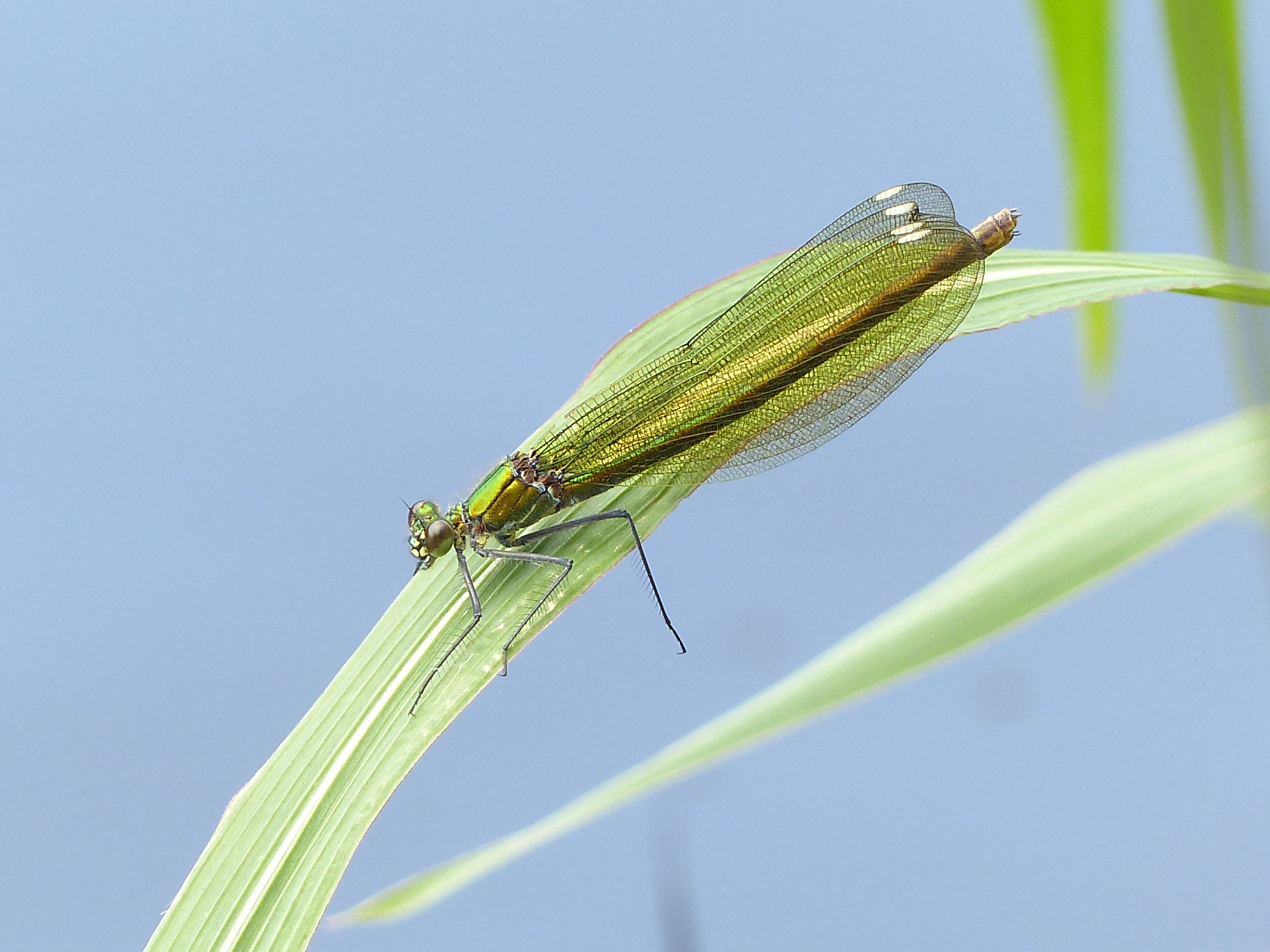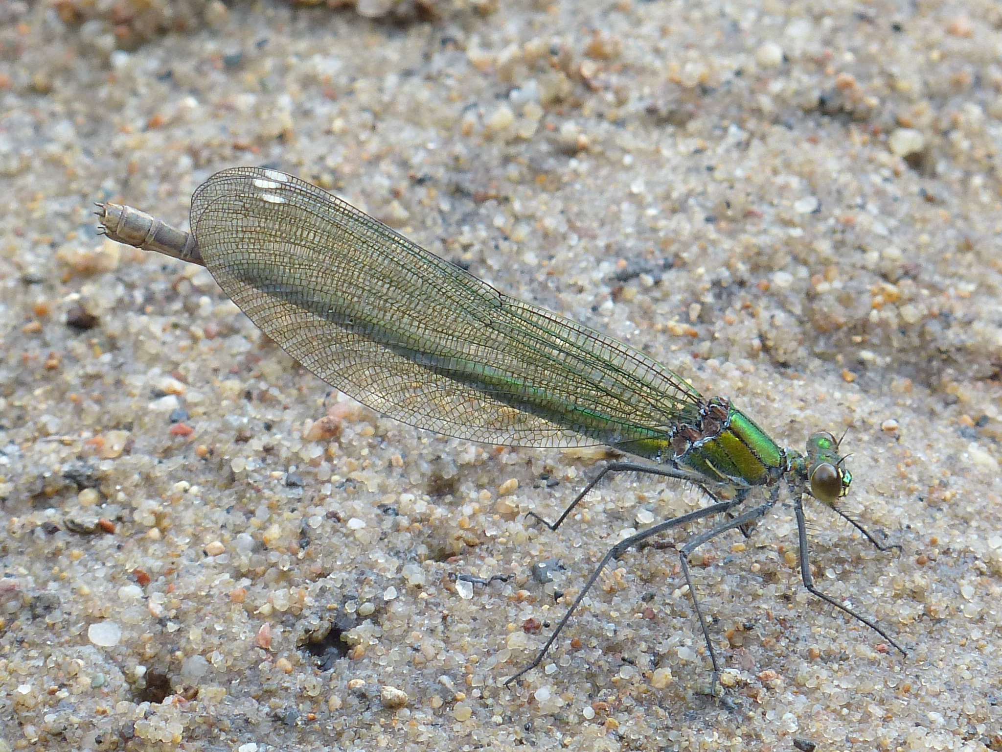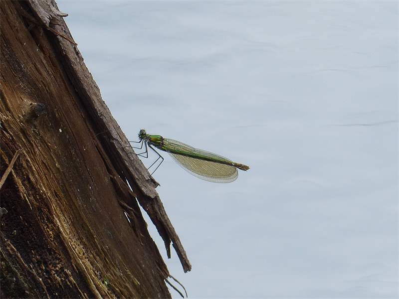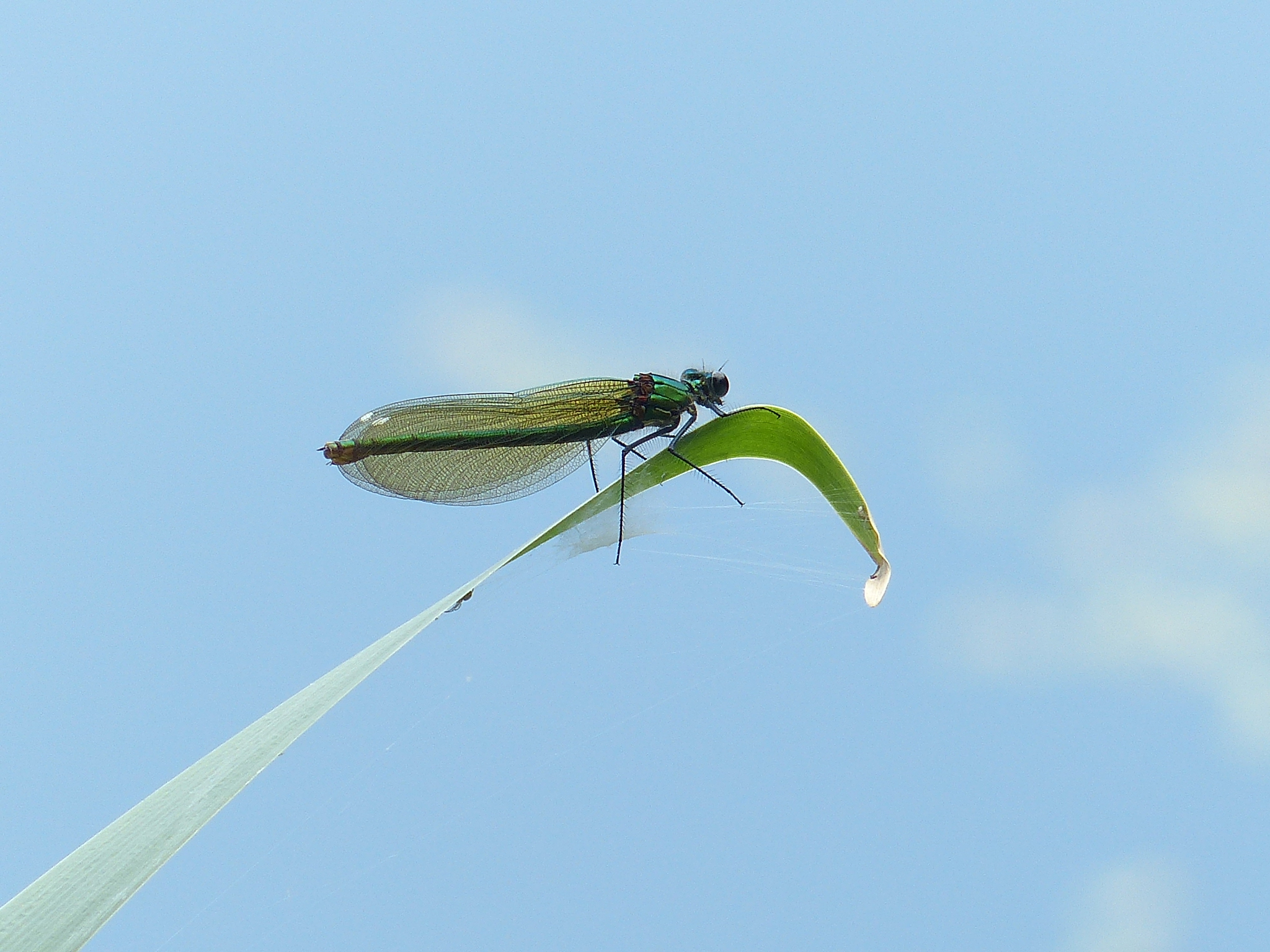 Gebänderte Prachtlibelle (Calopteryx splendens (Harris, 1782)), Weibchen, kenntlich an den grünlichen Flügeln und dem weißen Flügelmal. Neumühle Skassa bei Großenhain, Juni 2013.