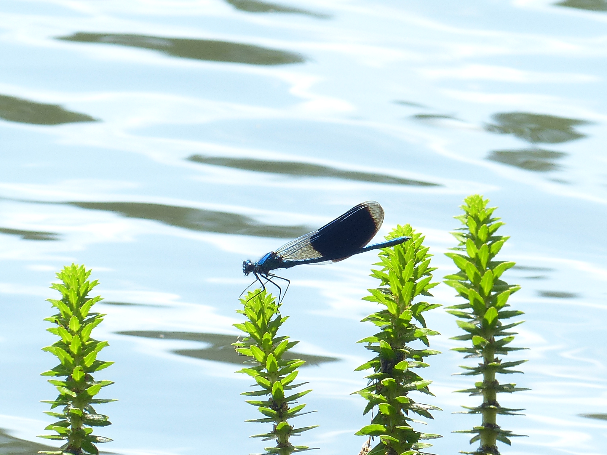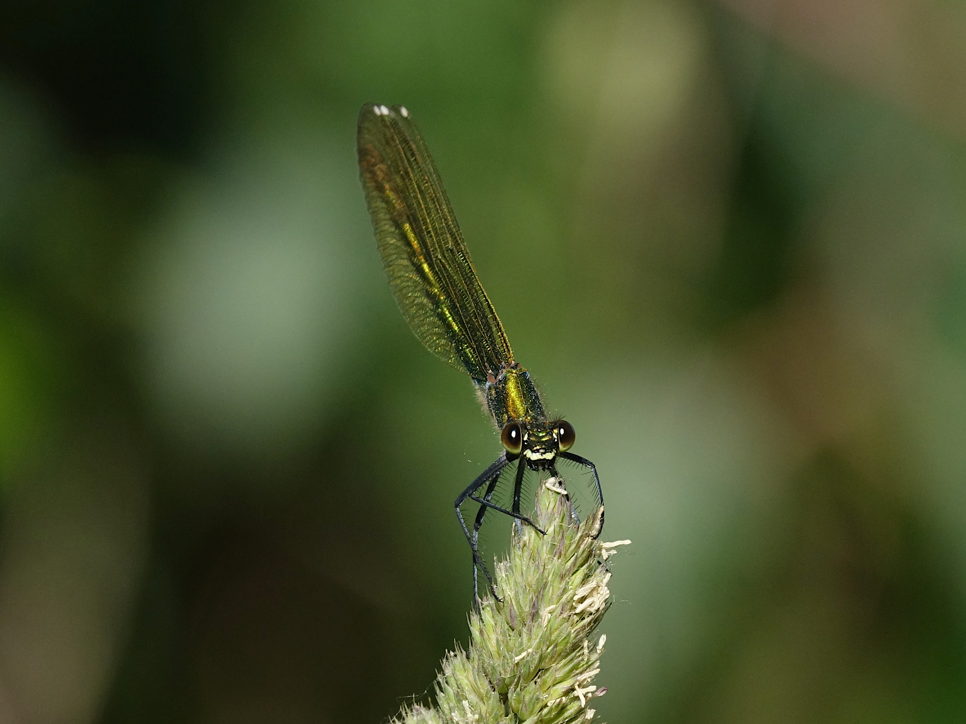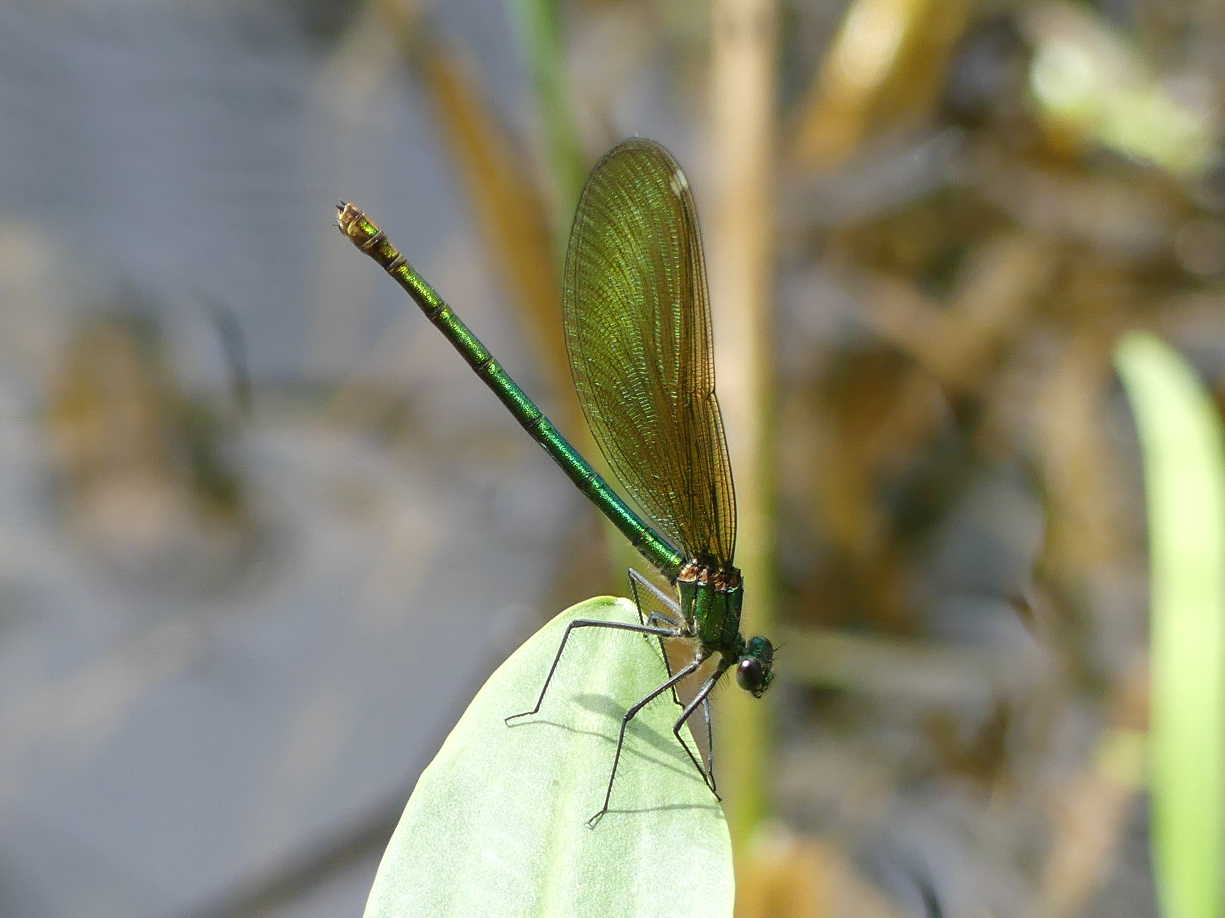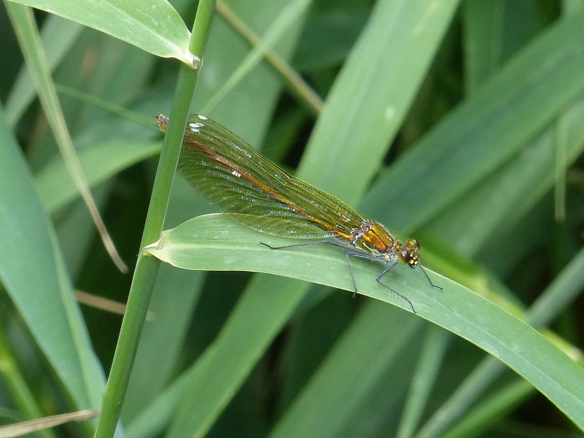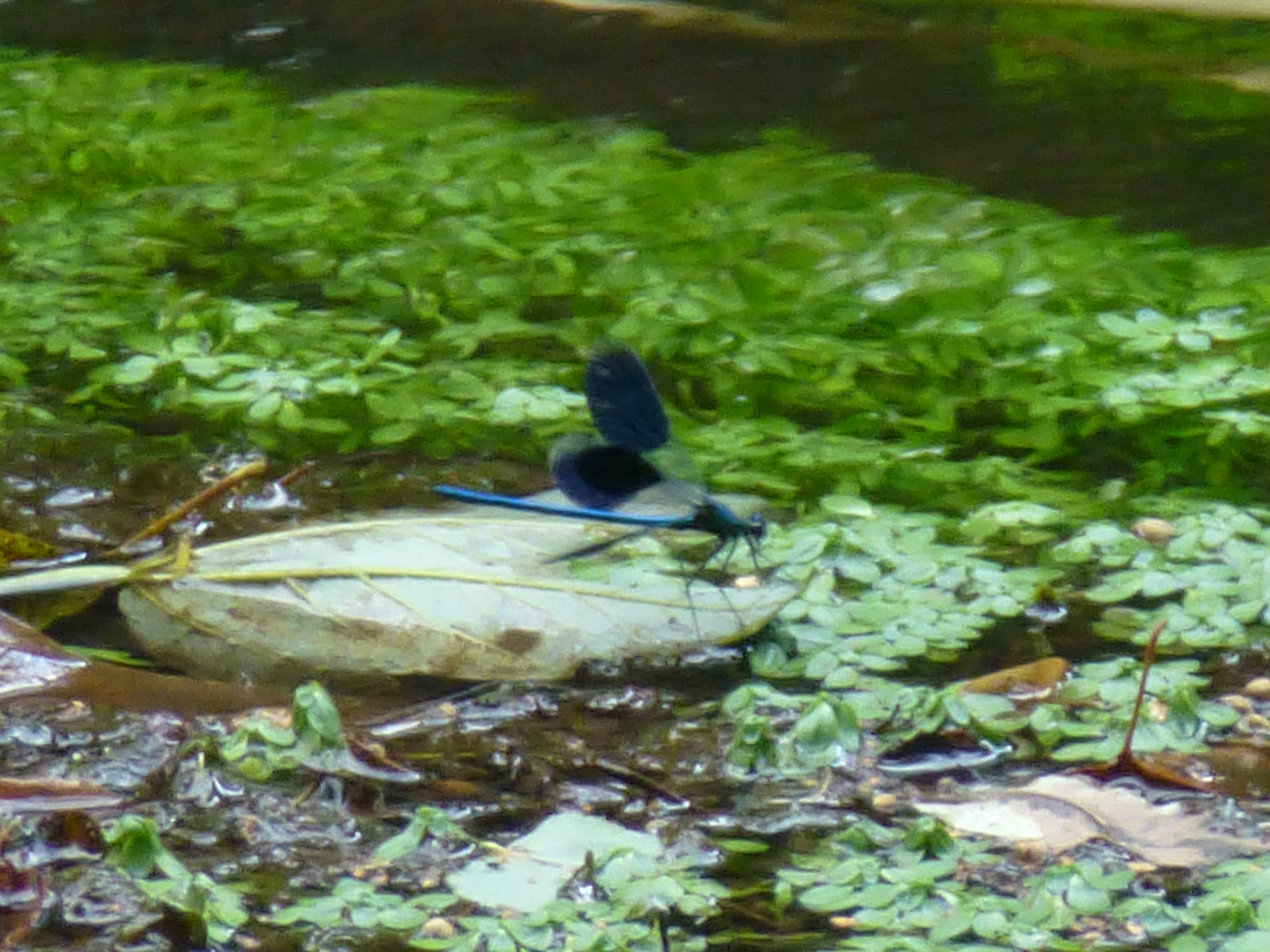 Gebänderte Prachtlibelle (Calopteryx splendens (Harris, 1782)), Weibchen, kenntlich an den grünlichen Flügeln und dem weißen Flügelmal. Neumühle Skassa bei Großenhain, Juni 2013.