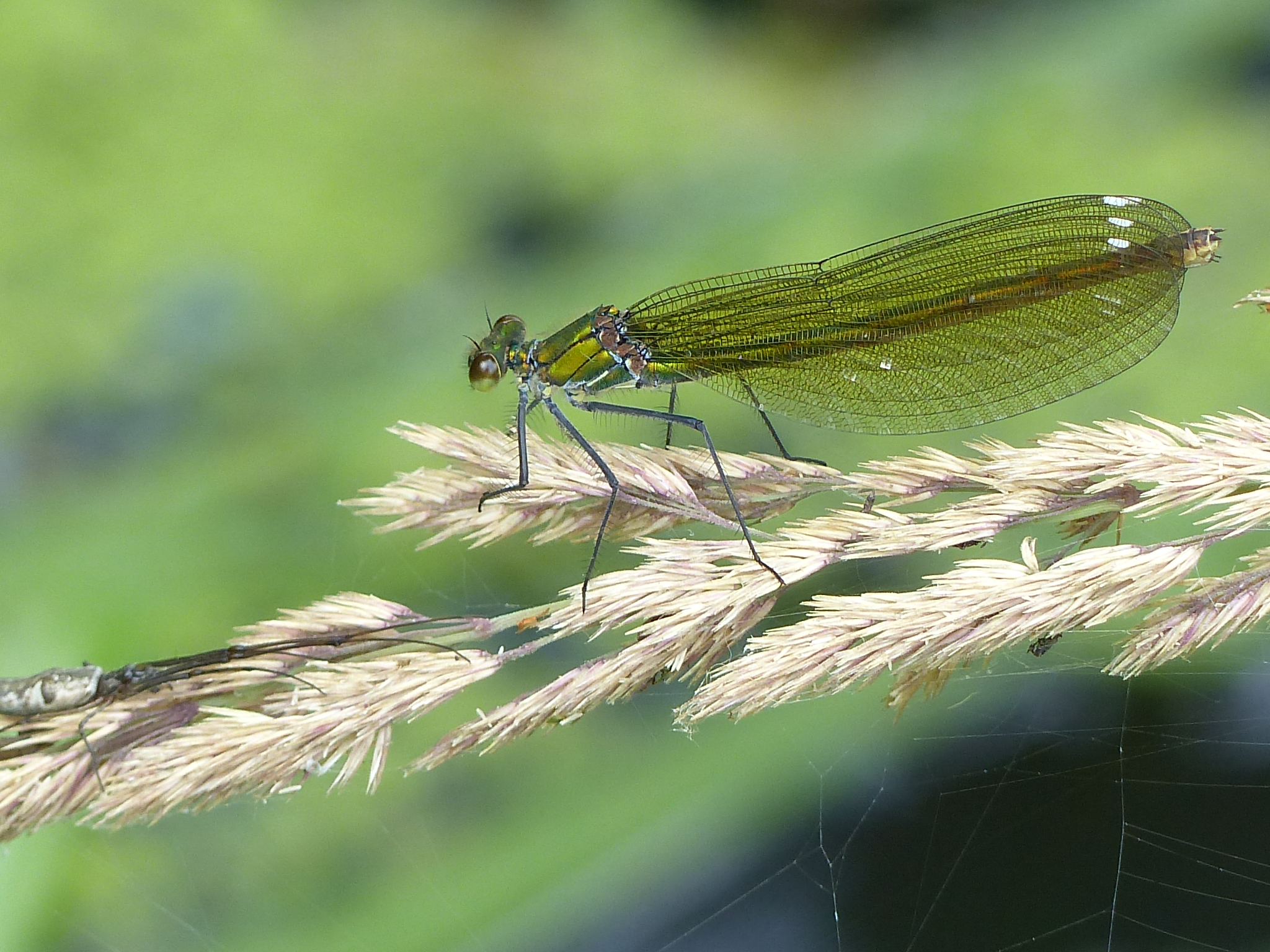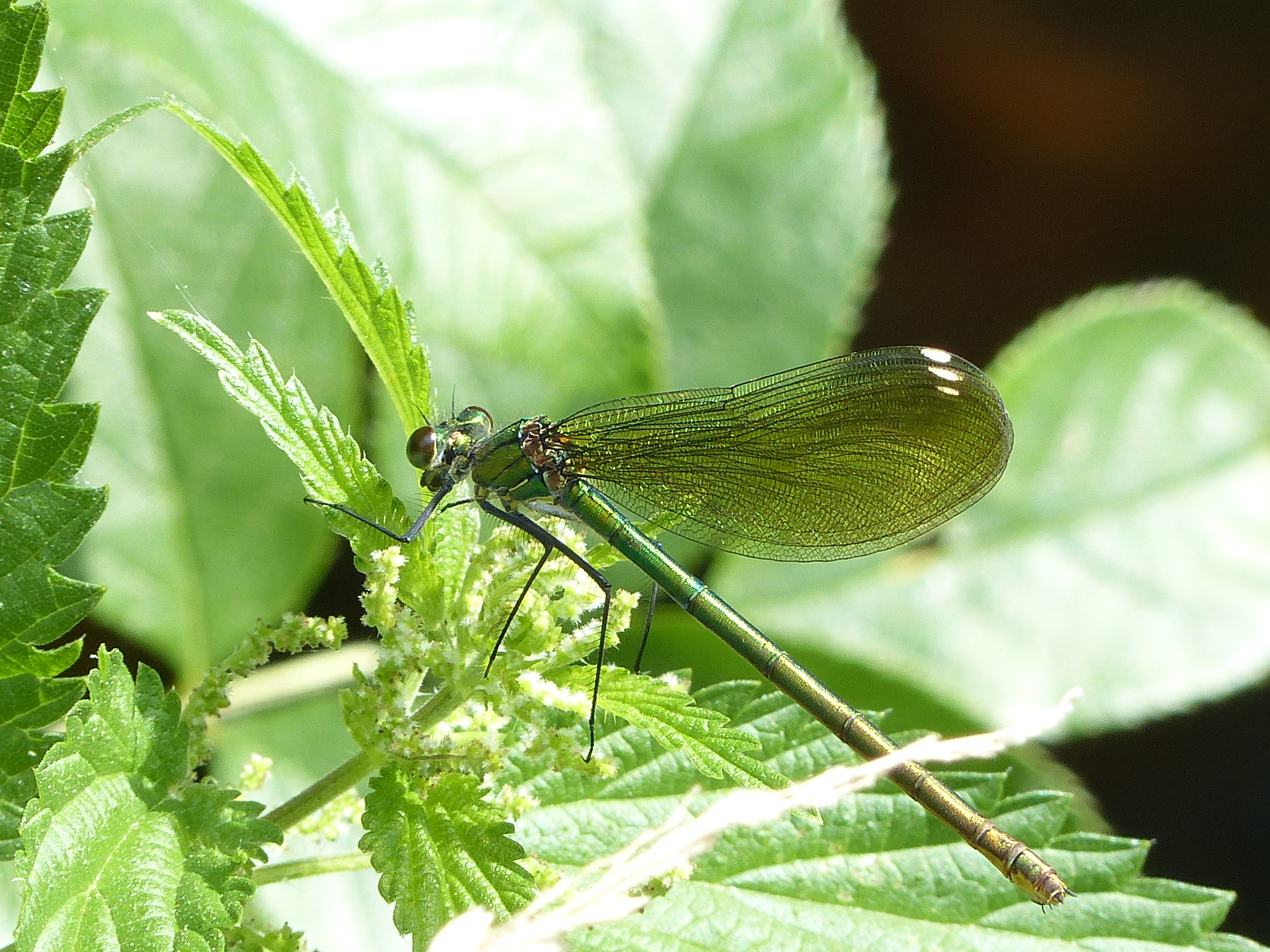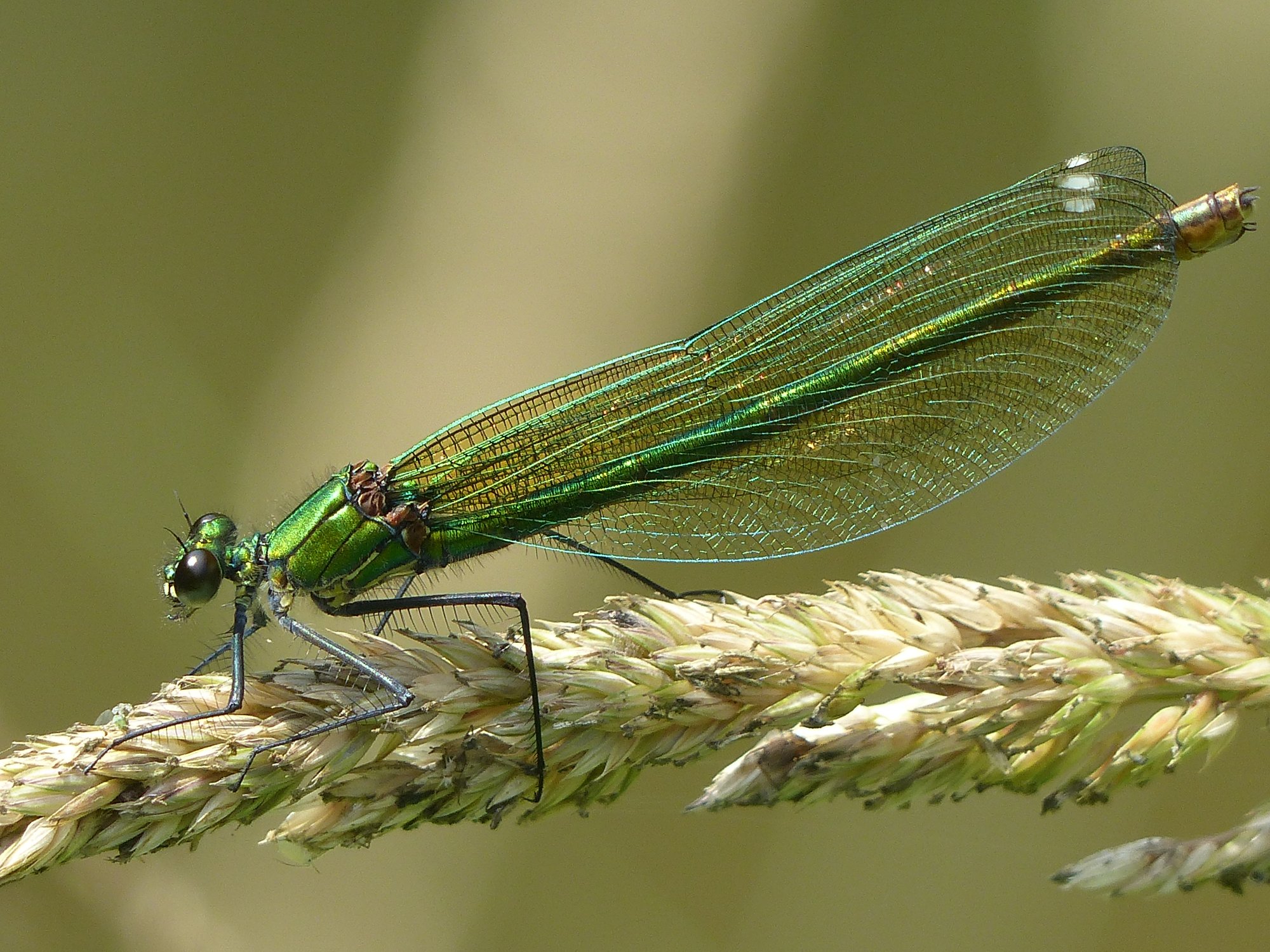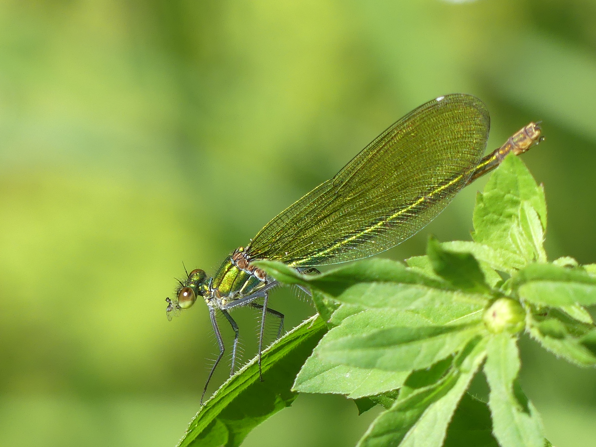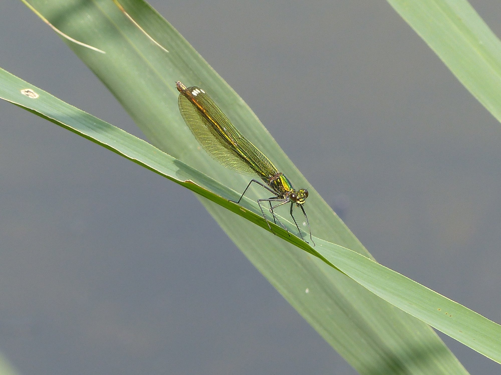 Gebänderte Prachtlibelle (Calopteryx splendens (Harris, 1782)), Weibchen, kenntlich an den grünlichen Flügeln und dem weißen Flügelmal. Neumühle Skassa bei Großenhain, Juni 2013.