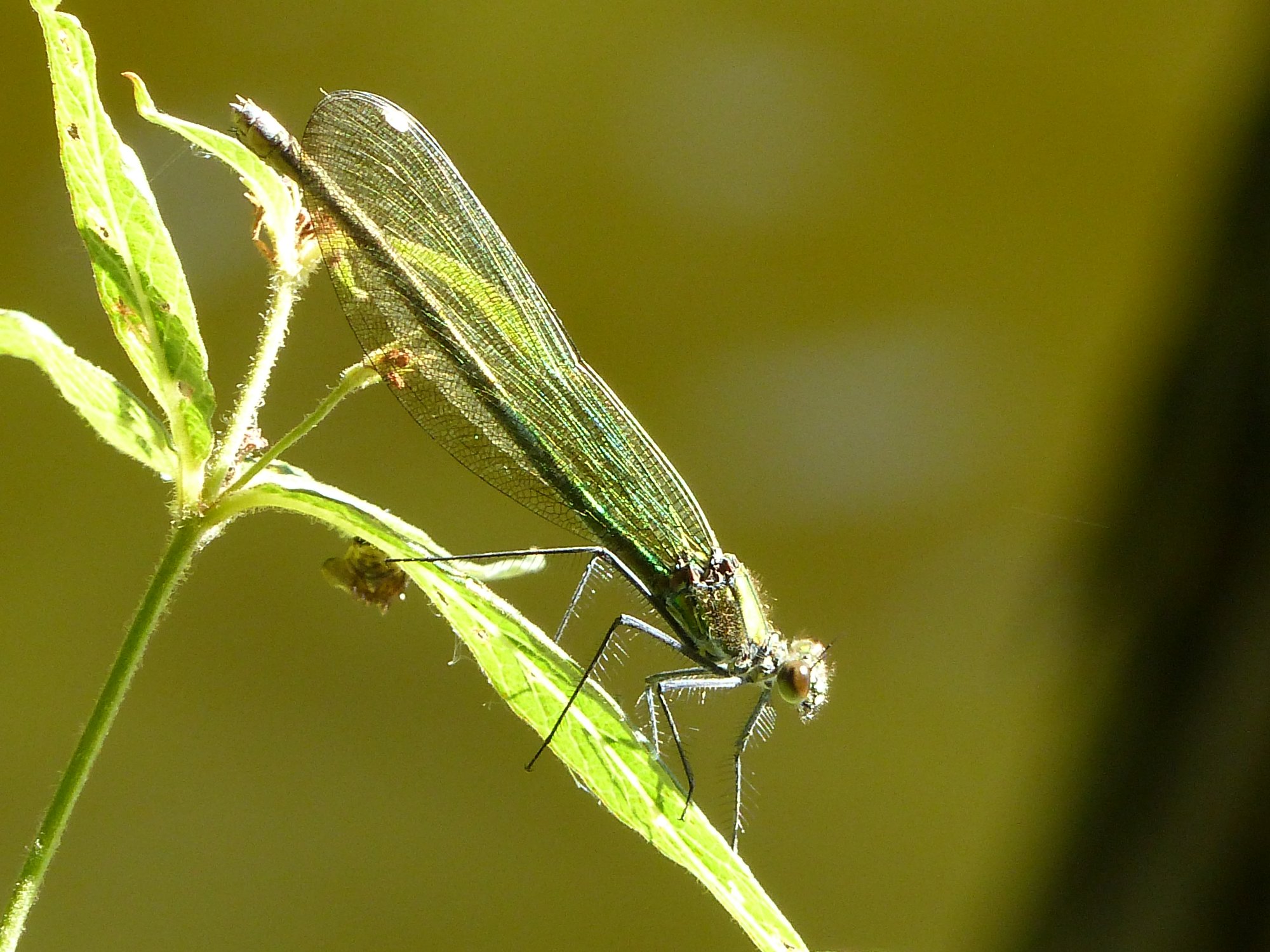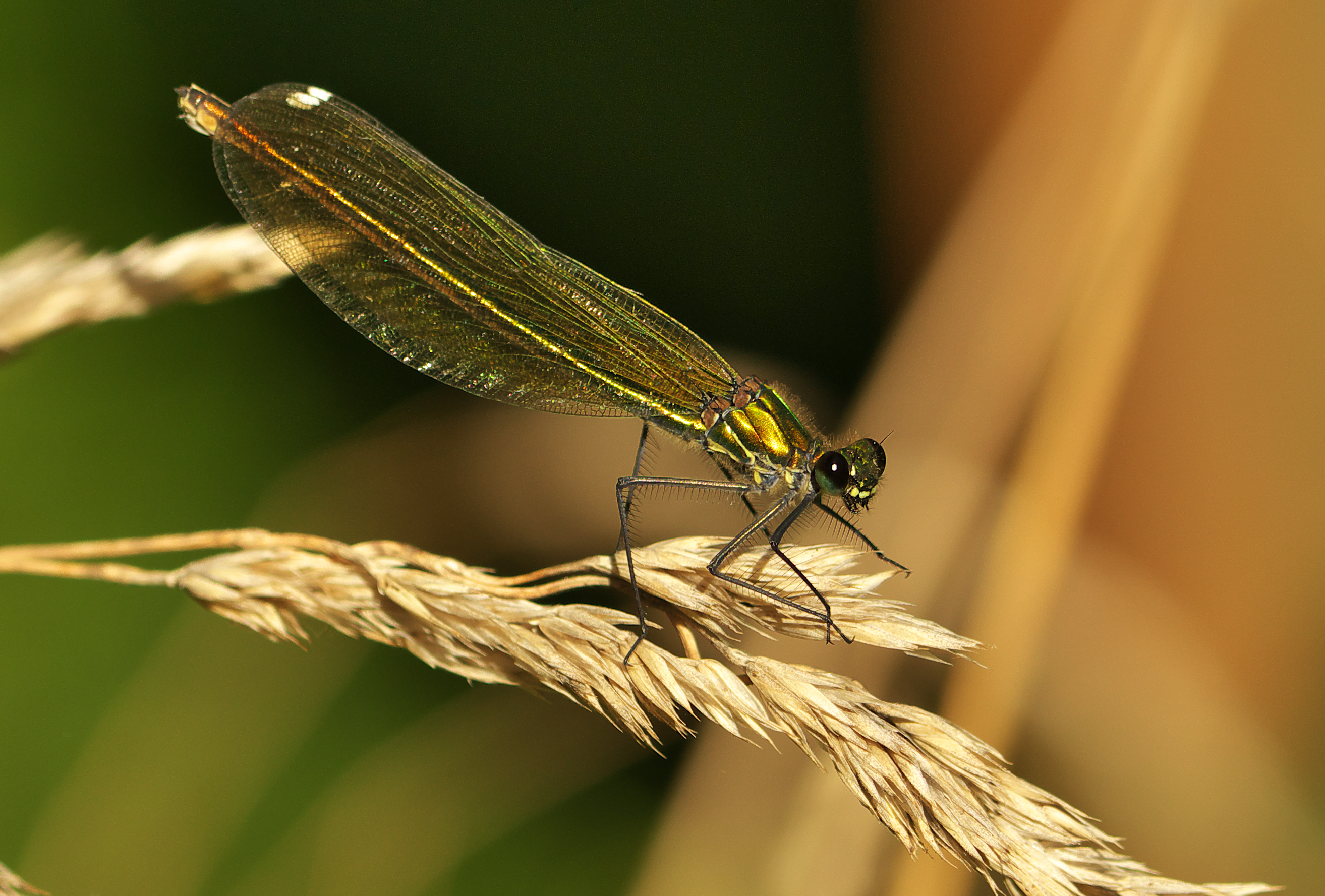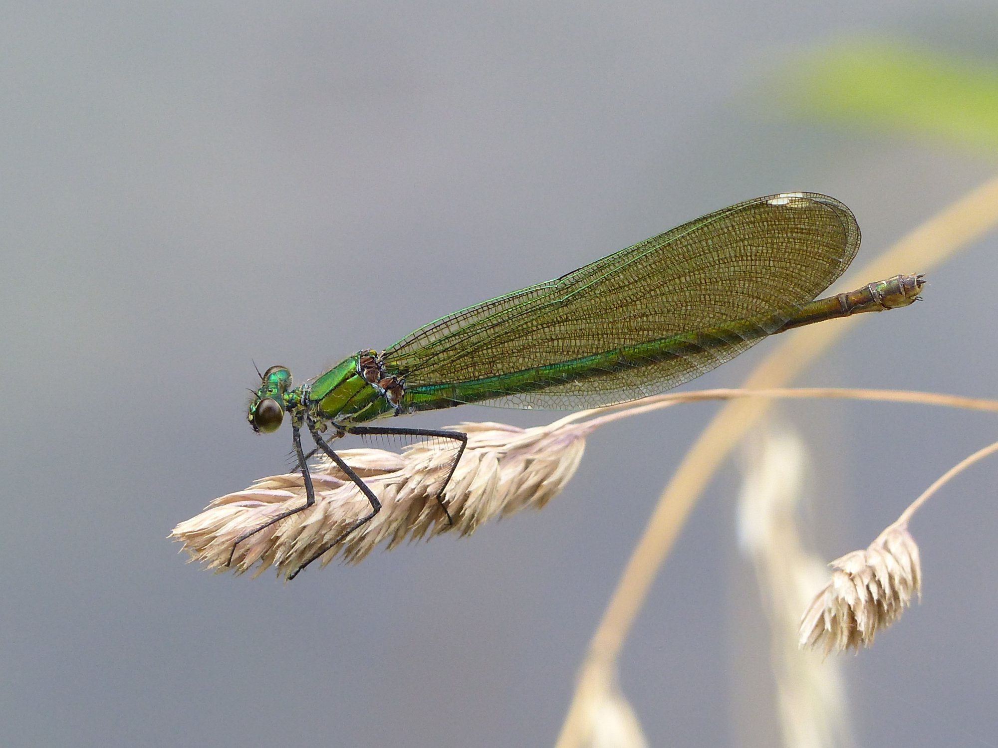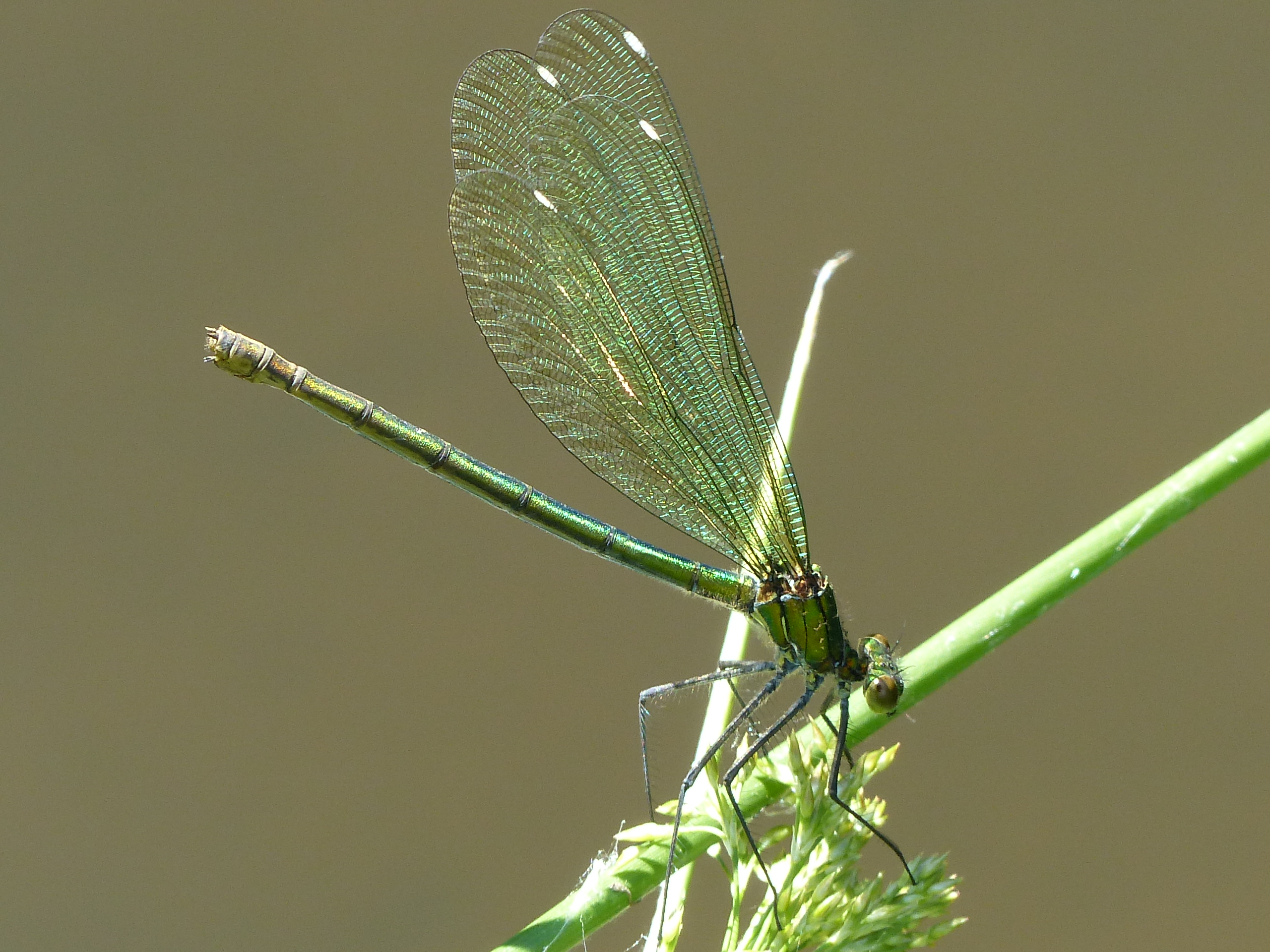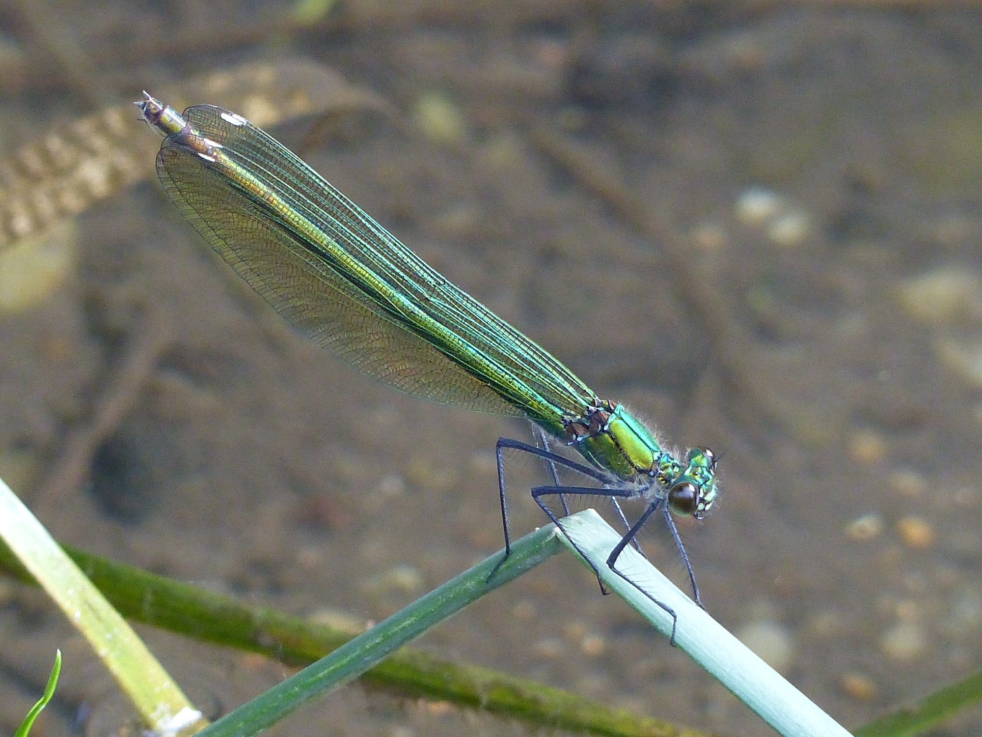 Gebänderte Prachtlibelle (Calopteryx splendens (Harris, 1782)), Weibchen, kenntlich an den grünlichen Flügeln und dem weißen Flügelmal. Neumühle Skassa bei Großenhain, Juni 2013.