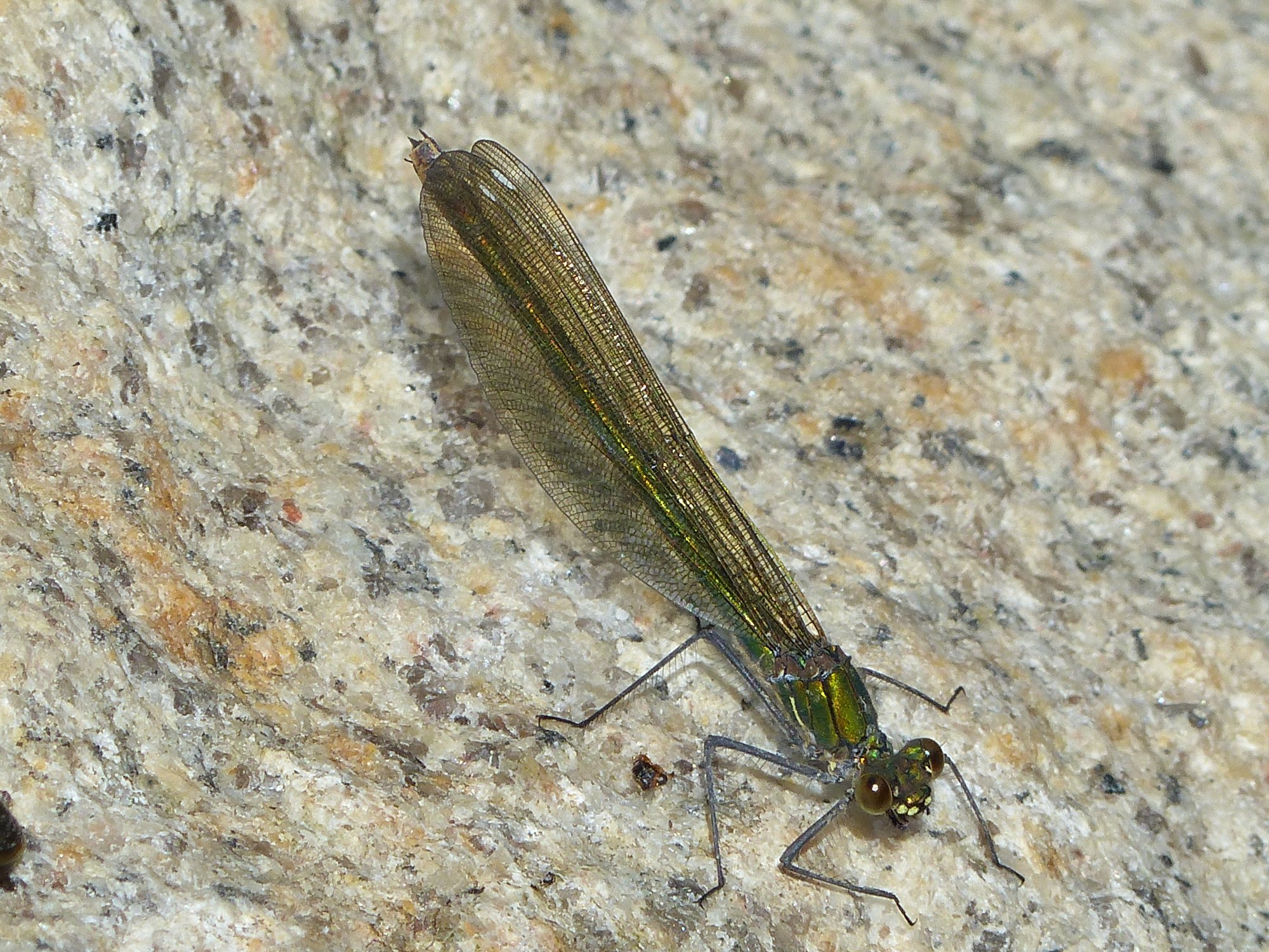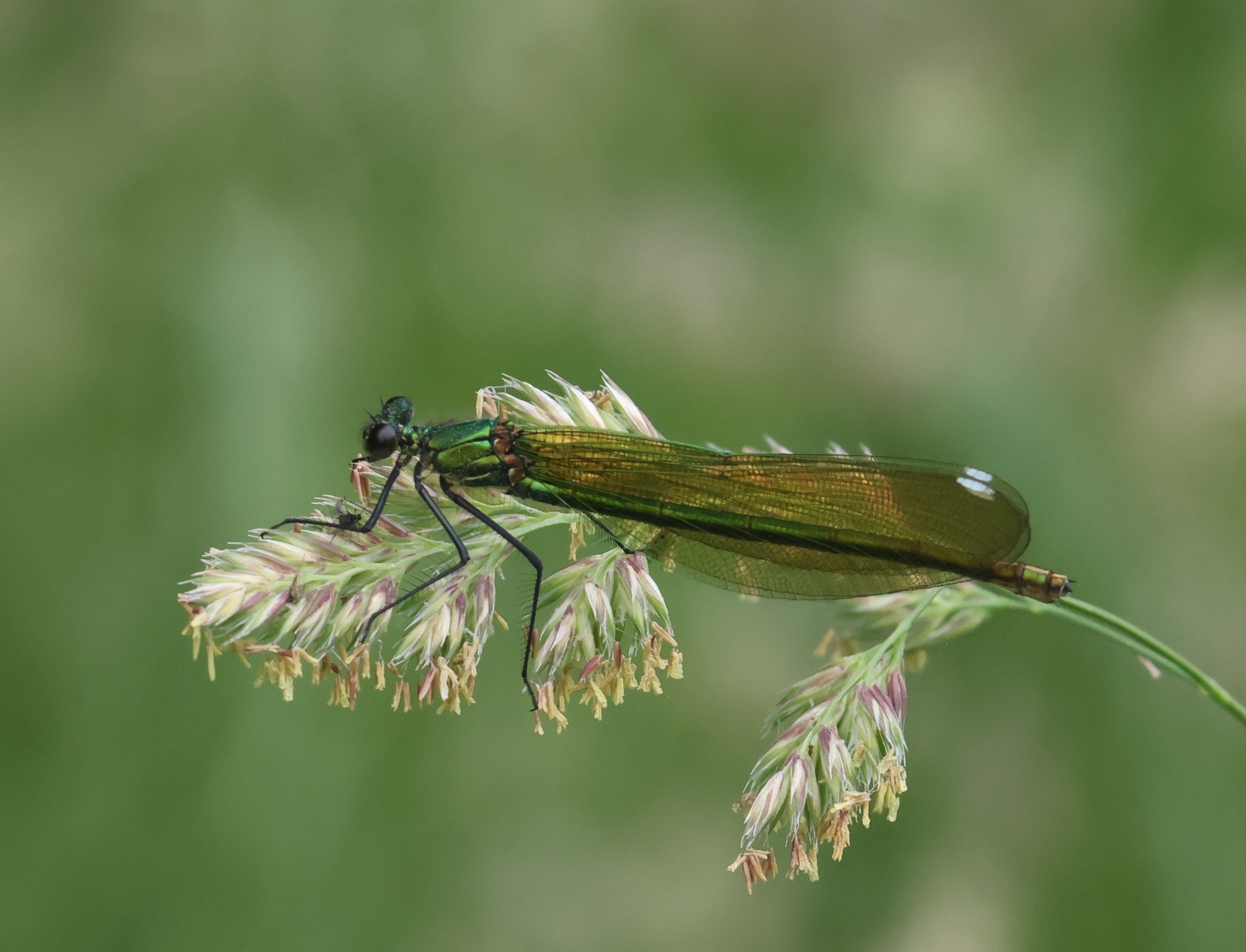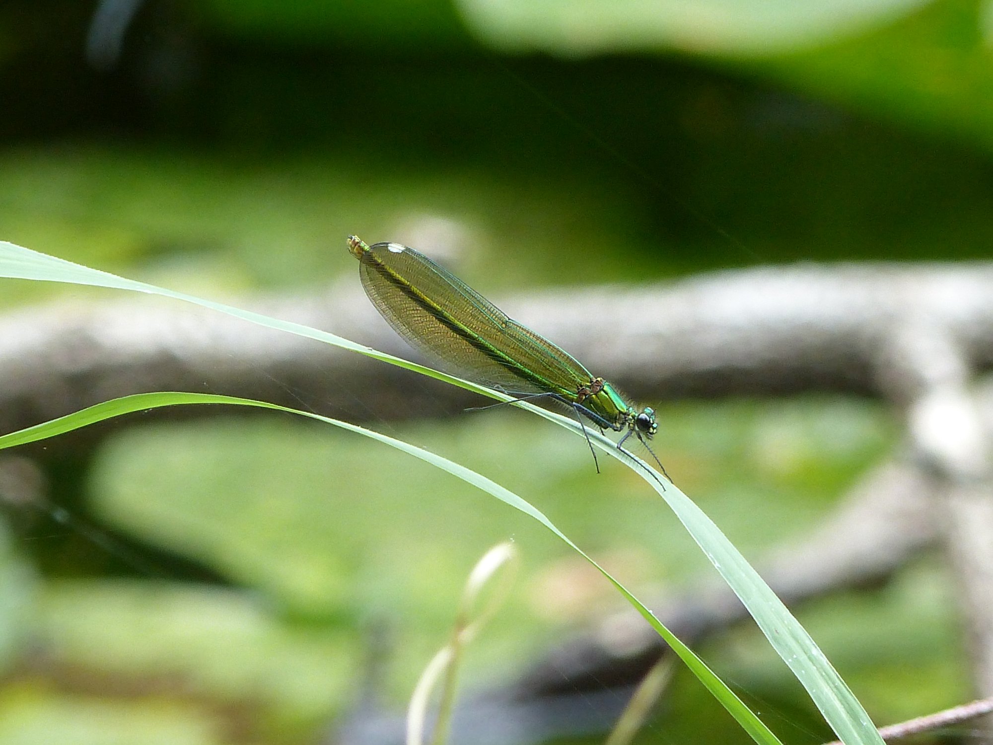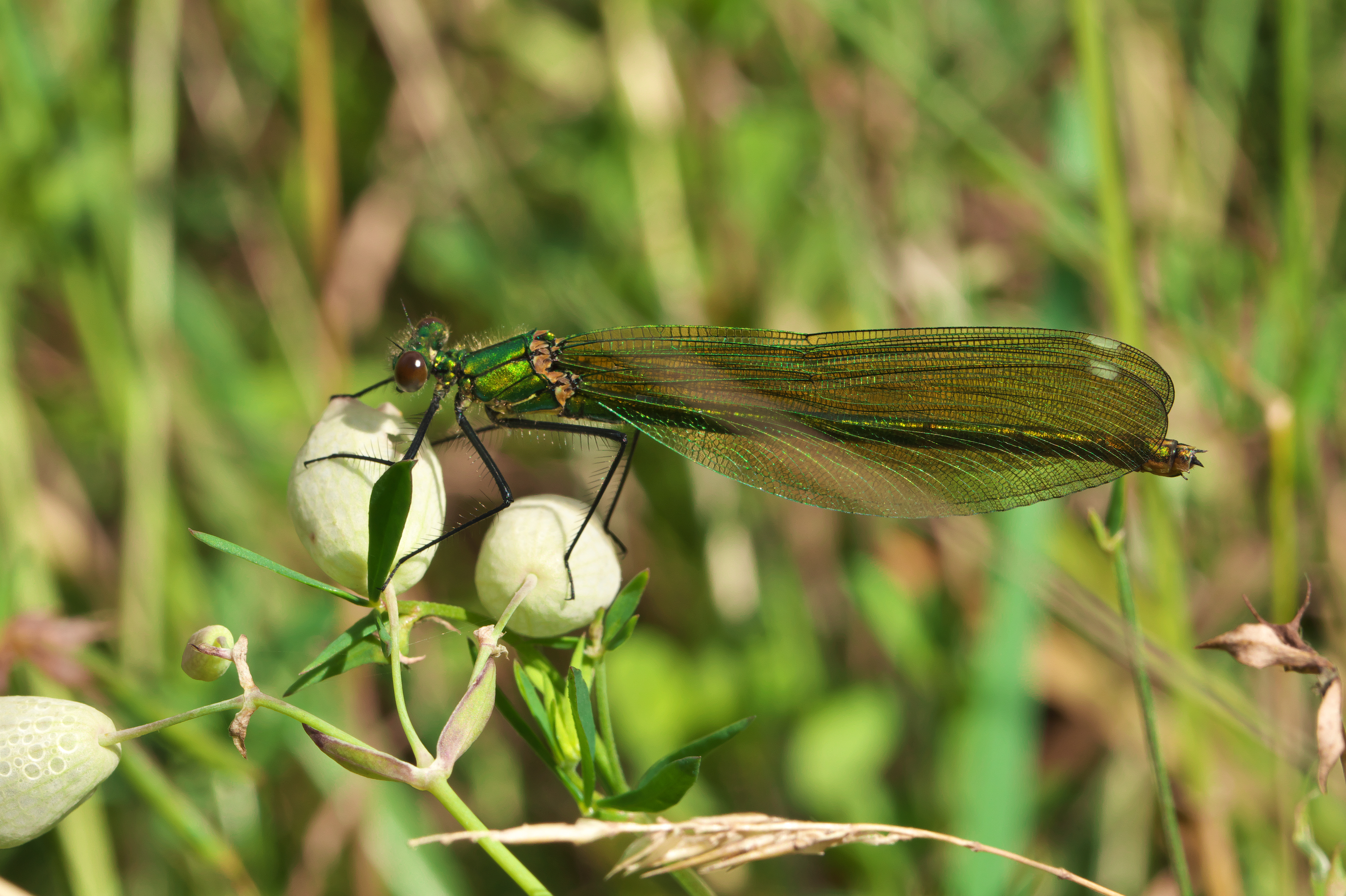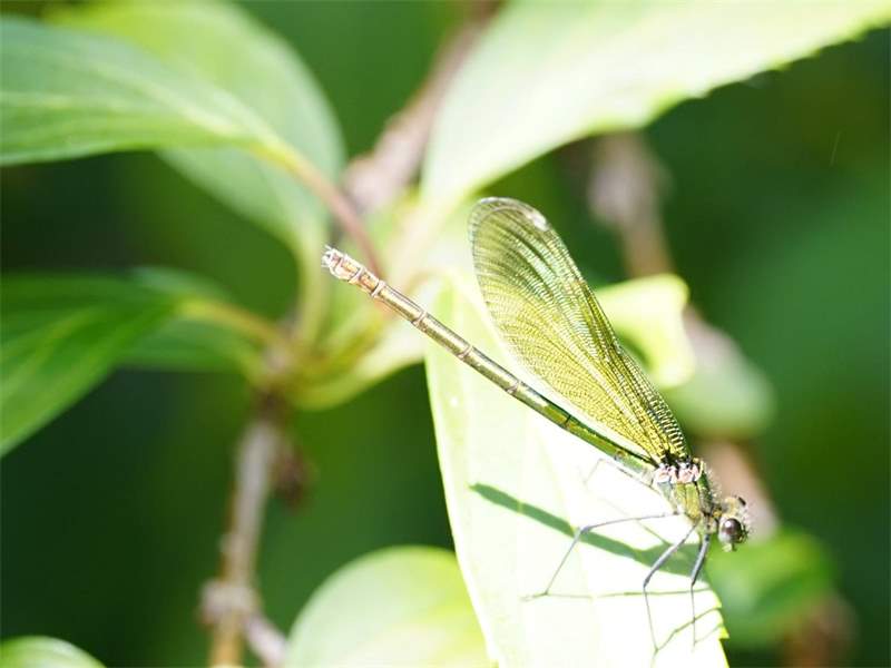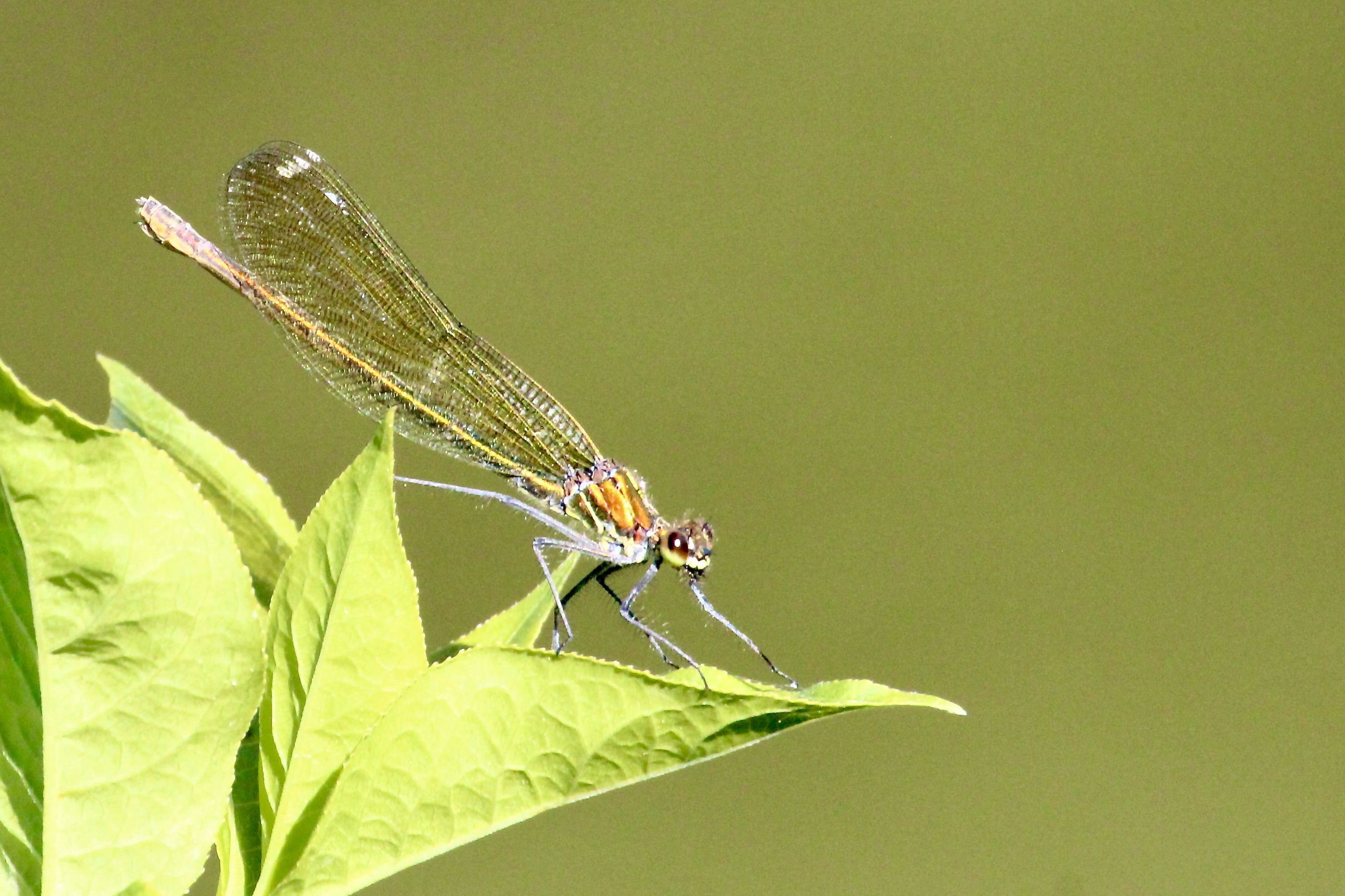 Gebänderte Prachtlibelle (Calopteryx splendens (Harris, 1782)), Weibchen, kenntlich an den grünlichen Flügeln und dem weißen Flügelmal. Neumühle Skassa bei Großenhain, Juni 2013.