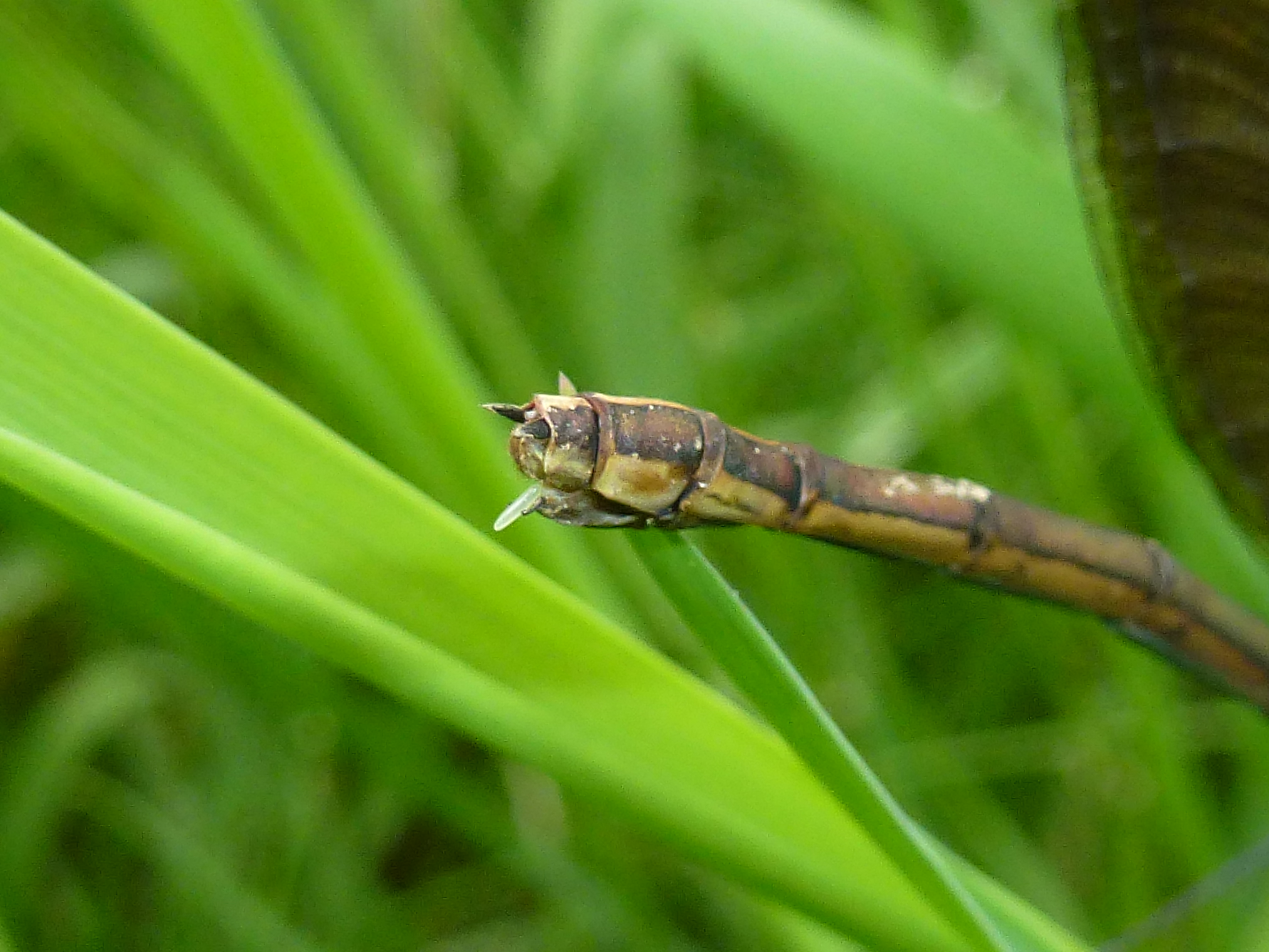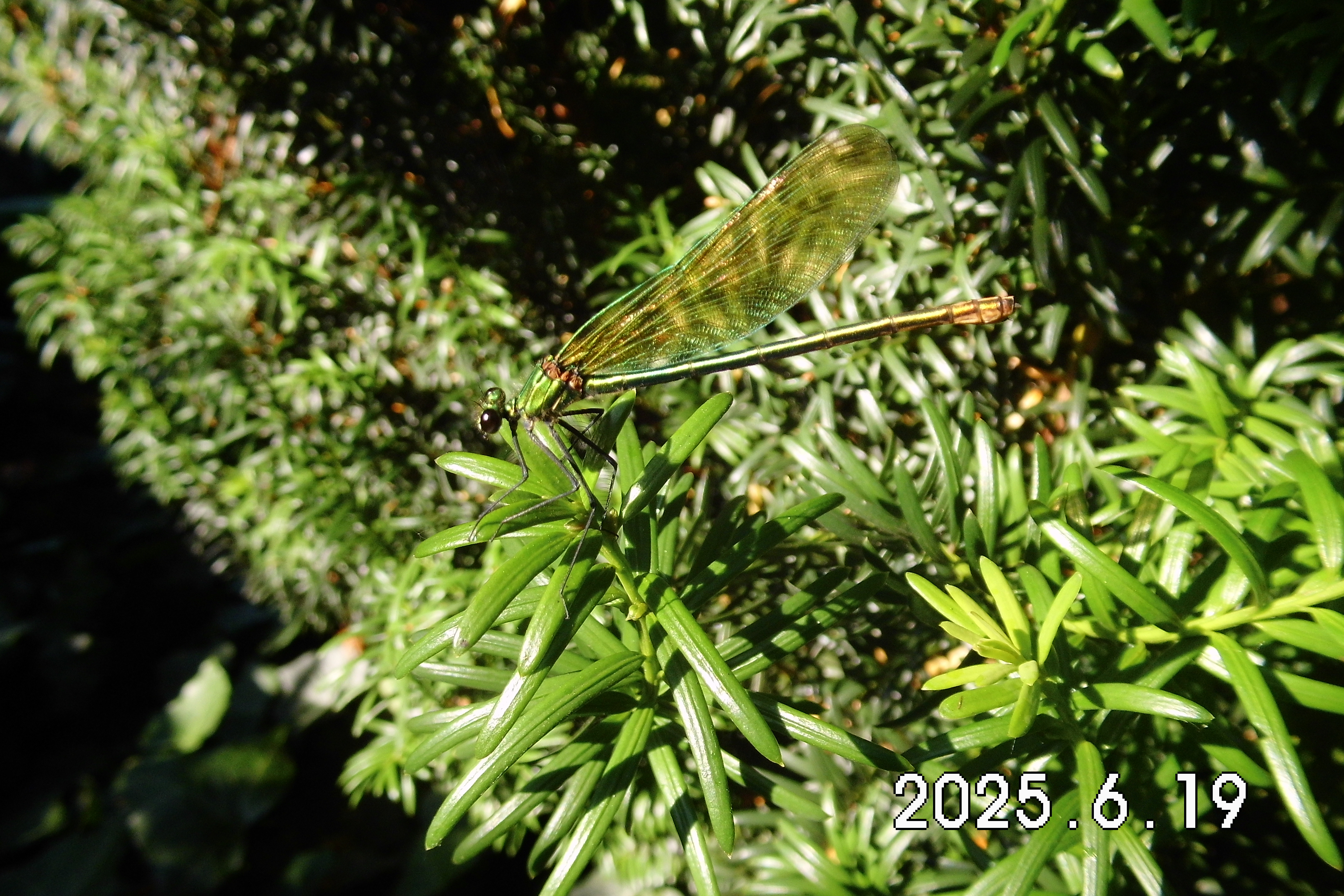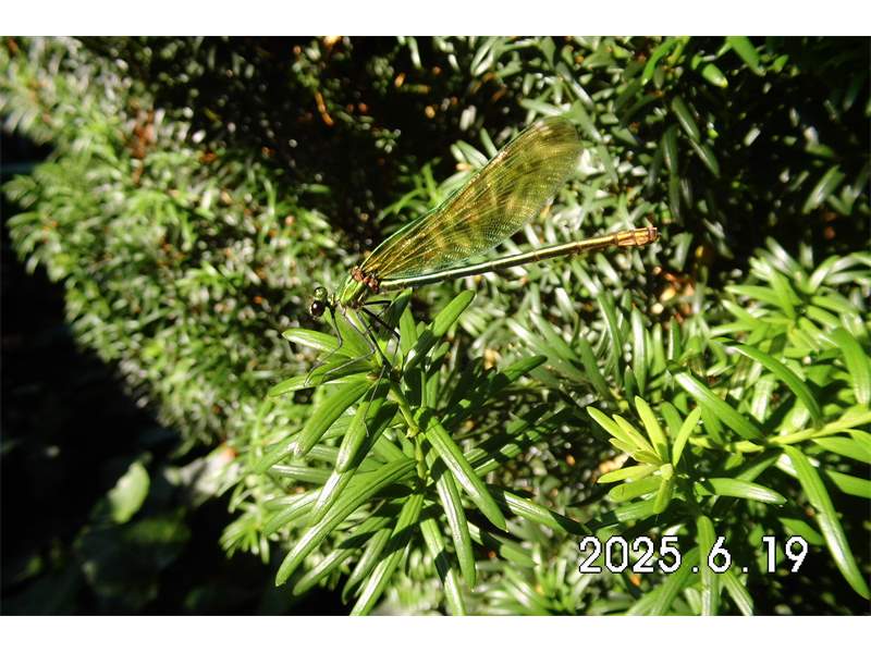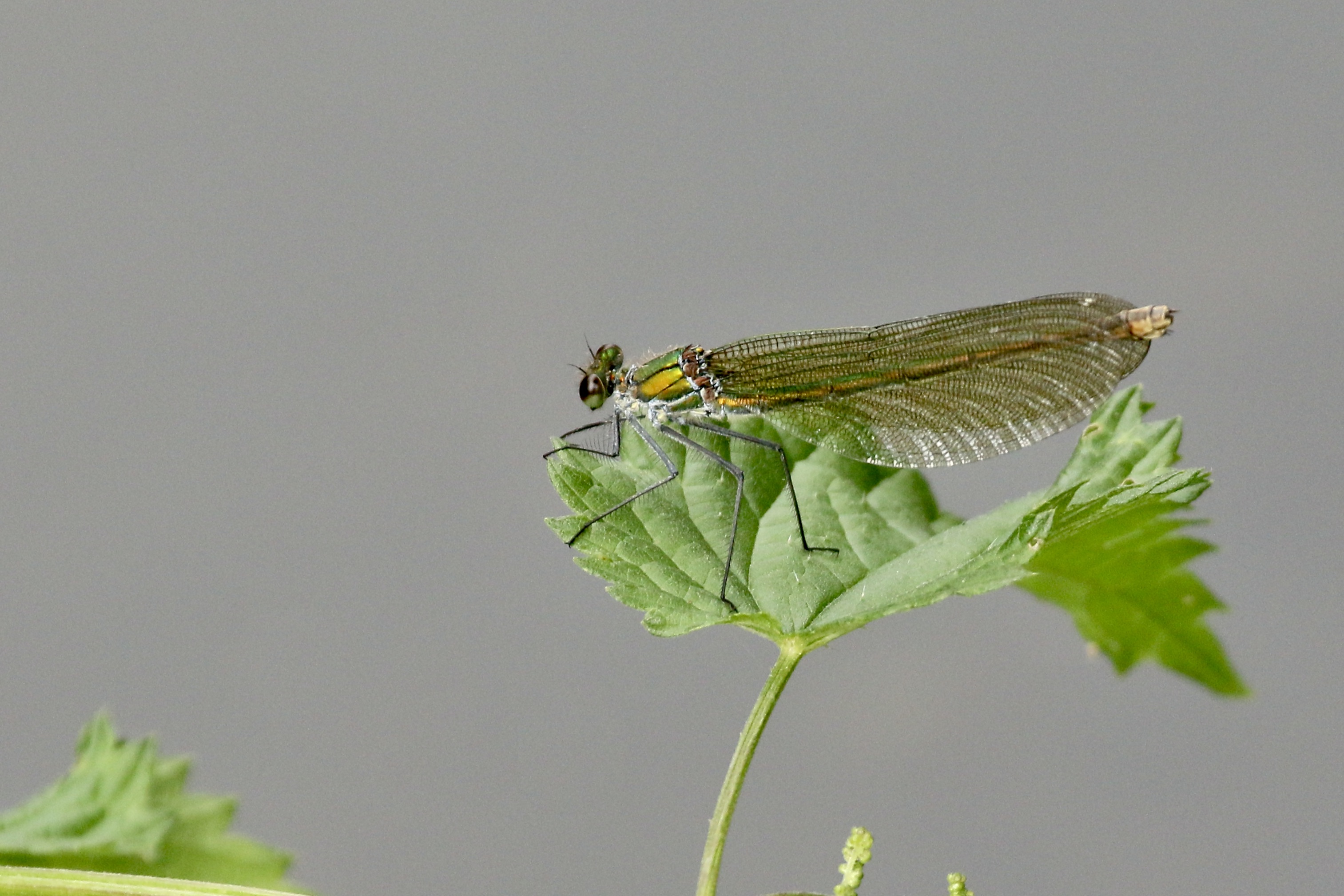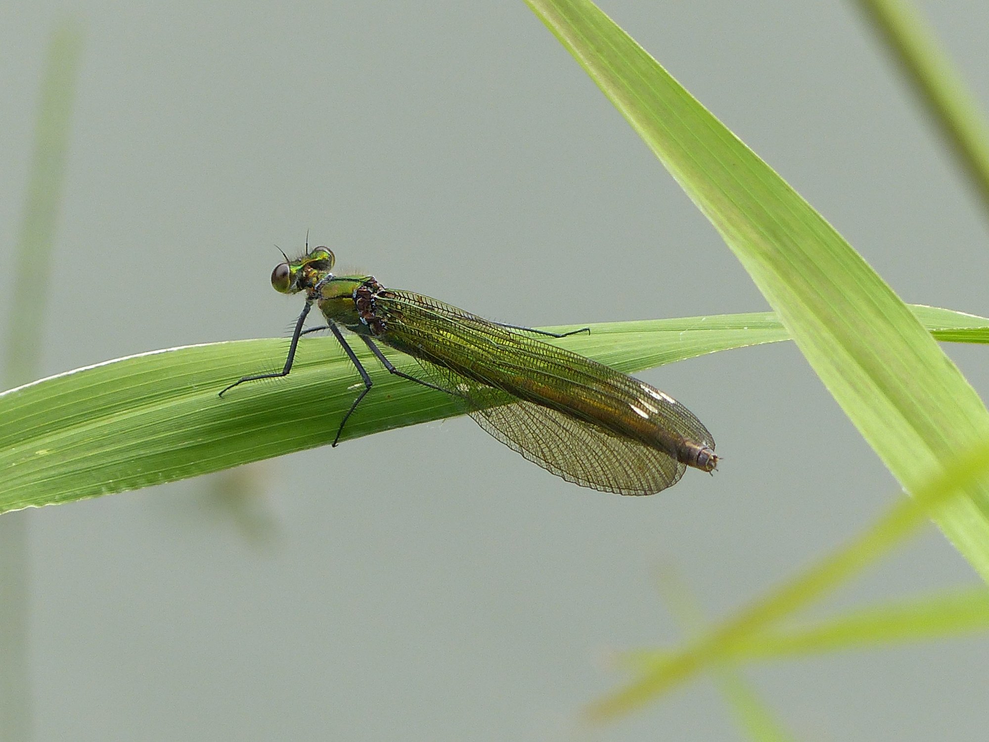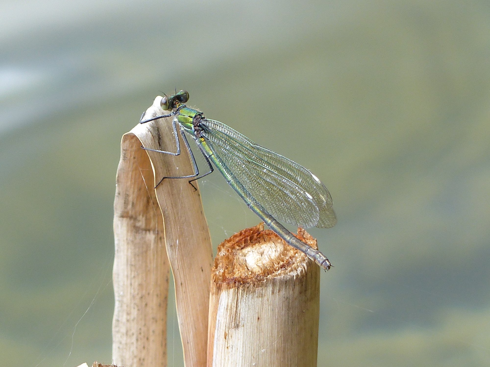 Gebänderte Prachtlibelle (Calopteryx splendens (Harris, 1782)), Weibchen, kenntlich an den grünlichen Flügeln und dem weißen Flügelmal. Neumühle Skassa bei Großenhain, Juni 2013.