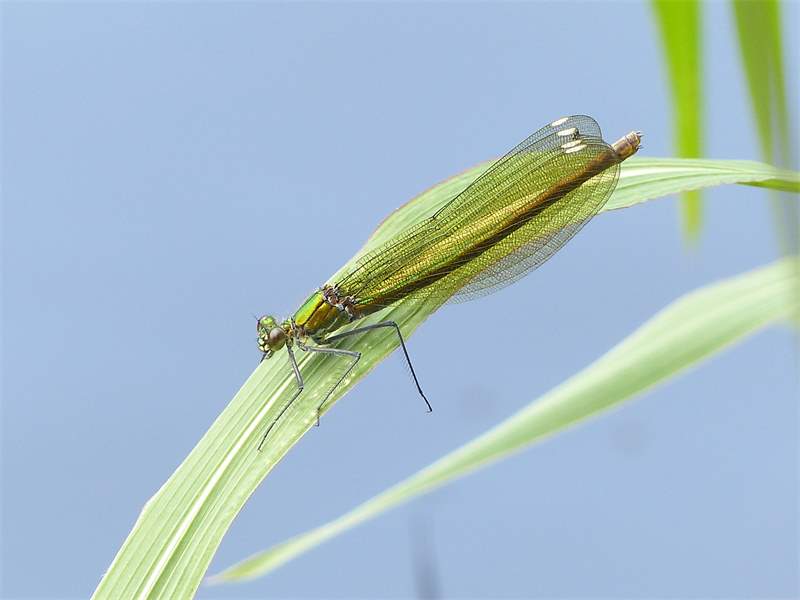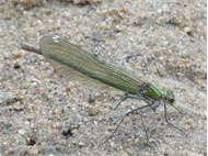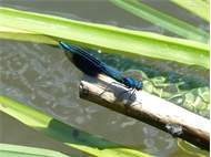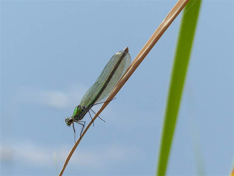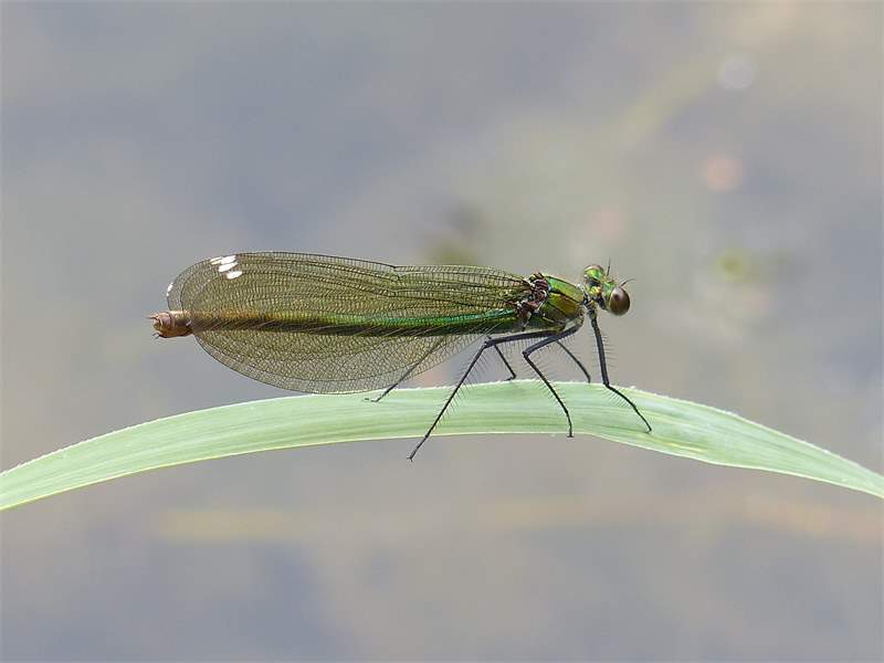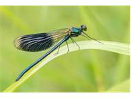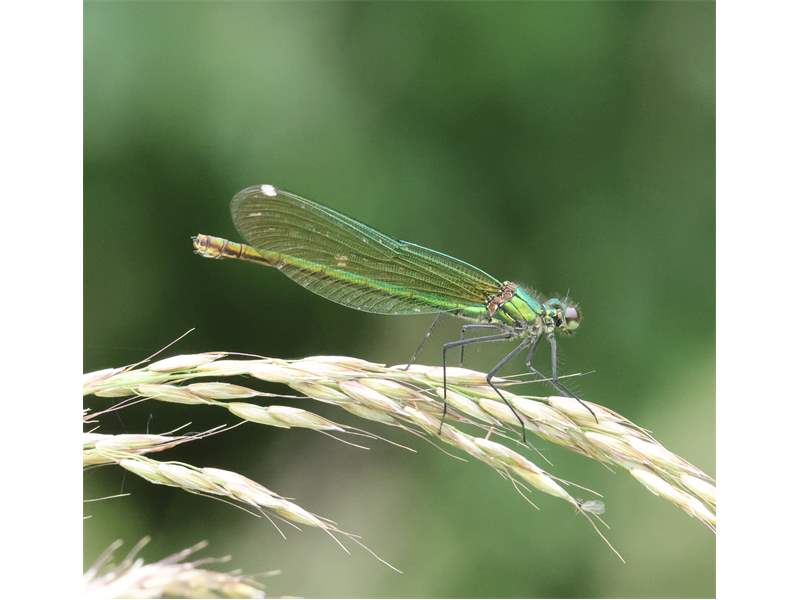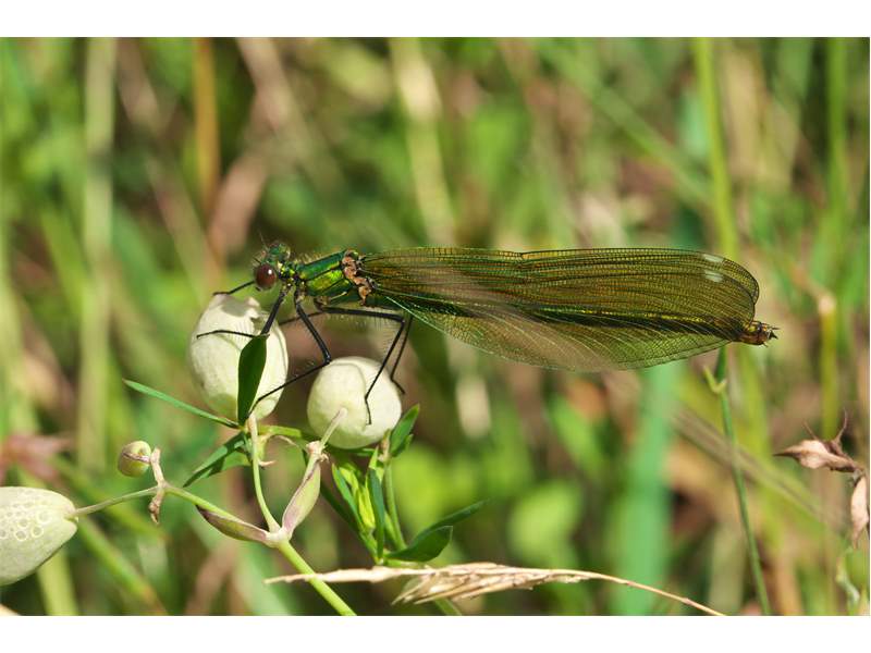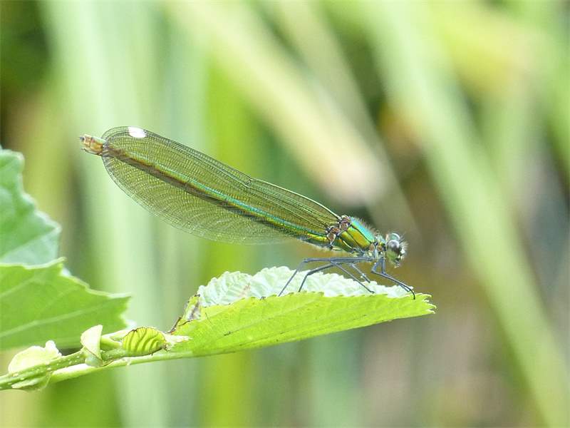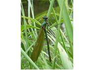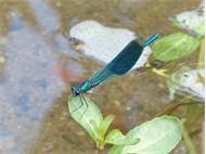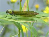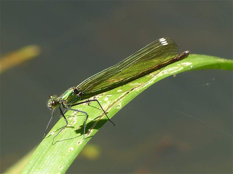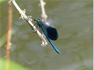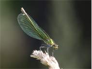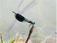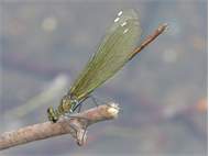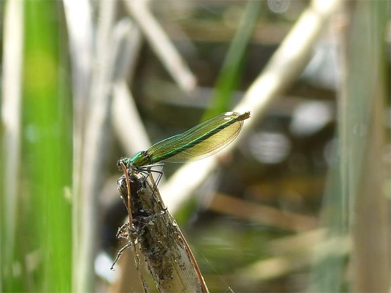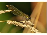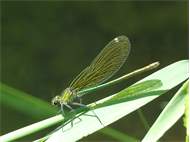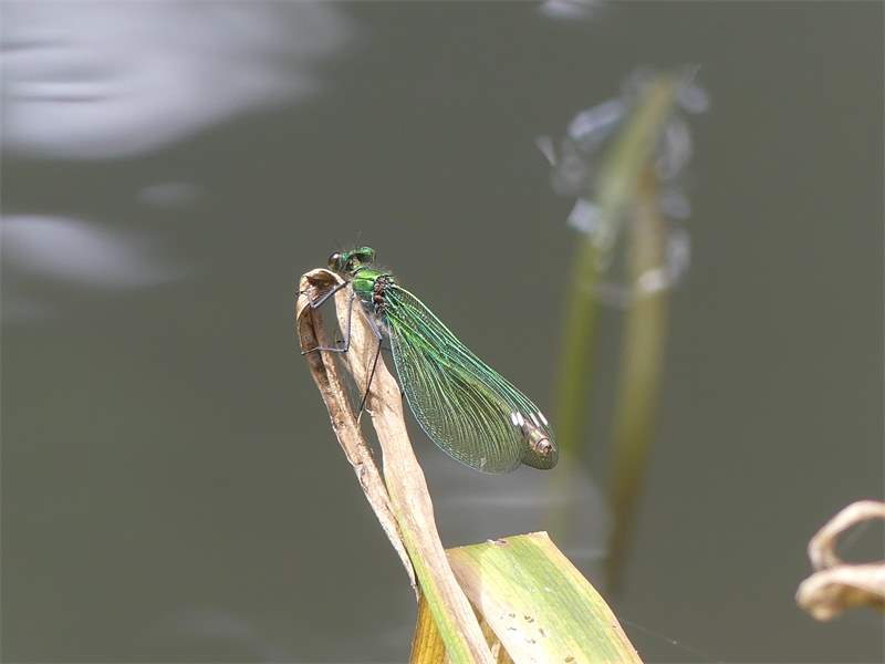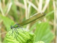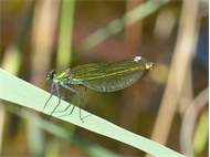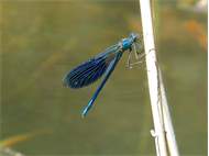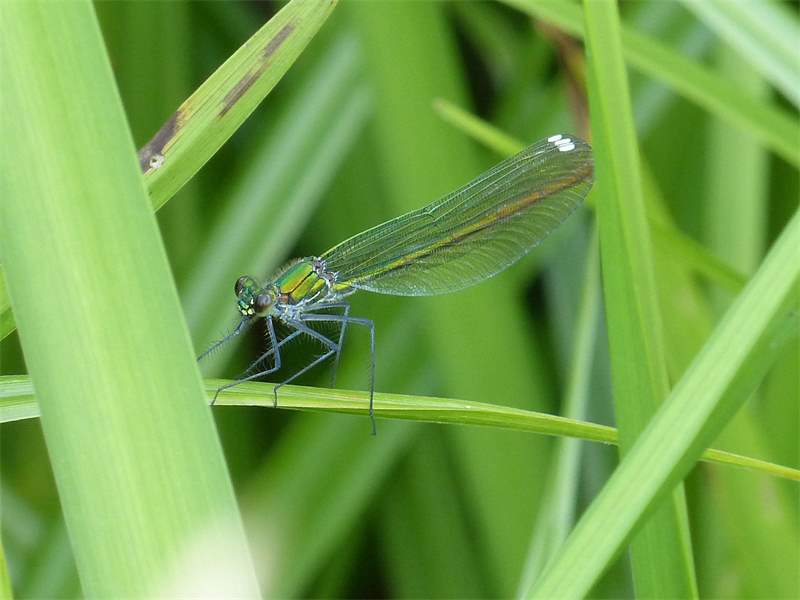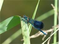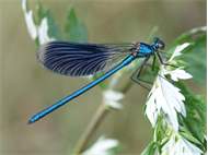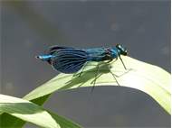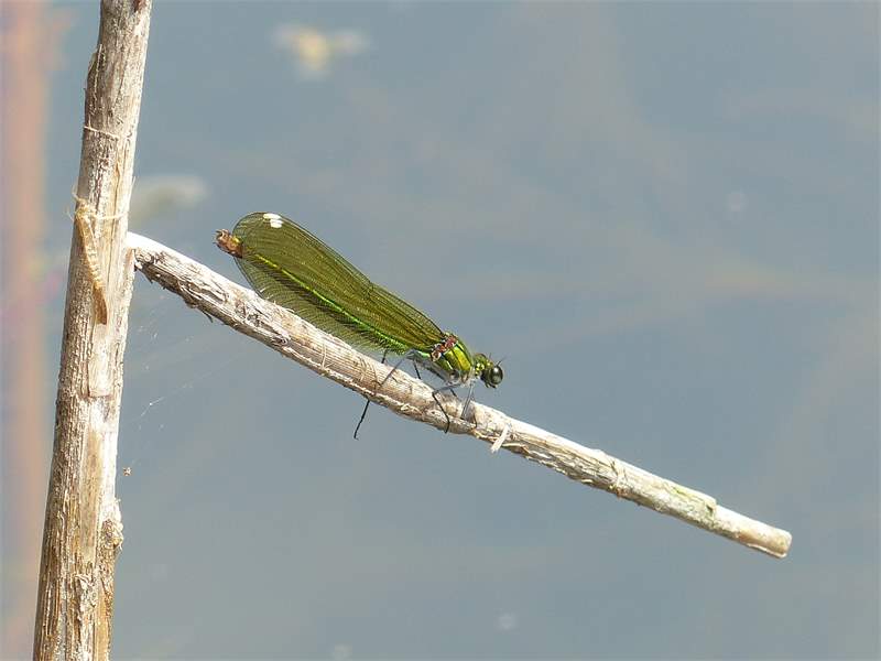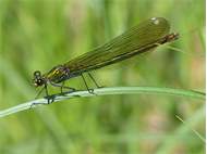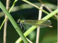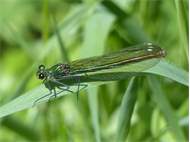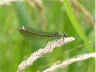 Gebänderte Prachtlibelle (Calopteryx splendens (Harris, 1782)), Weibchen, kenntlich an den grünlichen Flügeln und dem weißen Flügelmal. Neumühle Skassa bei Großenhain, Juni 2013. (© Udo Lemke)( Bild vergrößern)