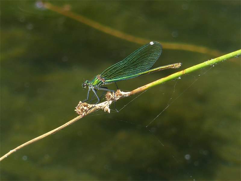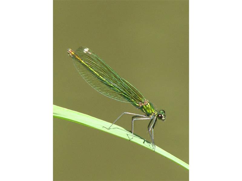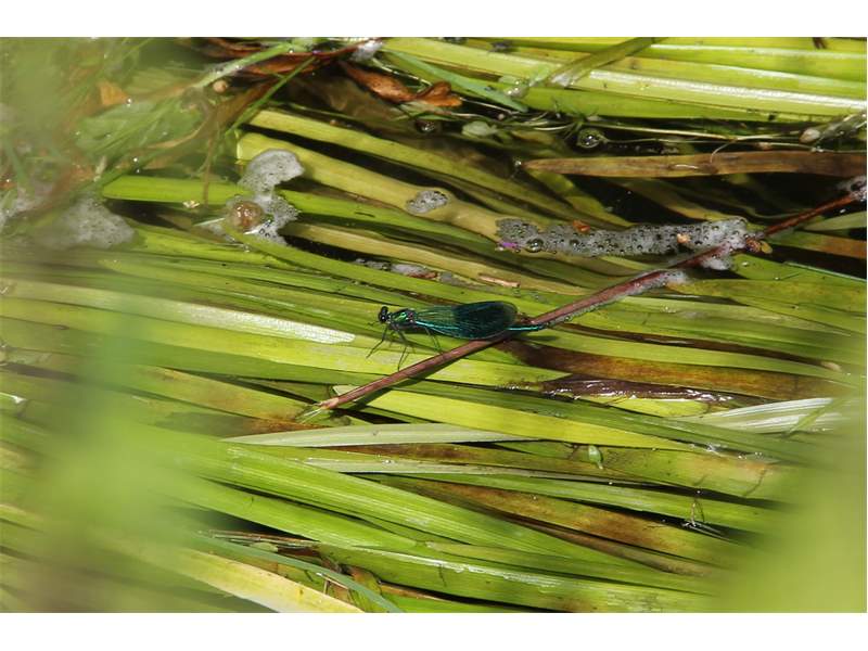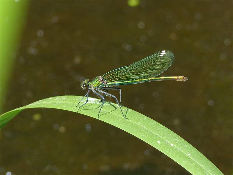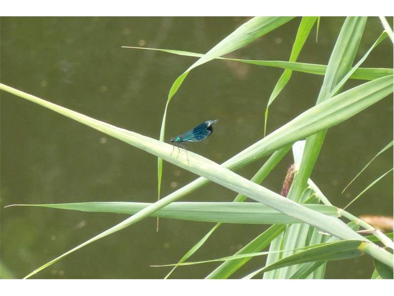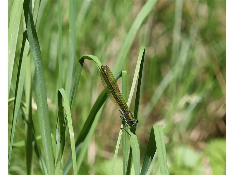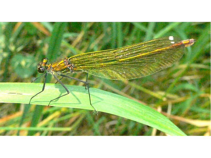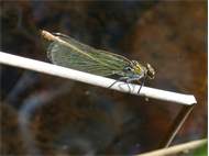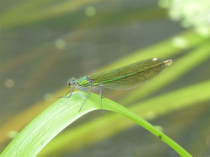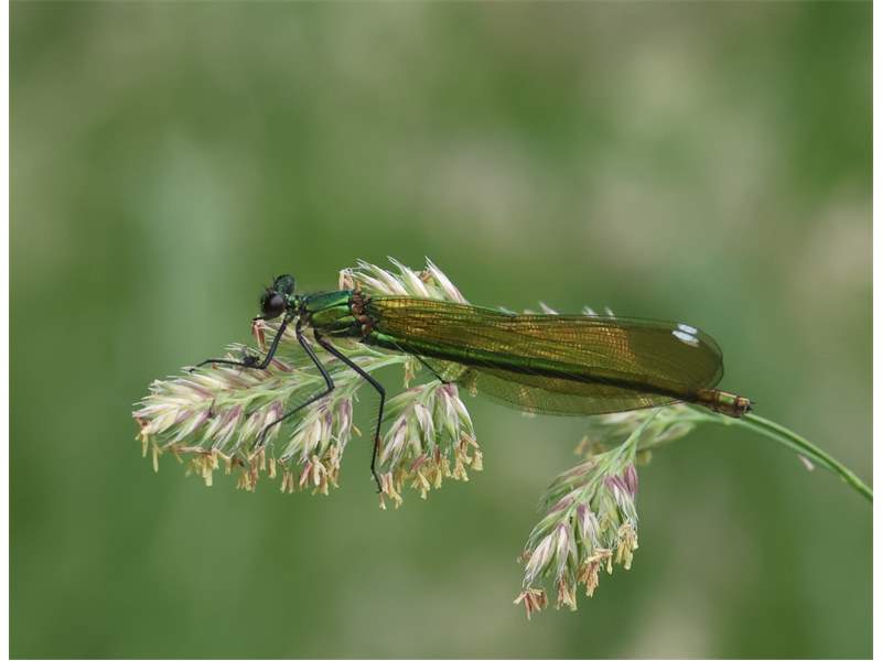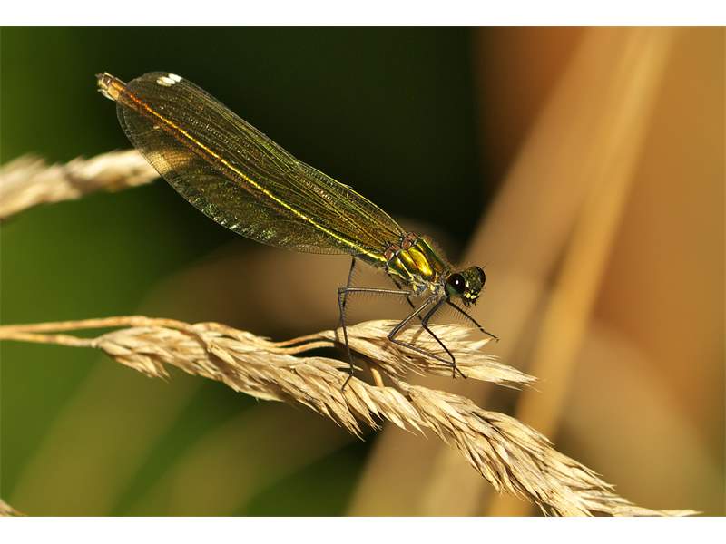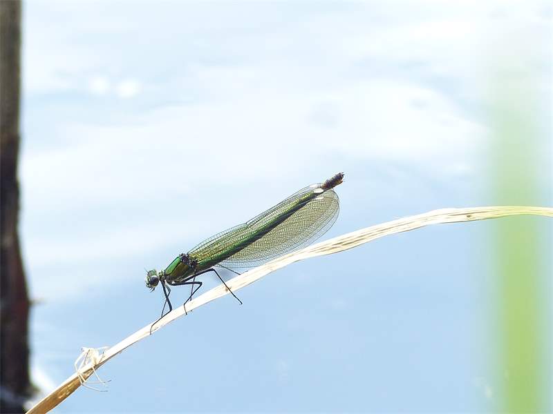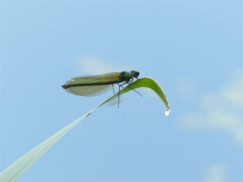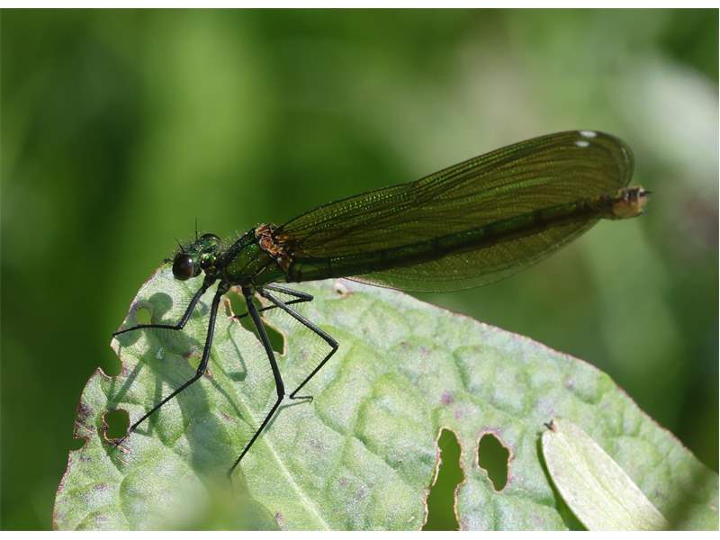 Gebänderte Prachtlibelle (Calopteryx splendens (Harris, 1782)), Weibchen, kenntlich an den grünlichen Flügeln und dem weißen Flügelmal. Neumühle Skassa bei Großenhain, Juni 2013. (© Udo Lemke)( Bild vergrößern)