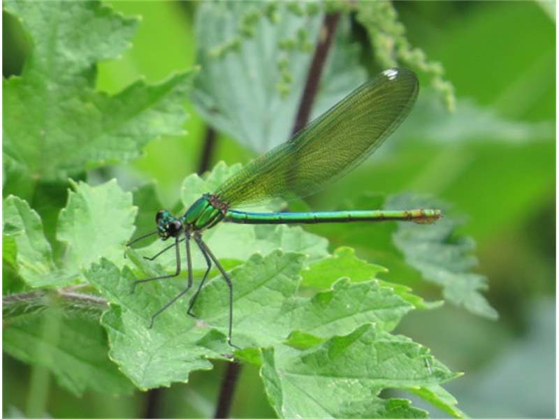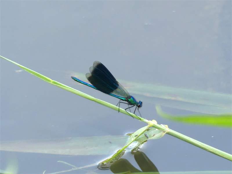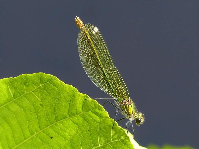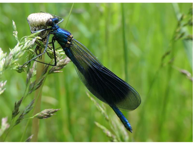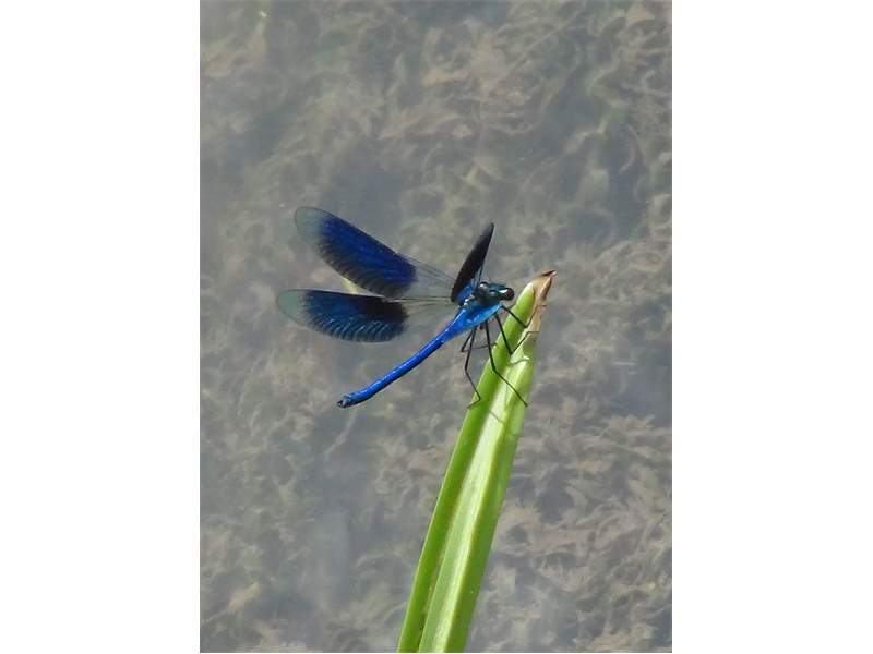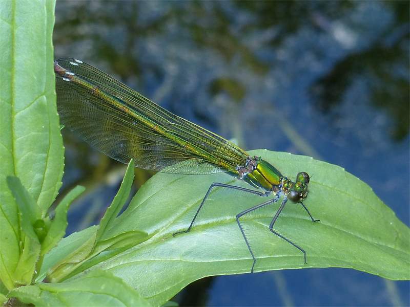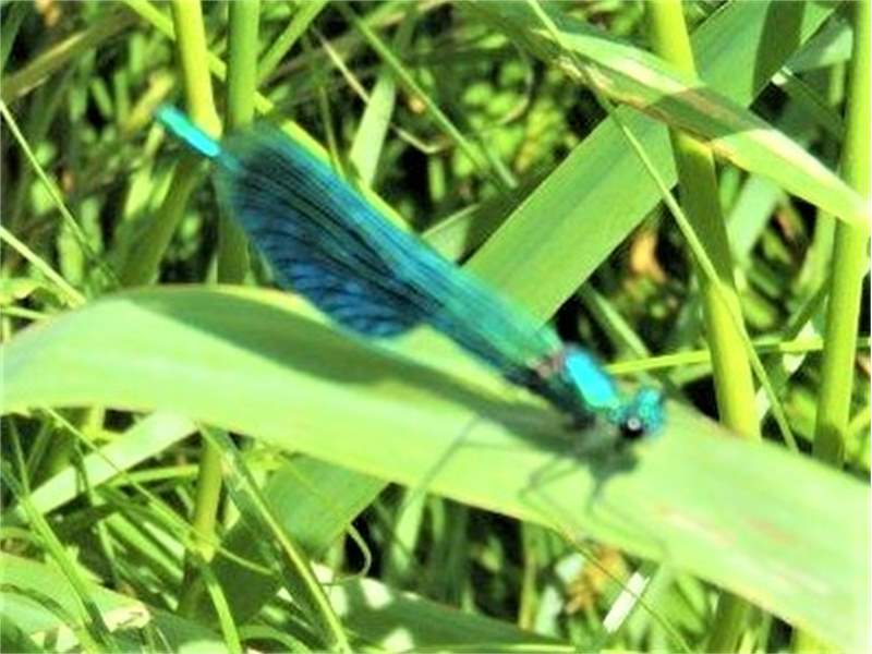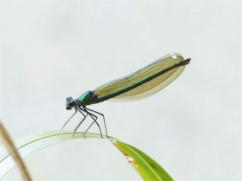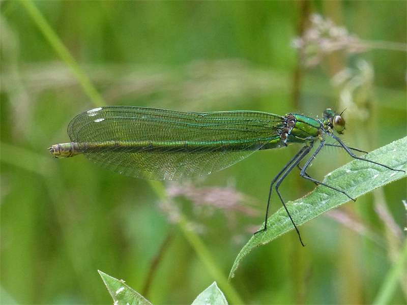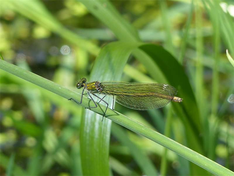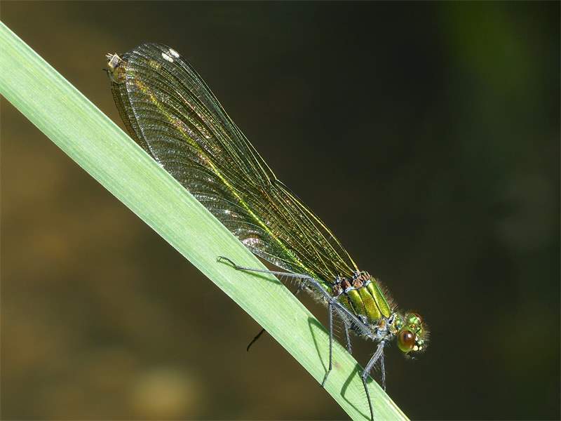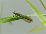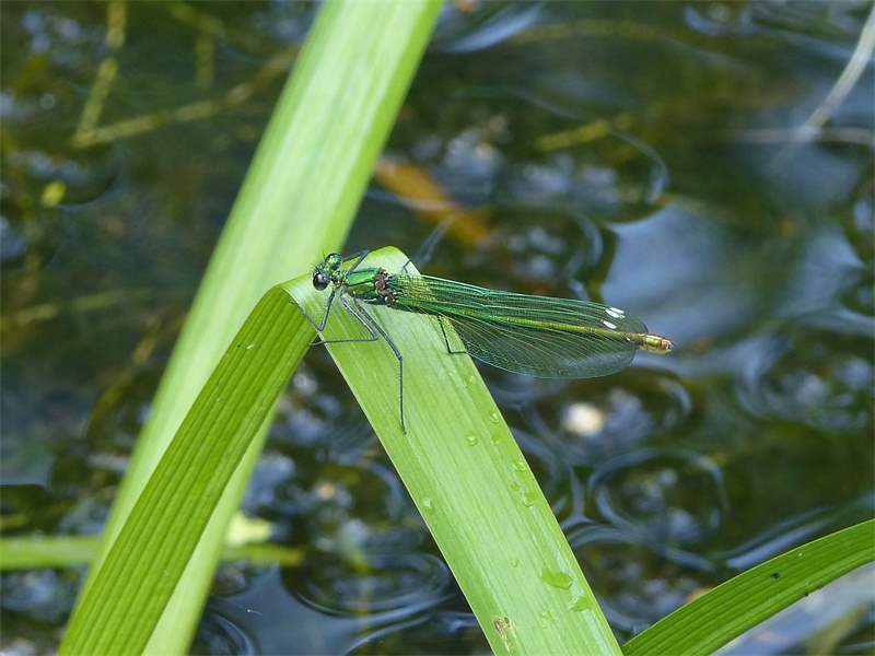 Gebänderte Prachtlibelle (Calopteryx splendens (Harris, 1782)), Weibchen, kenntlich an den grünlichen Flügeln und dem weißen Flügelmal. Neumühle Skassa bei Großenhain, Juni 2013. (© Udo Lemke)( Bild vergrößern)