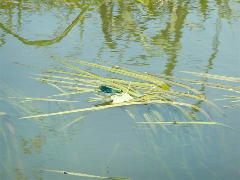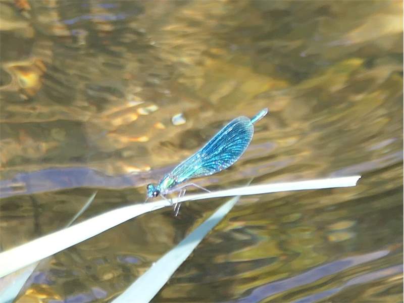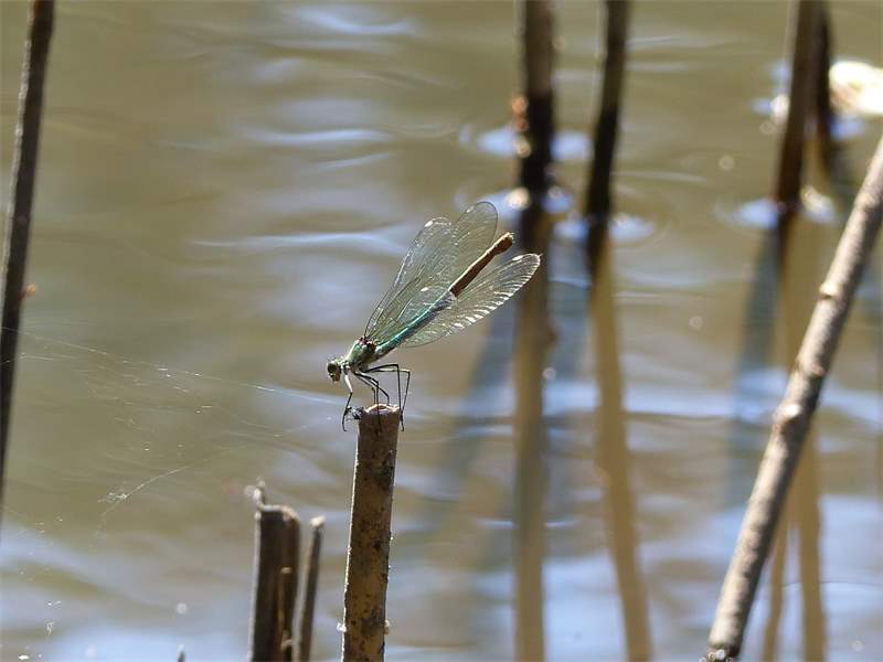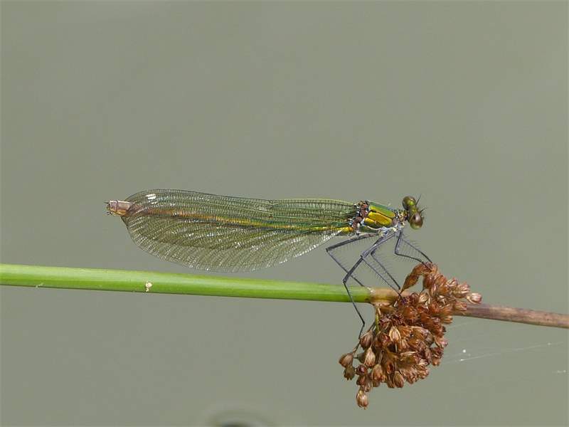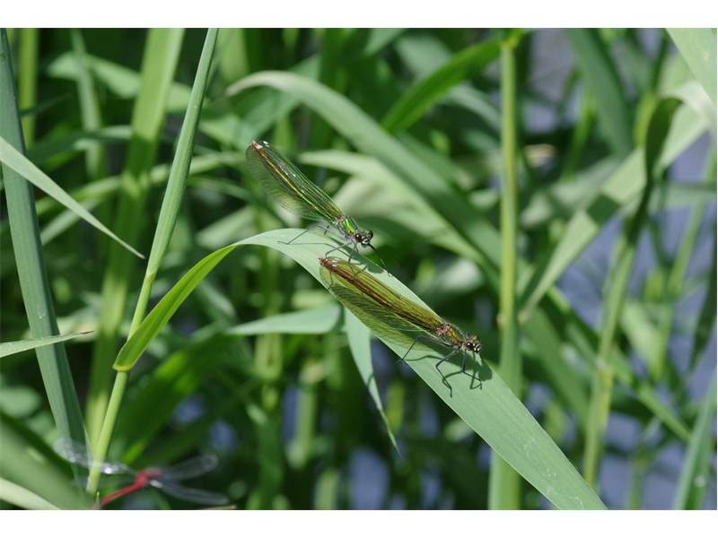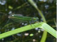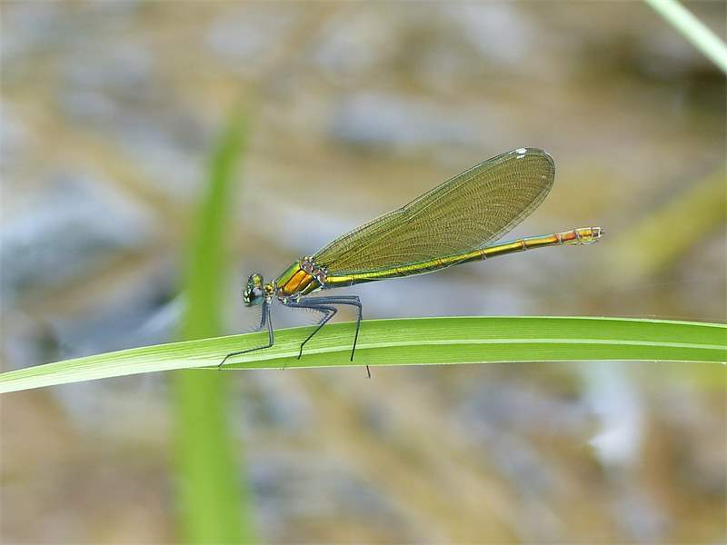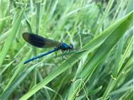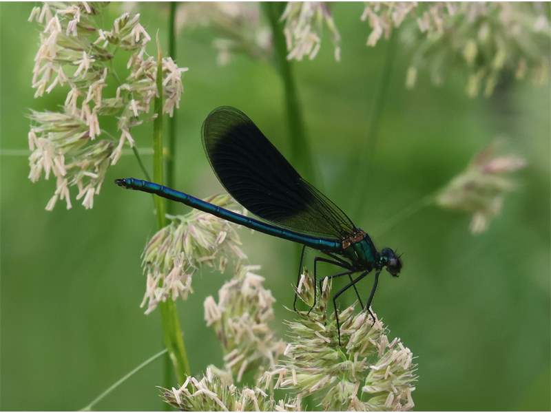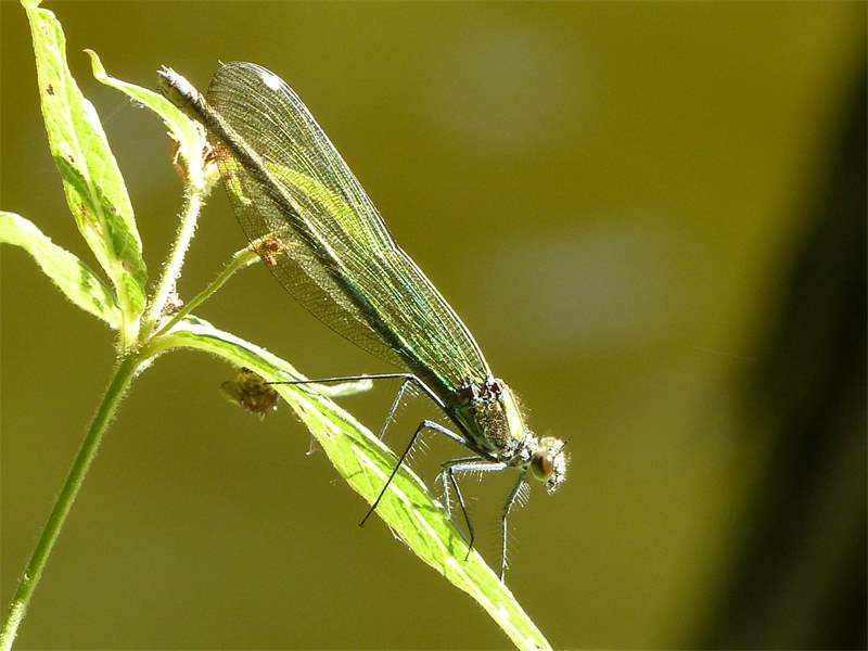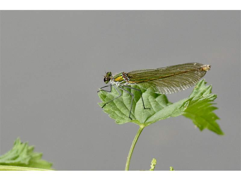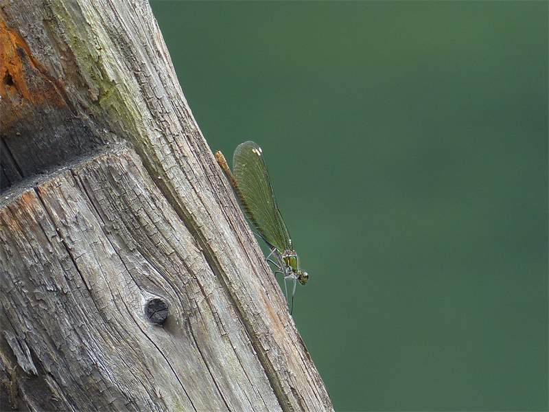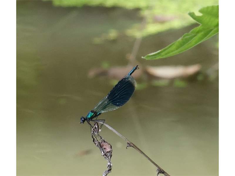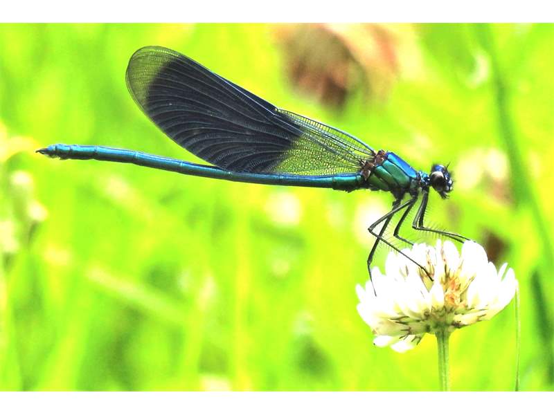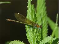 Gebänderte Prachtlibelle (Calopteryx splendens (Harris, 1782)), Weibchen, kenntlich an den grünlichen Flügeln und dem weißen Flügelmal. Neumühle Skassa bei Großenhain, Juni 2013. (© Udo Lemke)( Bild vergrößern)