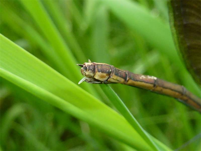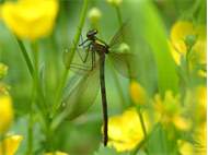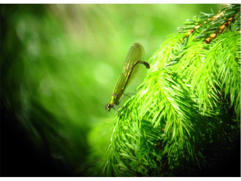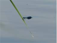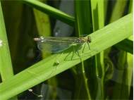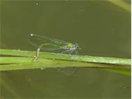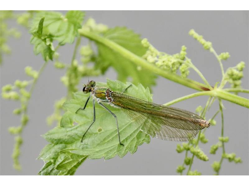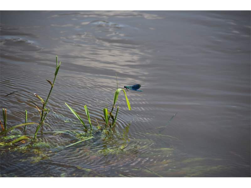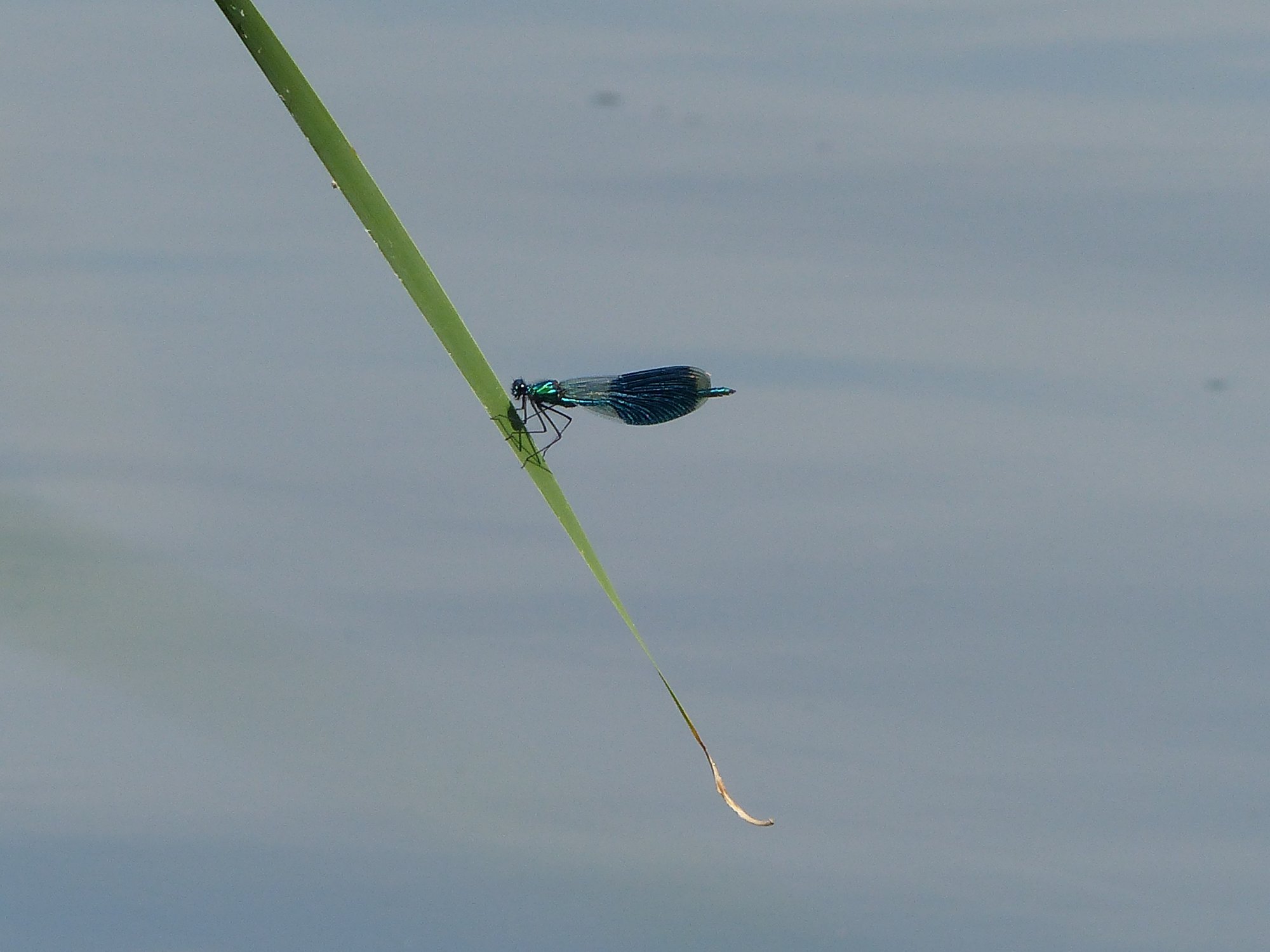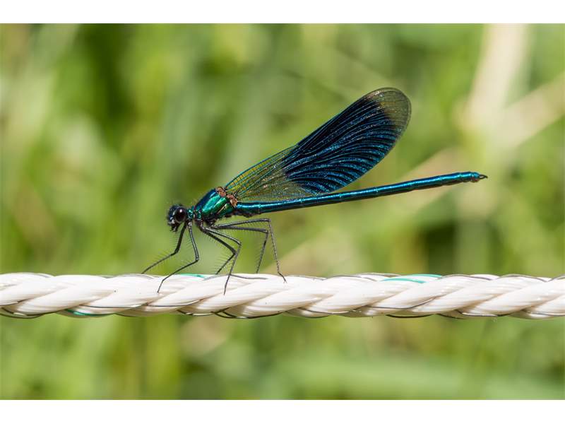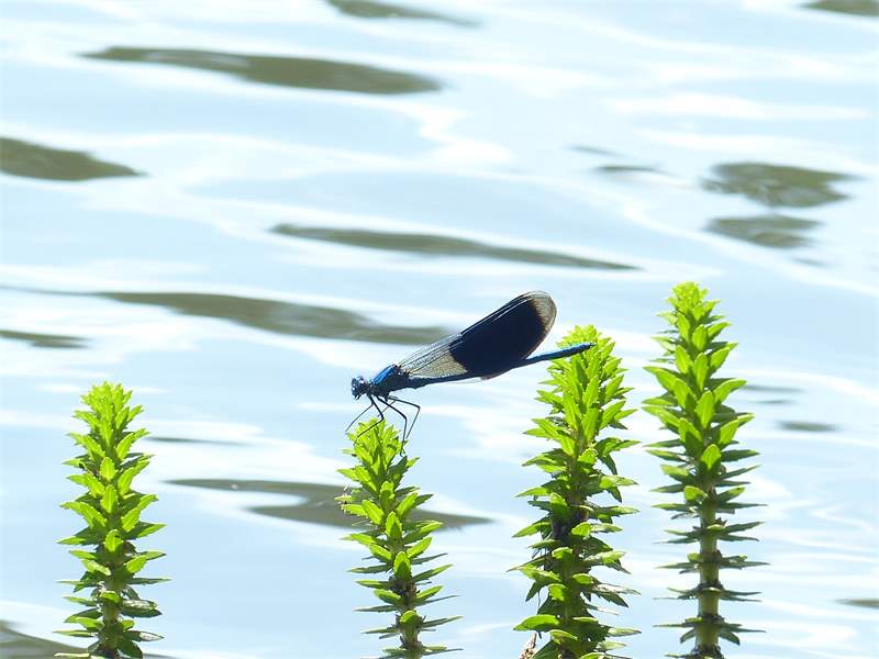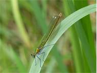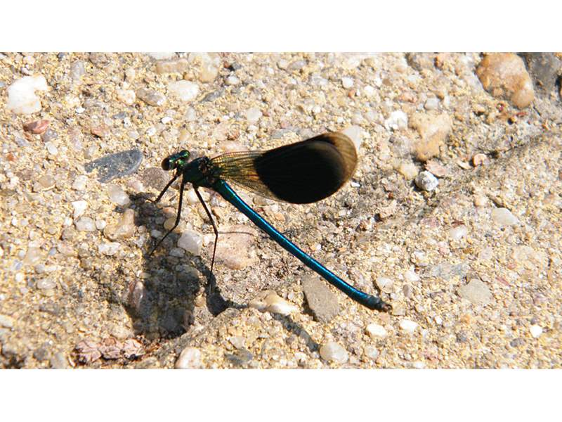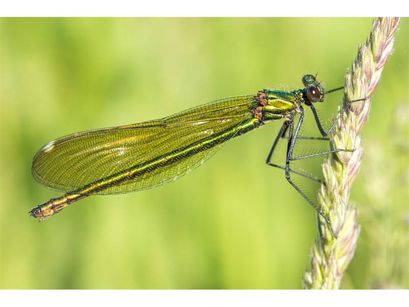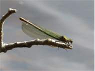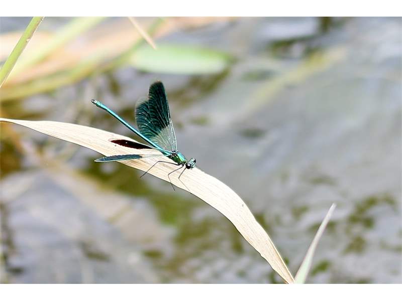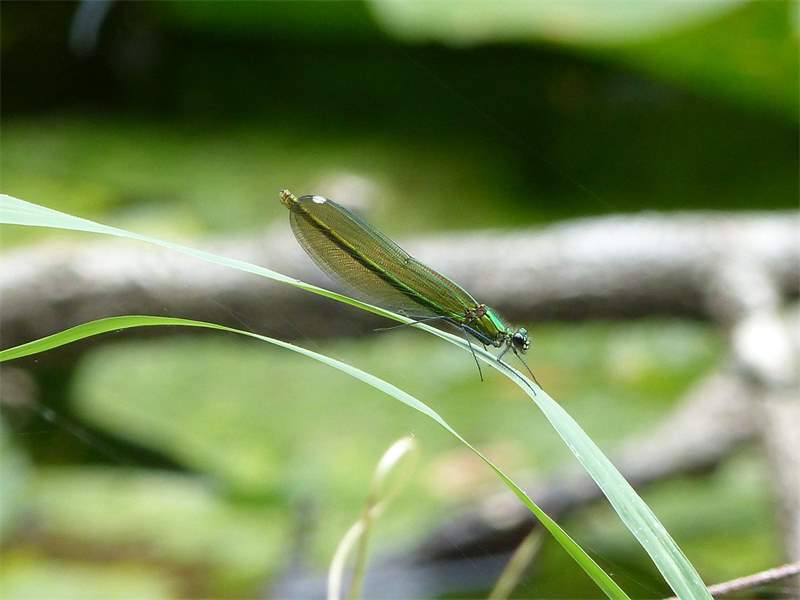 Gebänderte Prachtlibelle (Calopteryx splendens (Harris, 1782)), Weibchen, kenntlich an den grünlichen Flügeln und dem weißen Flügelmal. Neumühle Skassa bei Großenhain, Juni 2013. (© Udo Lemke)( Bild vergrößern)