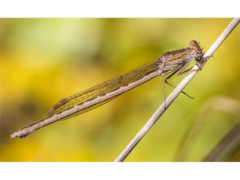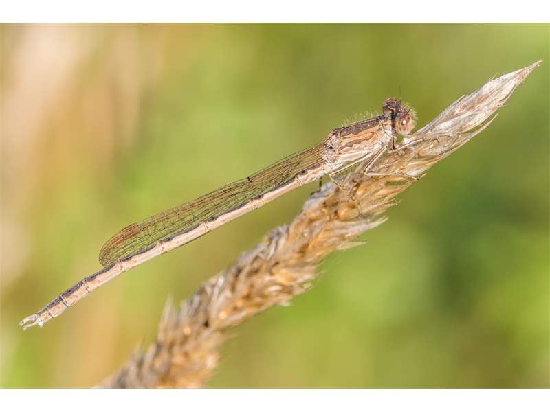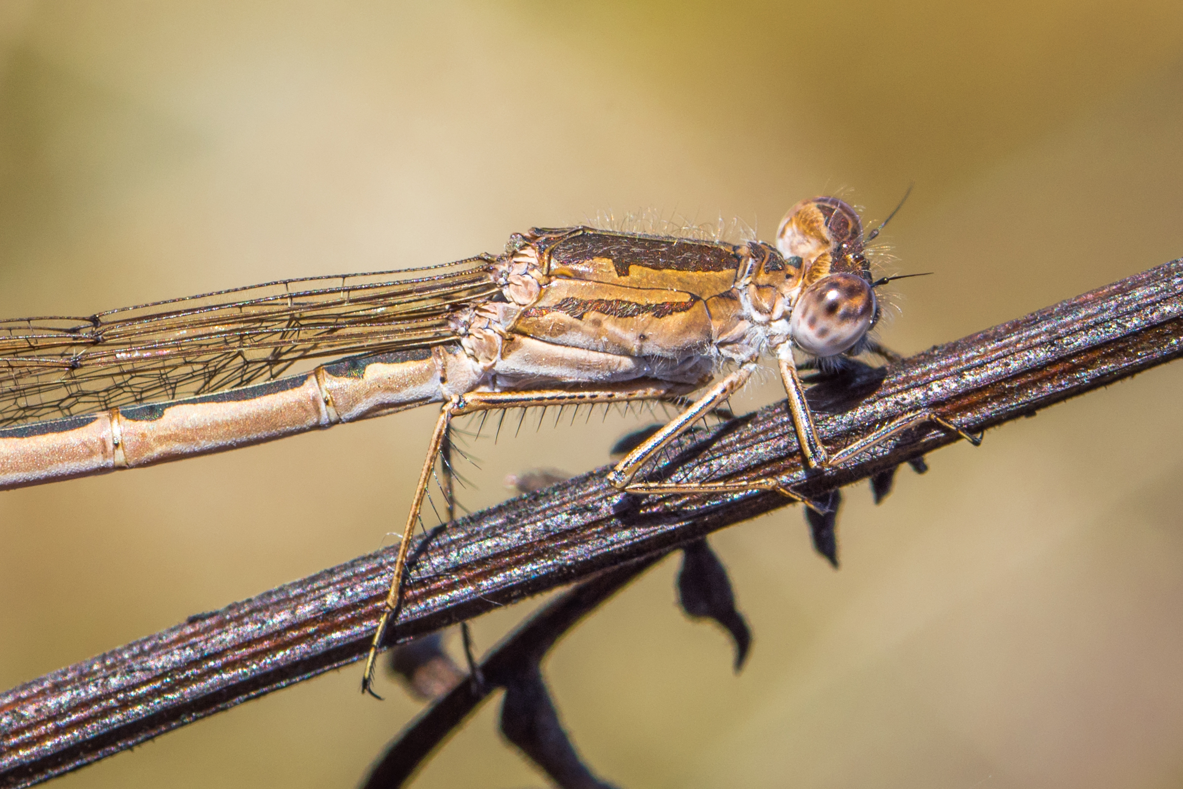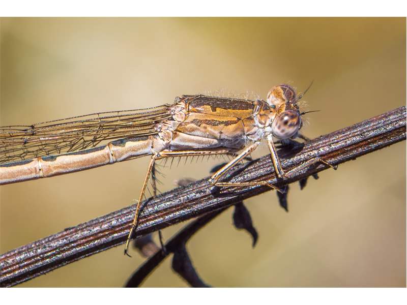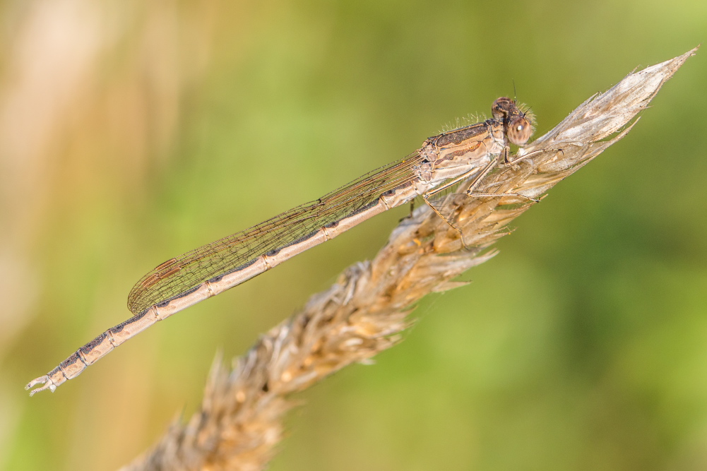 Sympecma fusca), bei dieser Art hat der hellbraune Seitenstreifen am Thorax einen geraden Oberrand.