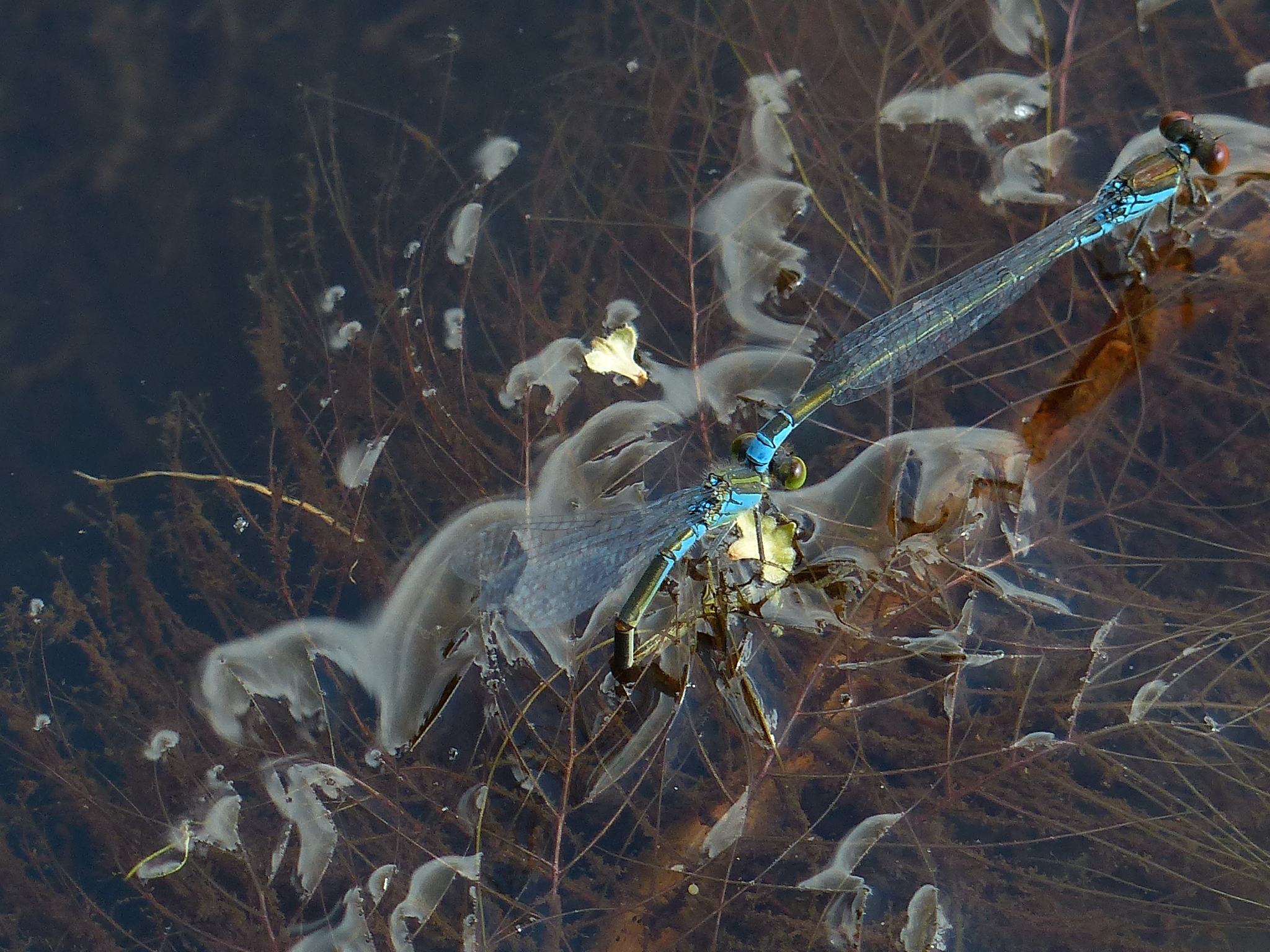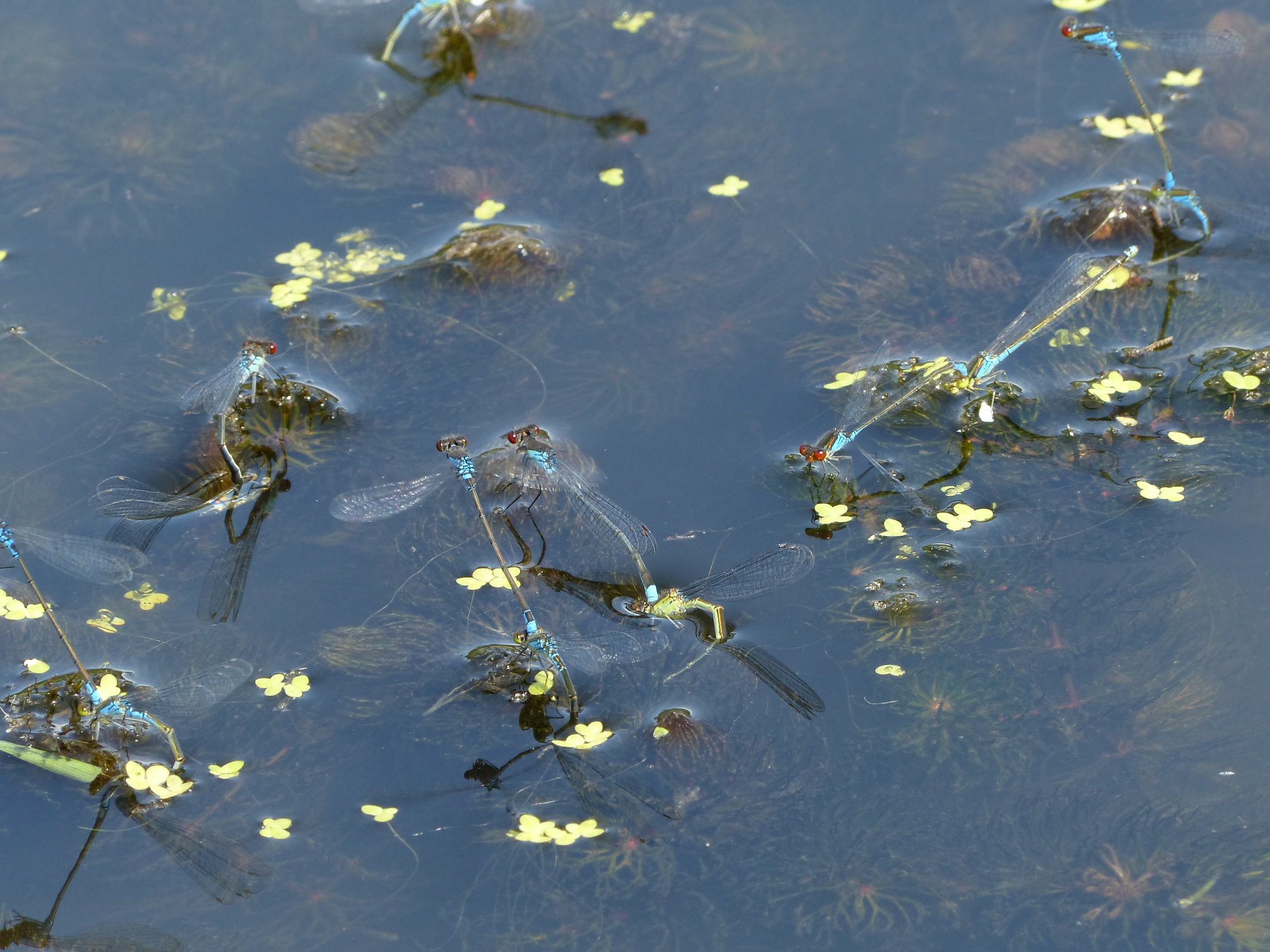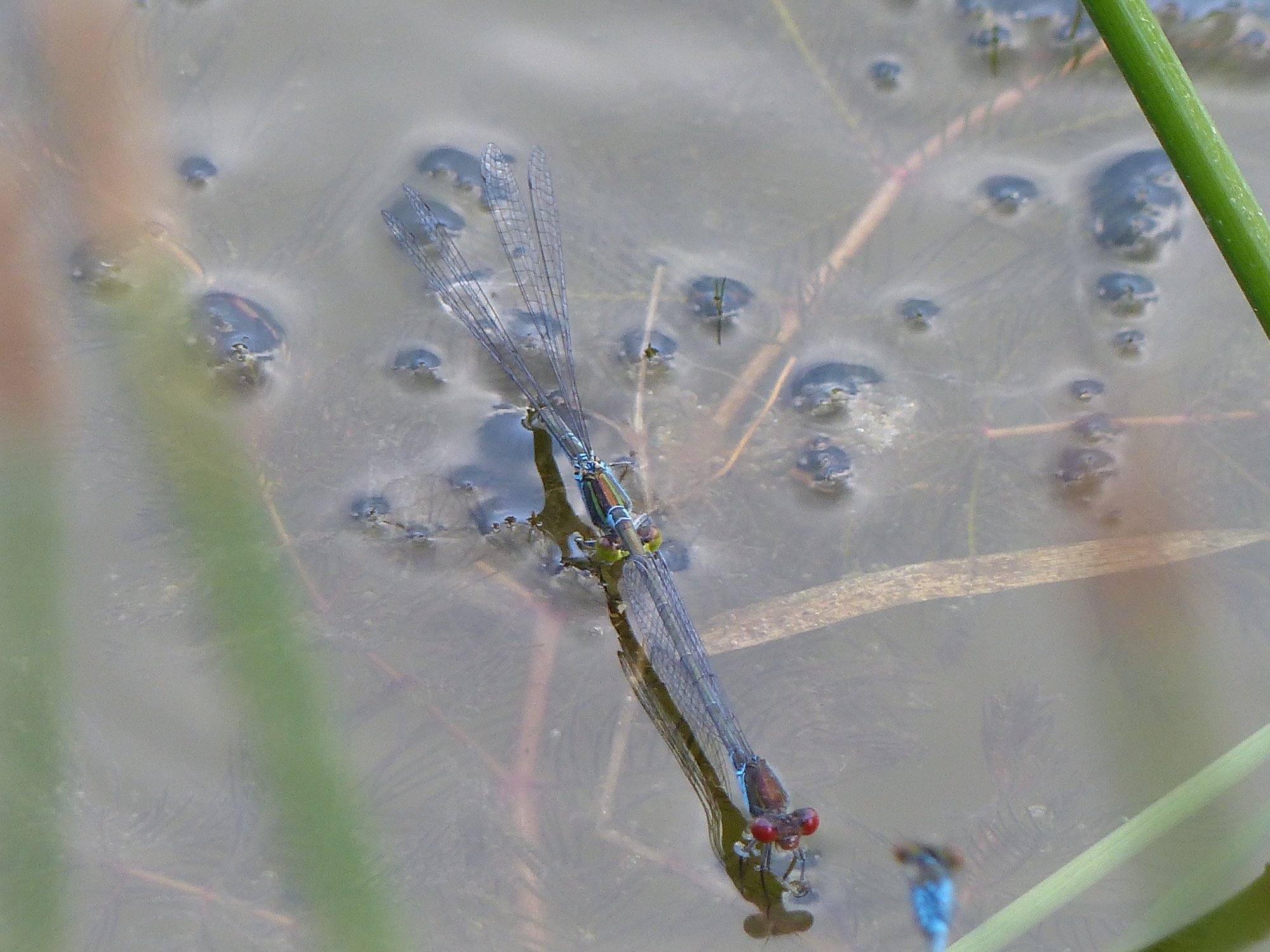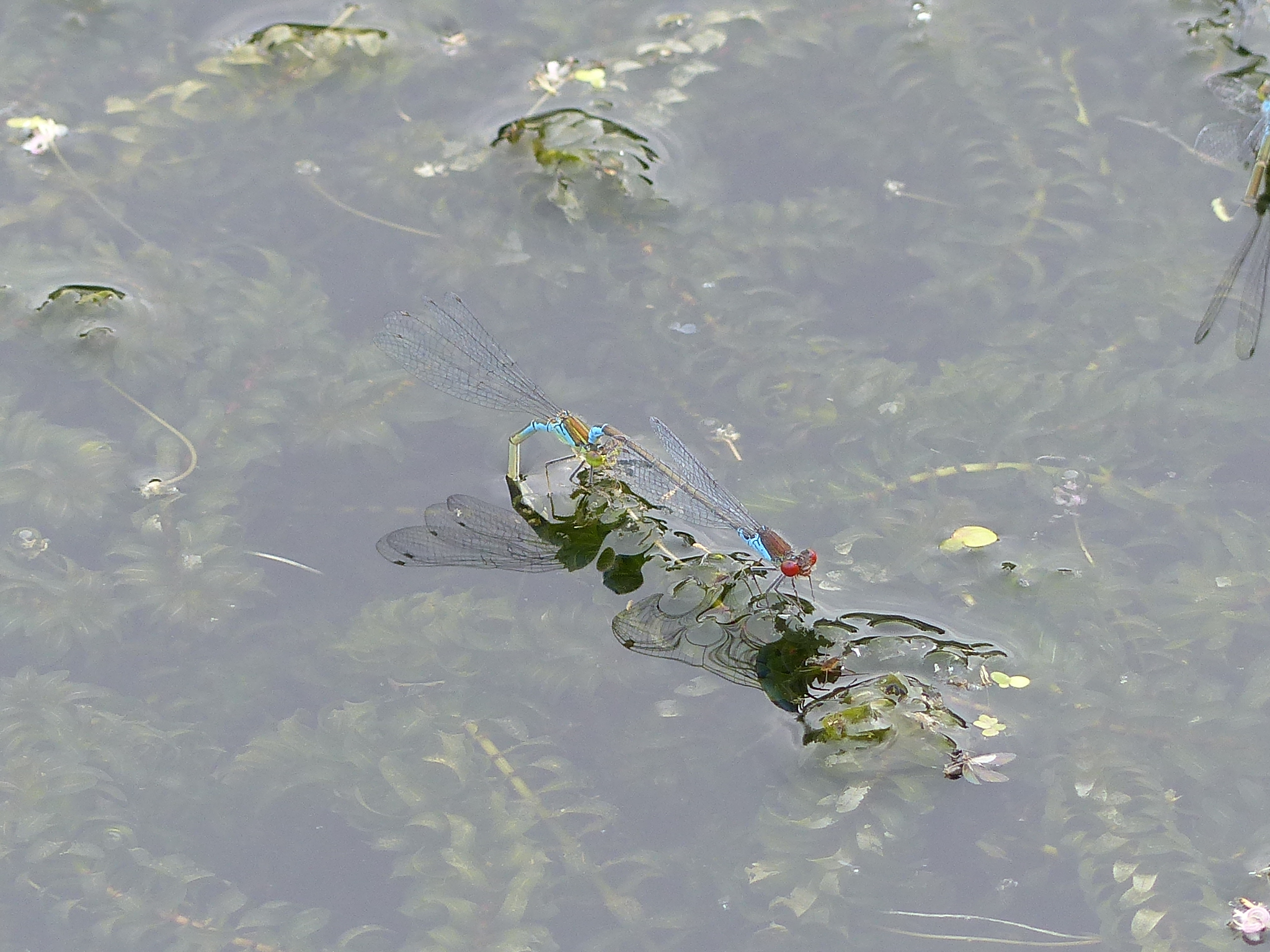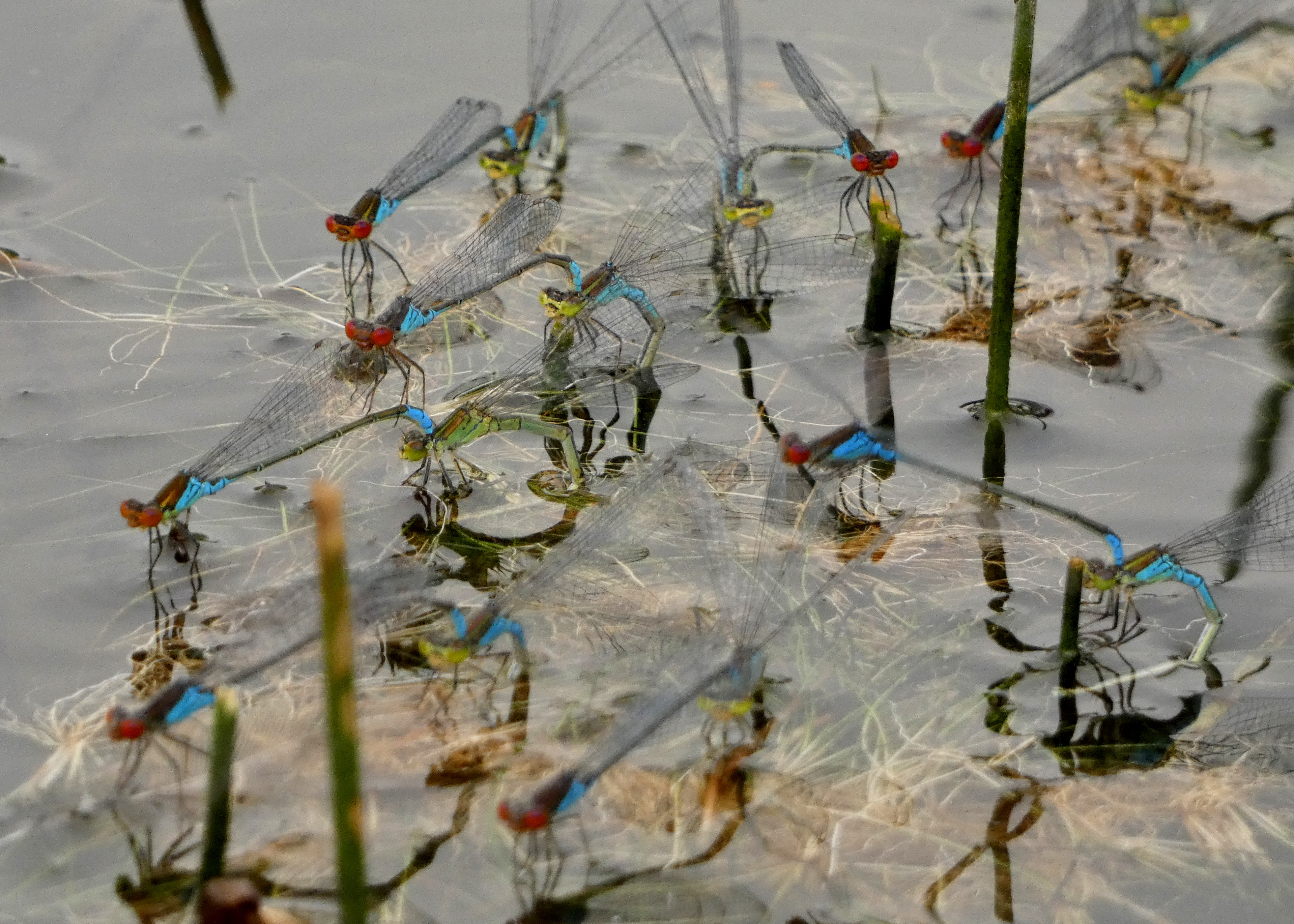 Kleiner Ausschnitt einer Massen-Eiablage des Kleinen Granatauge am Libellenteich an der Halde Berzdorf im August 2016, dazwischen einzelne Paare des Großen Granatauge