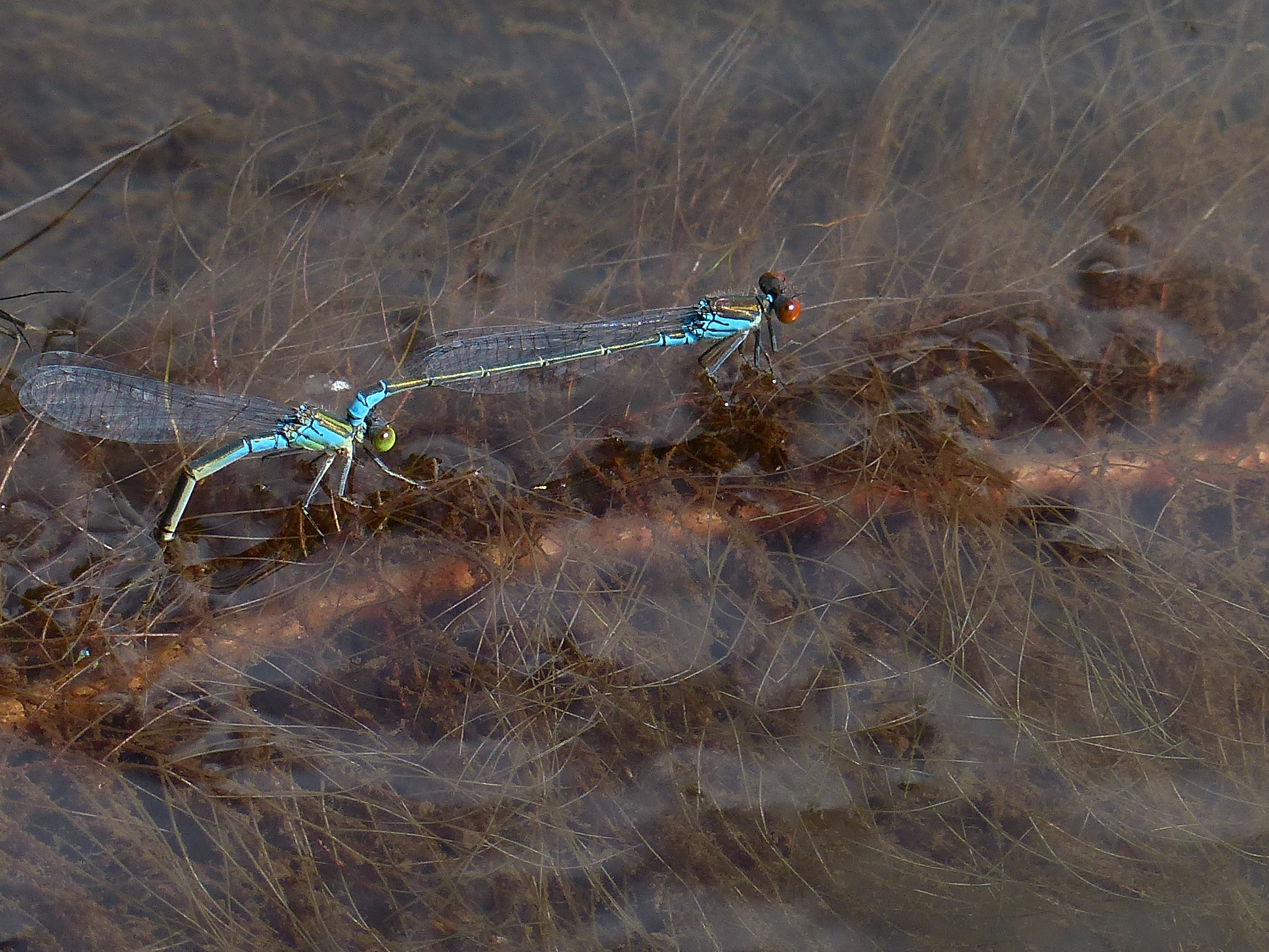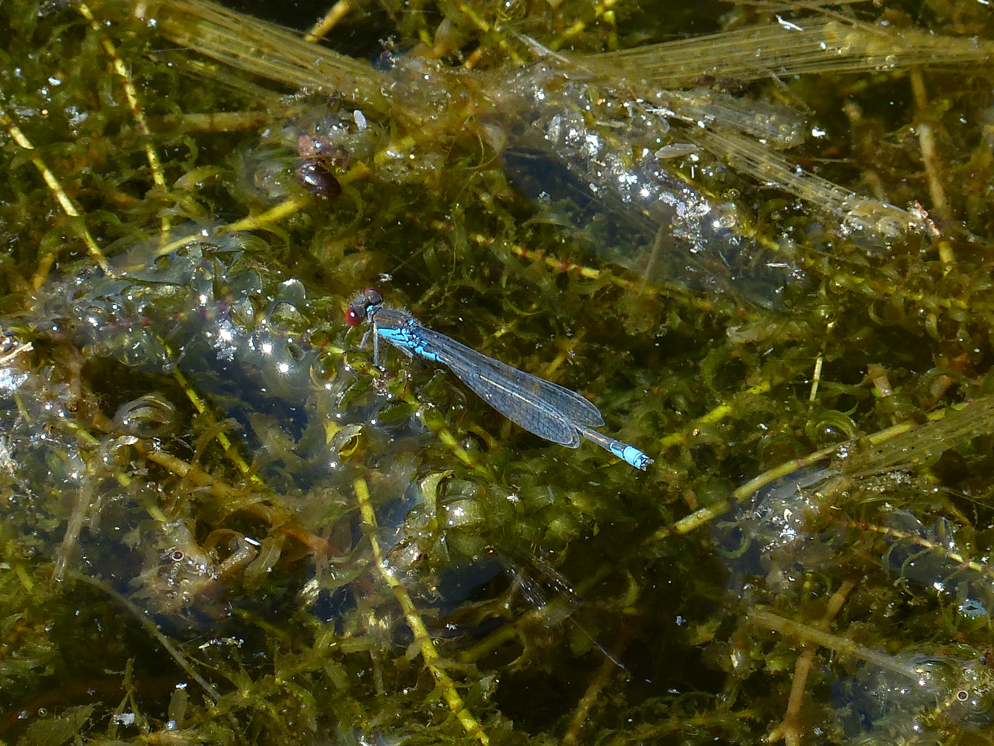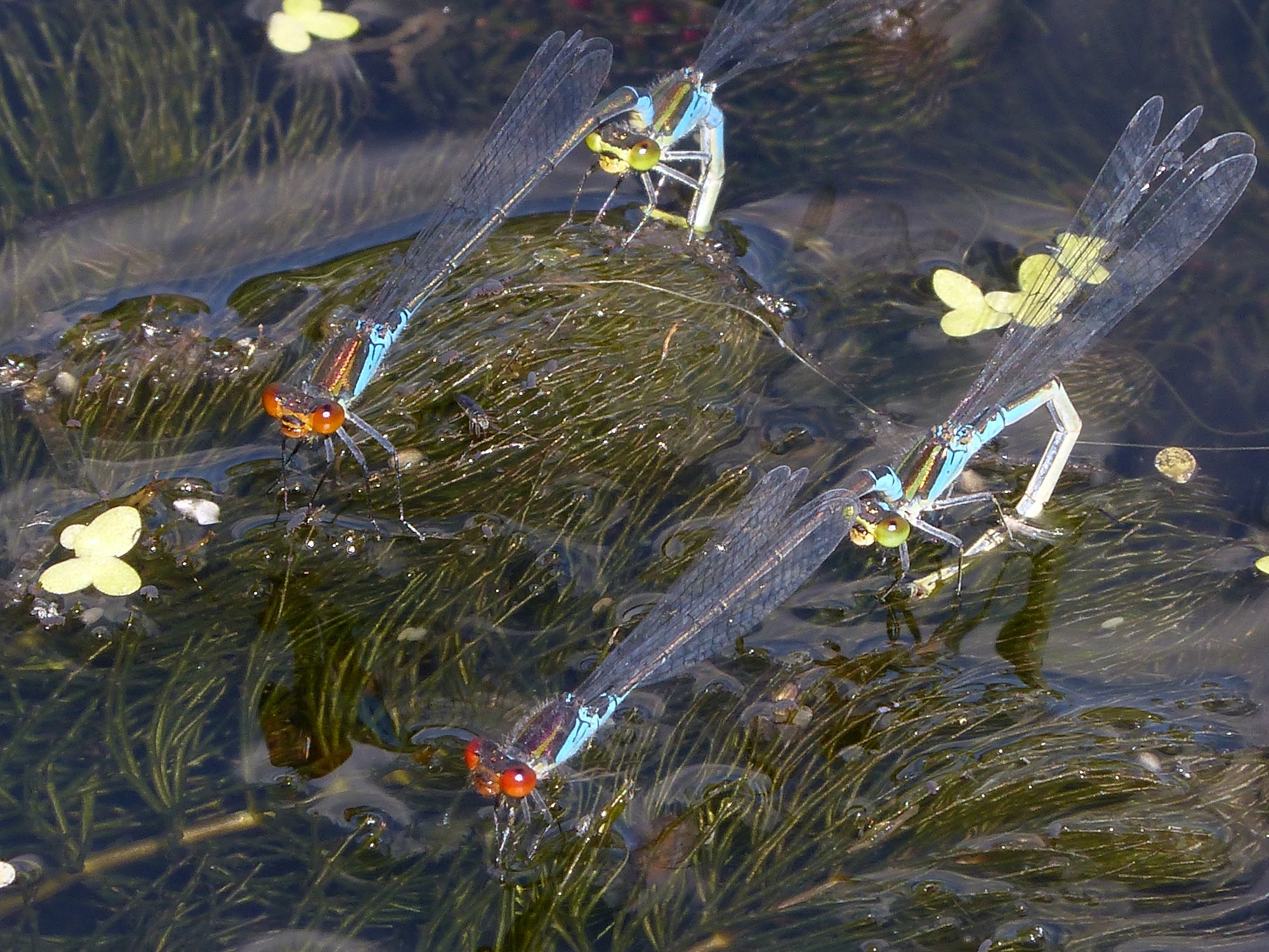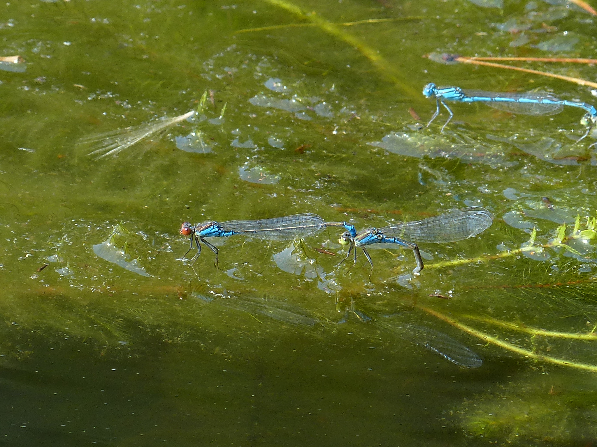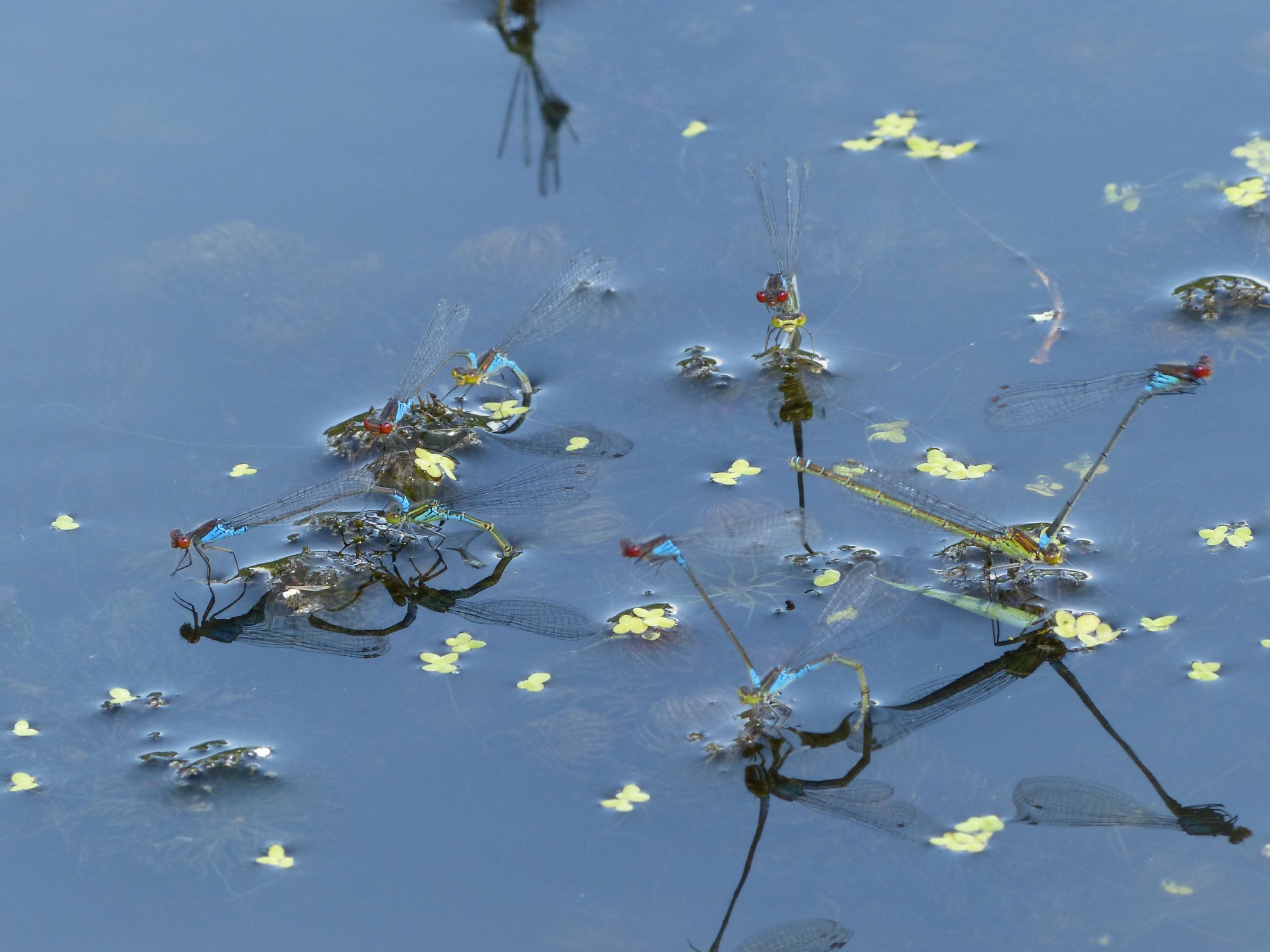 Kleiner Ausschnitt einer Massen-Eiablage des Kleinen Granatauge am Libellenteich an der Halde Berzdorf im August 2016, dazwischen einzelne Paare des Großen Granatauge