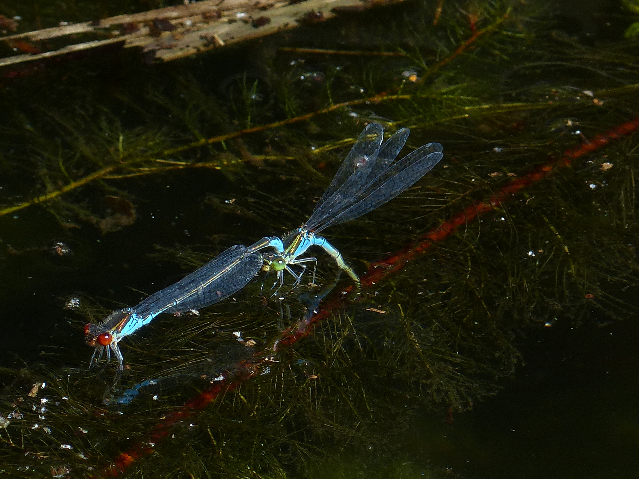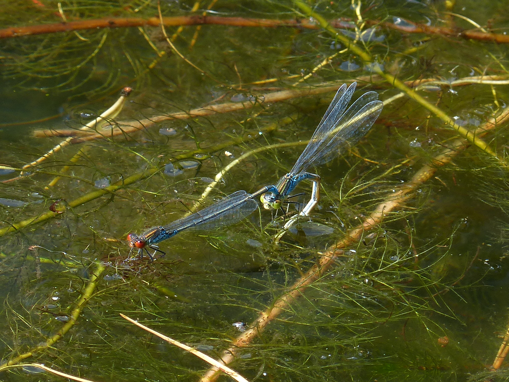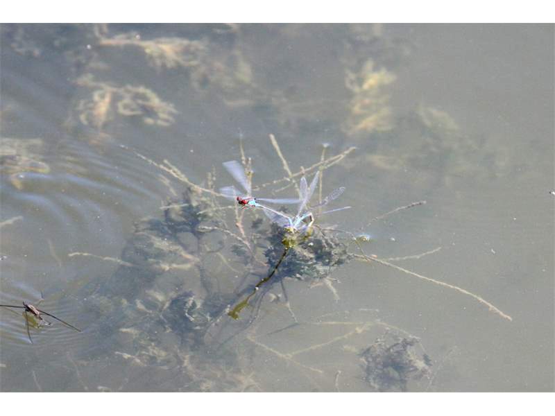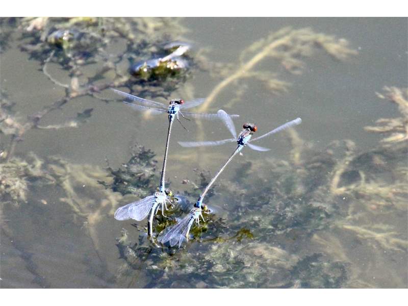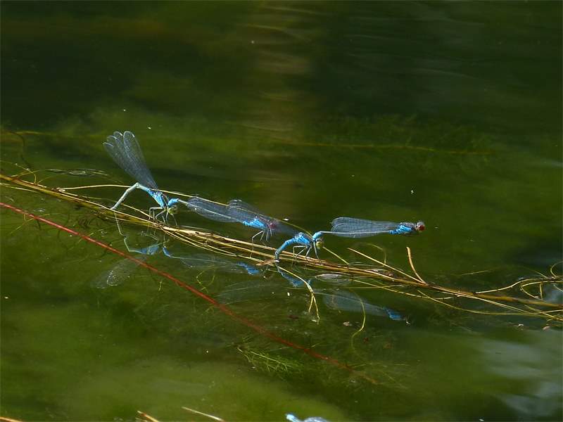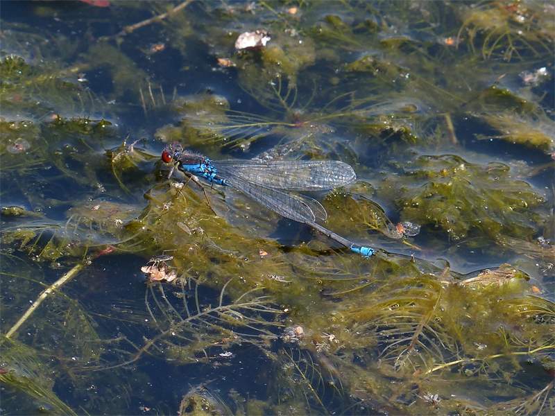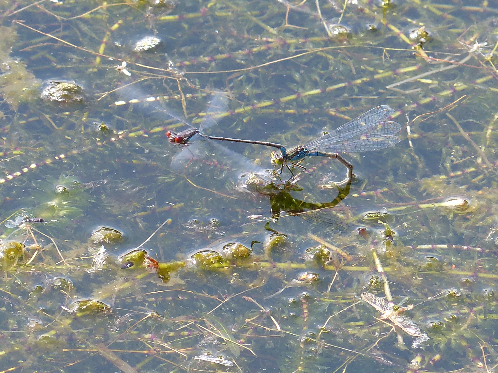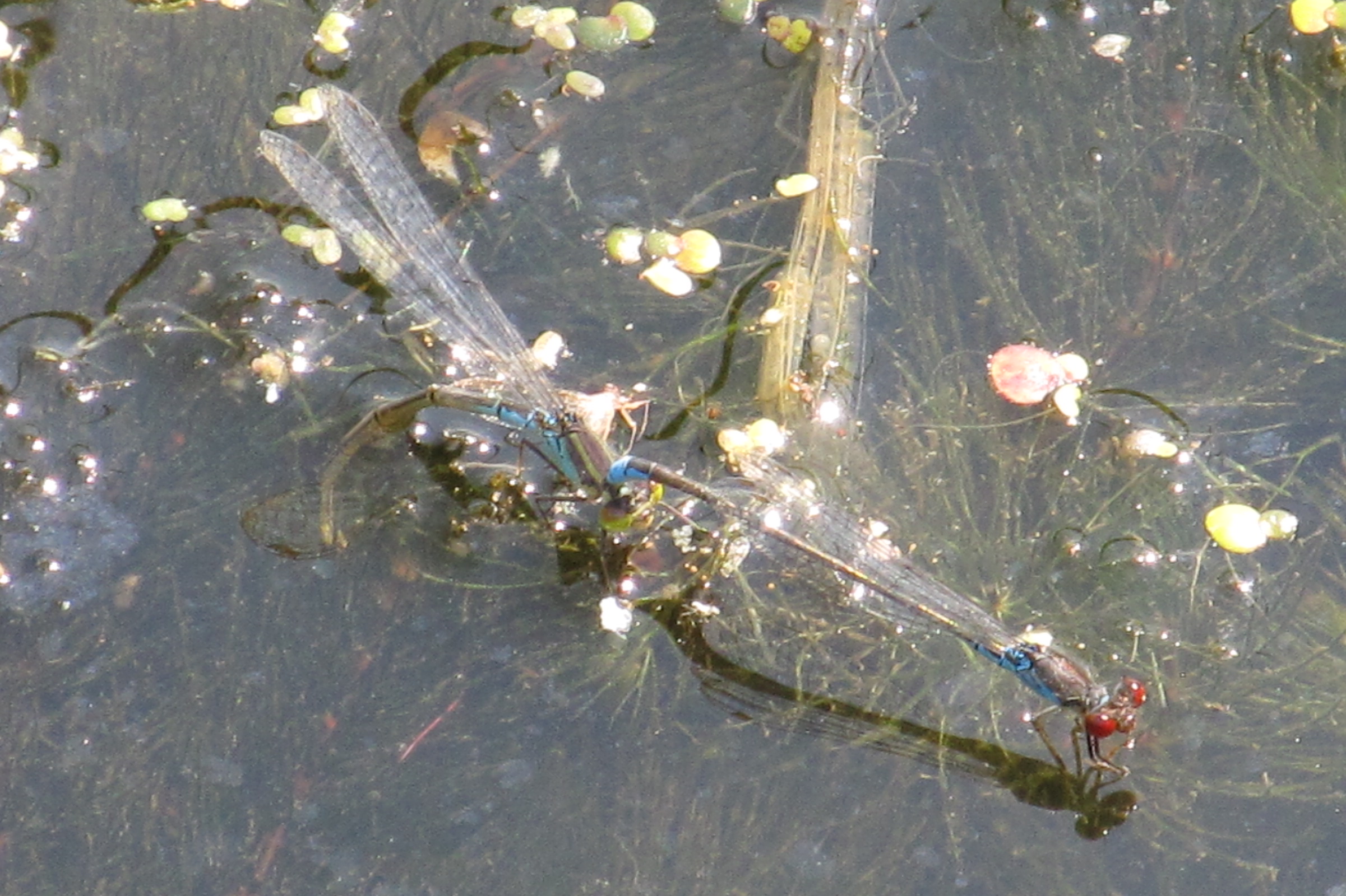 Kleiner Ausschnitt einer Massen-Eiablage des Kleinen Granatauge am Libellenteich an der Halde Berzdorf im August 2016, dazwischen einzelne Paare des Großen Granatauge