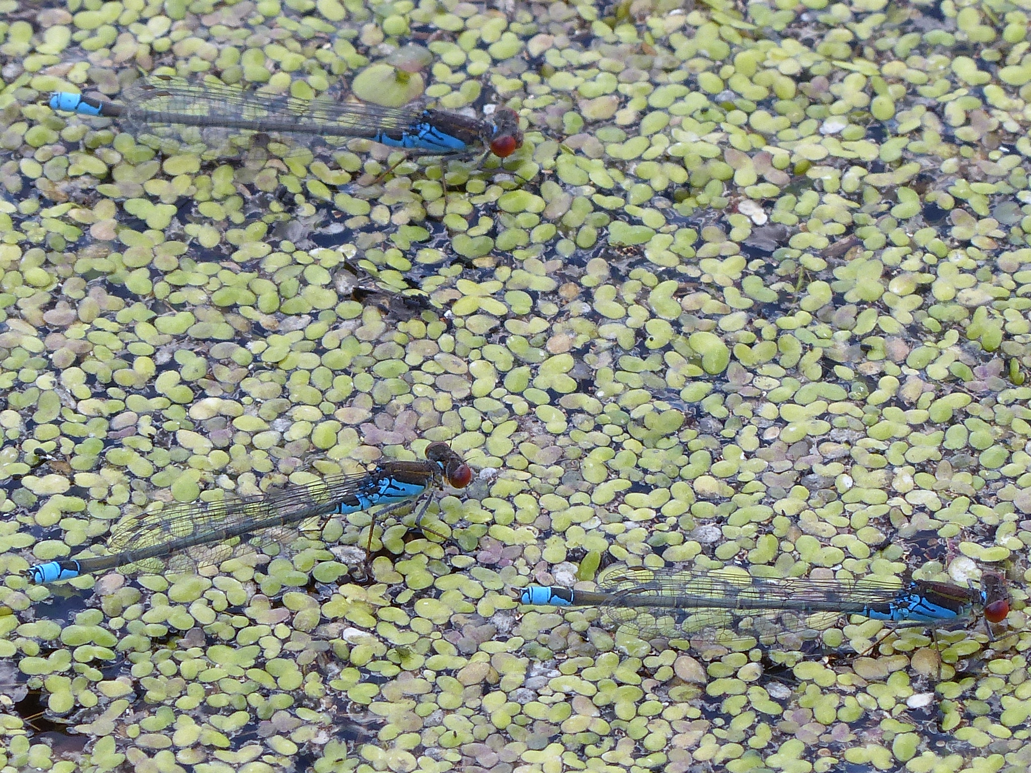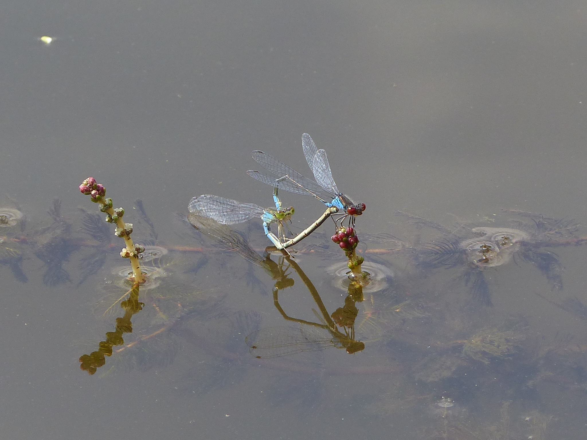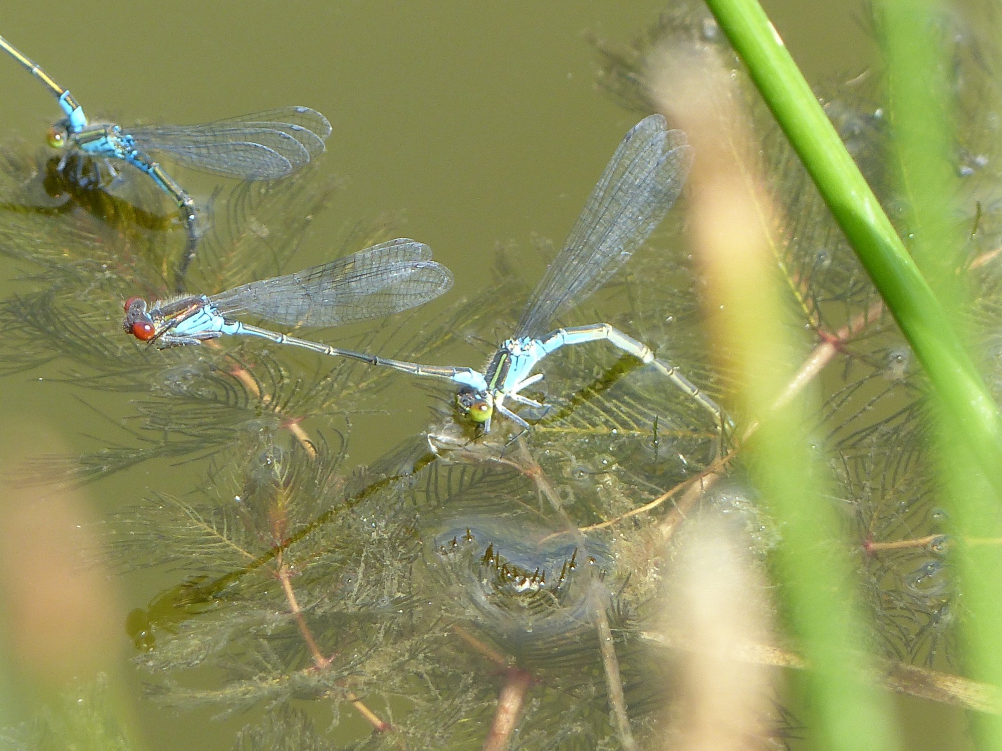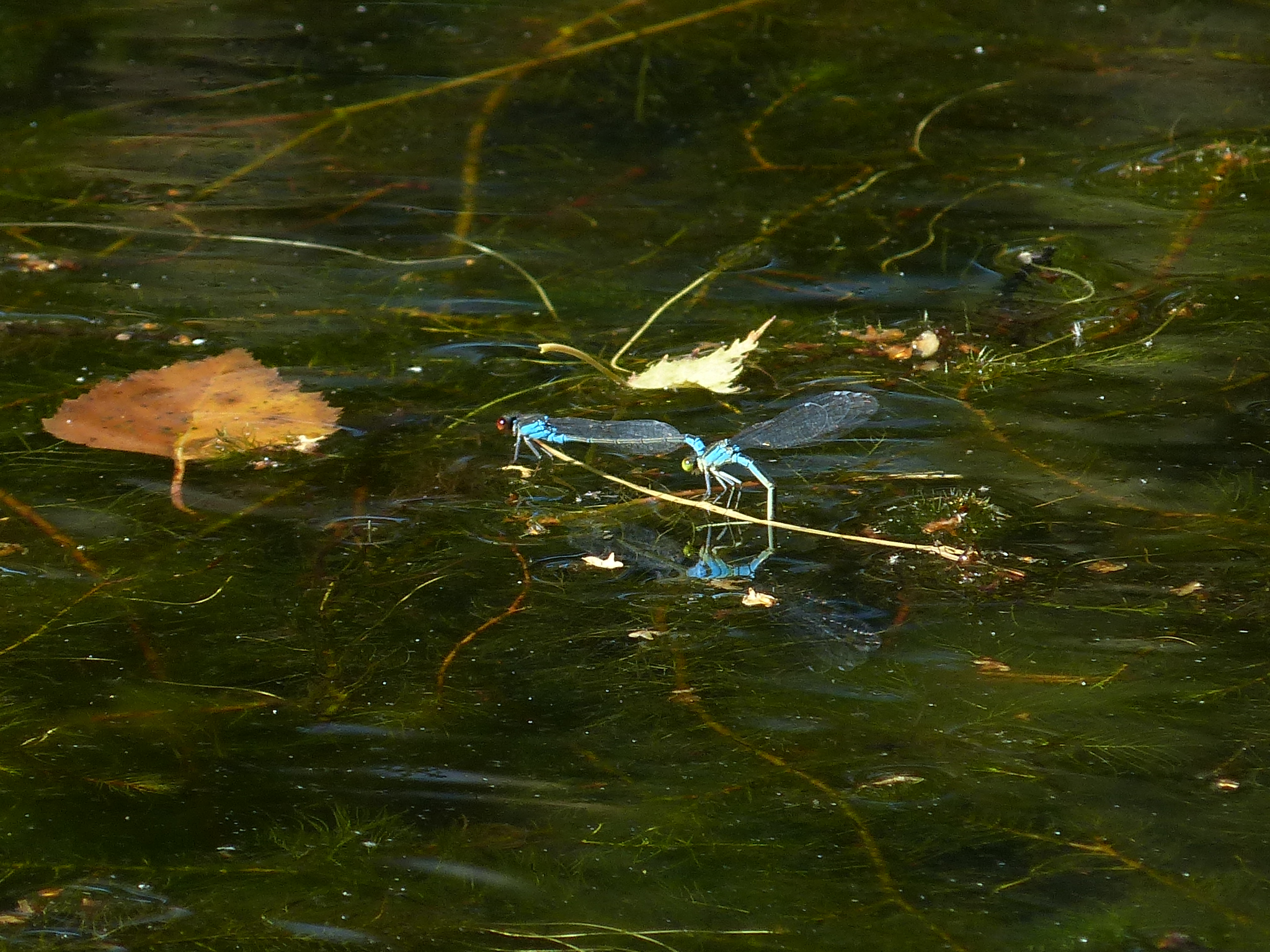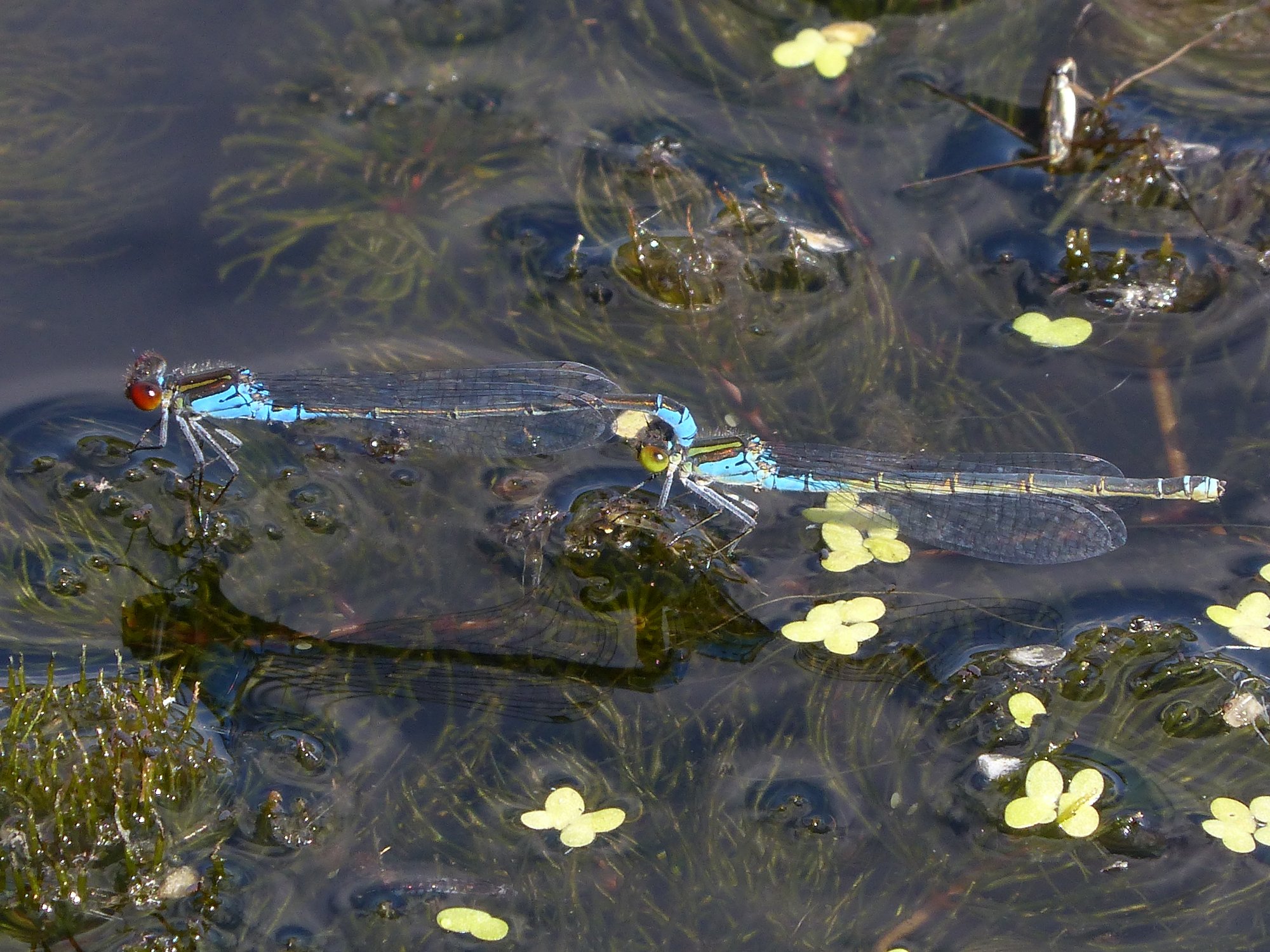 Kleiner Ausschnitt einer Massen-Eiablage des Kleinen Granatauge am Libellenteich an der Halde Berzdorf im August 2016, dazwischen einzelne Paare des Großen Granatauge
