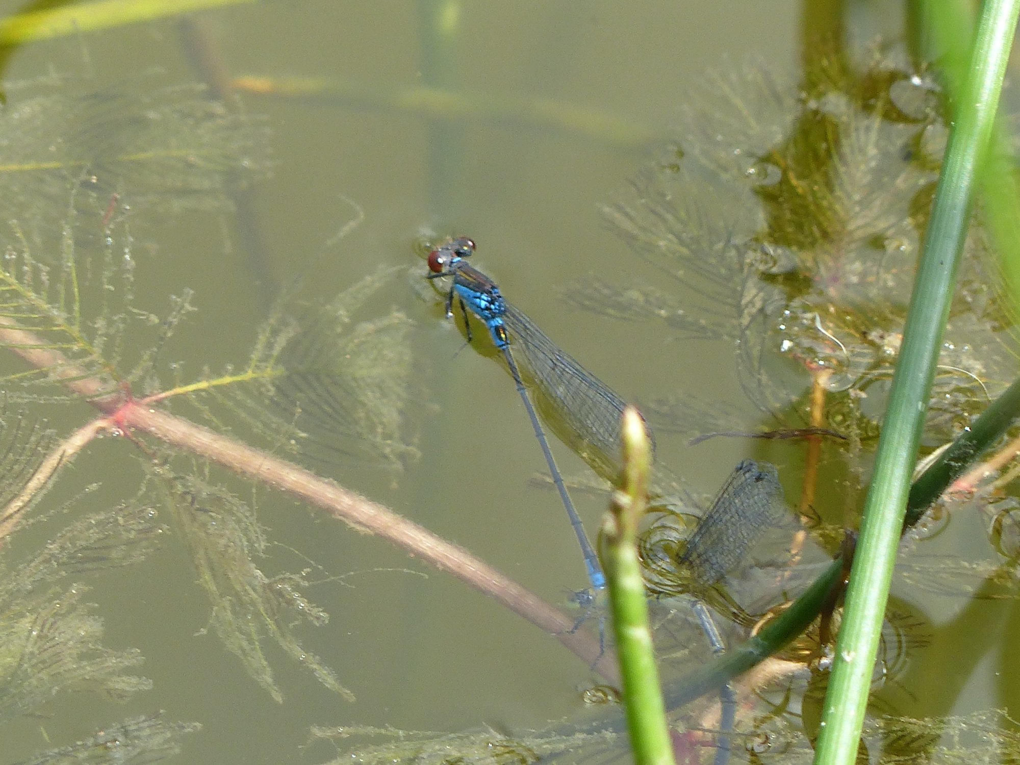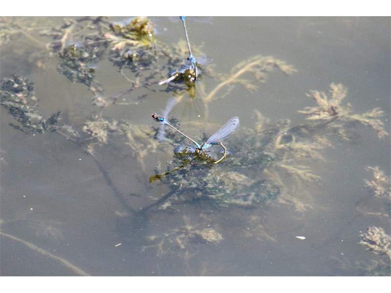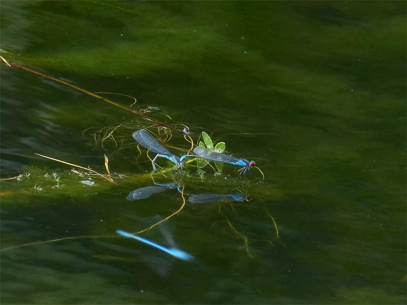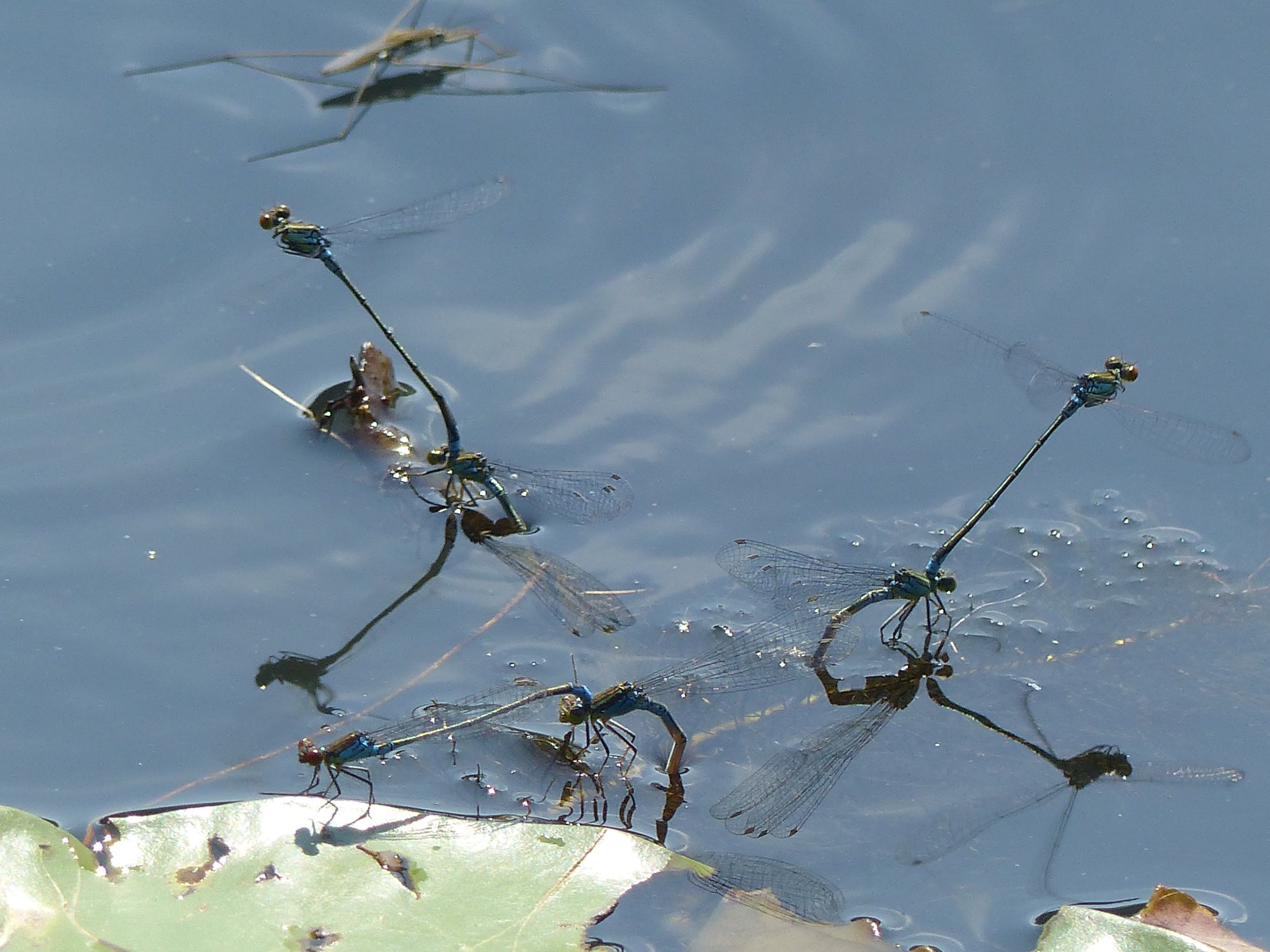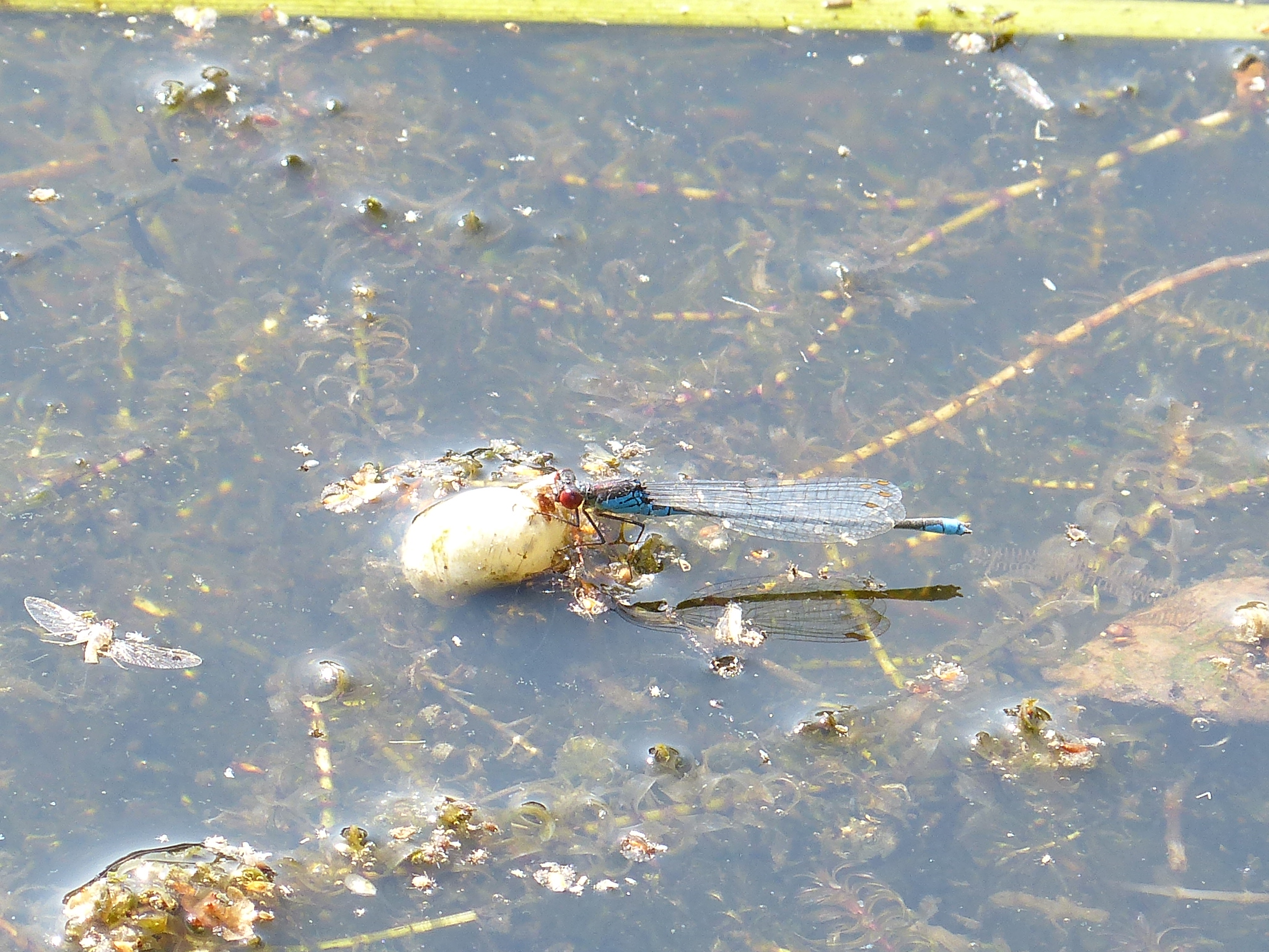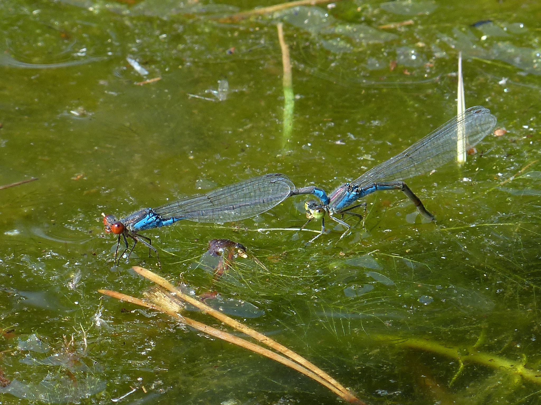 Kleiner Ausschnitt einer Massen-Eiablage des Kleinen Granatauge am Libellenteich an der Halde Berzdorf im August 2016, dazwischen einzelne Paare des Großen Granatauge