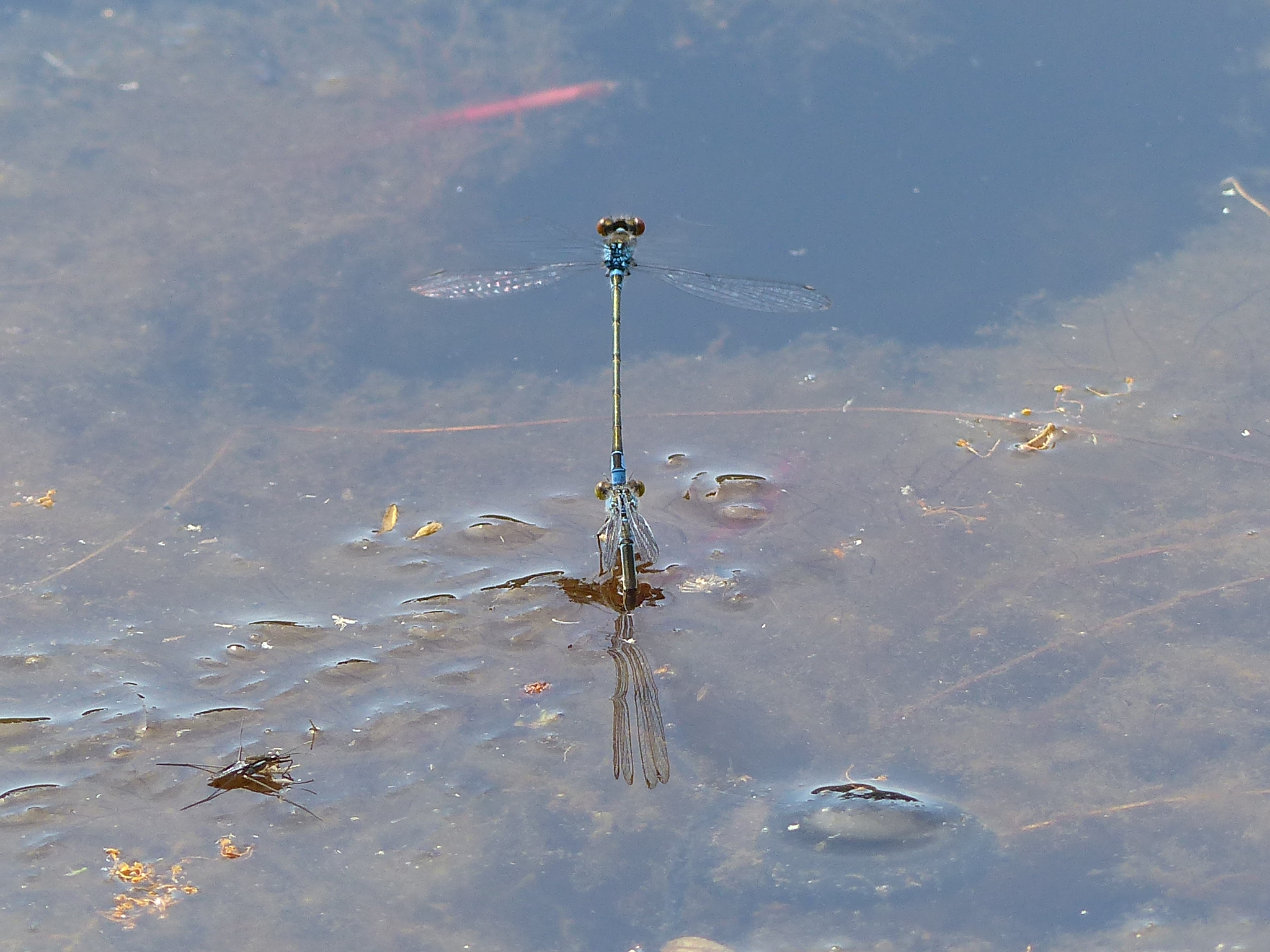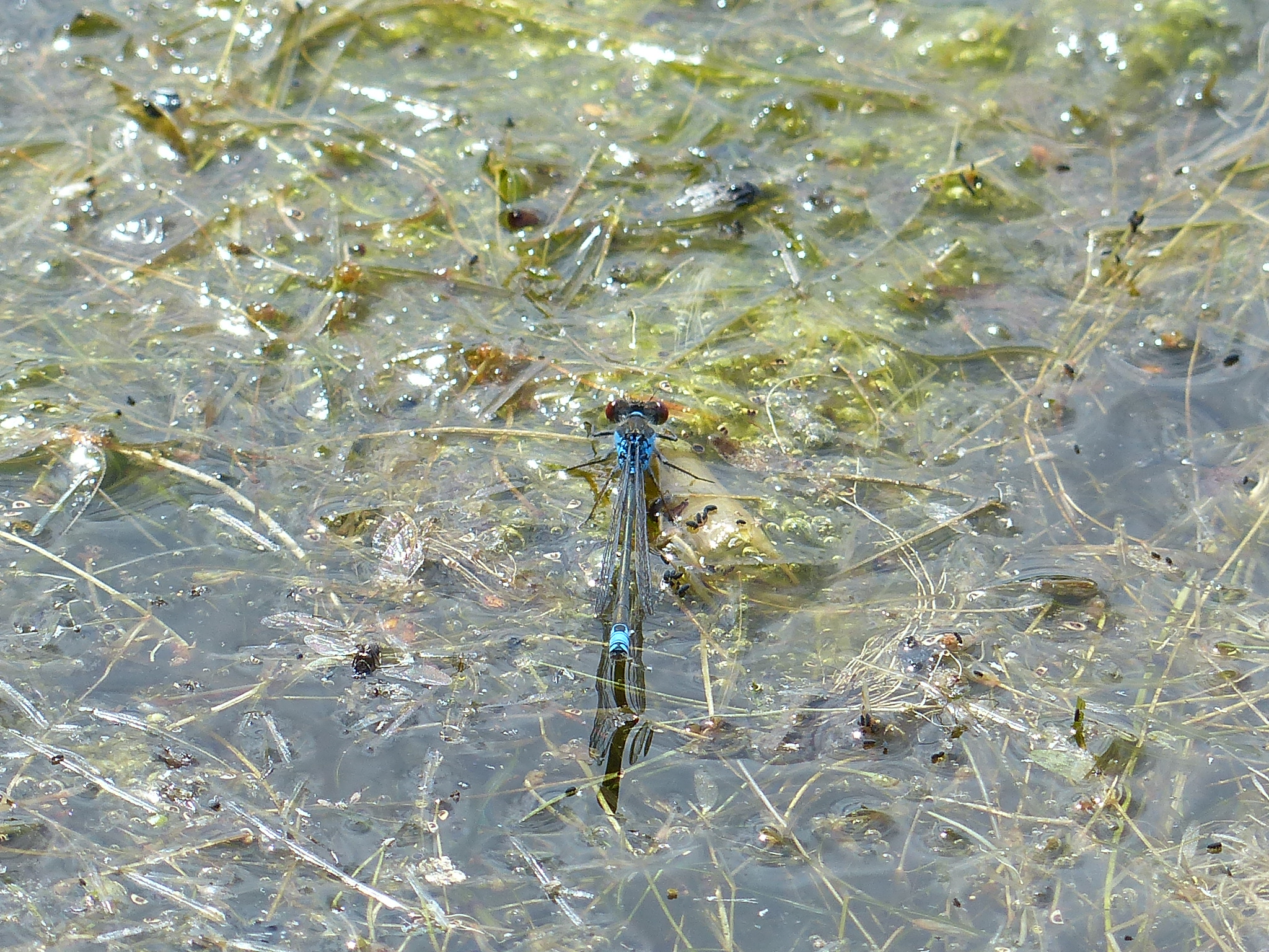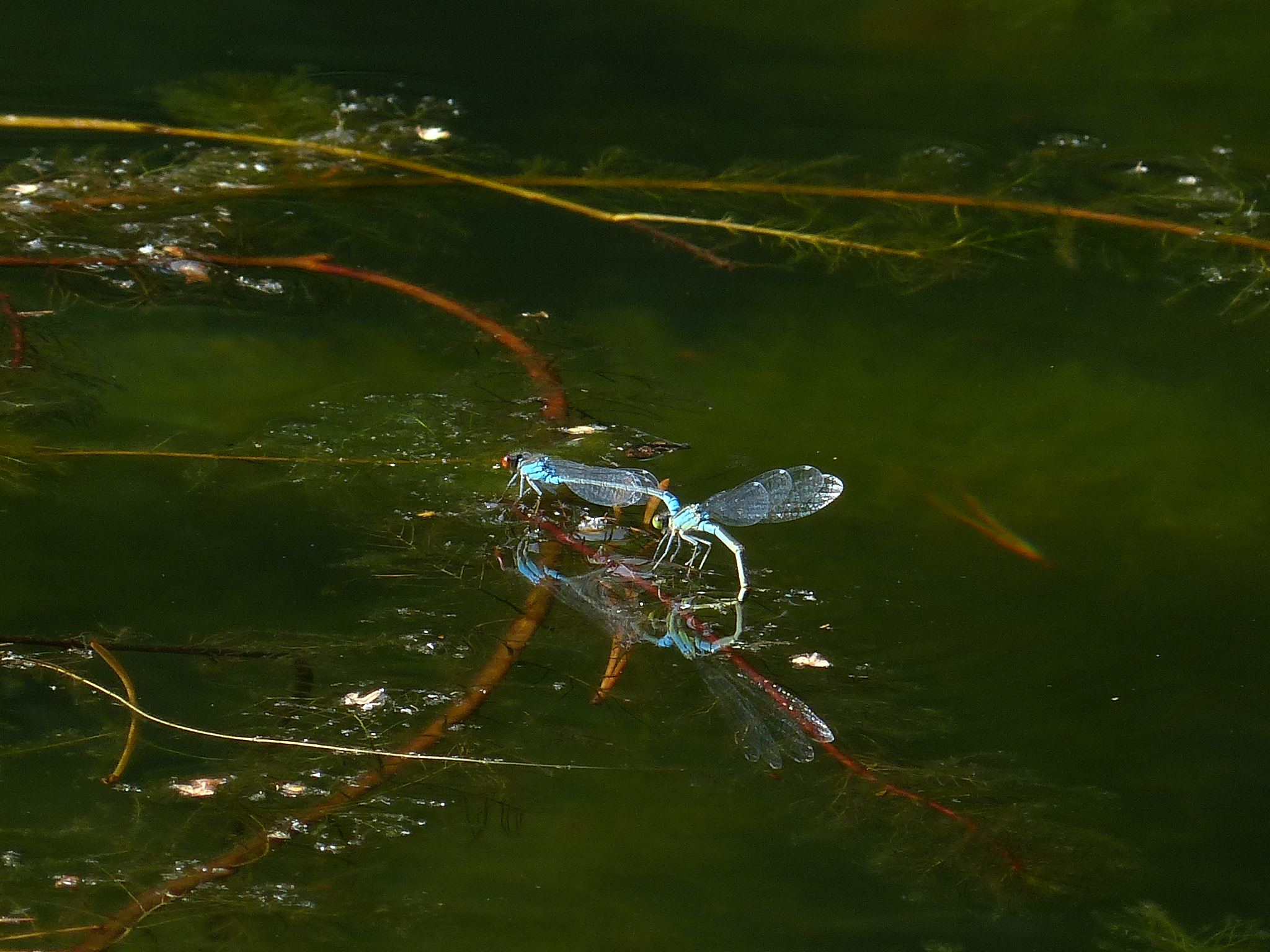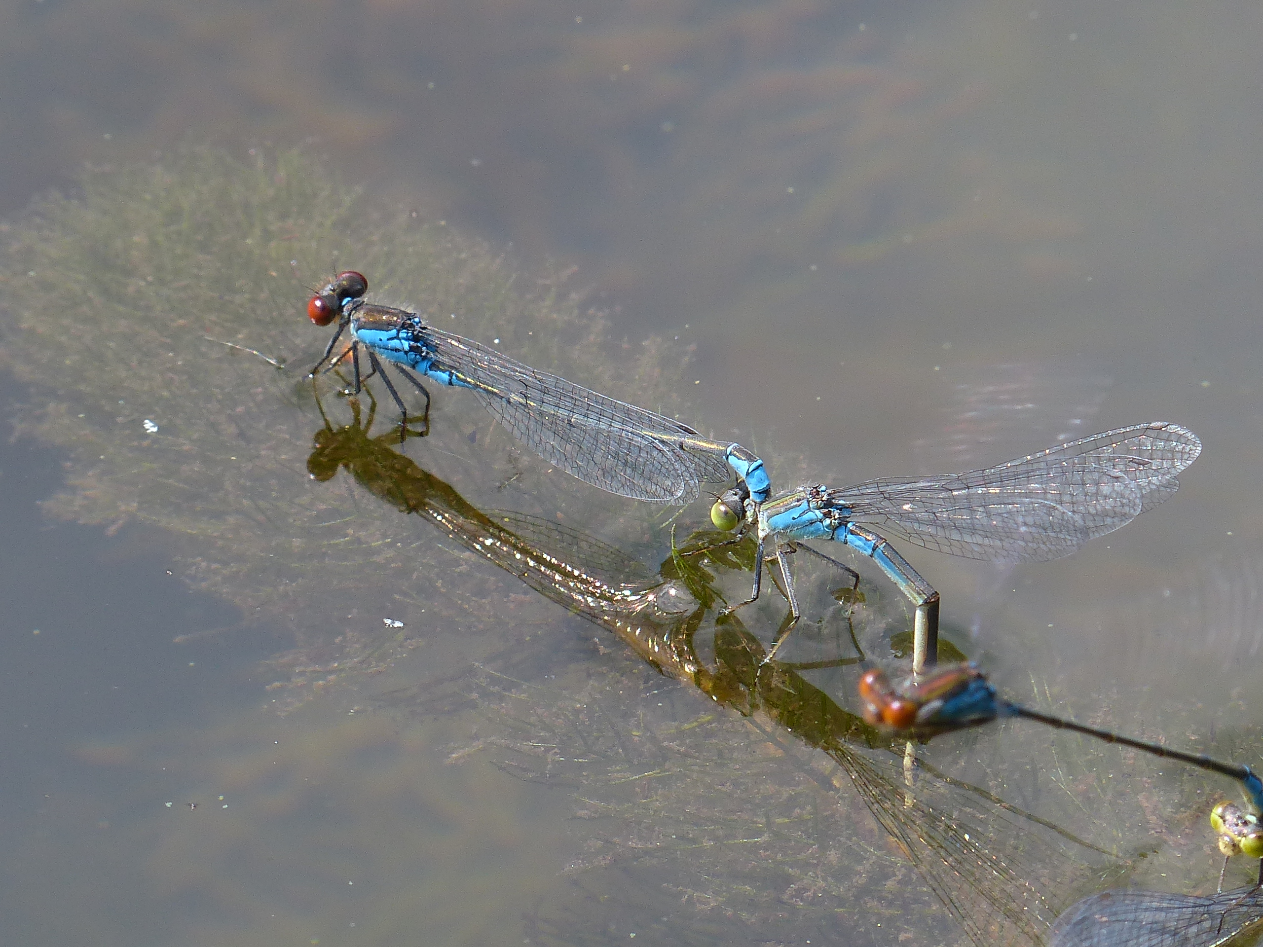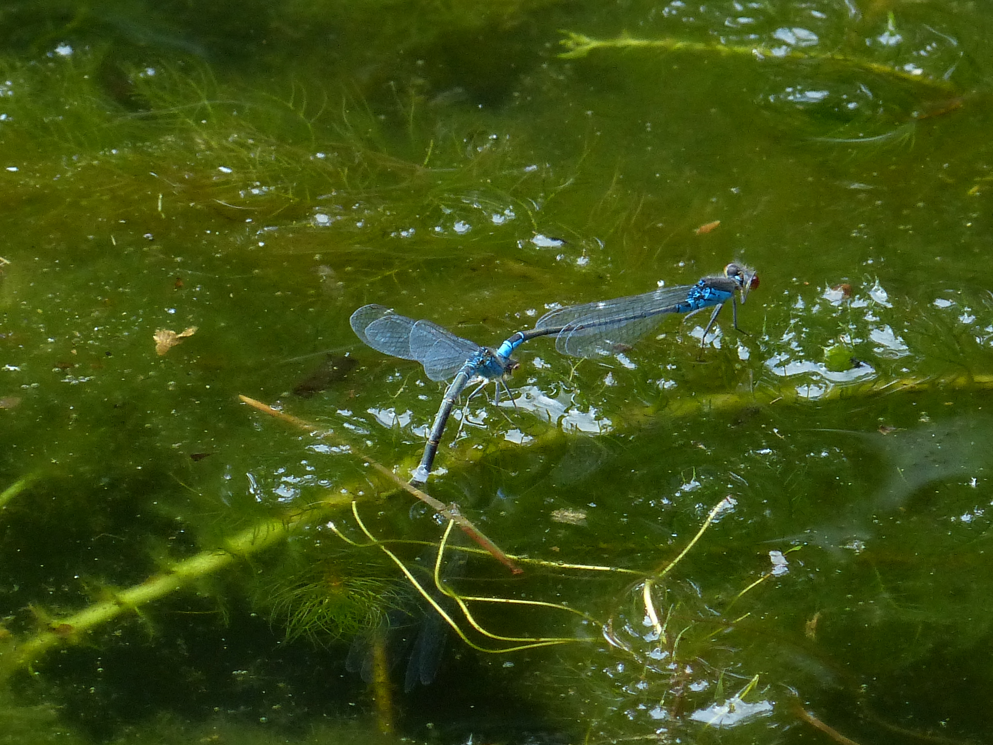 Kleiner Ausschnitt einer Massen-Eiablage des Kleinen Granatauge am Libellenteich an der Halde Berzdorf im August 2016, dazwischen einzelne Paare des Großen Granatauge