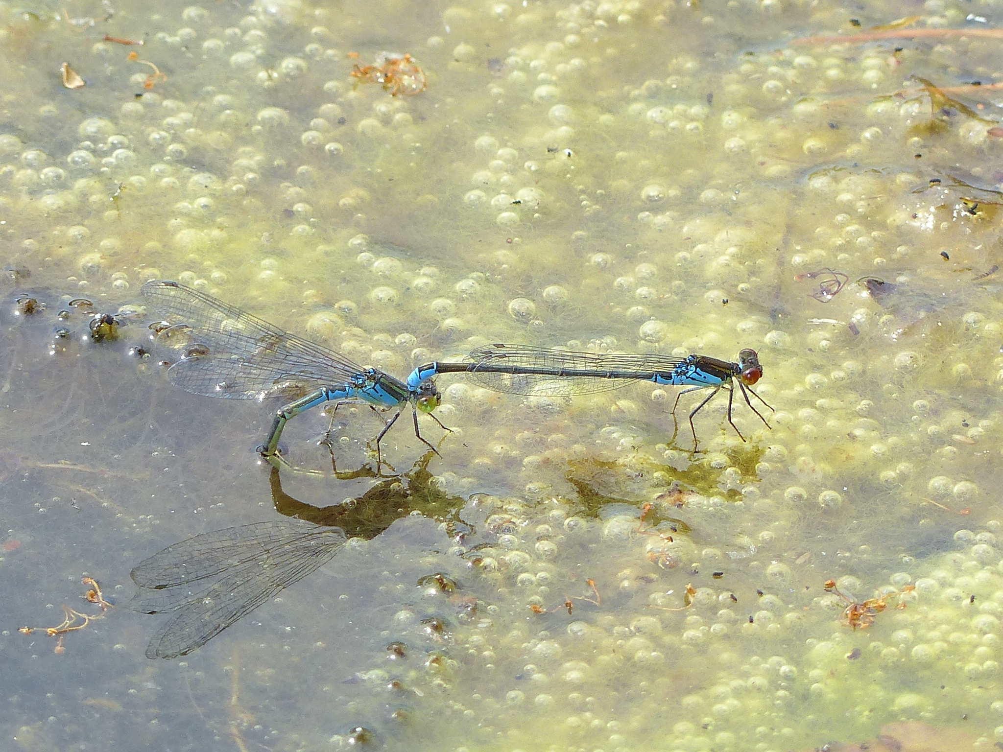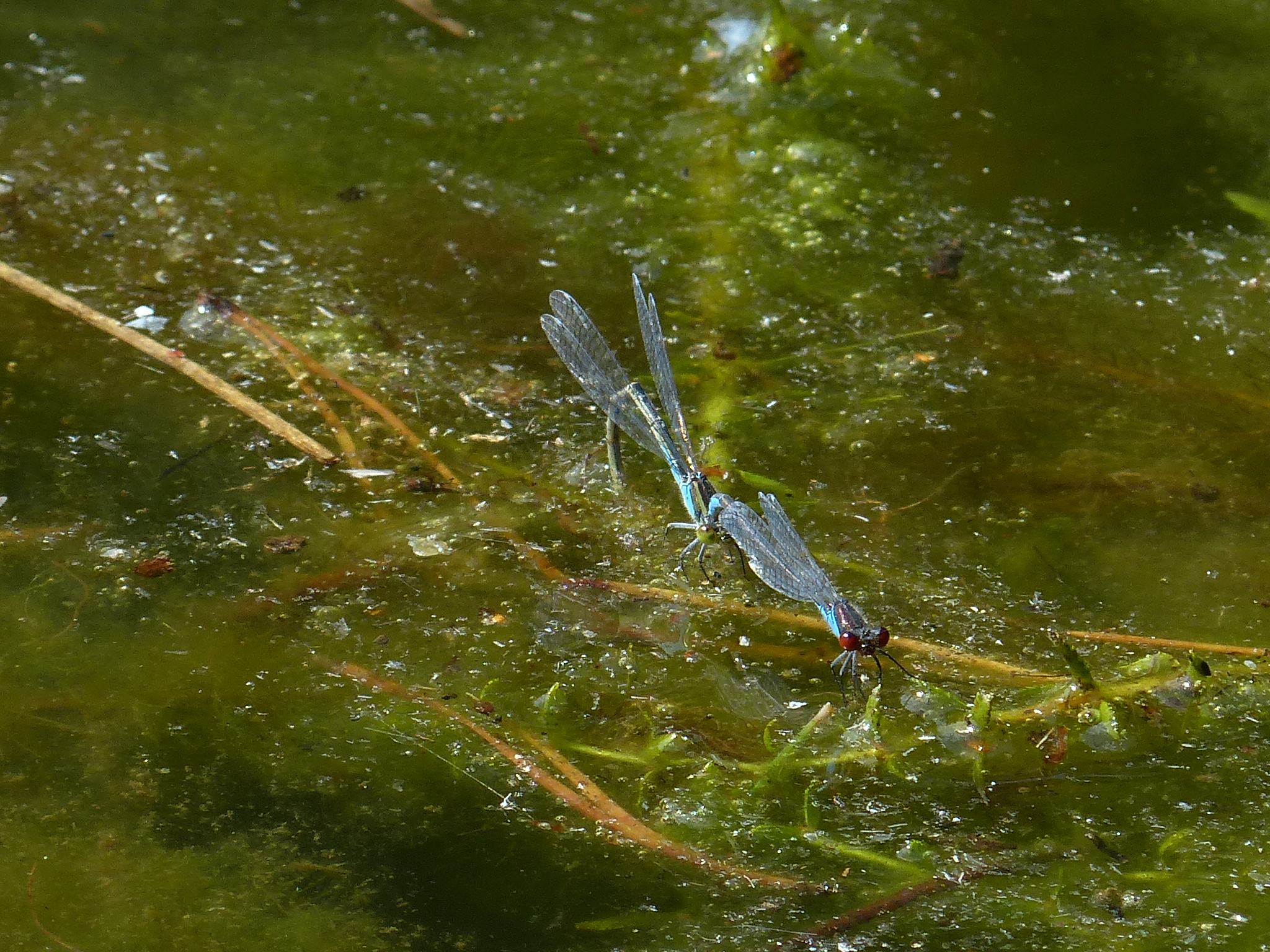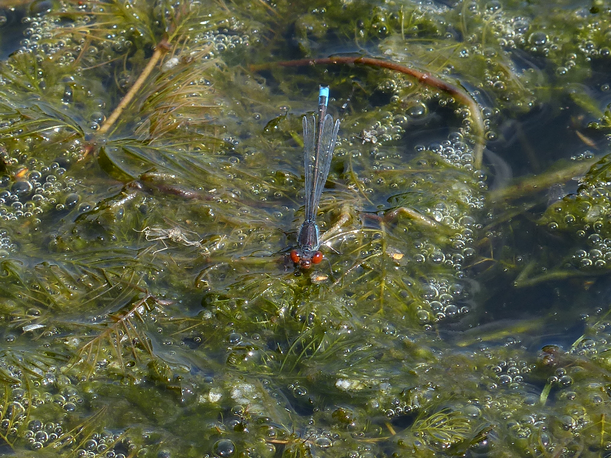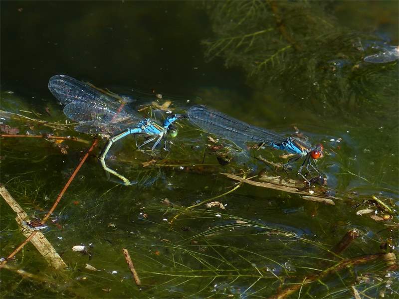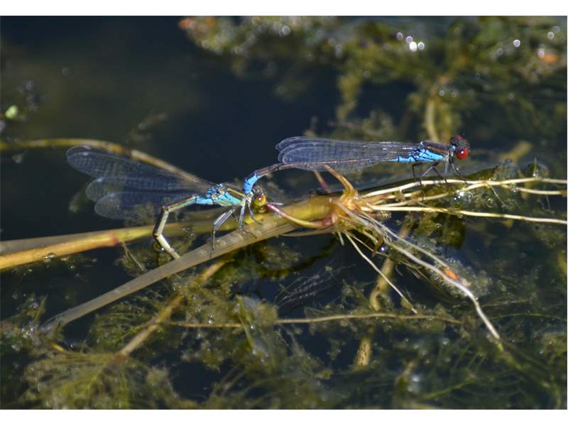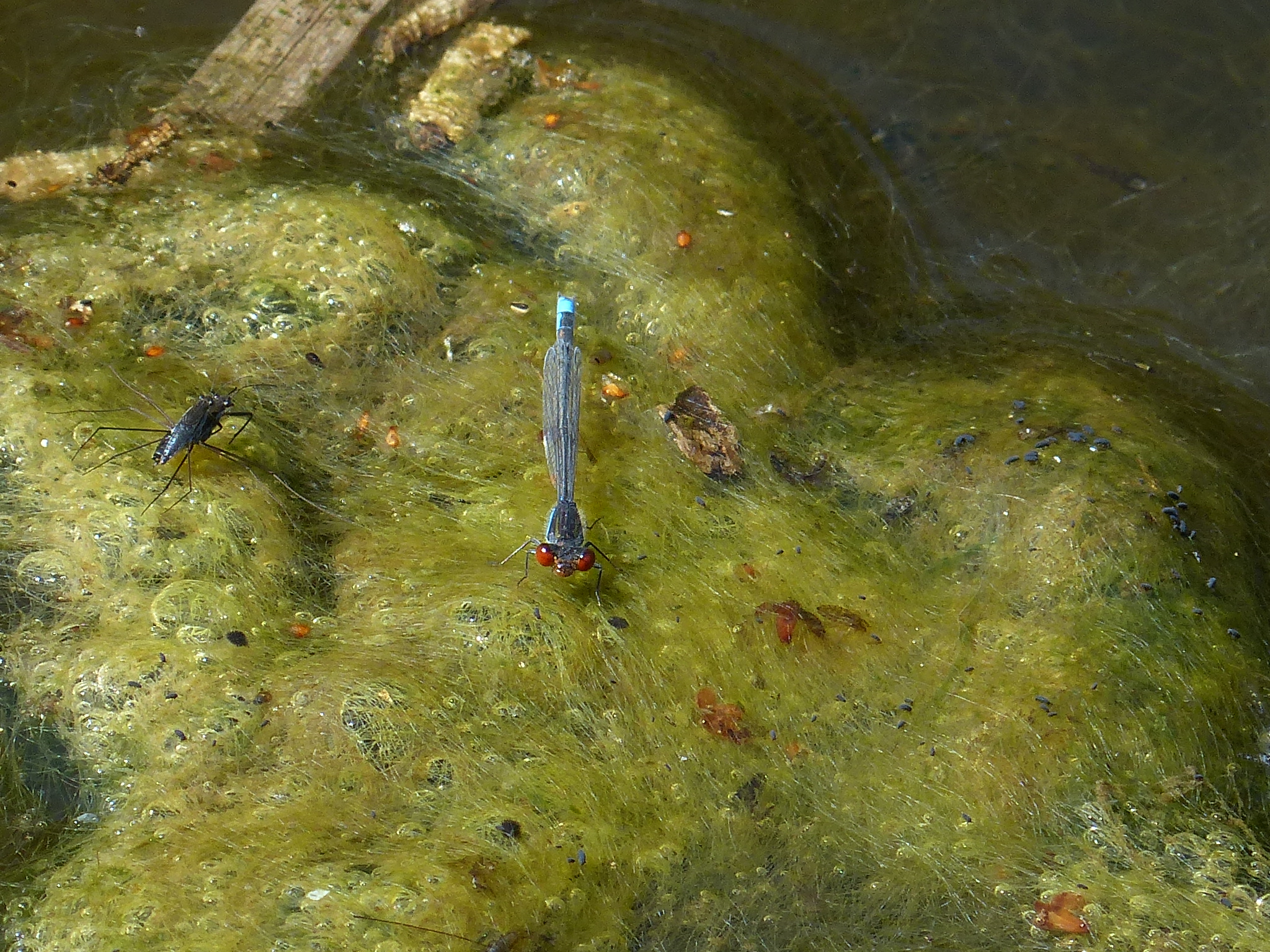 Kleiner Ausschnitt einer Massen-Eiablage des Kleinen Granatauge am Libellenteich an der Halde Berzdorf im August 2016, dazwischen einzelne Paare des Großen Granatauge