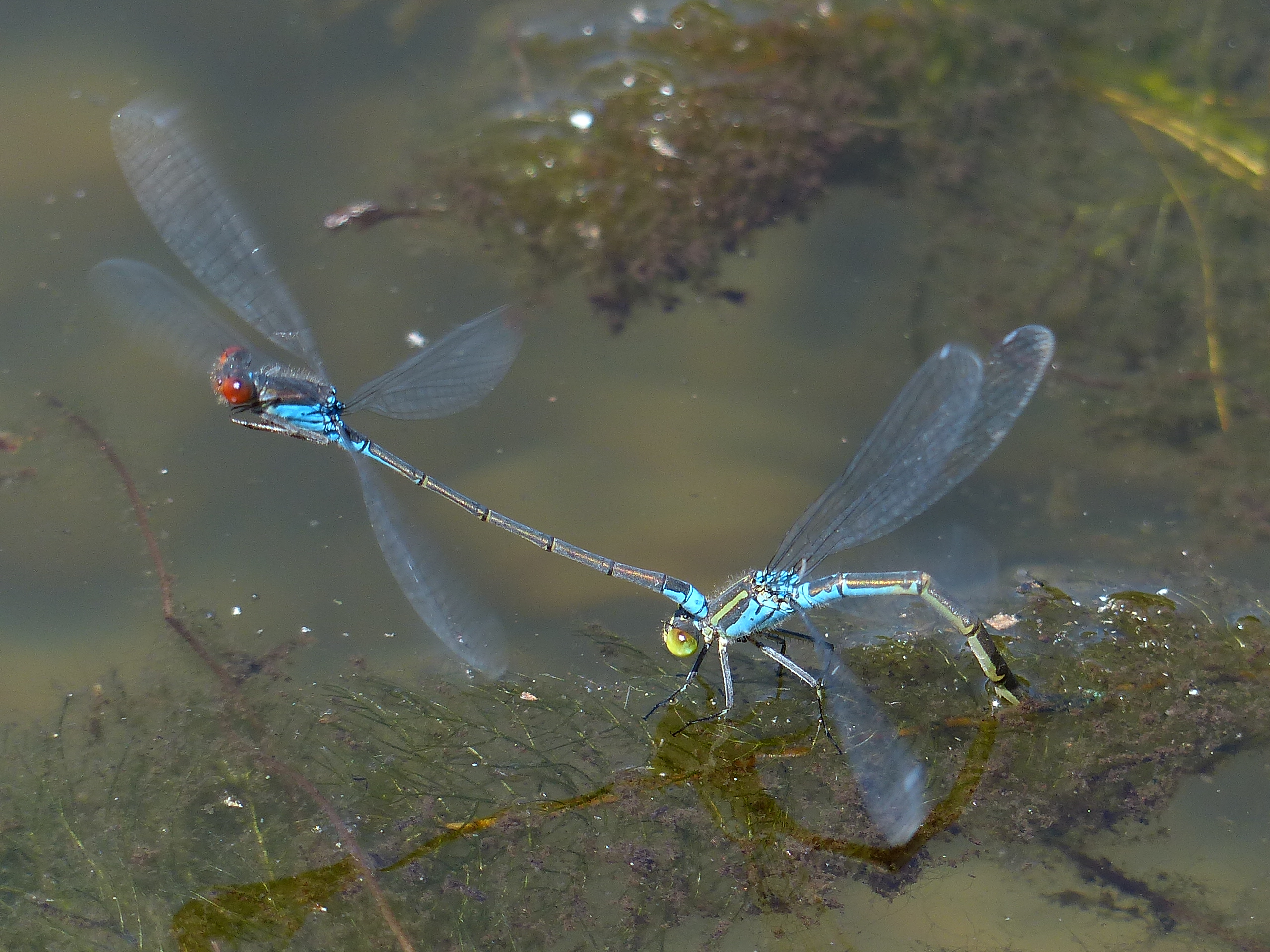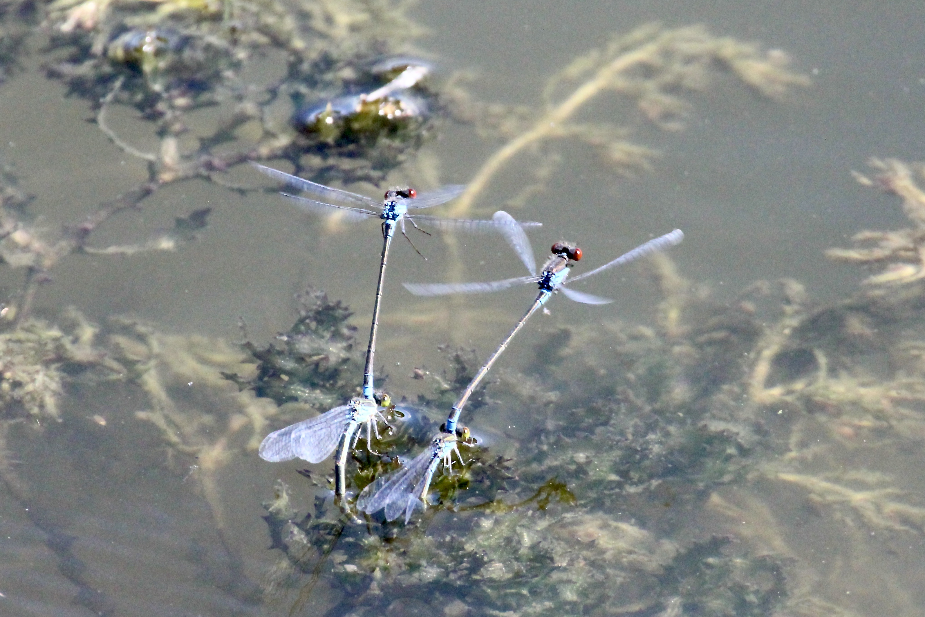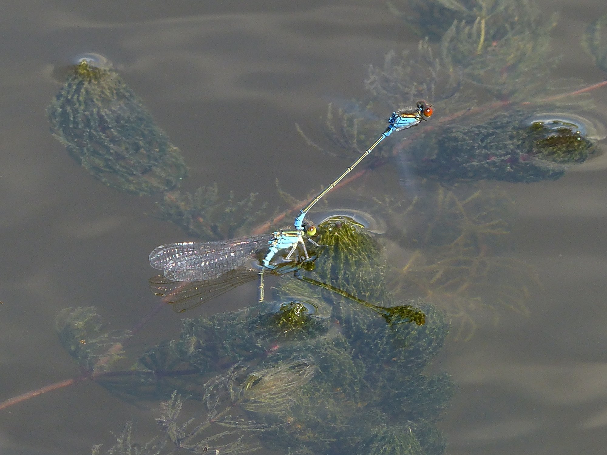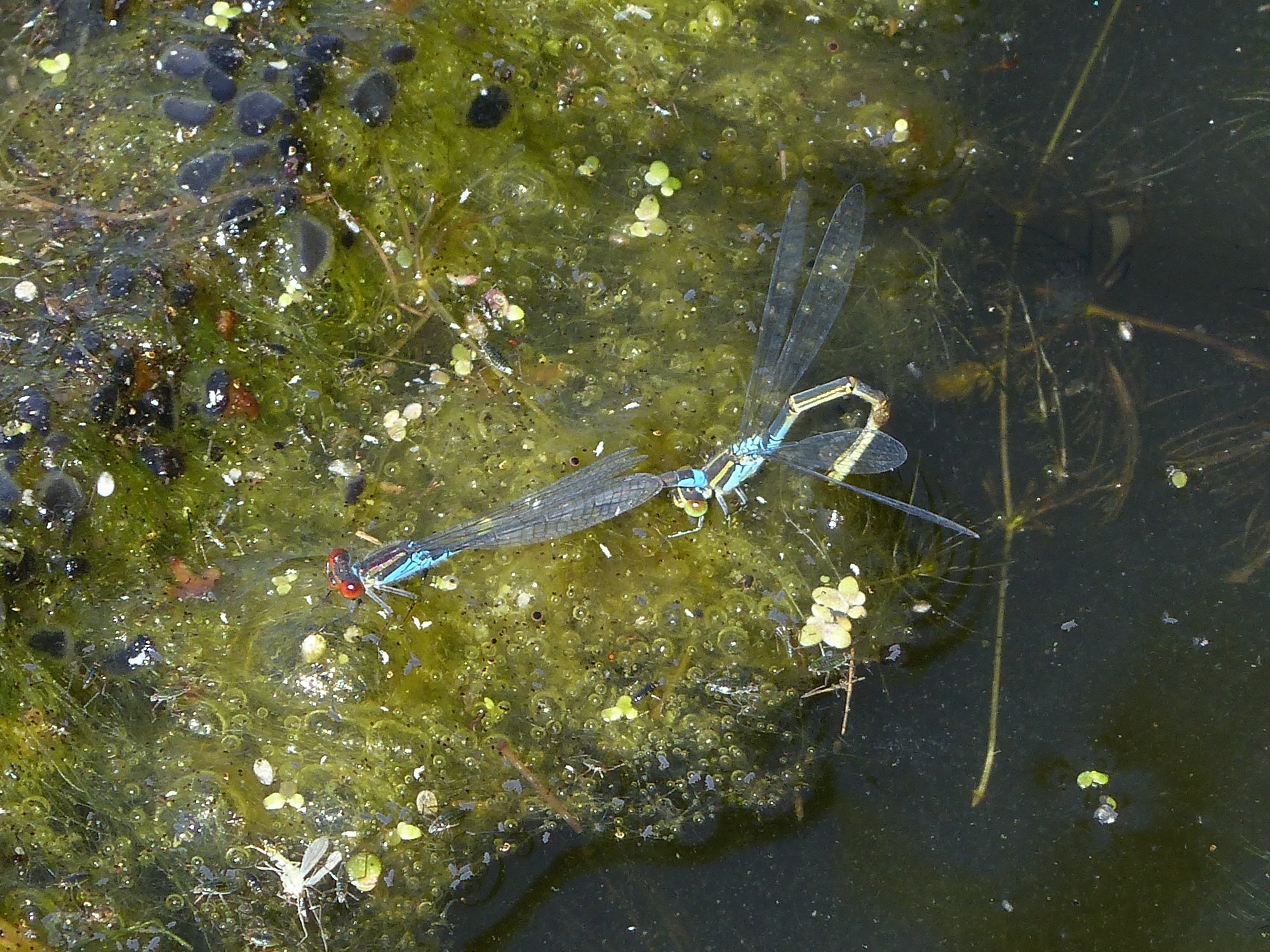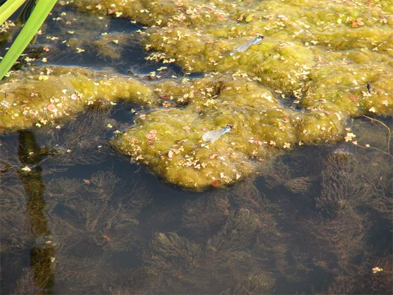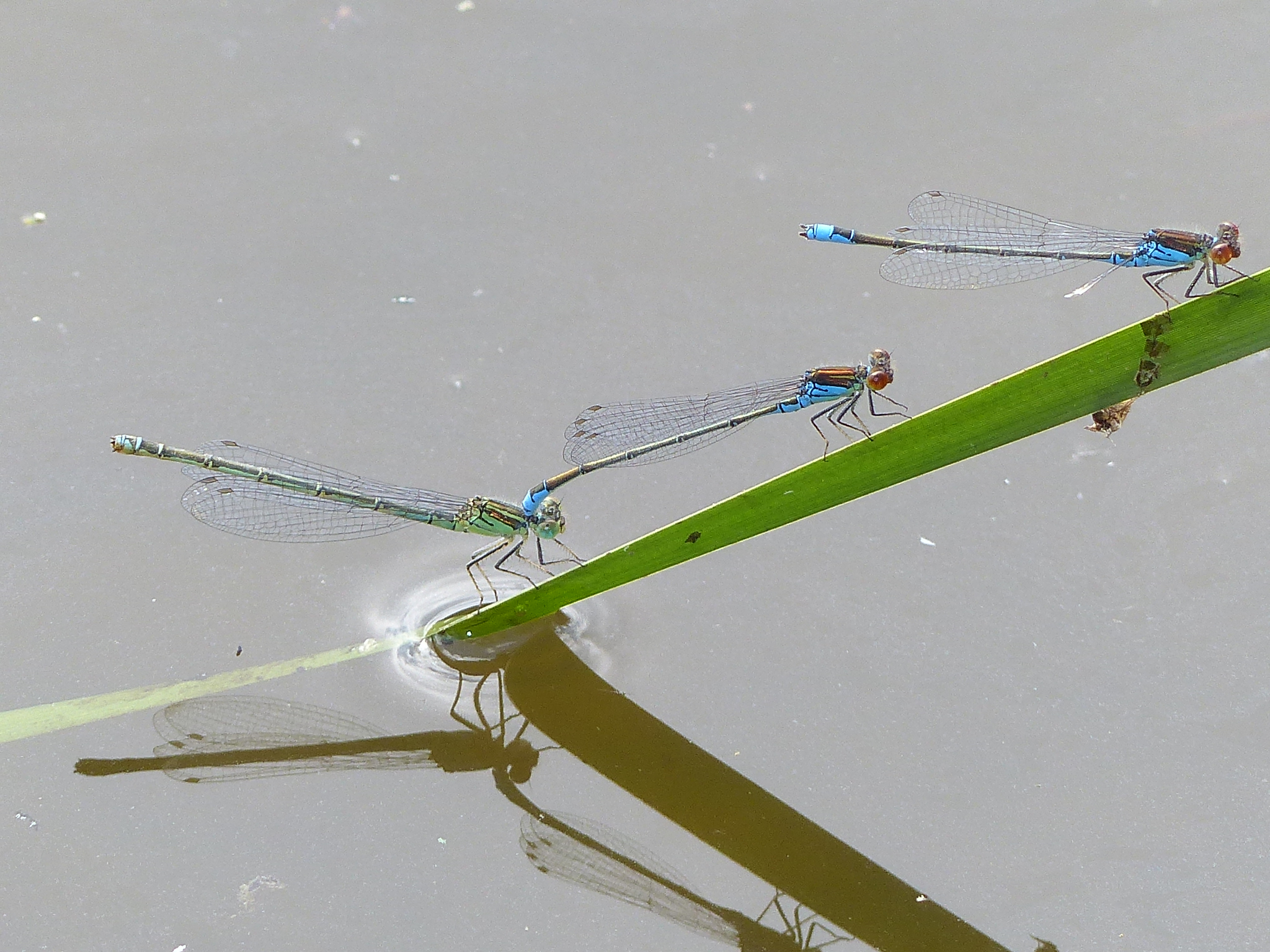 Kleiner Ausschnitt einer Massen-Eiablage des Kleinen Granatauge am Libellenteich an der Halde Berzdorf im August 2016, dazwischen einzelne Paare des Großen Granatauge
