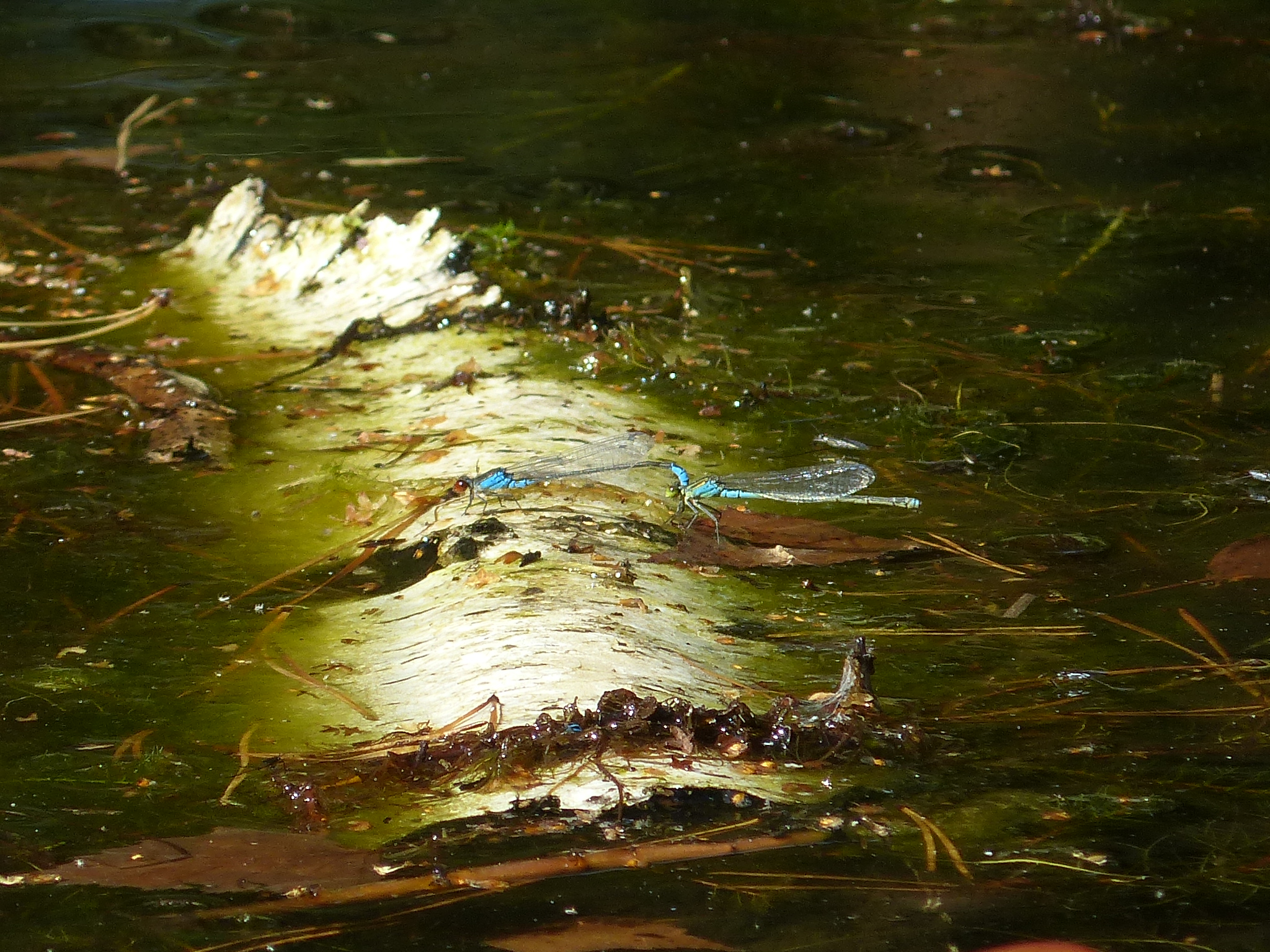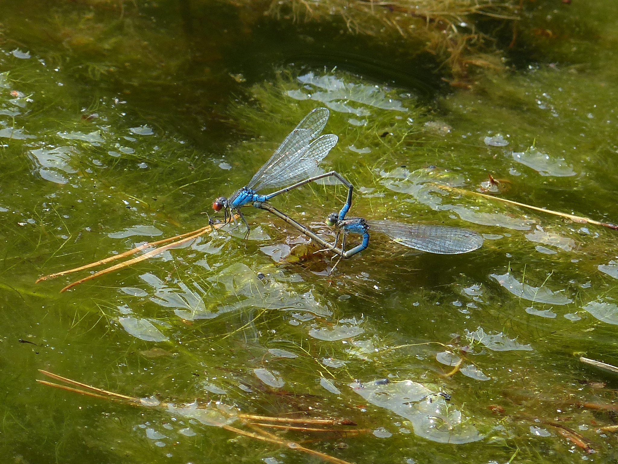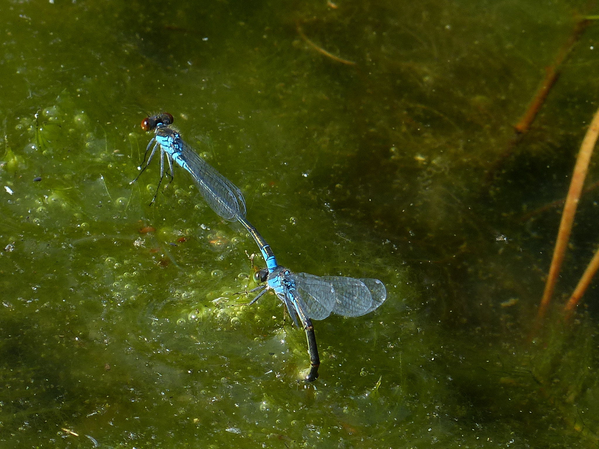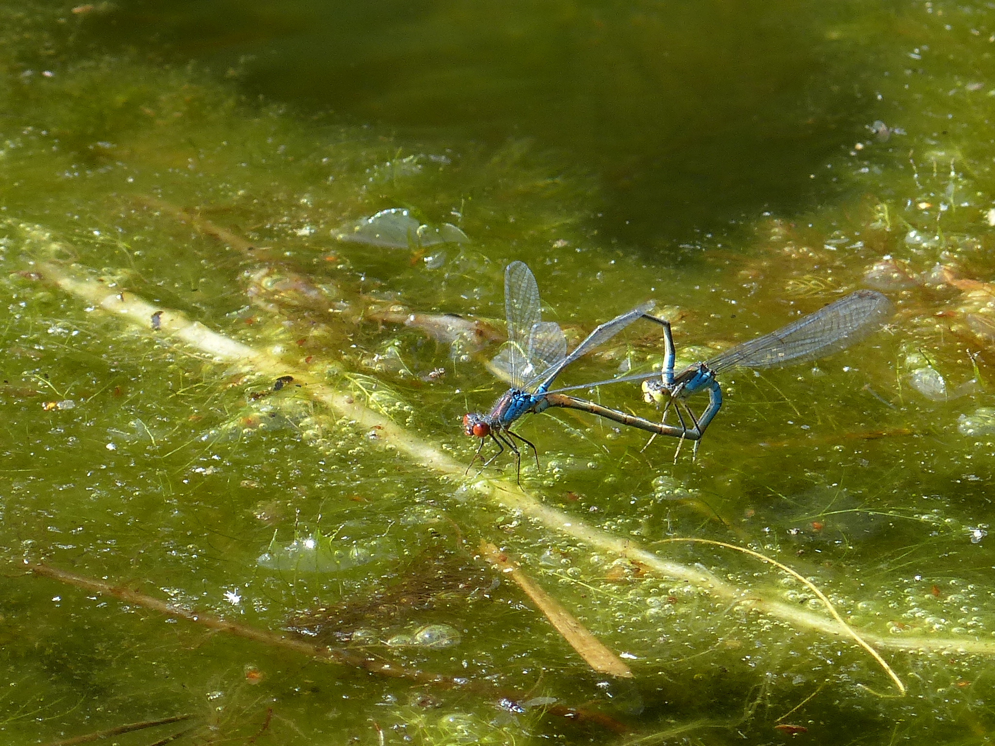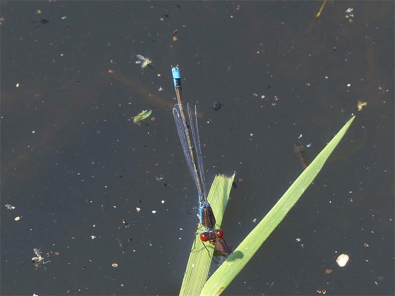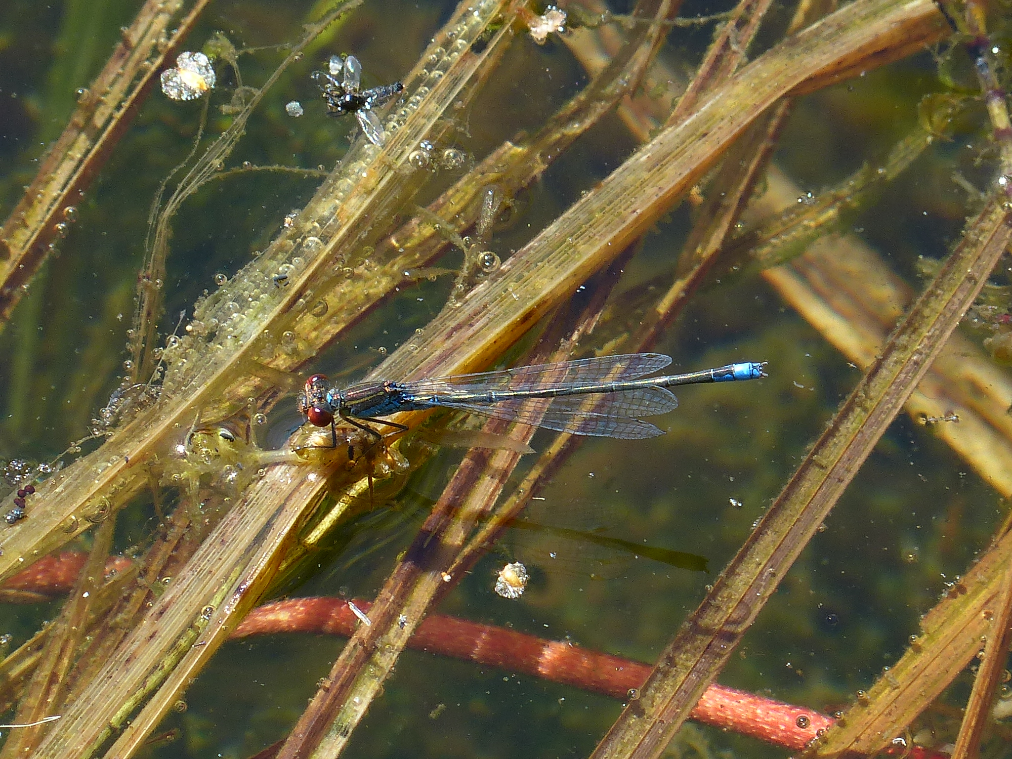Kleiner Ausschnitt einer Massen-Eiablage des Kleinen Granatauge am Libellenteich an der Halde Berzdorf im August 2016, dazwischen einzelne Paare des Großen Granatauge