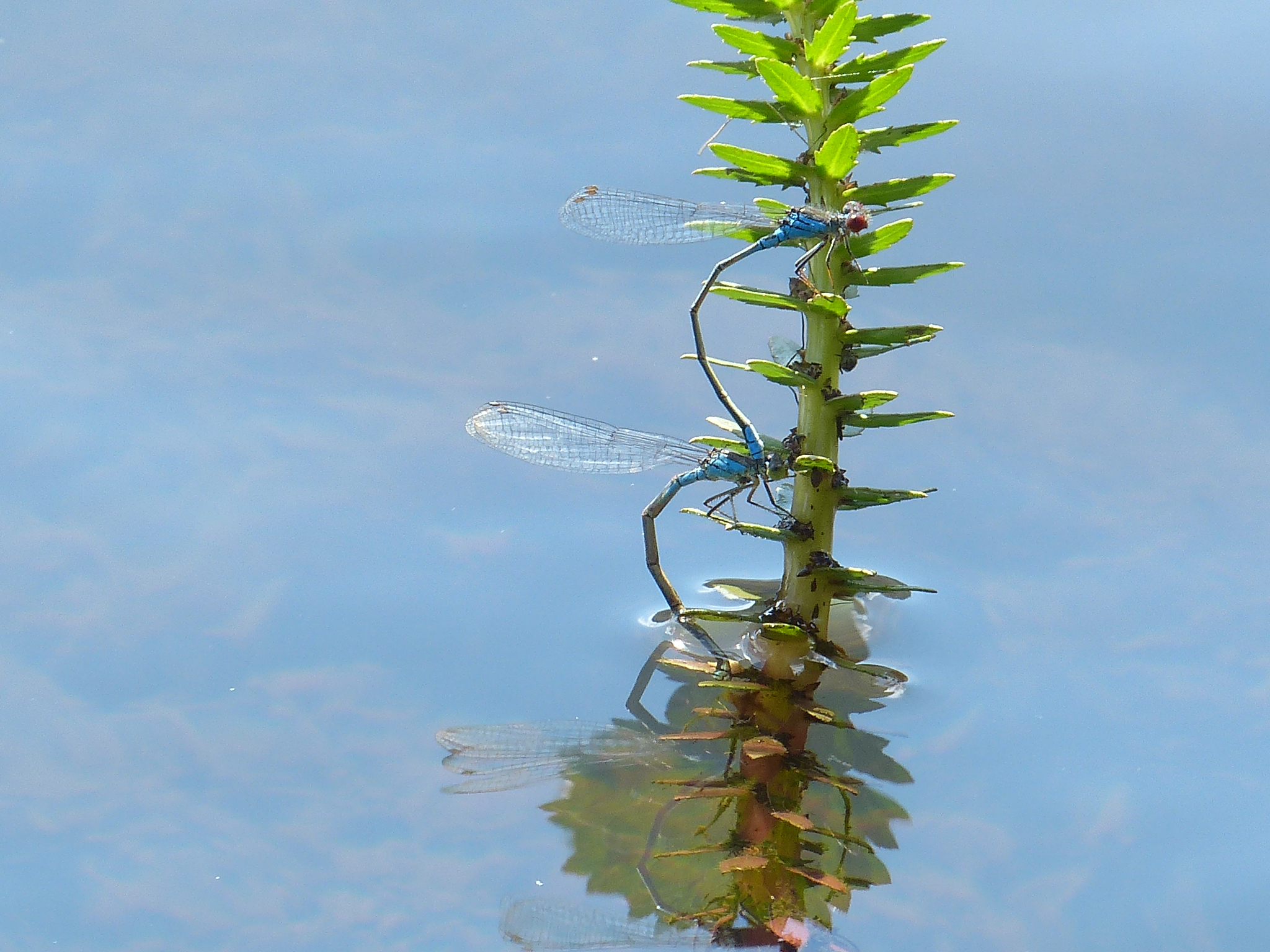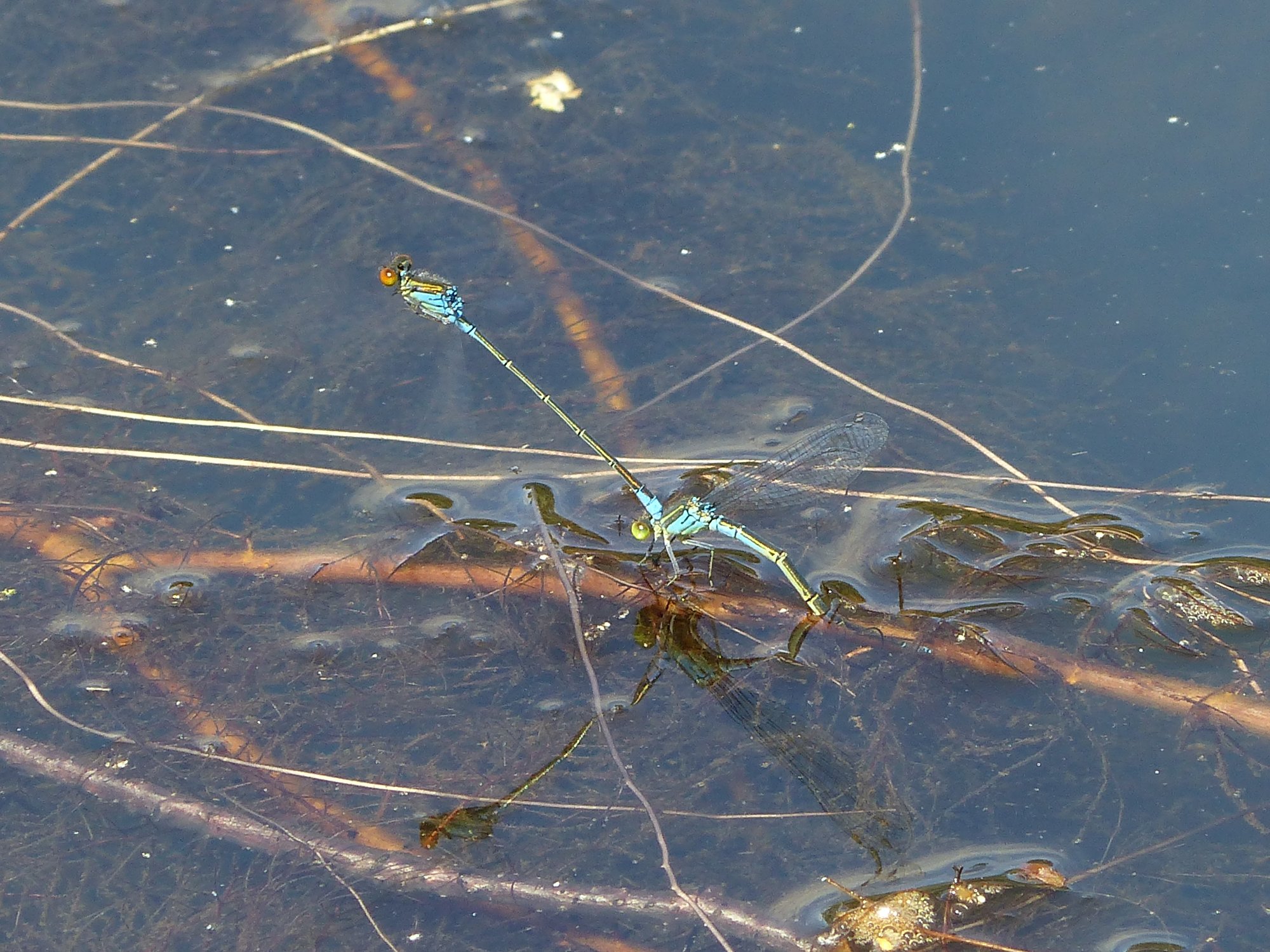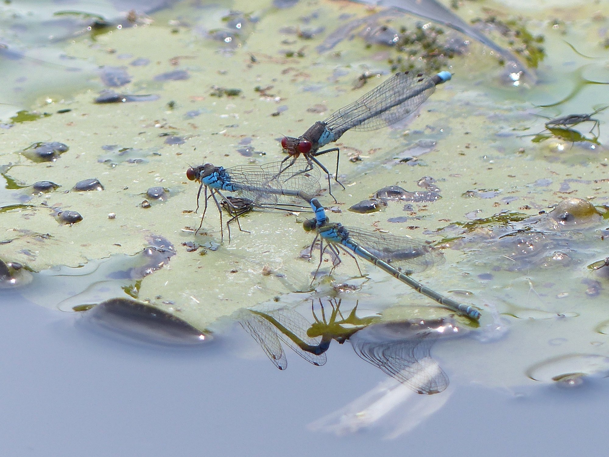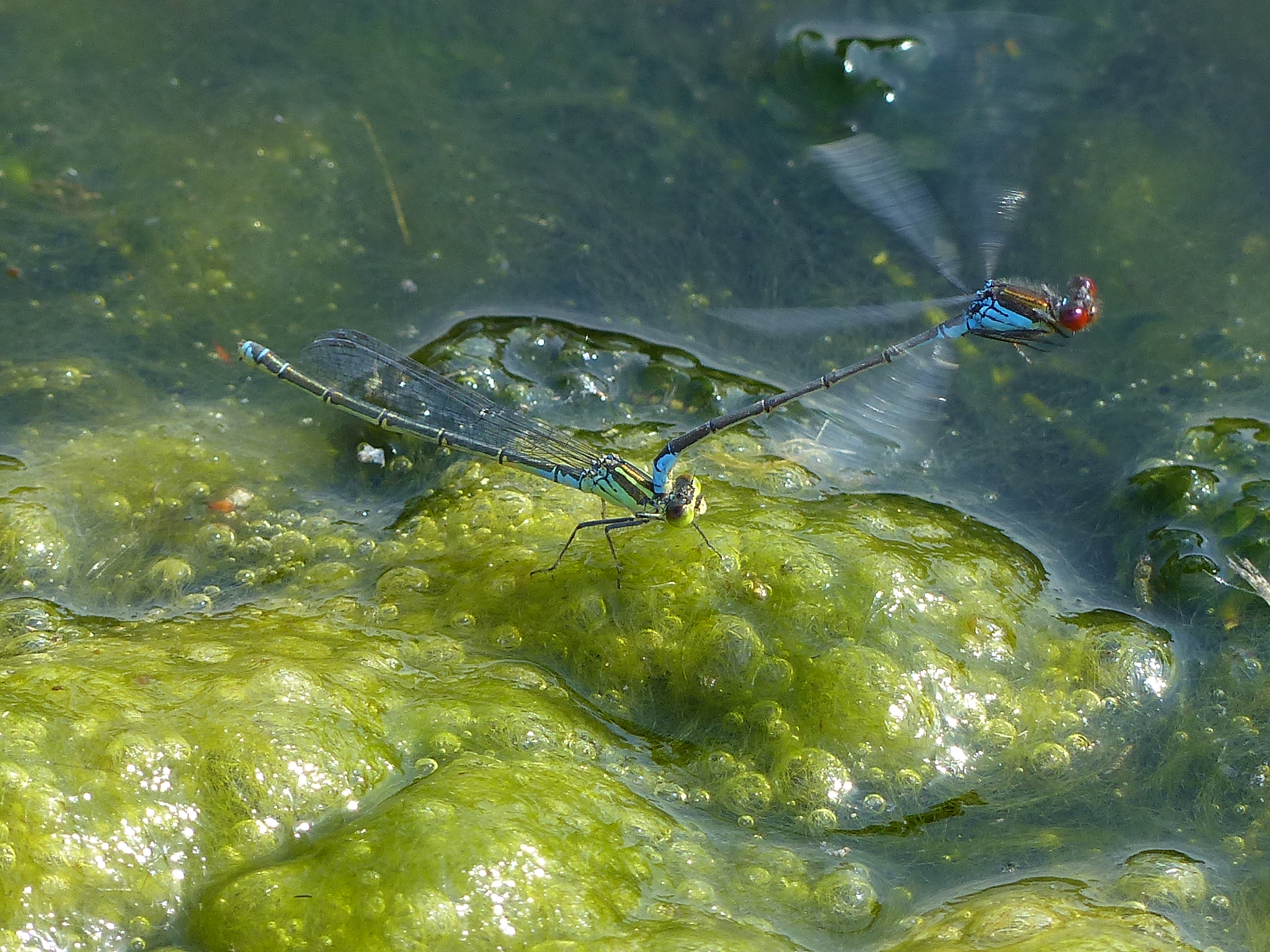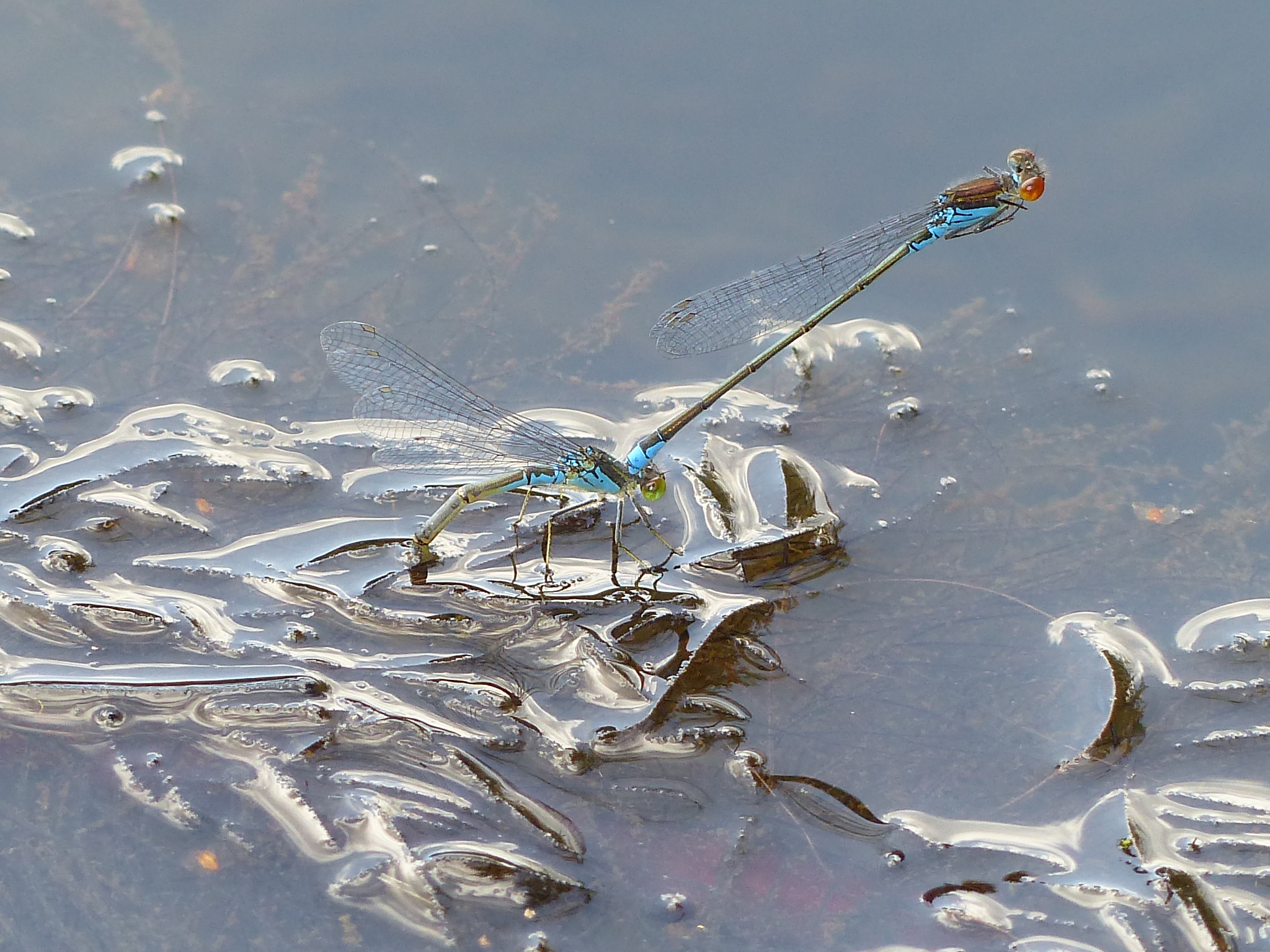 Kleiner Ausschnitt einer Massen-Eiablage des Kleinen Granatauge am Libellenteich an der Halde Berzdorf im August 2016, dazwischen einzelne Paare des Großen Granatauge