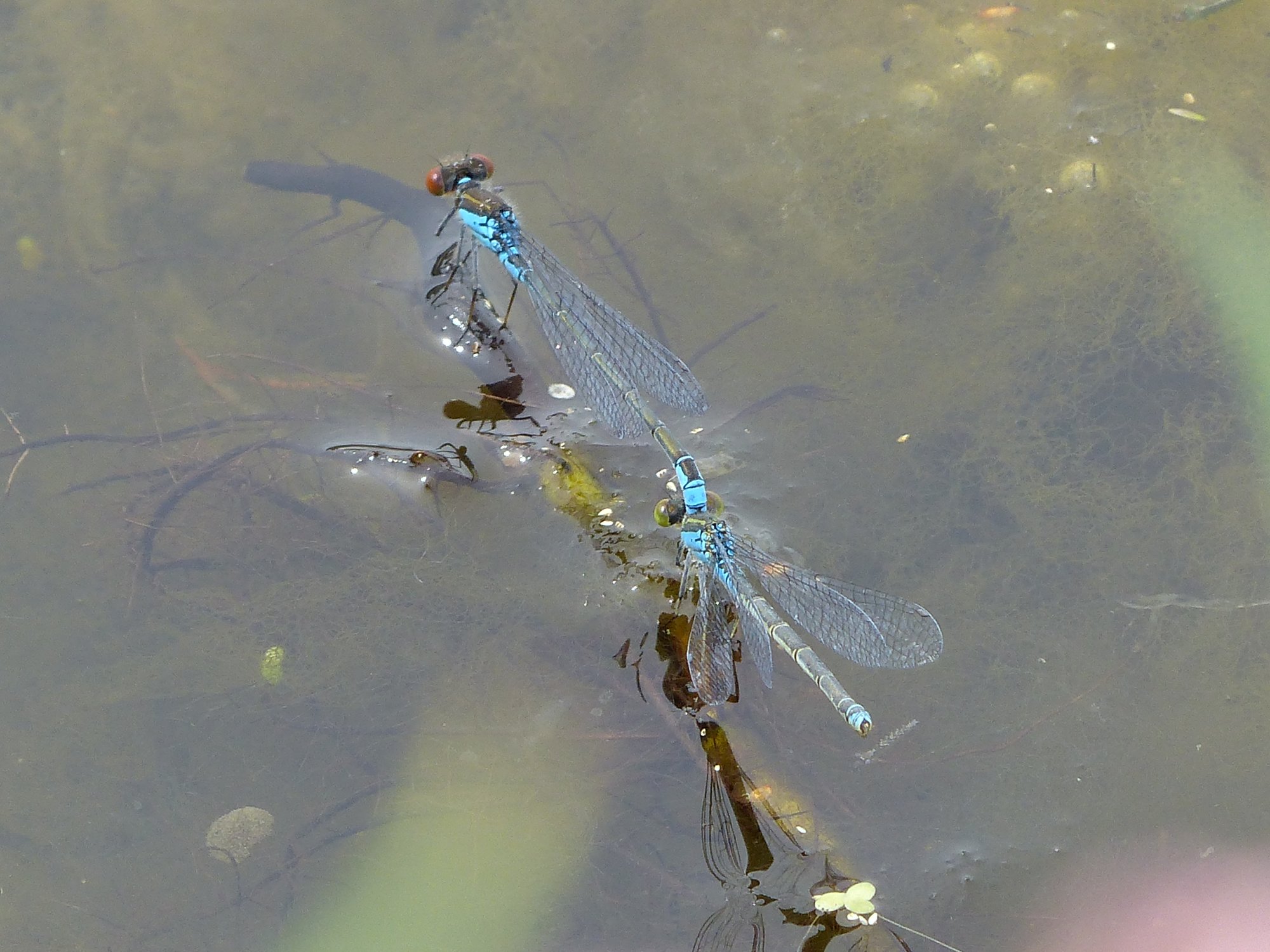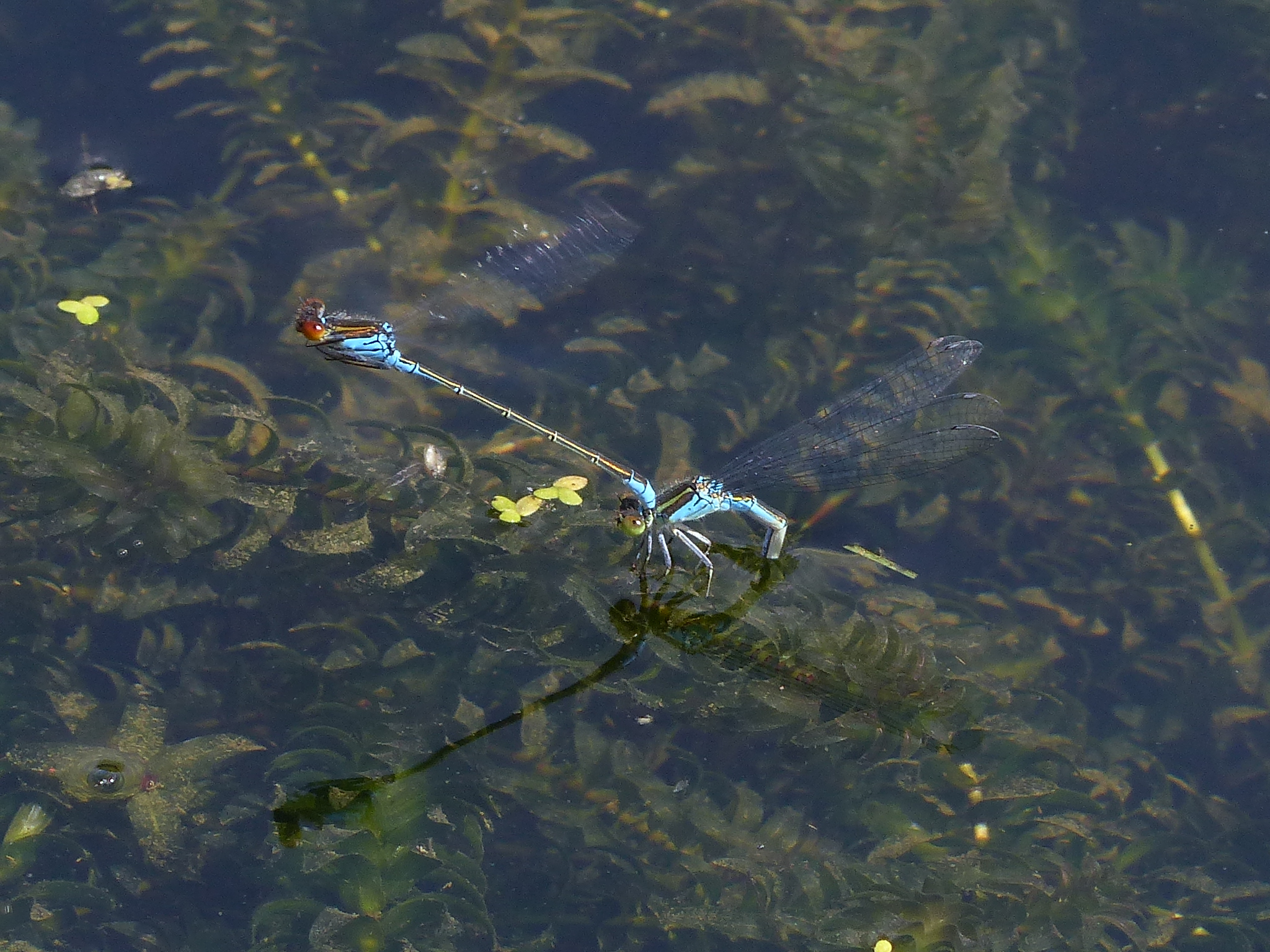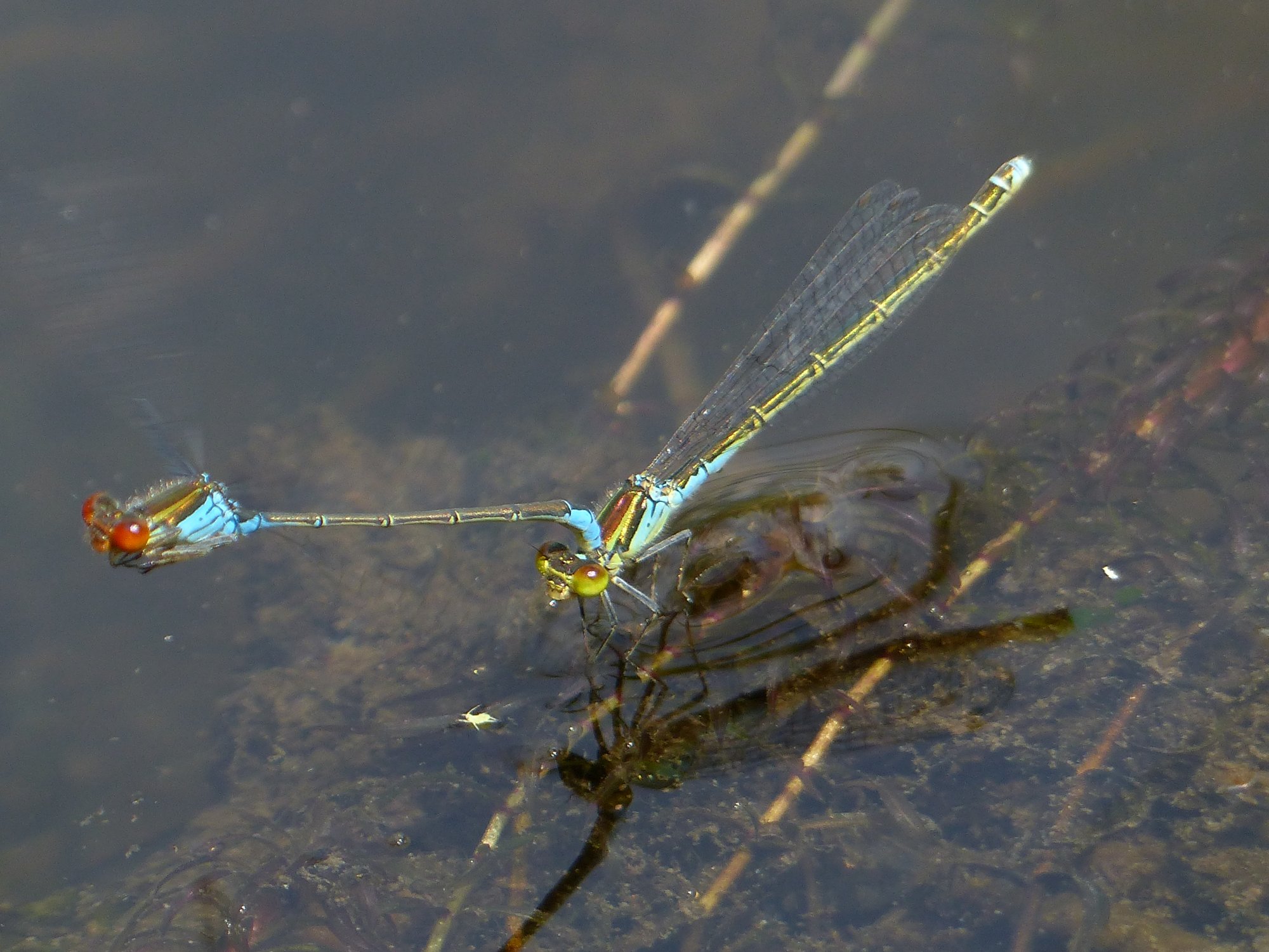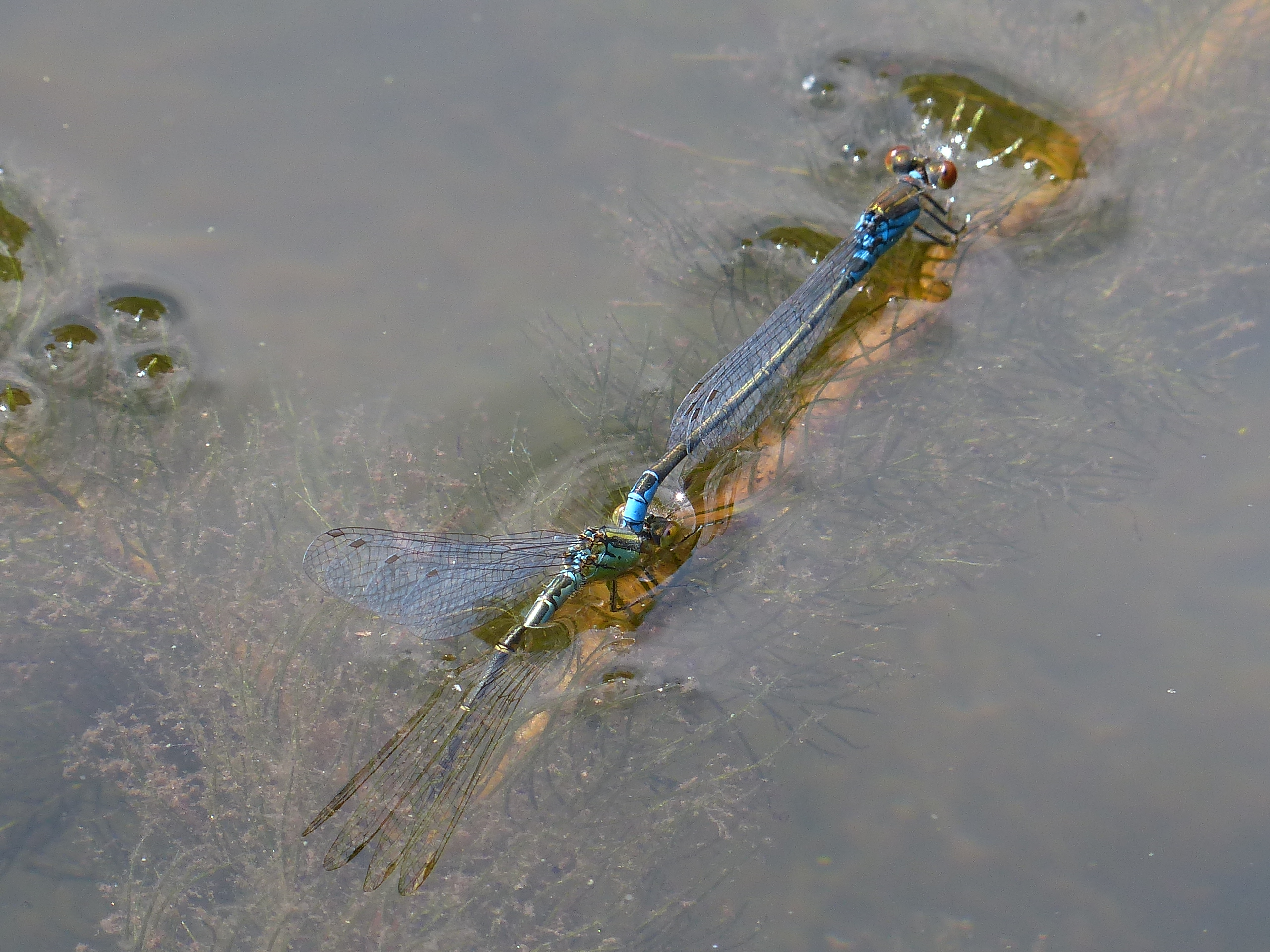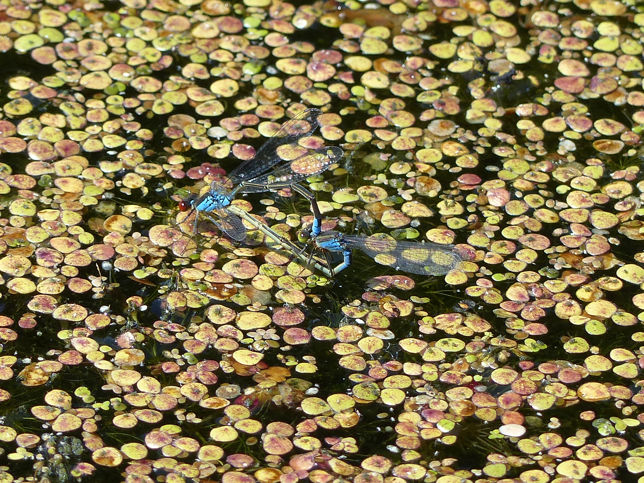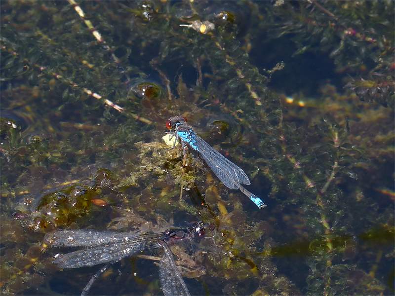 Kleiner Ausschnitt einer Massen-Eiablage des Kleinen Granatauge am Libellenteich an der Halde Berzdorf im August 2016, dazwischen einzelne Paare des Großen Granatauge