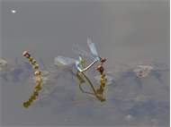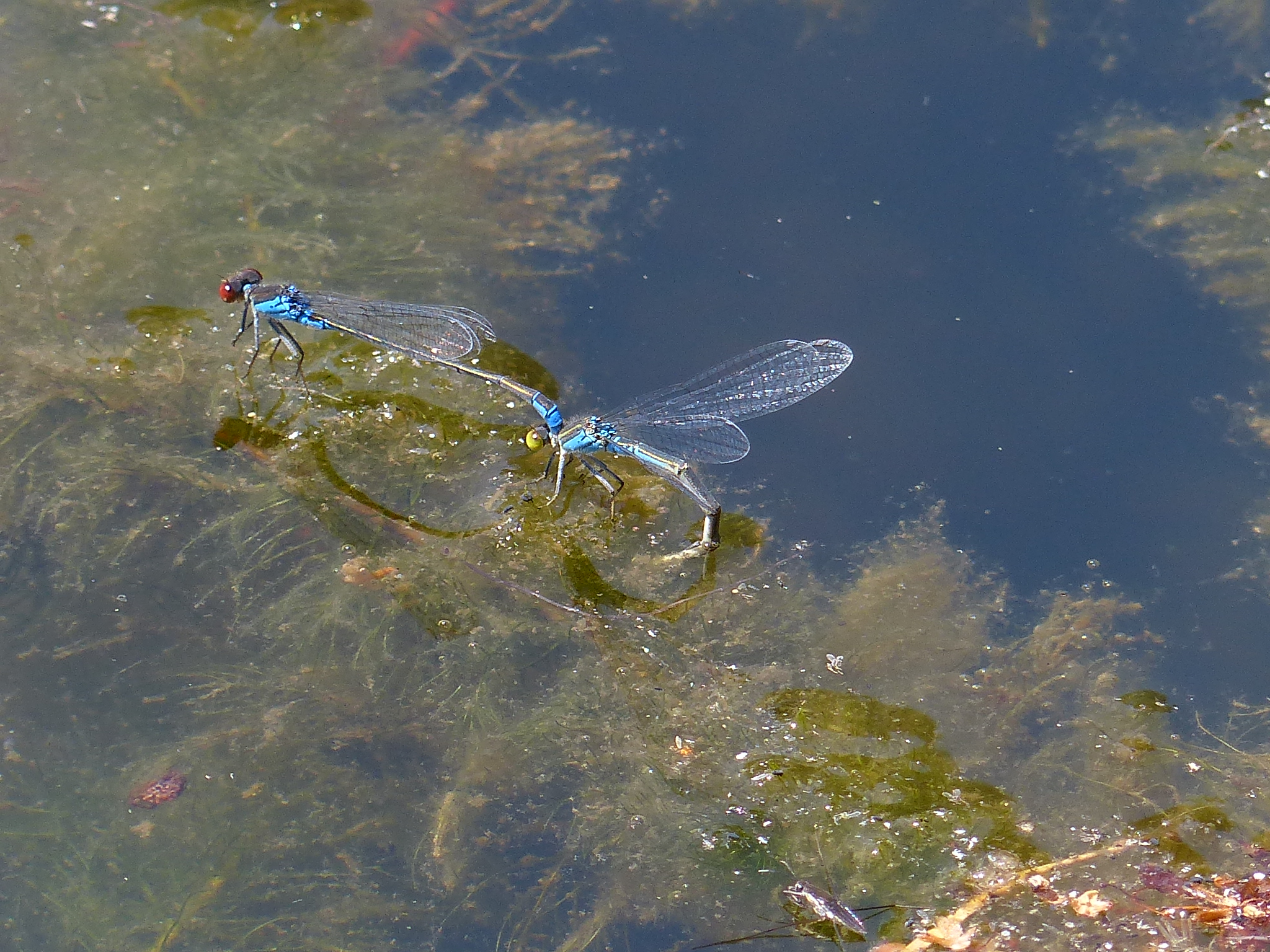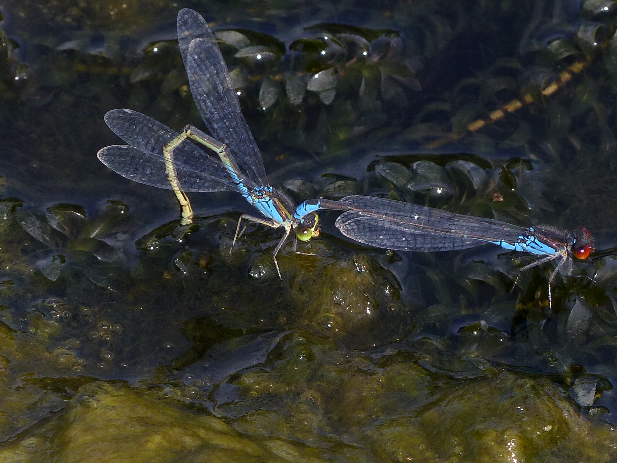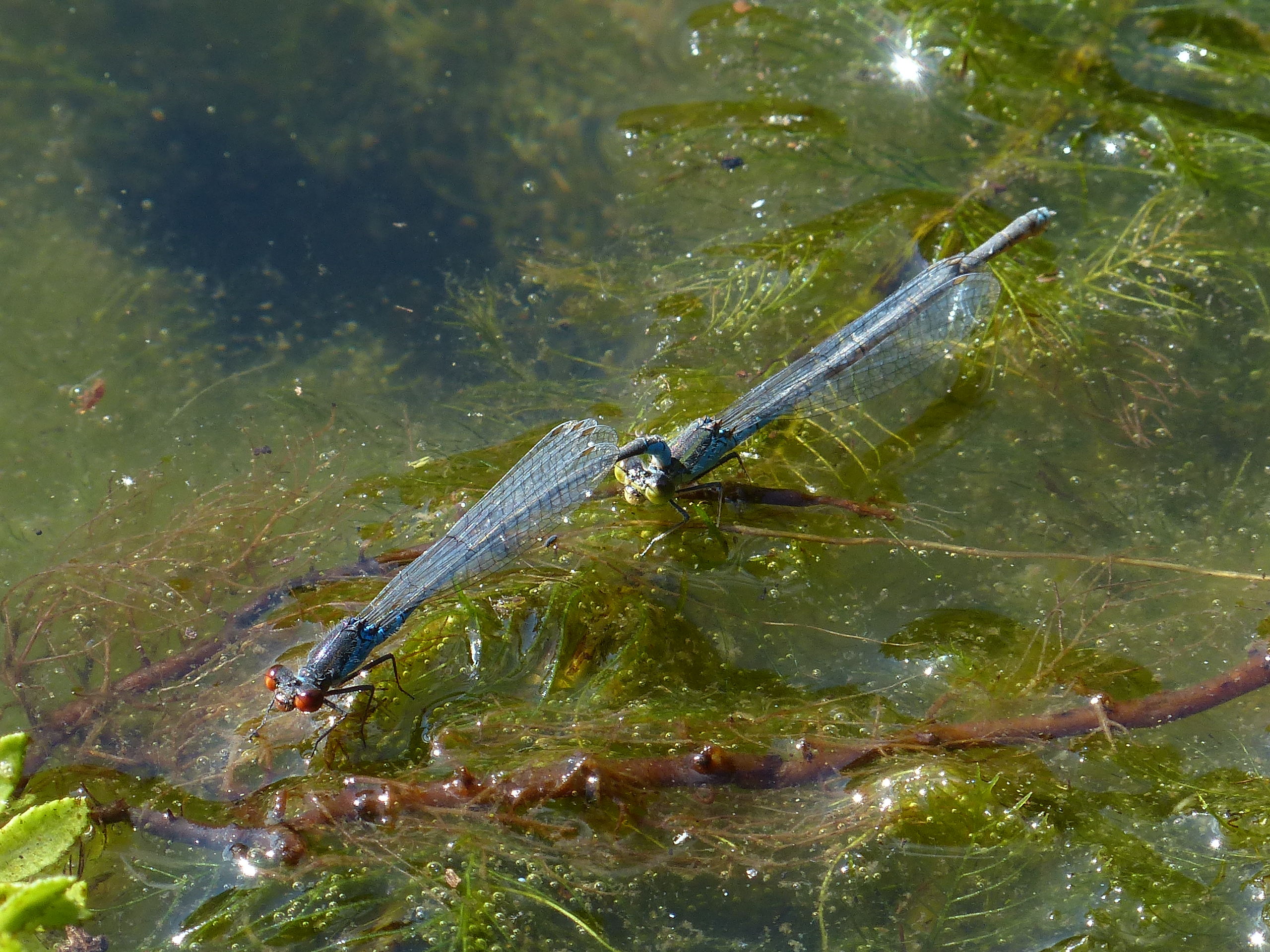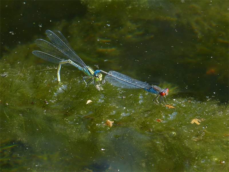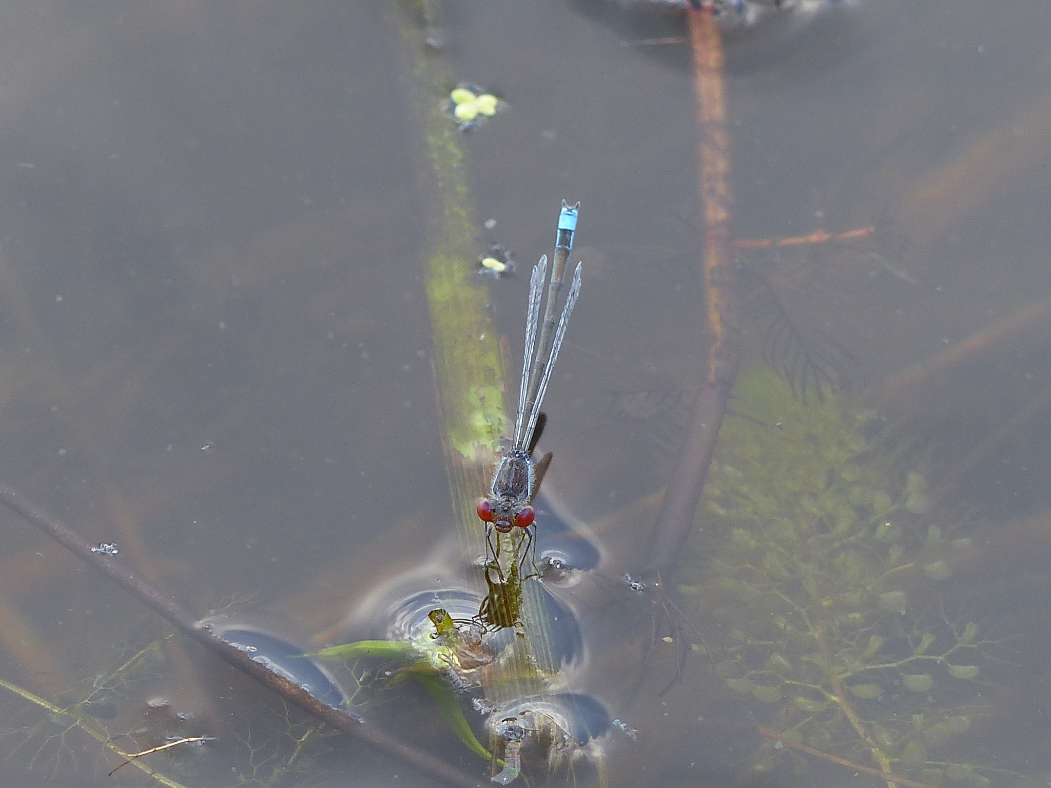 Kleiner Ausschnitt einer Massen-Eiablage des Kleinen Granatauge am Libellenteich an der Halde Berzdorf im August 2016, dazwischen einzelne Paare des Großen Granatauge