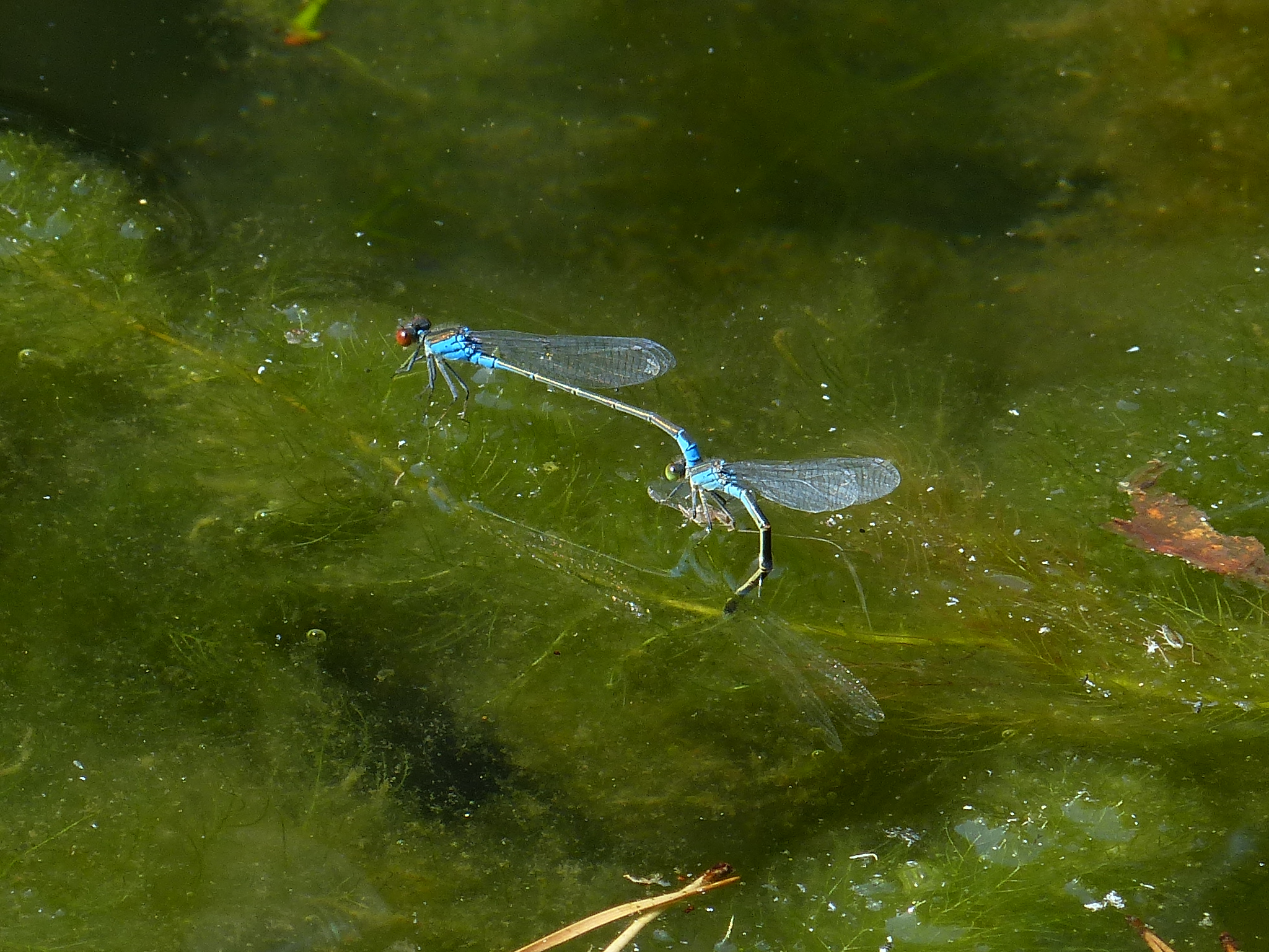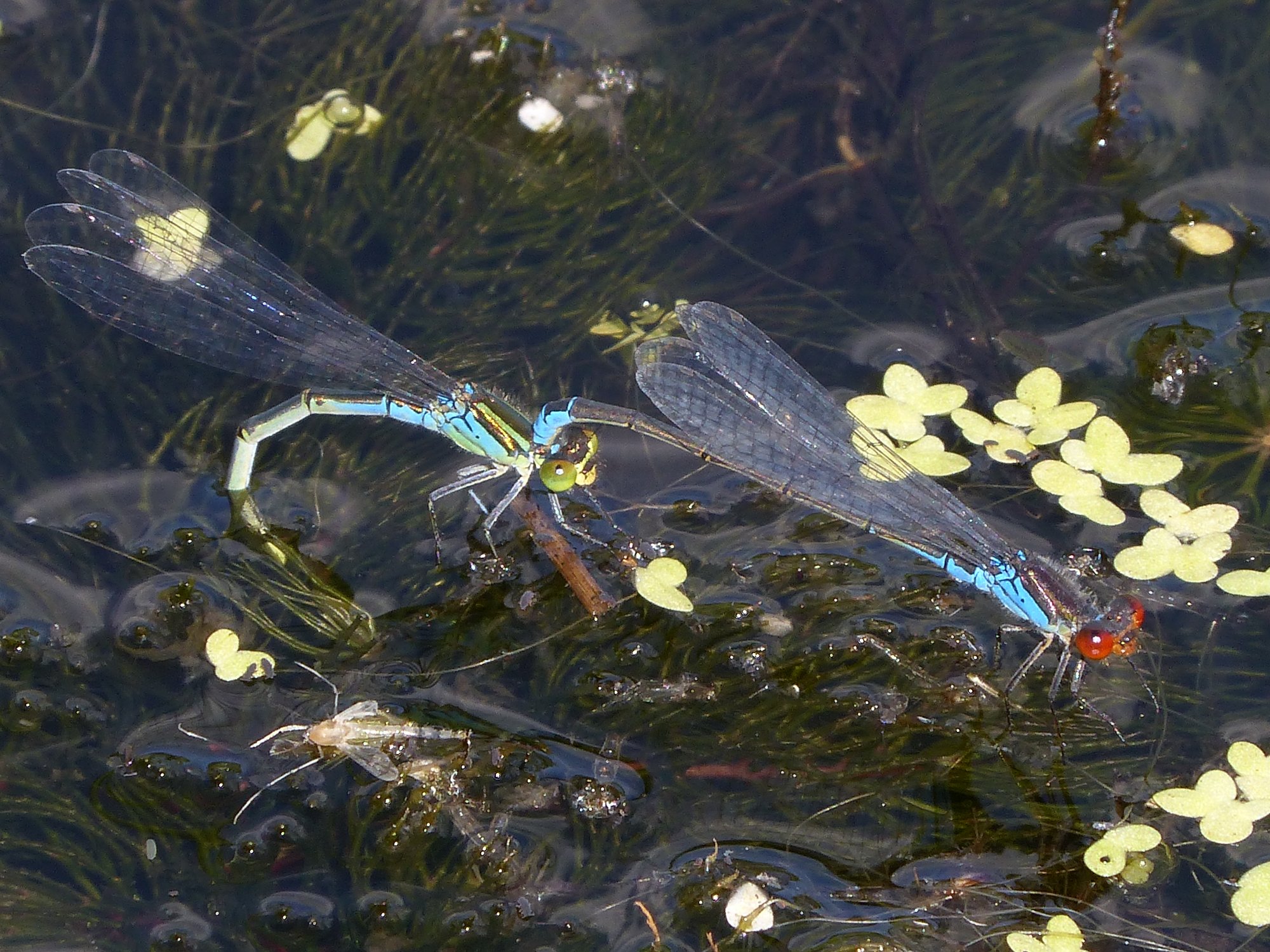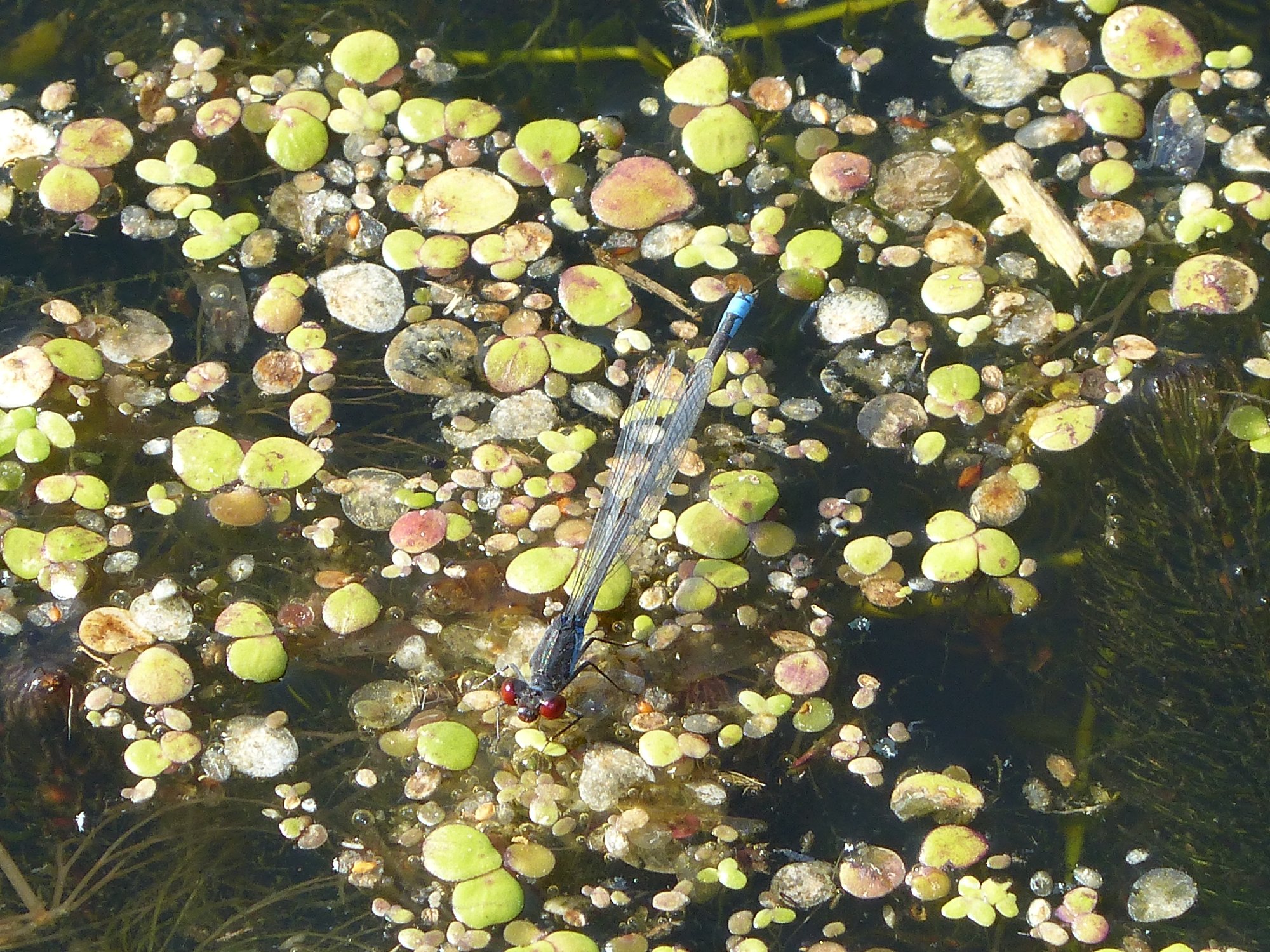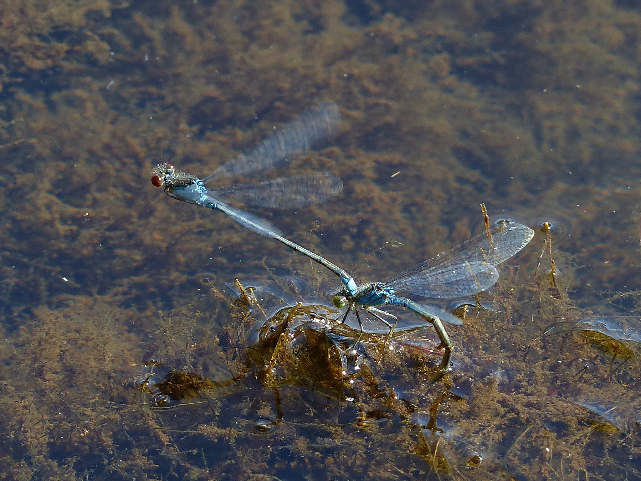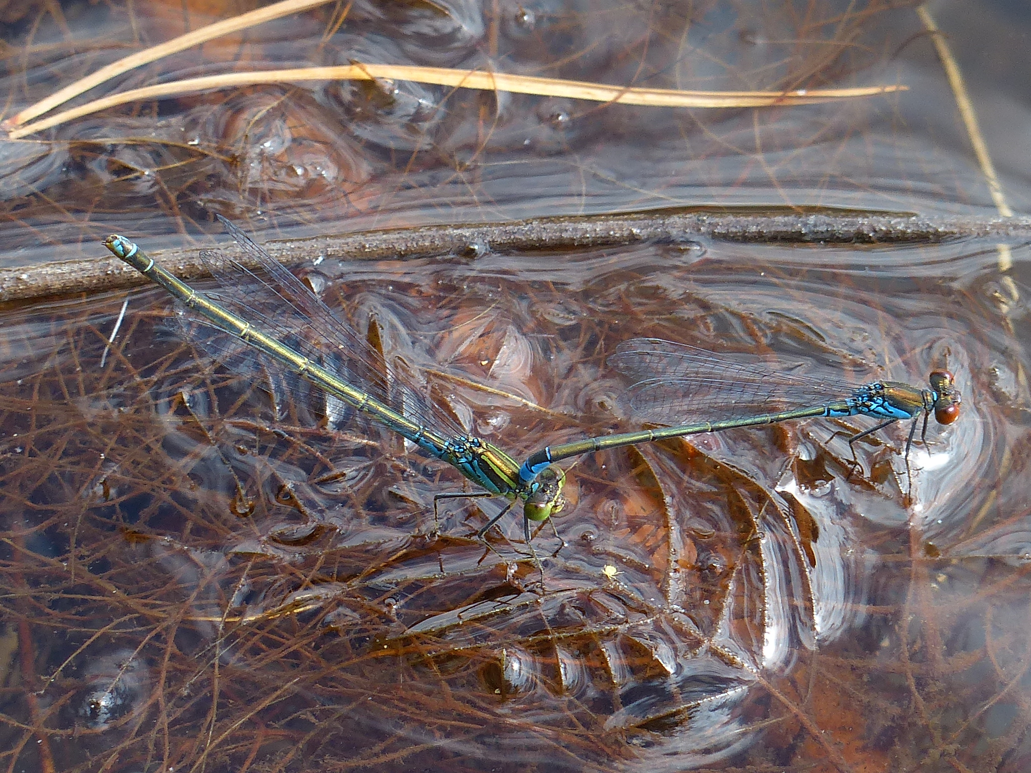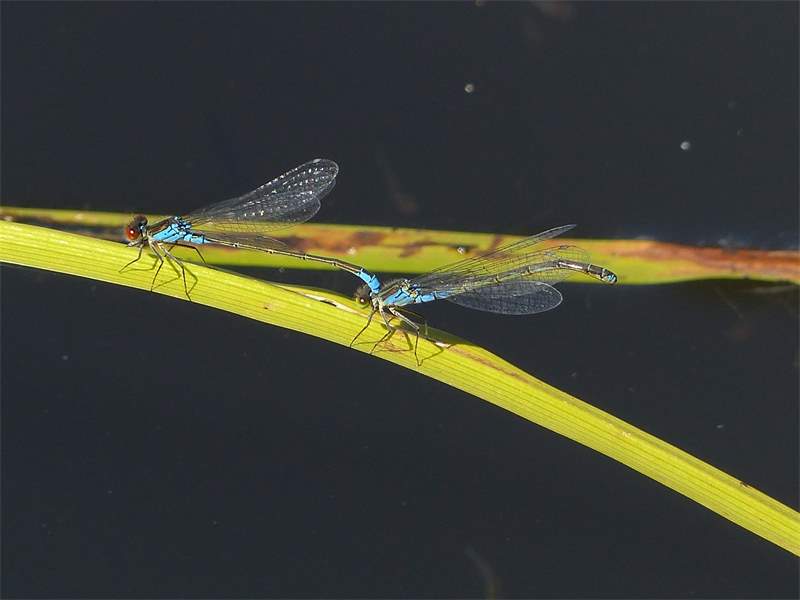 Kleiner Ausschnitt einer Massen-Eiablage des Kleinen Granatauge am Libellenteich an der Halde Berzdorf im August 2016, dazwischen einzelne Paare des Großen Granatauge