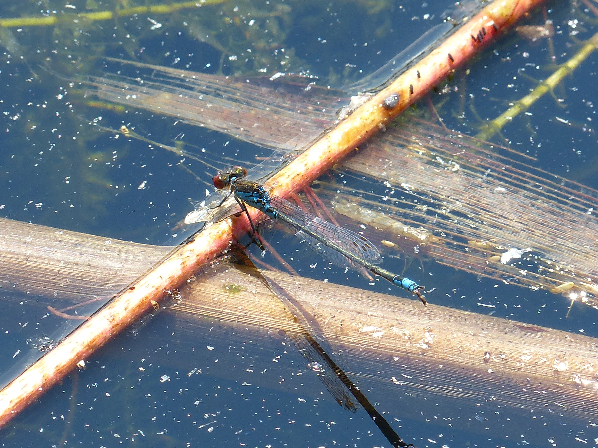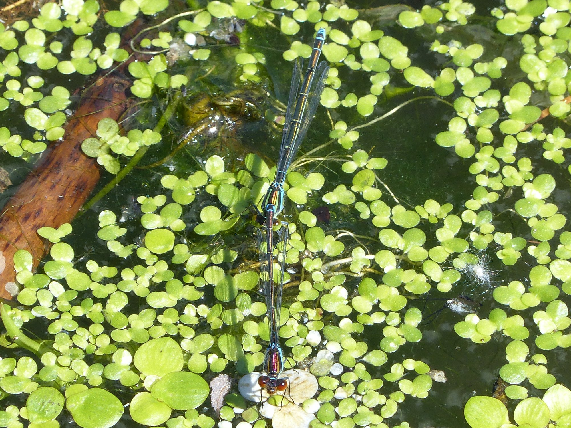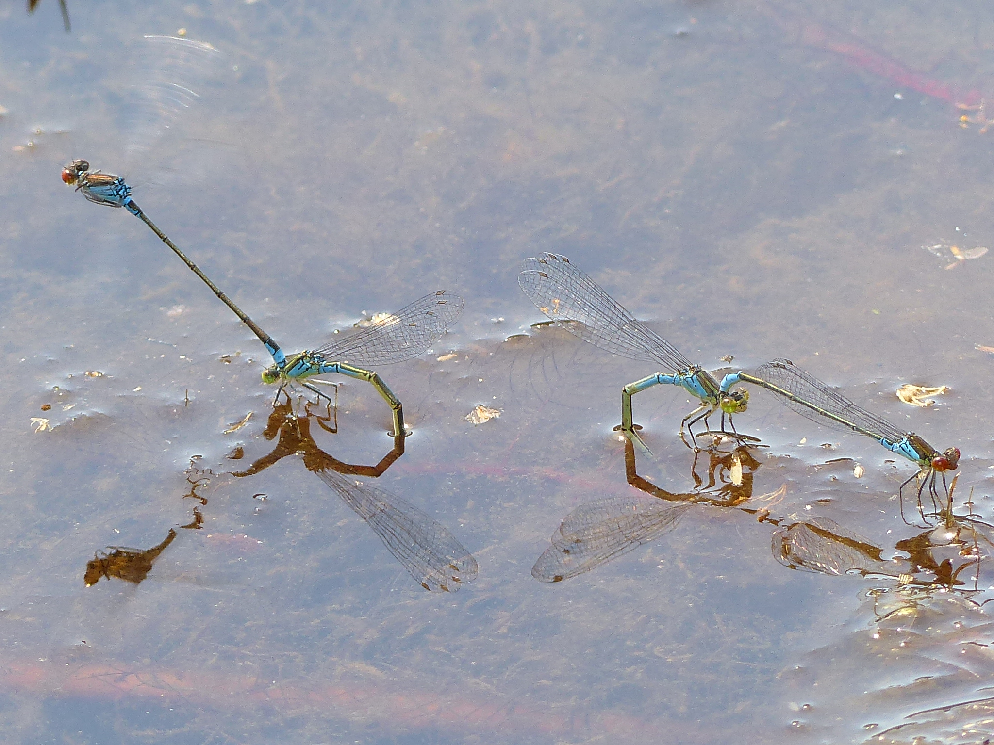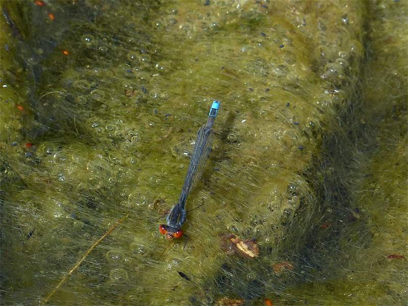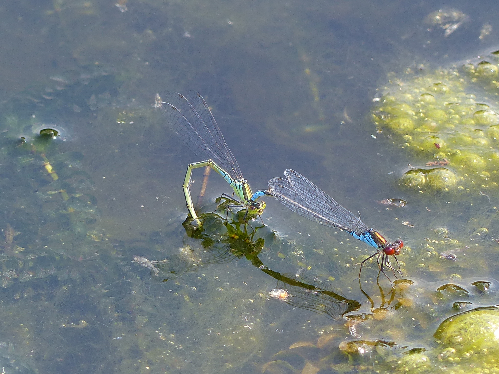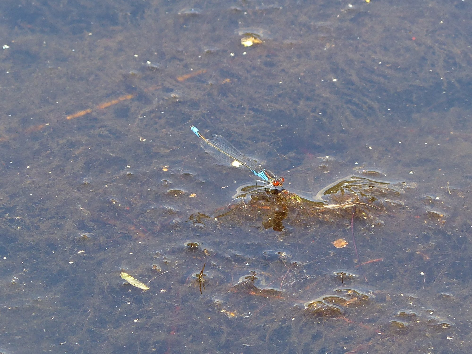 Kleiner Ausschnitt einer Massen-Eiablage des Kleinen Granatauge am Libellenteich an der Halde Berzdorf im August 2016, dazwischen einzelne Paare des Großen Granatauge