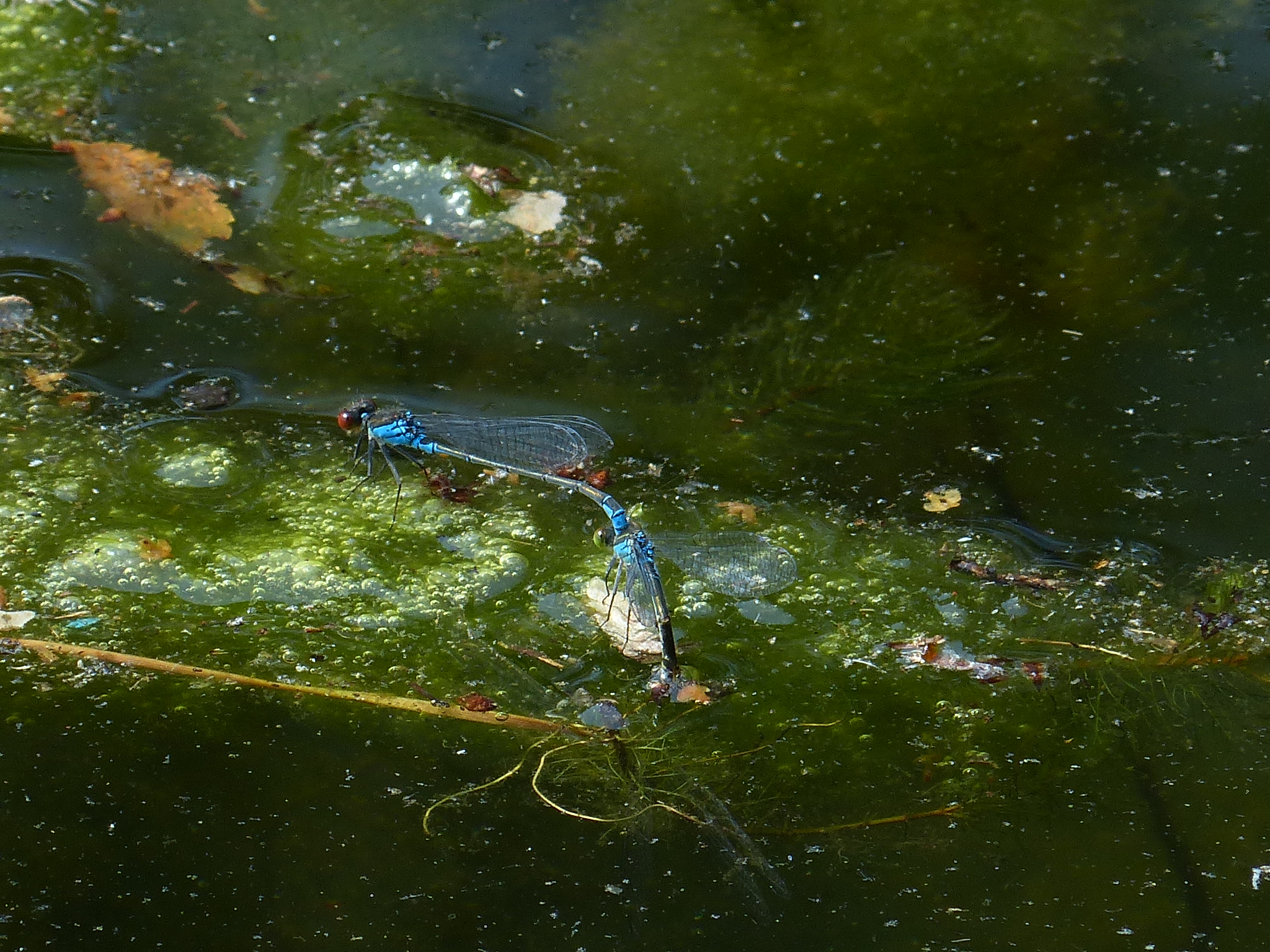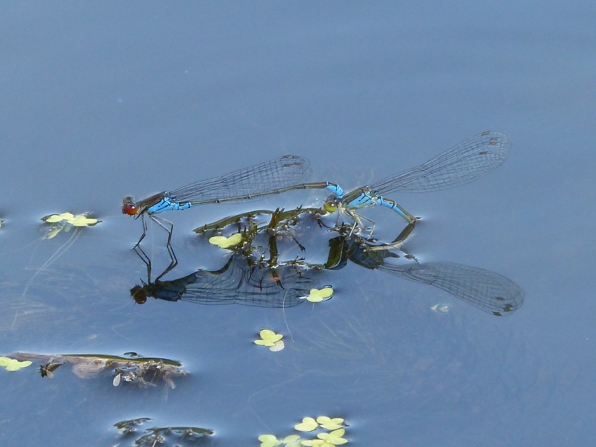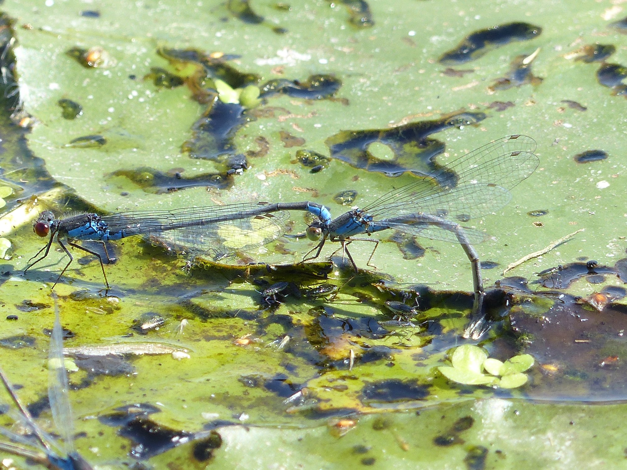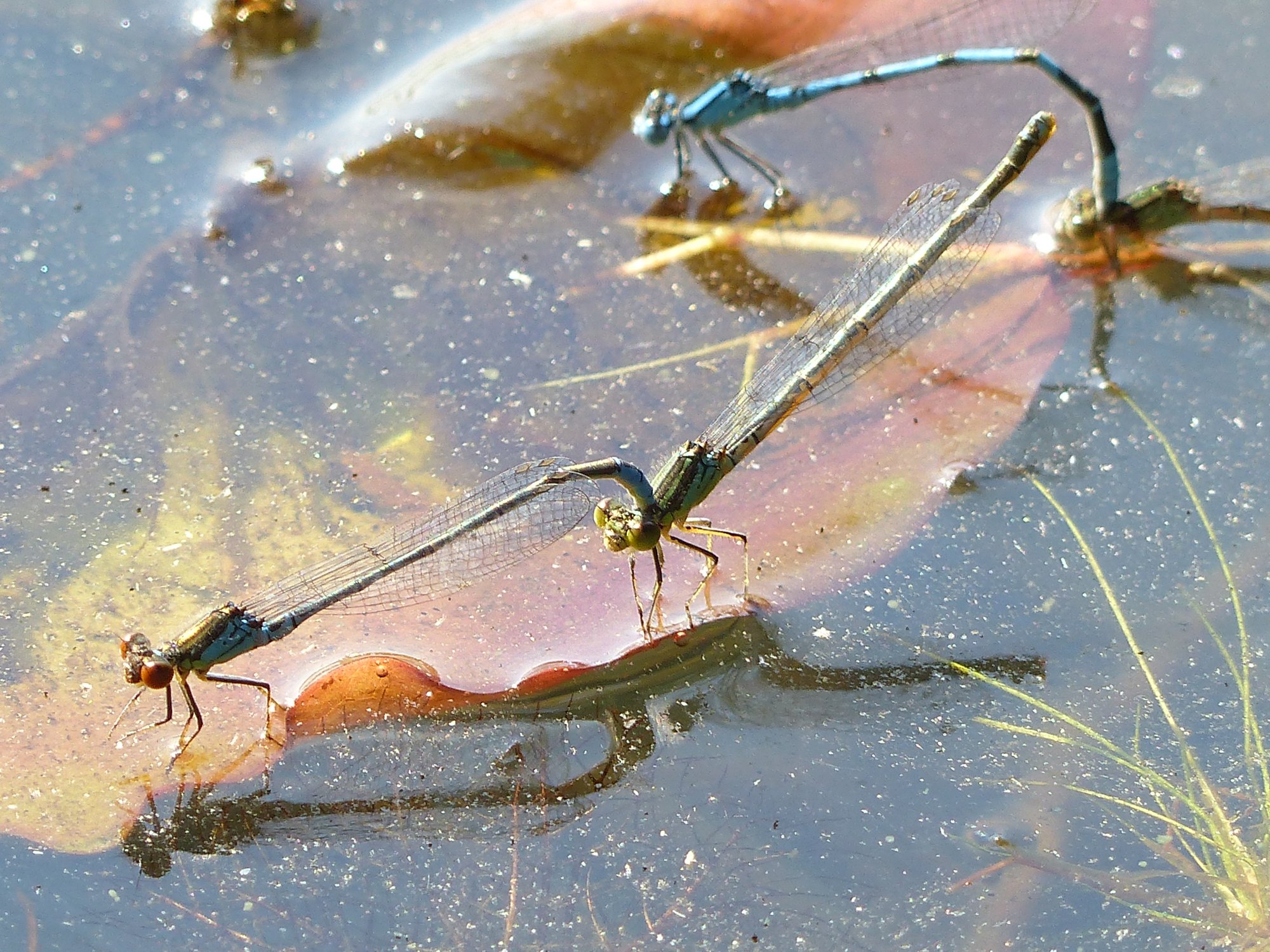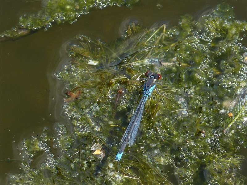 Kleiner Ausschnitt einer Massen-Eiablage des Kleinen Granatauge am Libellenteich an der Halde Berzdorf im August 2016, dazwischen einzelne Paare des Großen Granatauge