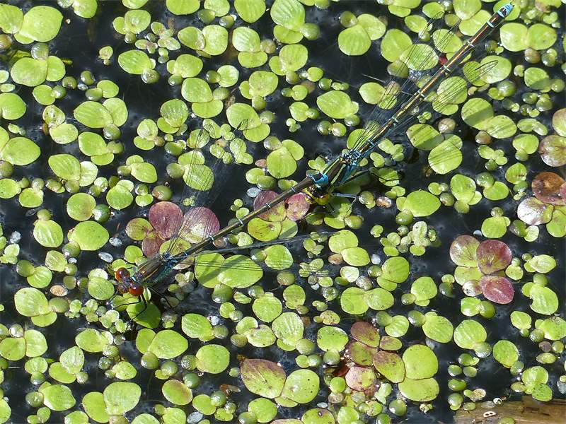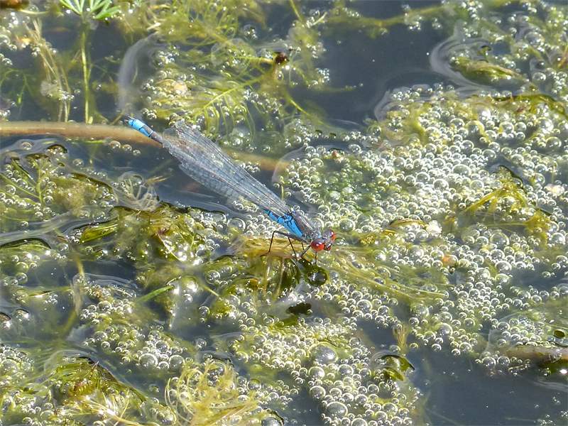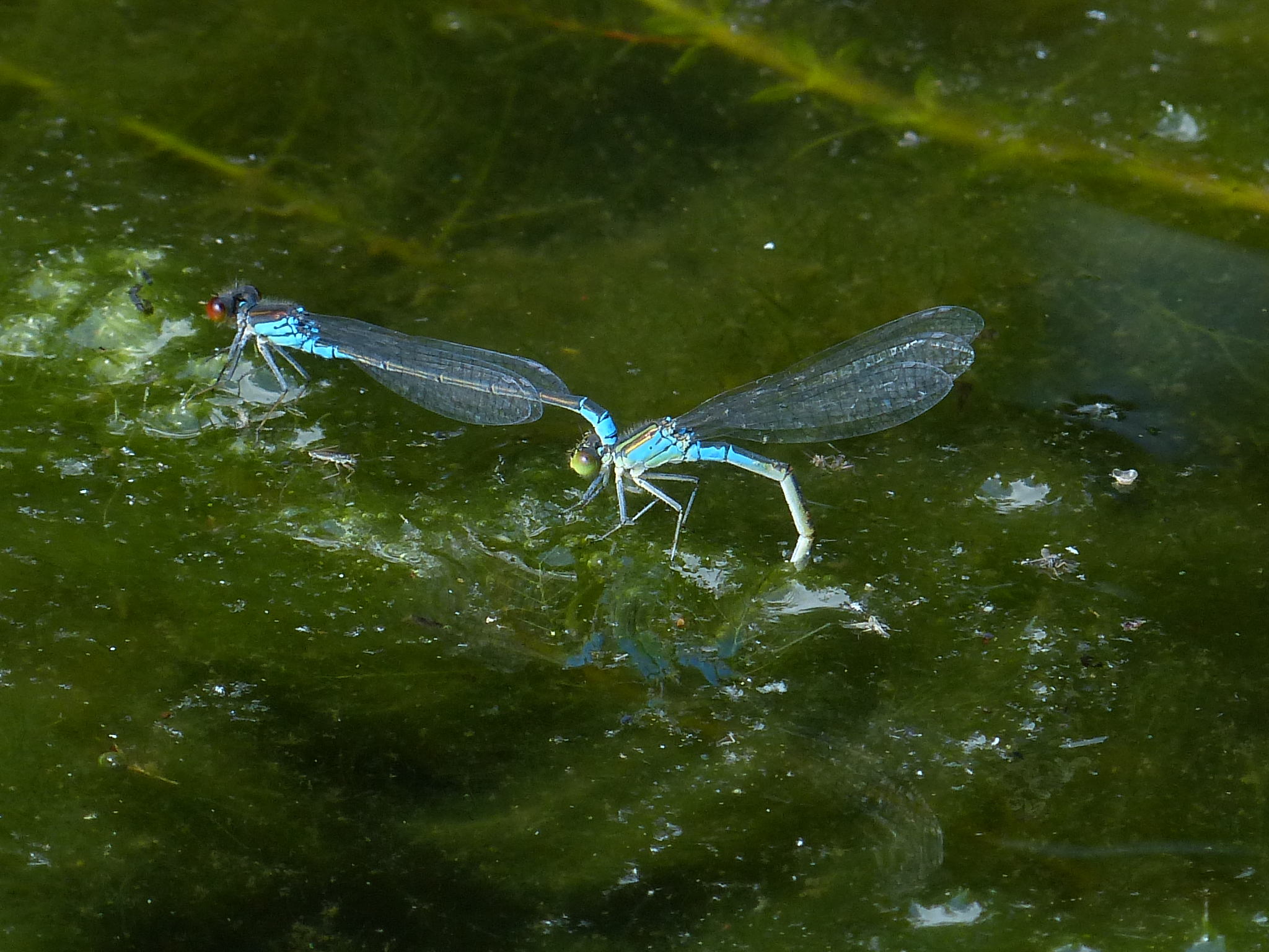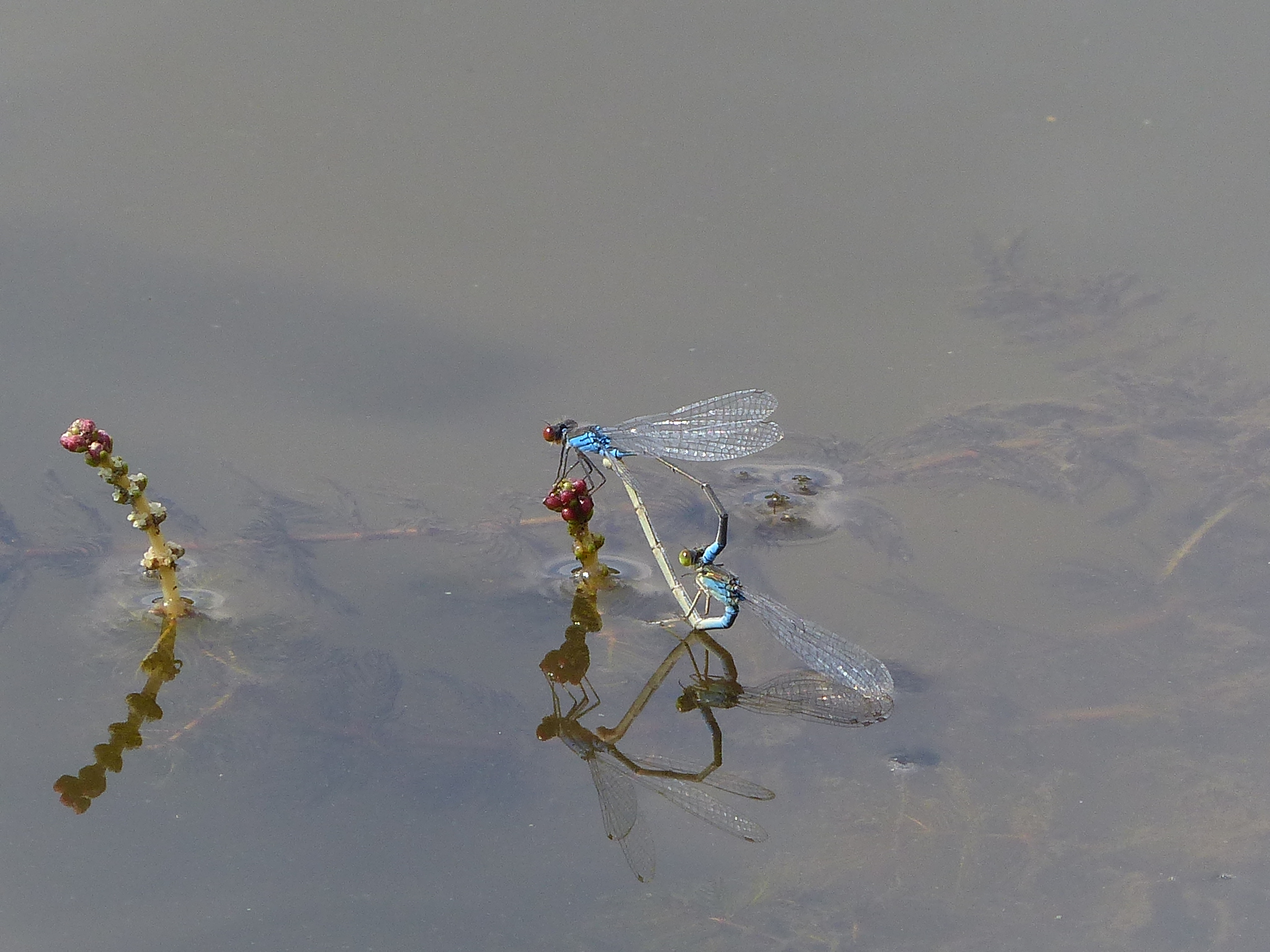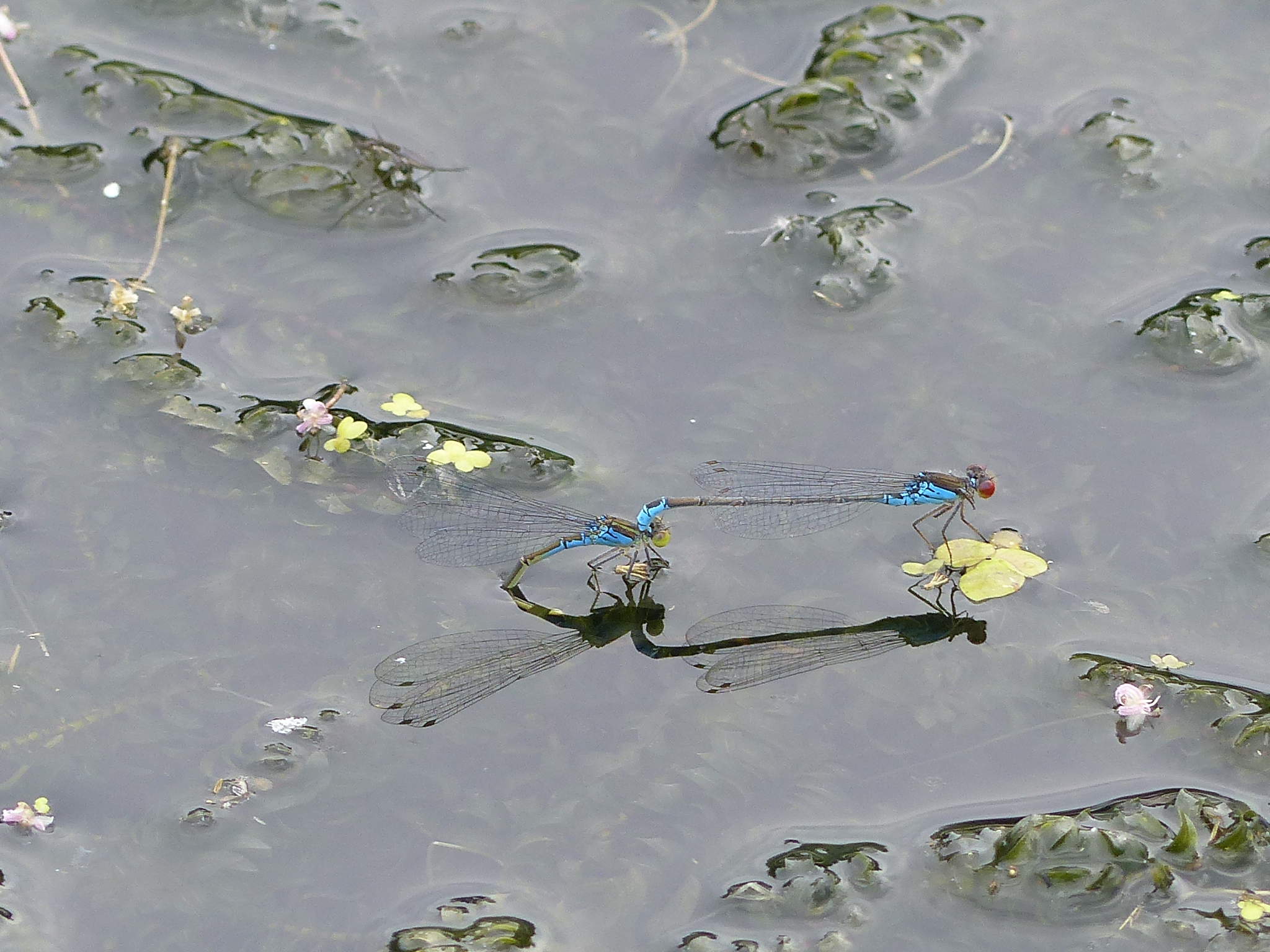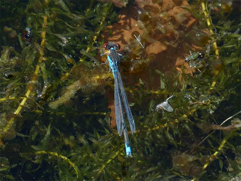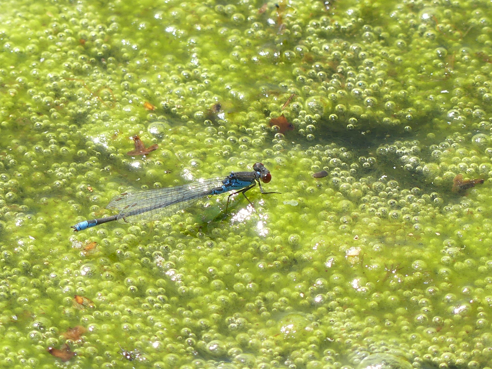 Kleiner Ausschnitt einer Massen-Eiablage des Kleinen Granatauge am Libellenteich an der Halde Berzdorf im August 2016, dazwischen einzelne Paare des Großen Granatauge