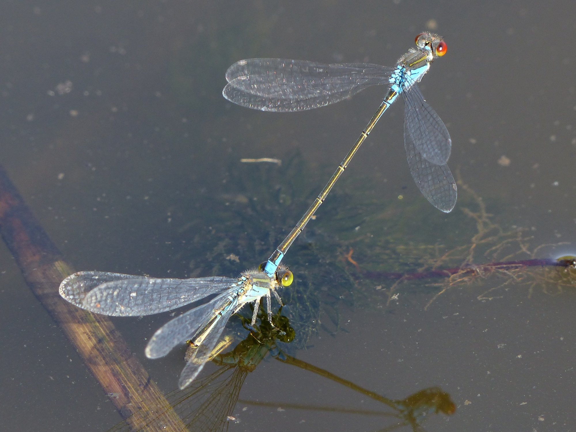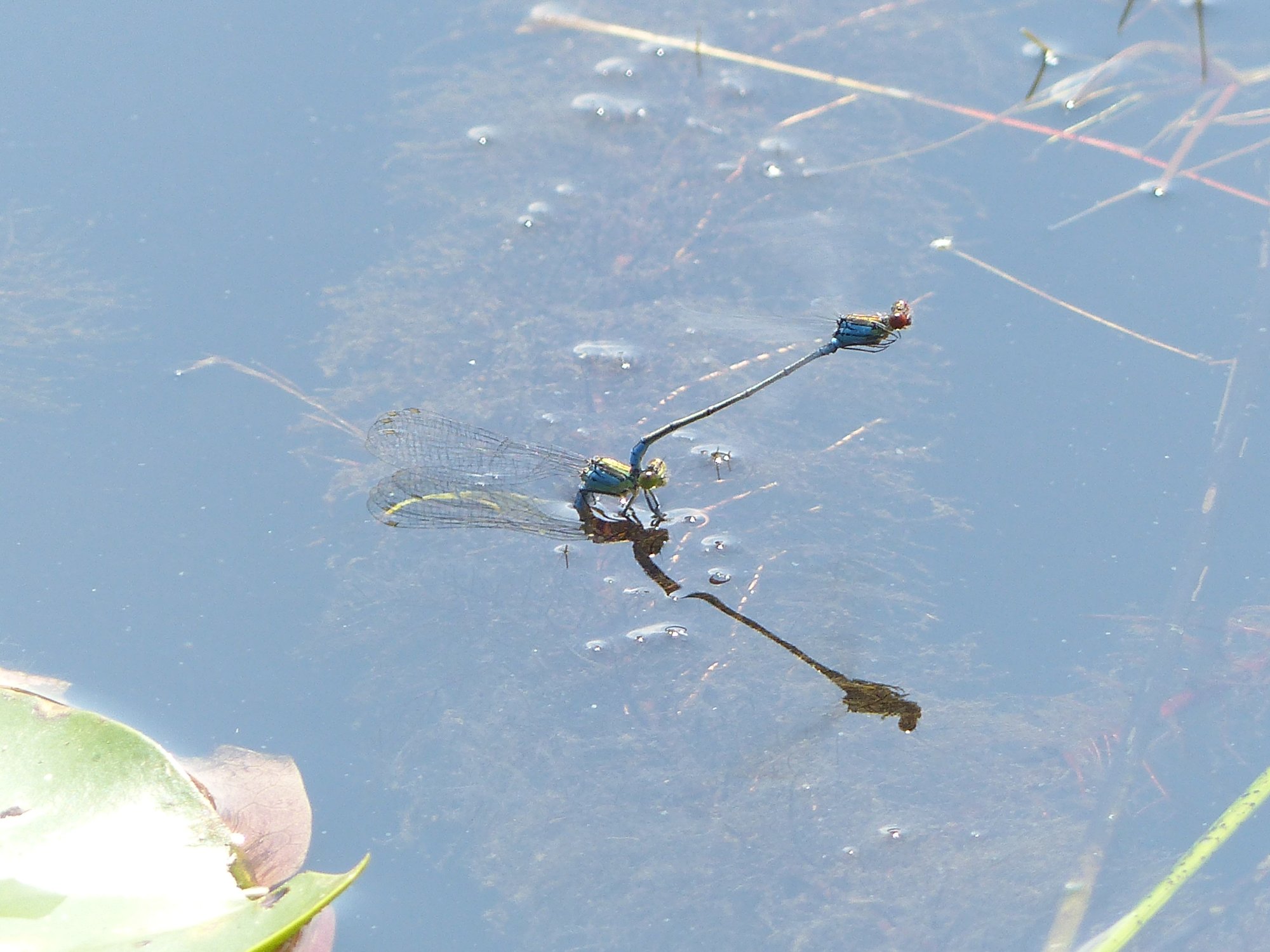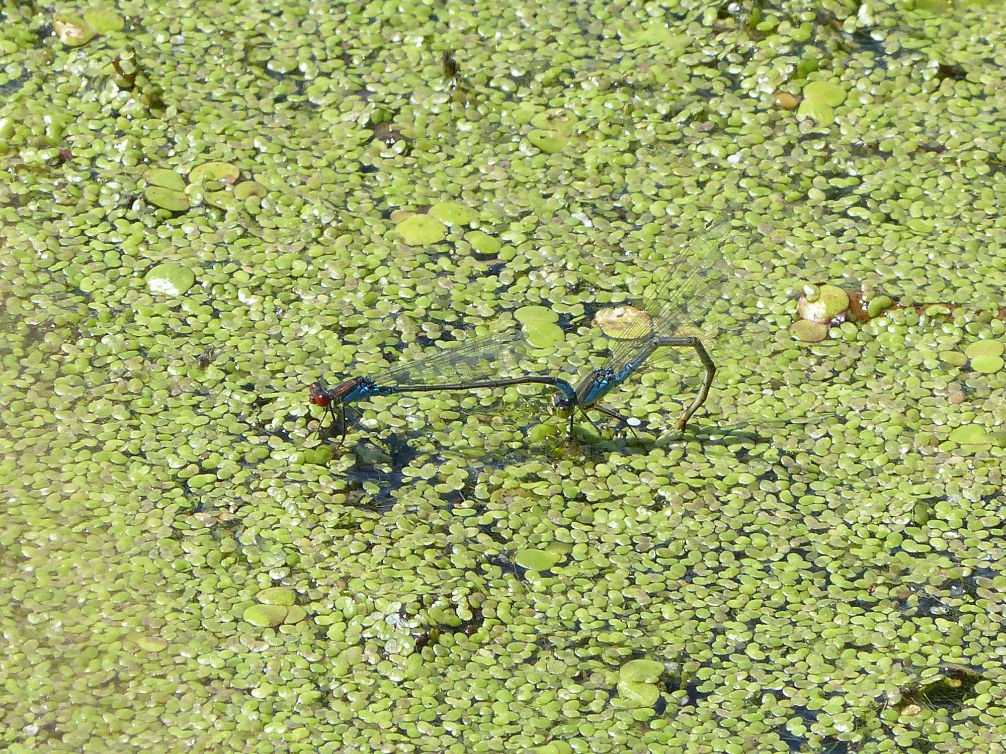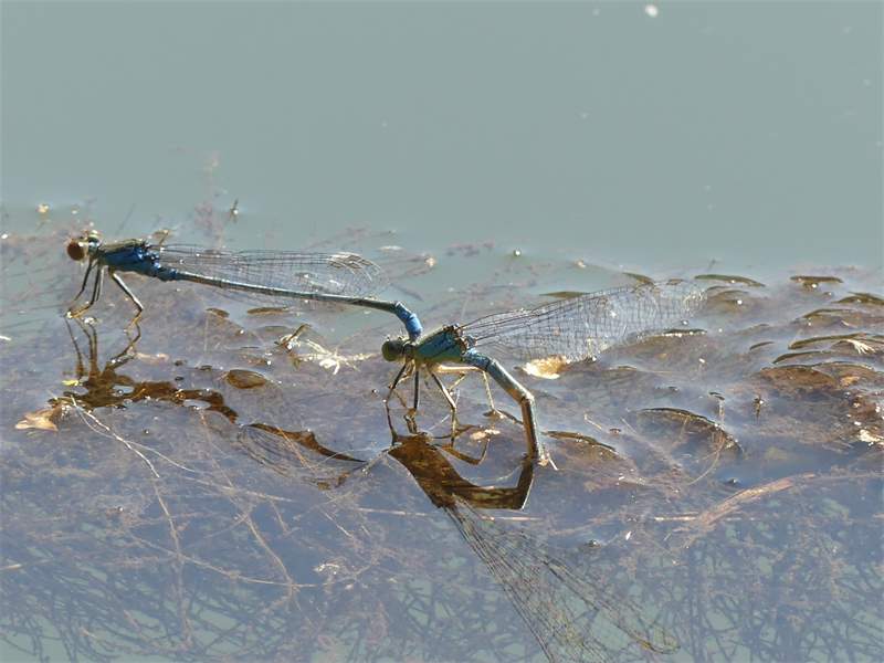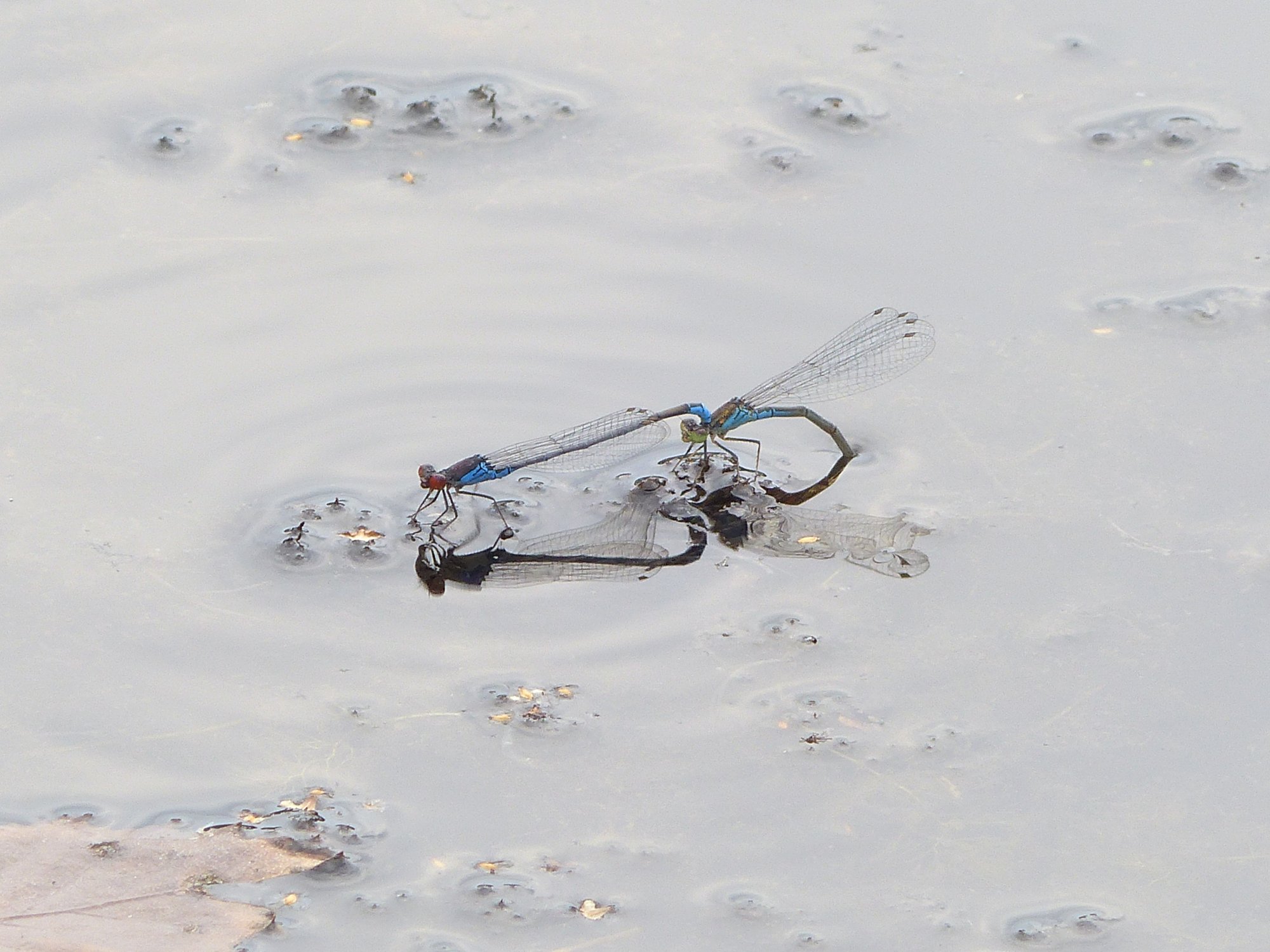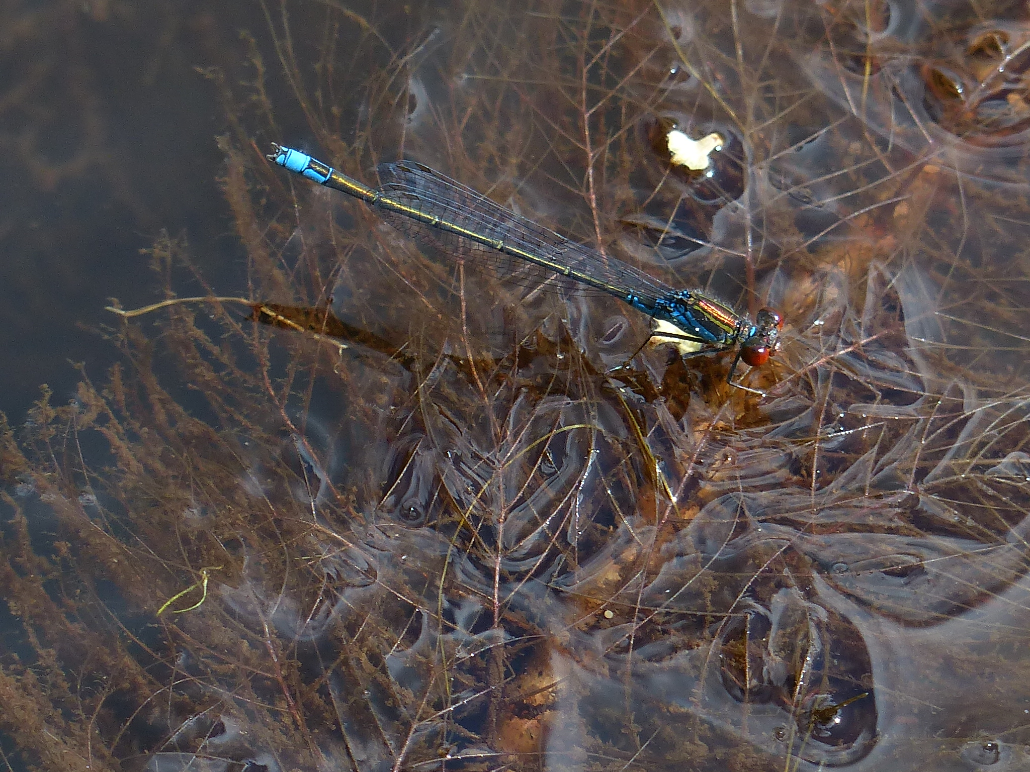 Kleiner Ausschnitt einer Massen-Eiablage des Kleinen Granatauge am Libellenteich an der Halde Berzdorf im August 2016, dazwischen einzelne Paare des Großen Granatauge