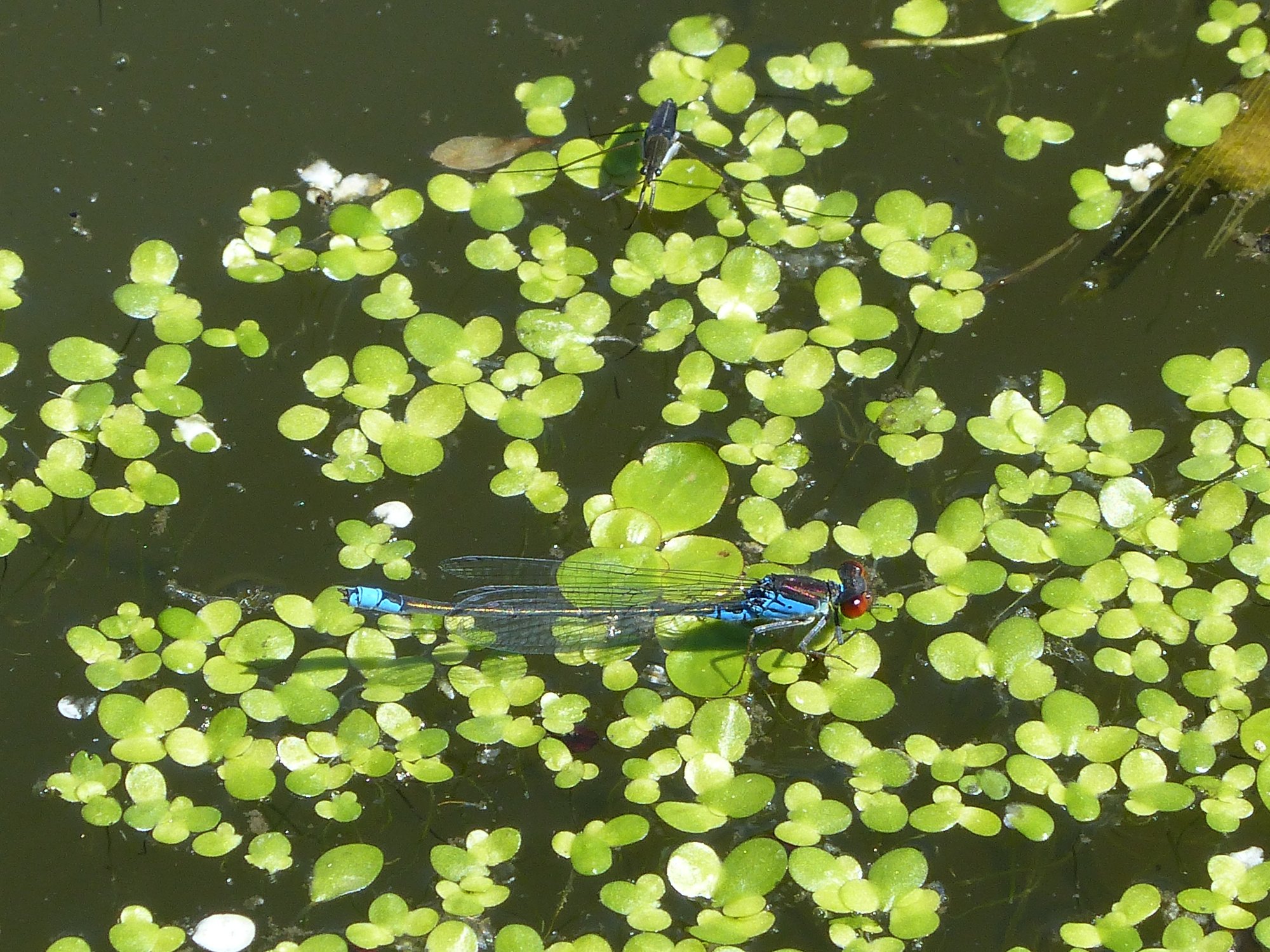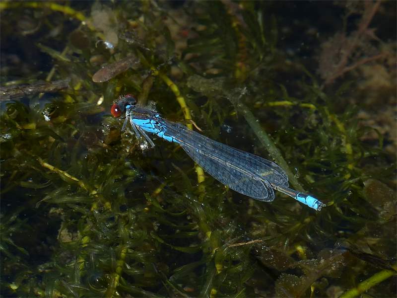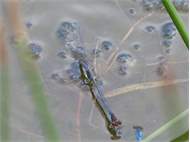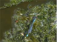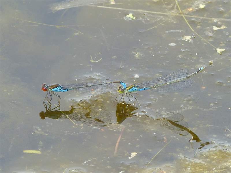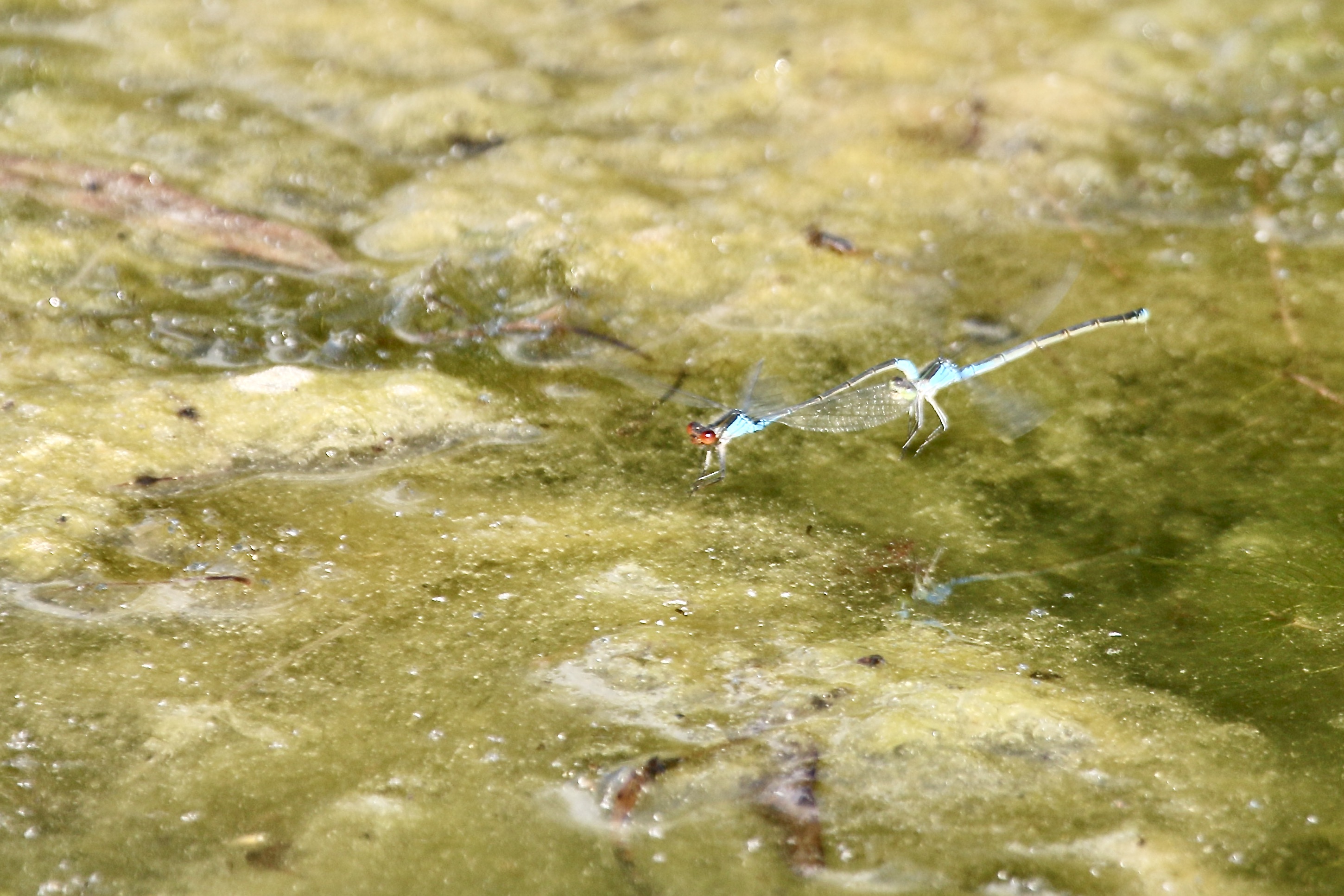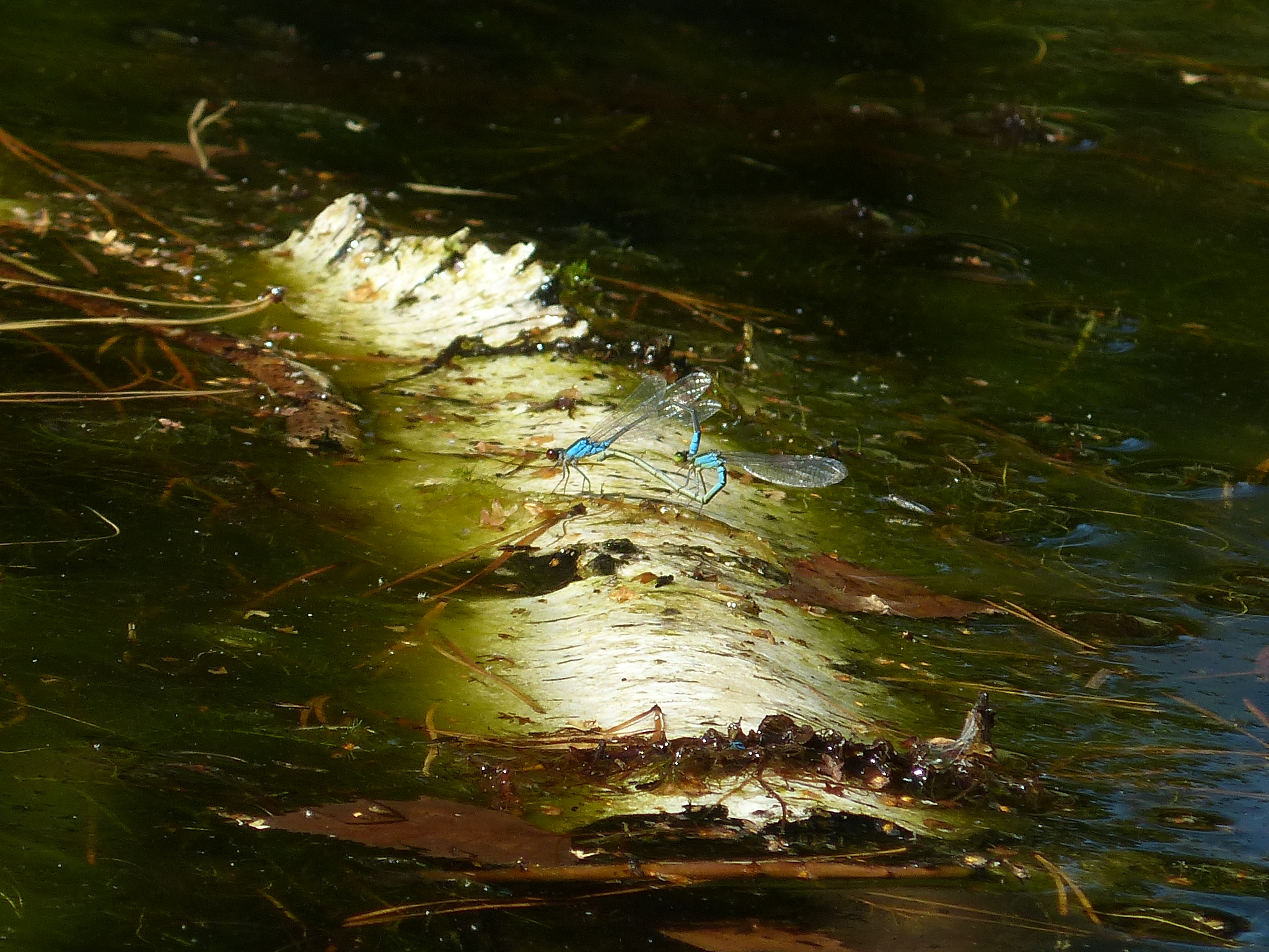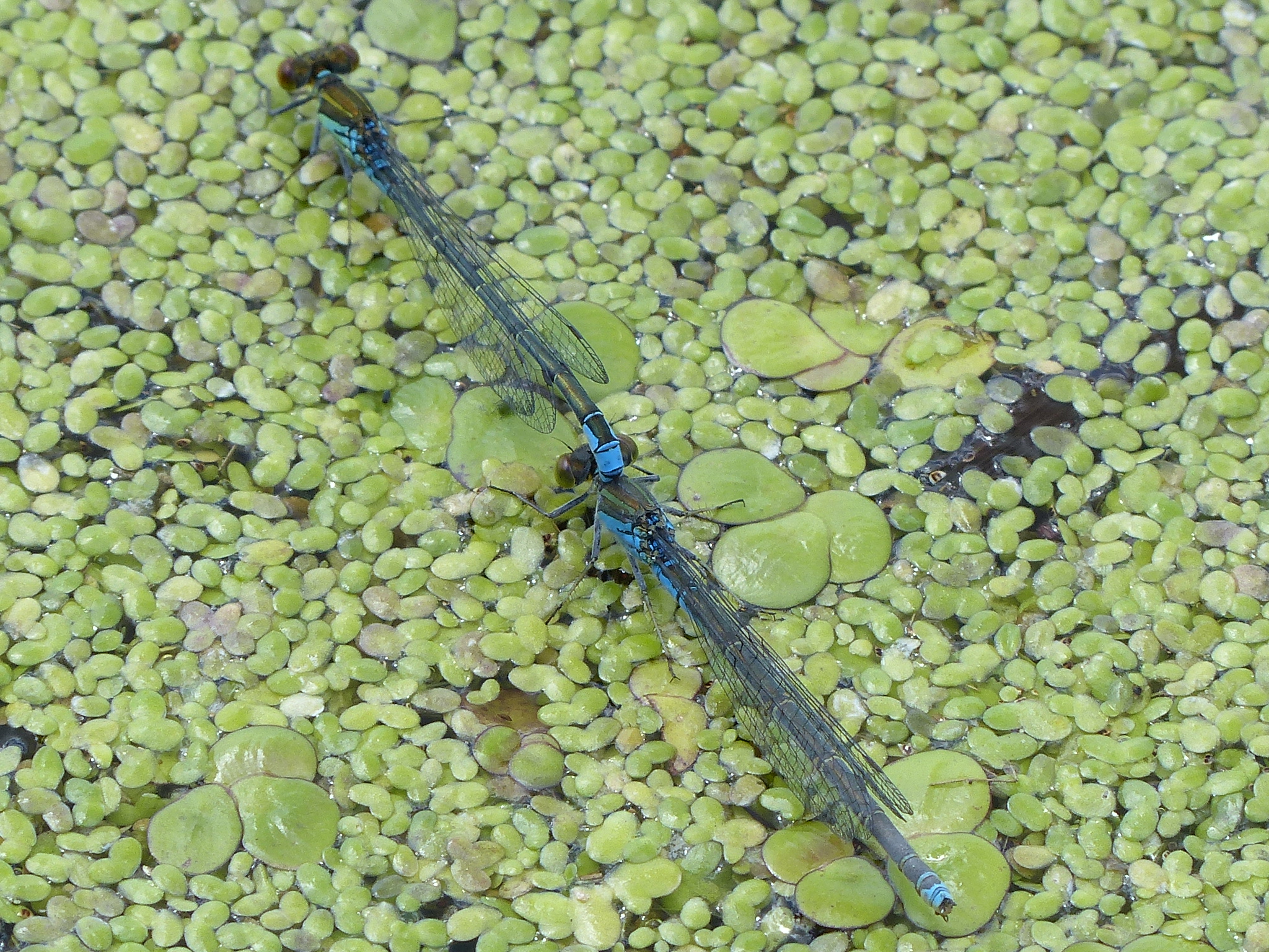 Kleiner Ausschnitt einer Massen-Eiablage des Kleinen Granatauge am Libellenteich an der Halde Berzdorf im August 2016, dazwischen einzelne Paare des Großen Granatauge