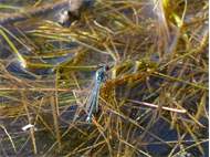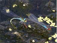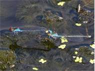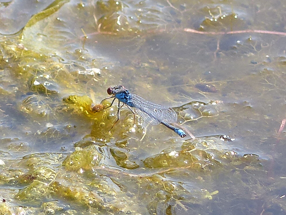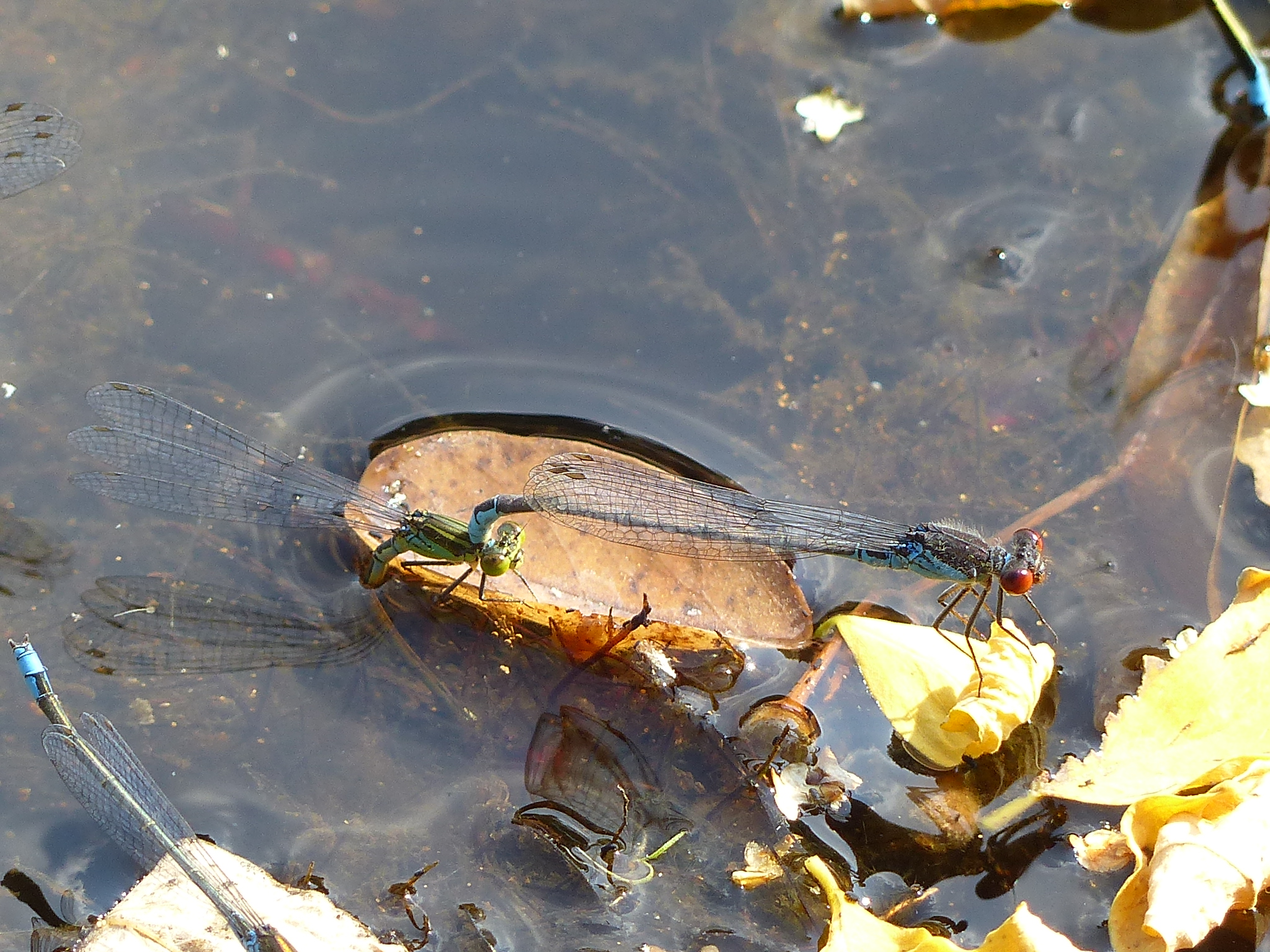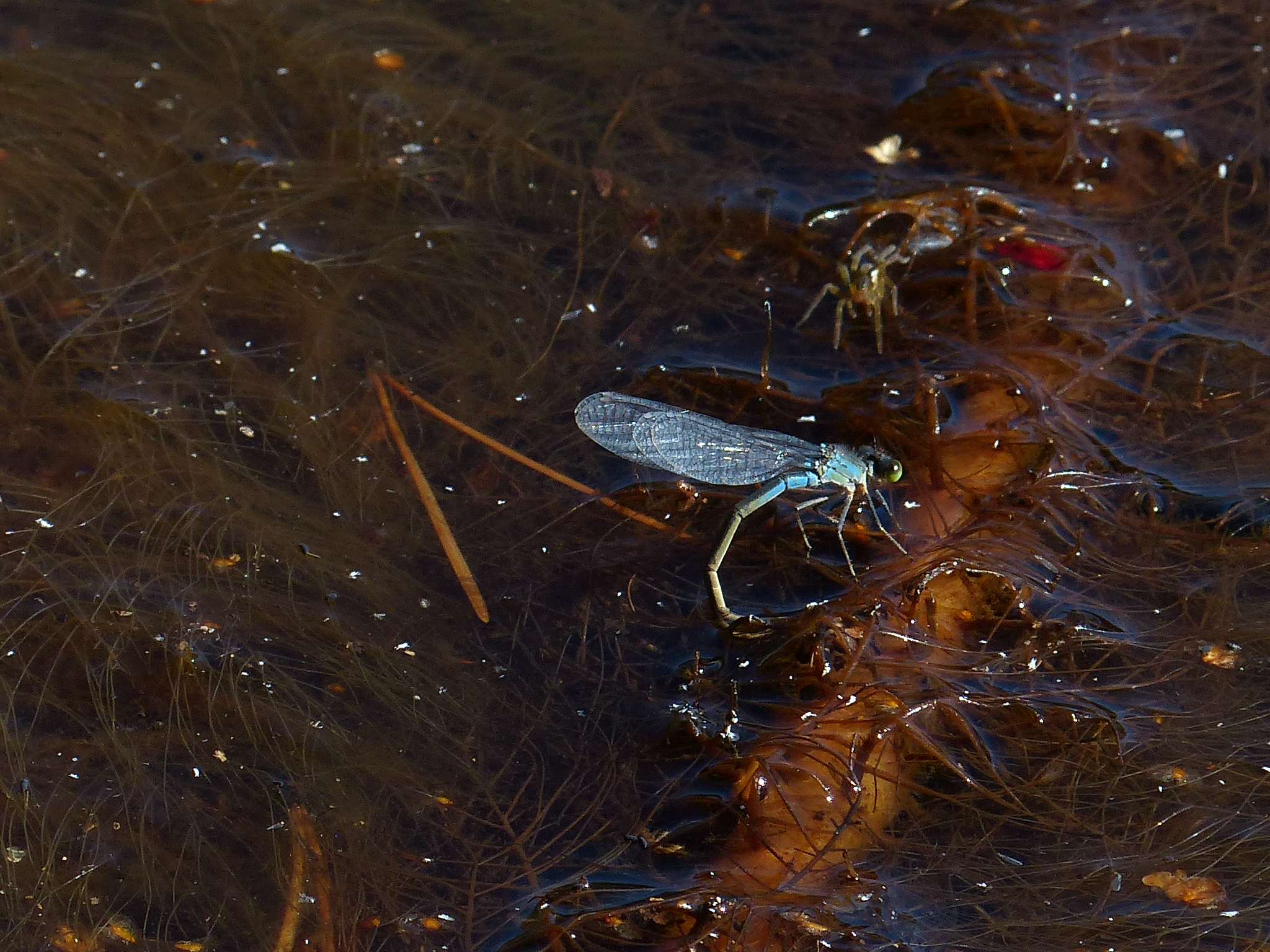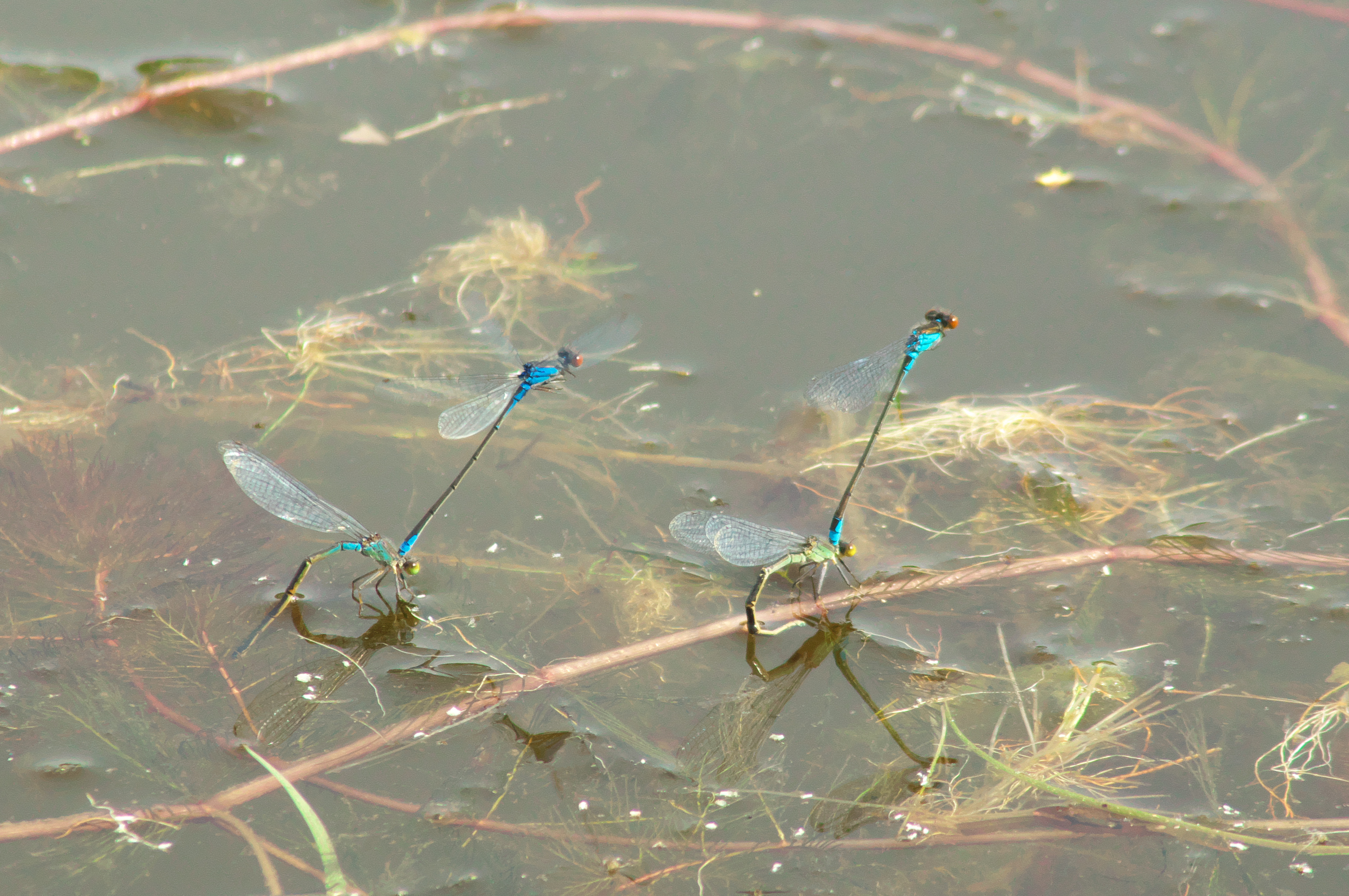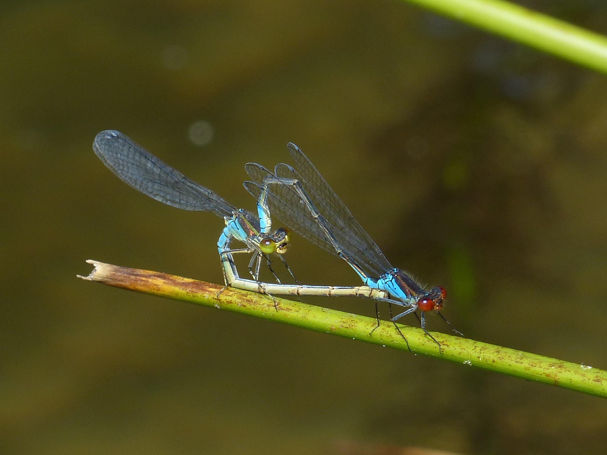 Kleiner Ausschnitt einer Massen-Eiablage des Kleinen Granatauge am Libellenteich an der Halde Berzdorf im August 2016, dazwischen einzelne Paare des Großen Granatauge
