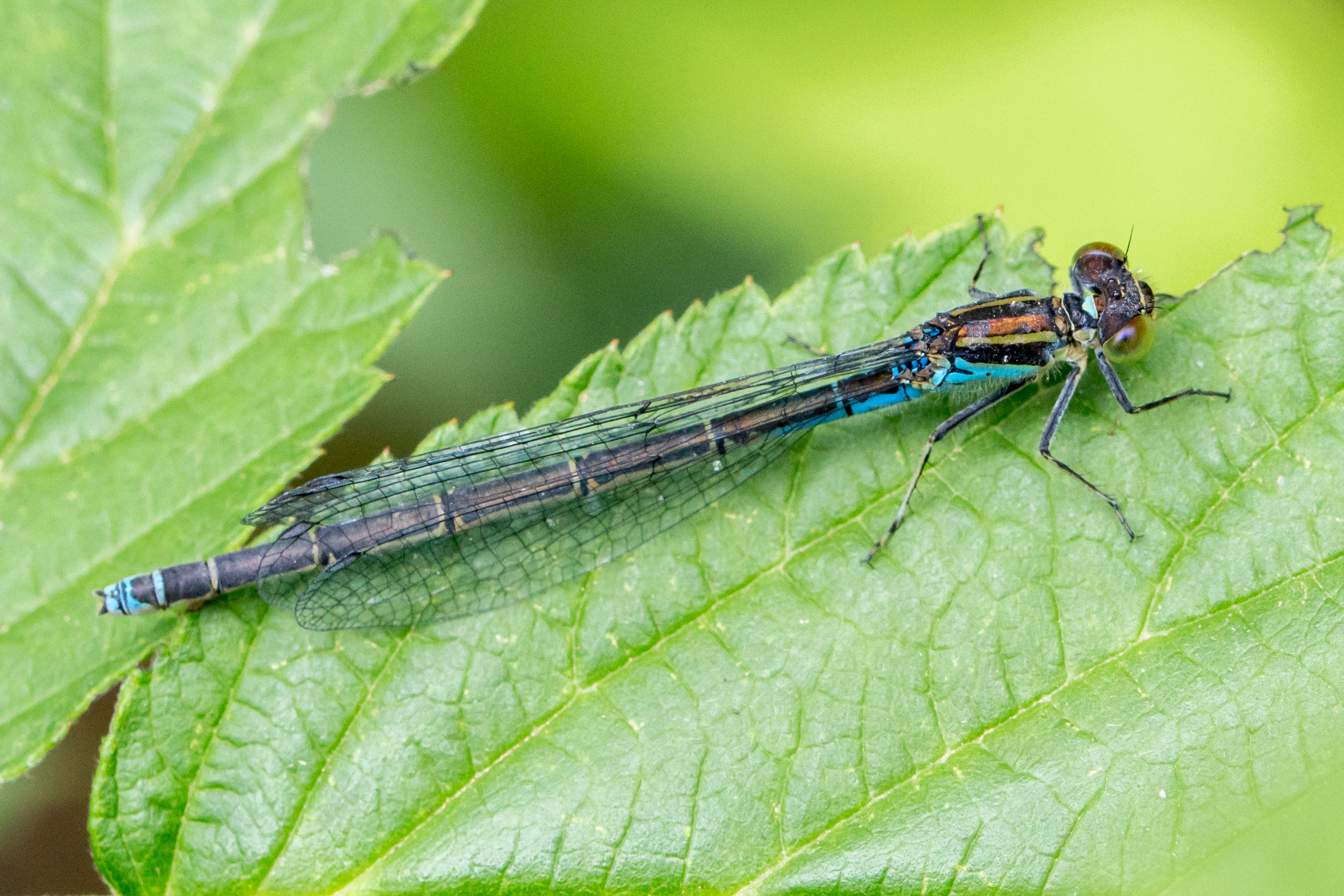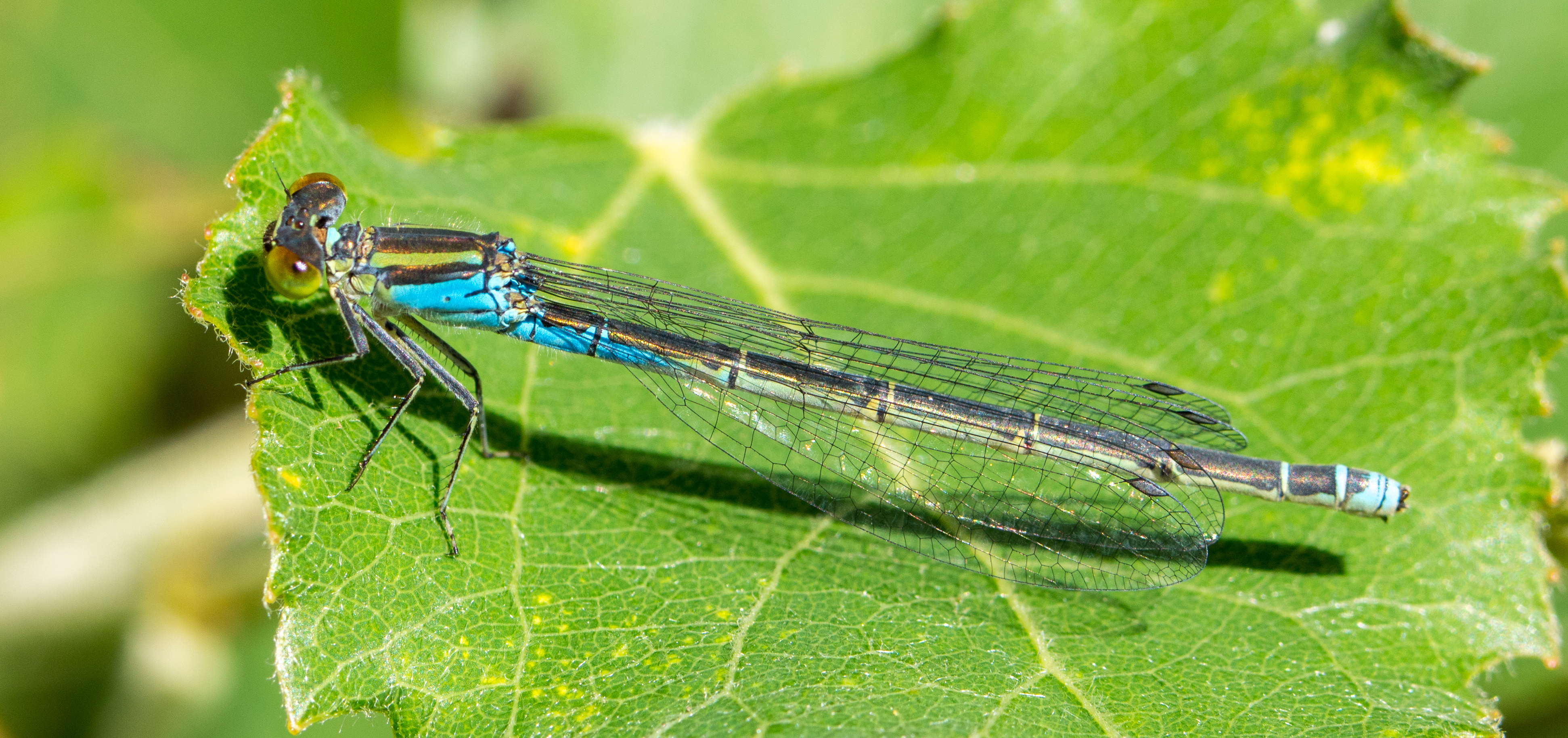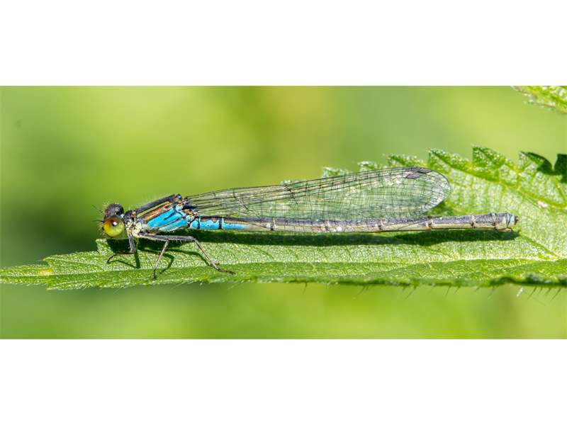 Männchen des Kleinen Granatauges am 07.07.2018 in Brauna/Wiesenteich. Deutlich erkennbar sind die partiellen Antehumeralstreifen, die x-förmige Zeichnung auf dem 10. Hinterleibssegment und die blauen Seiten des 8. Hinterleibssegments.