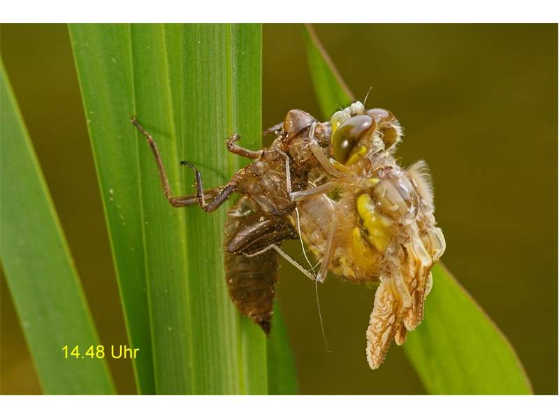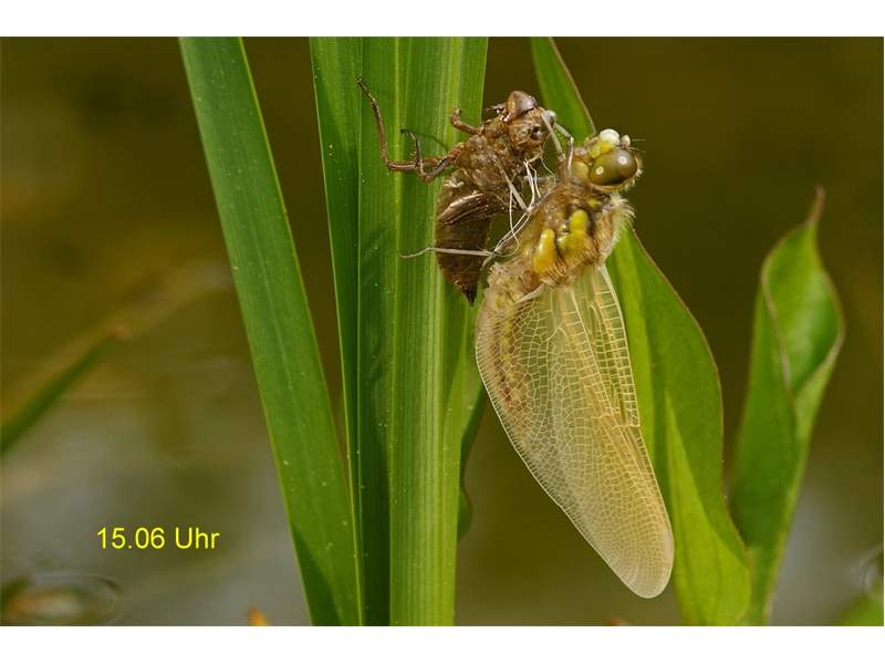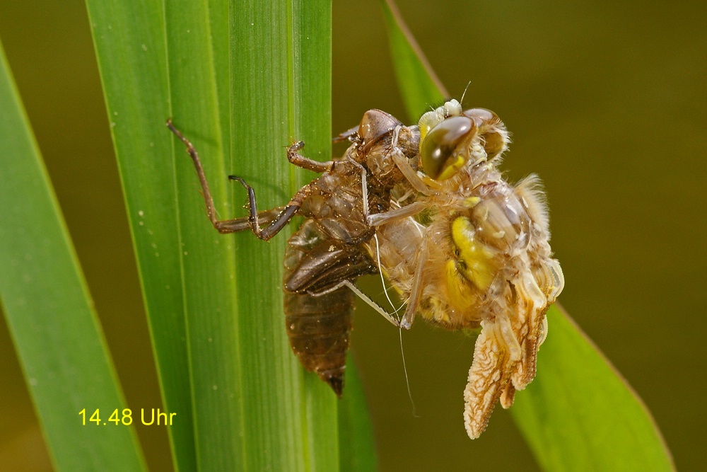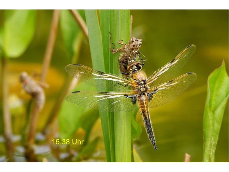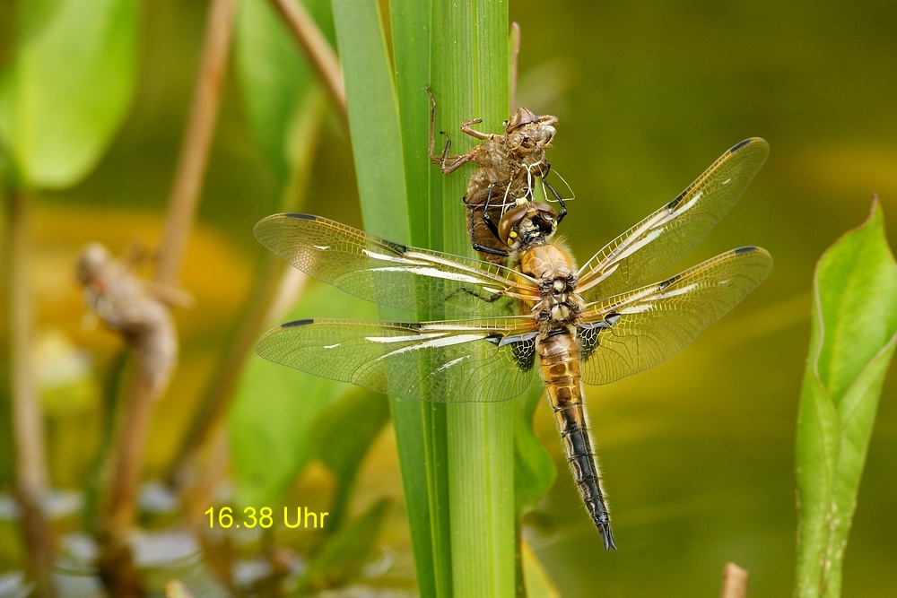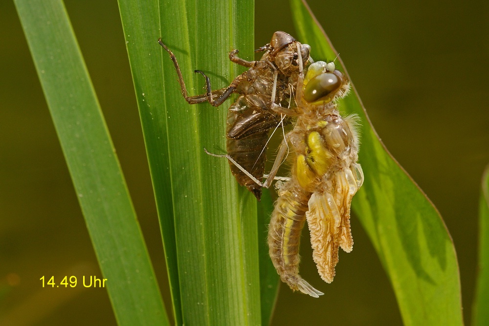 Vierfleck am16.05.2015 im Tharandter Wald am Triebischsee. Der Schlupfvorgang auf den sechs Bildern ist mit realen Uhrzeiten beschriftet (Auswahl aus ca. 200 Aufnahmen).