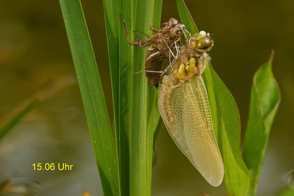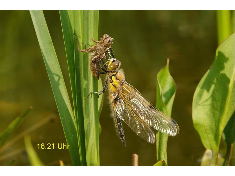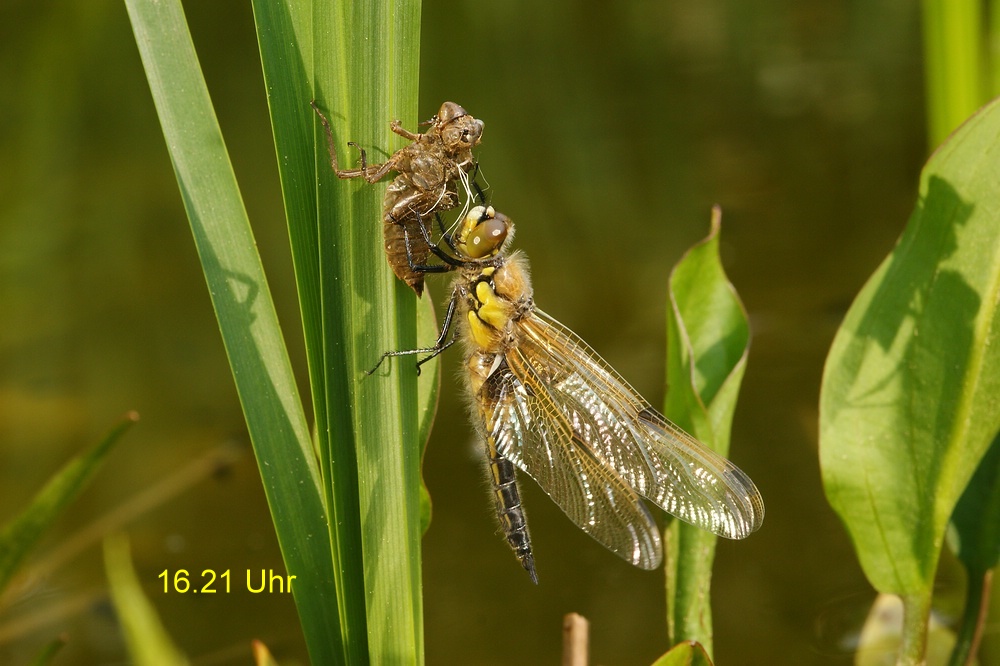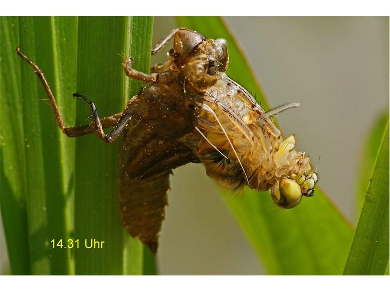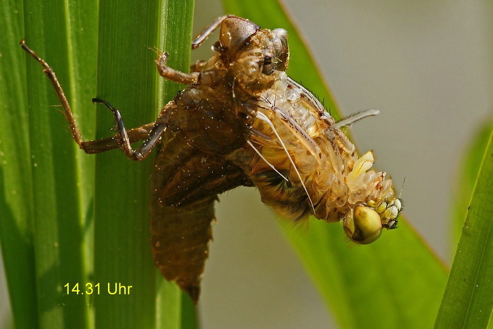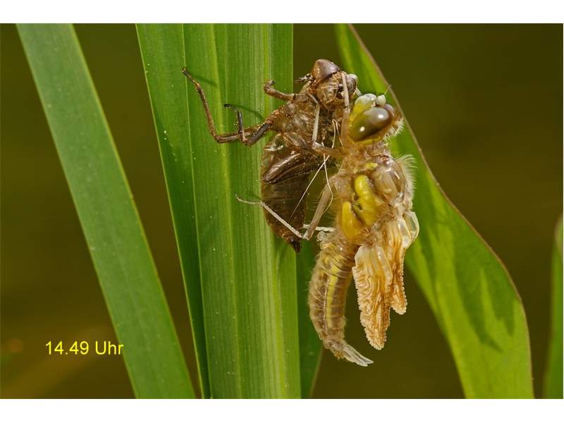 Vierfleck am16.05.2015 im Tharandter Wald am Triebischsee. Der Schlupfvorgang auf den sechs Bildern ist mit realen Uhrzeiten beschriftet (Auswahl aus ca. 200 Aufnahmen).