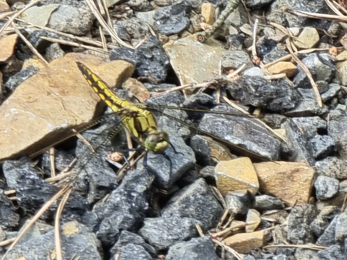 Weibchen von Orthetrum cancellatum beim Sonnen kurz nach dem Schlupf. Die Exuvie konnte wenige Zentimeter darunter gefunden werden.